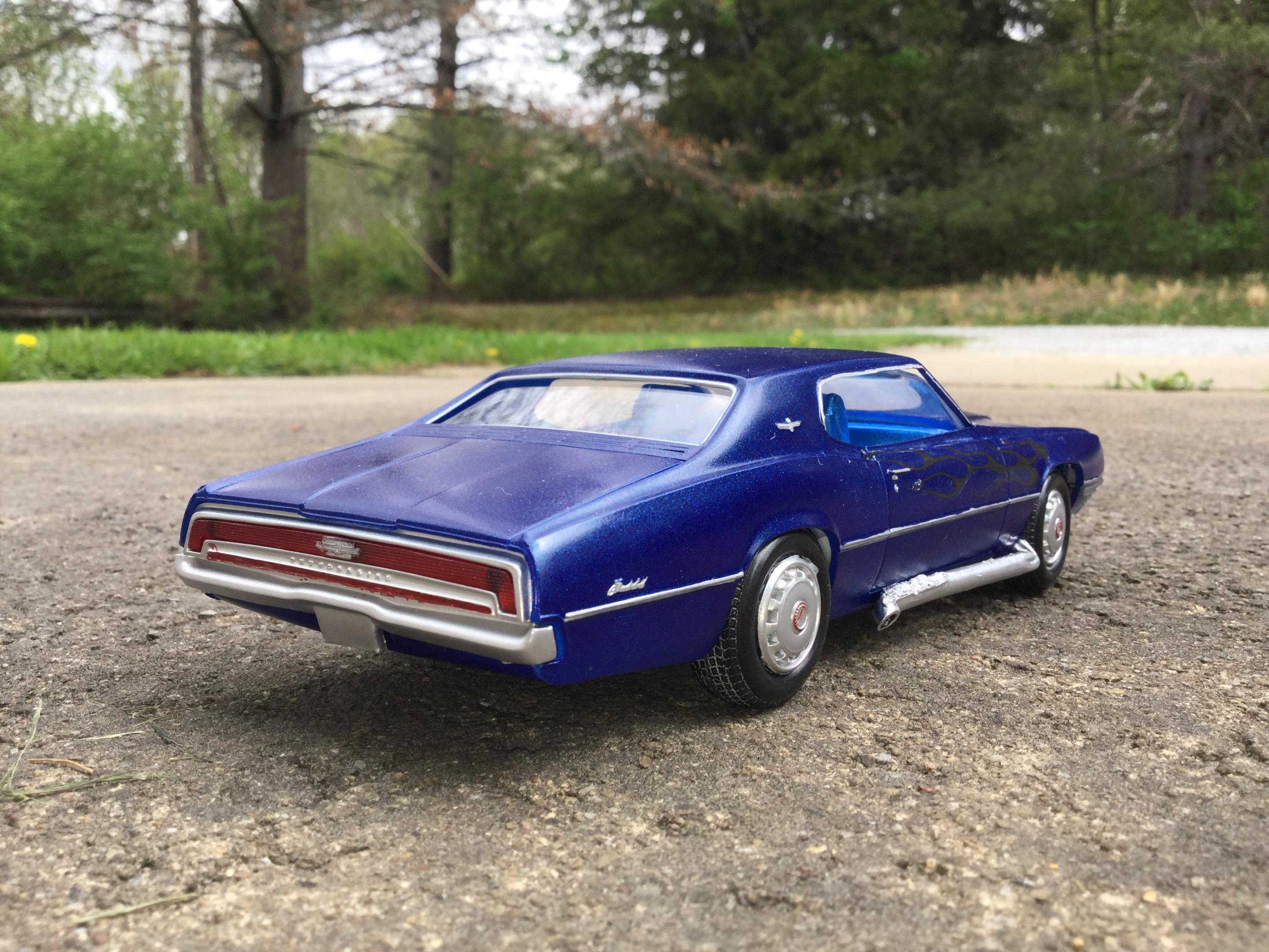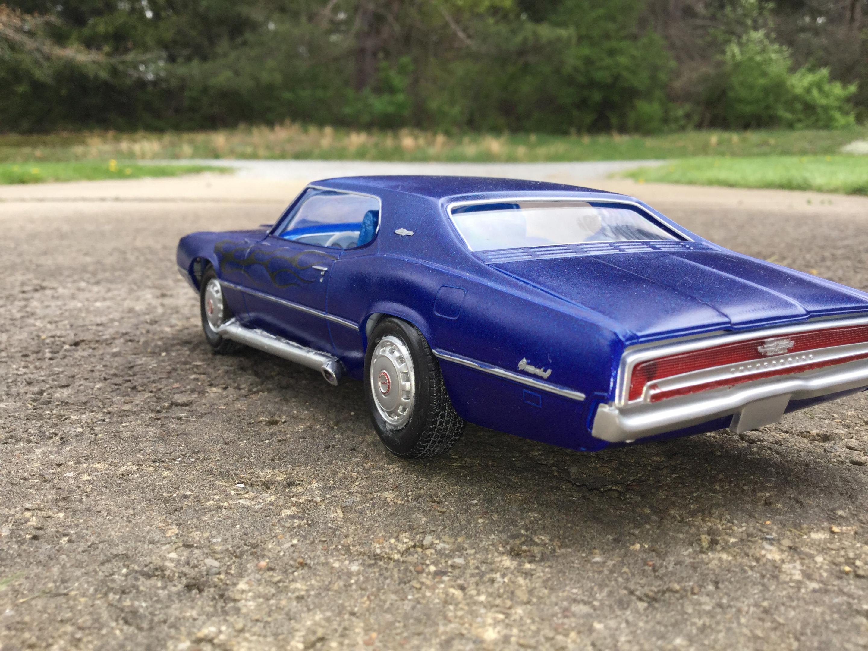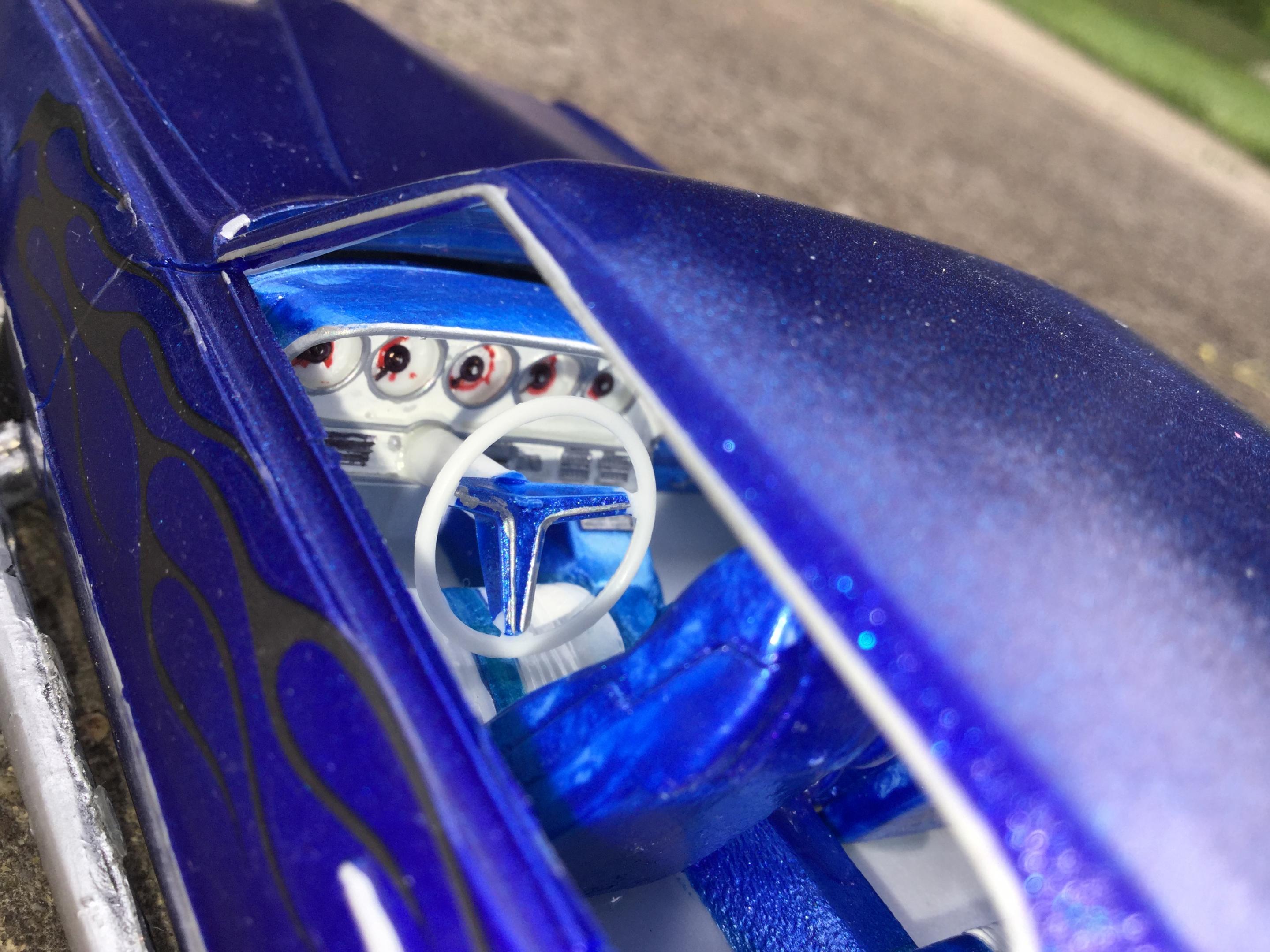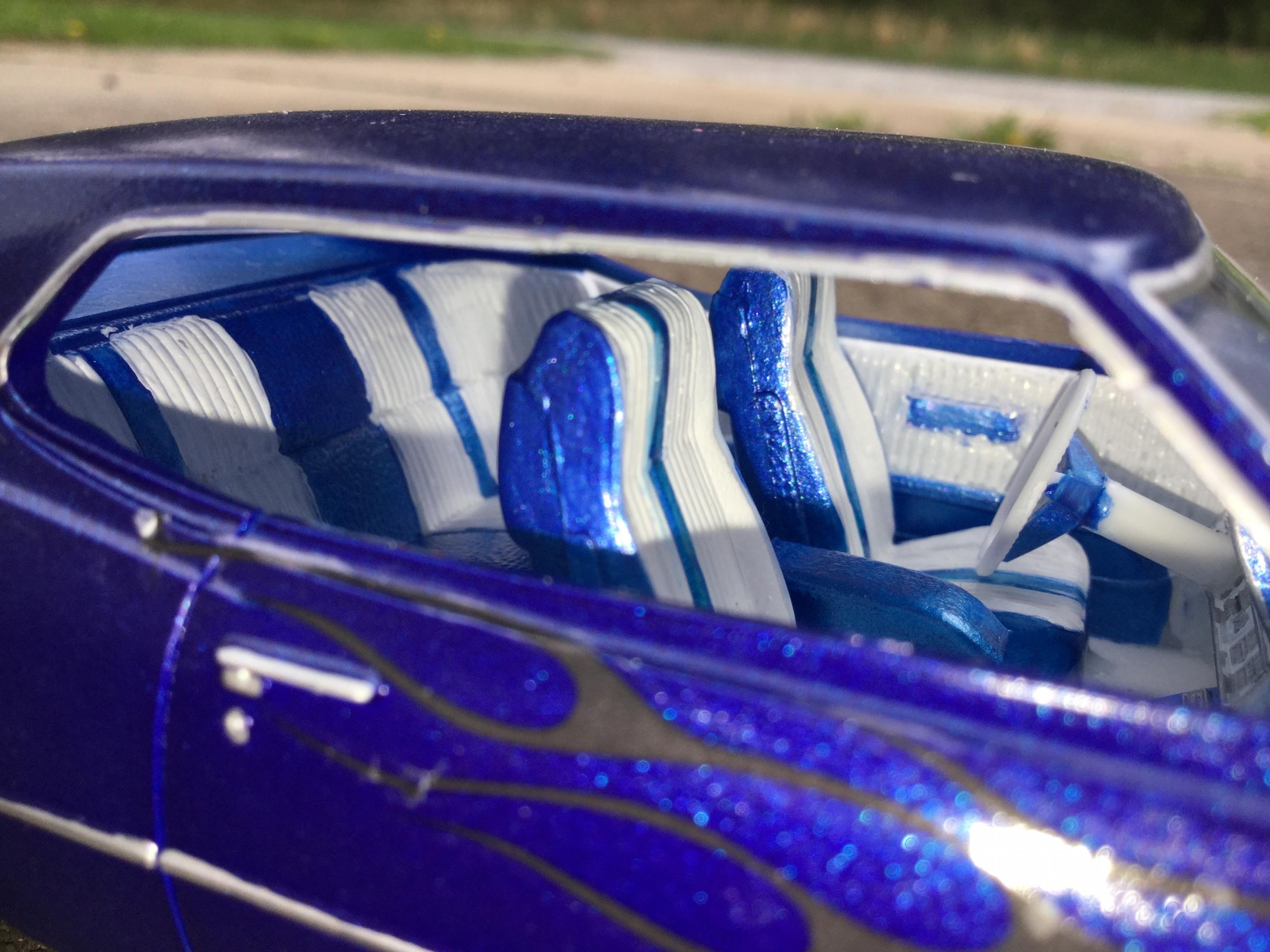 this started off of as a parts kit it was missing the engine and tires and the hood and engine pan was already glued in place i did not have a ford engine that would work for this car so i left the hood and engine pan glued in place i added some side pipes from my parts box and then glued in the custom headlight covers i found some tires that would fit the rims in my tire box i painted the body testors extreme lacquer deja-blue the interior is a two tone i hand painted the areas that were supose to look lke vinyl metallic sapphire and the rest i hand painted white i also put some black flame decals along the sides of the car