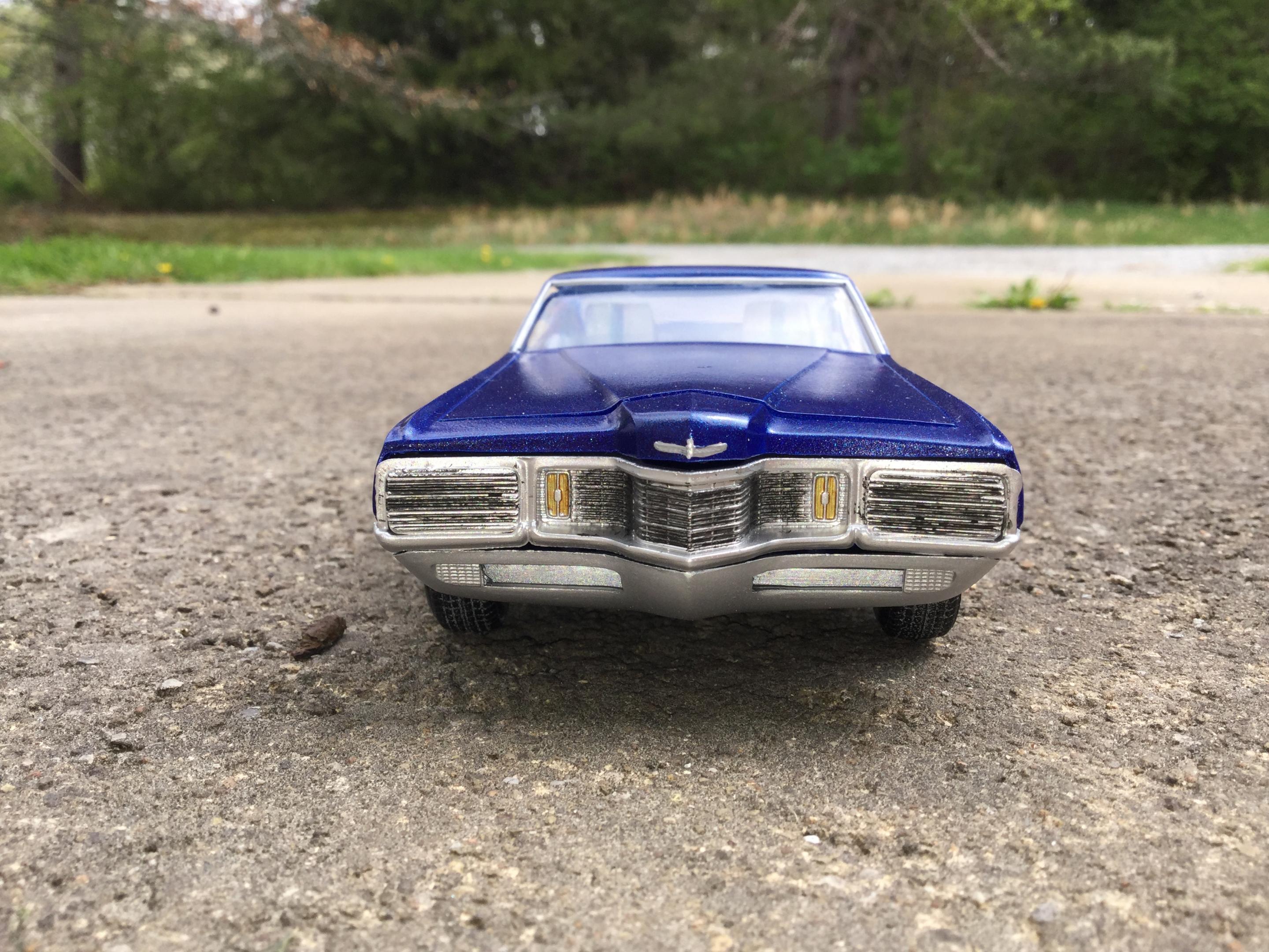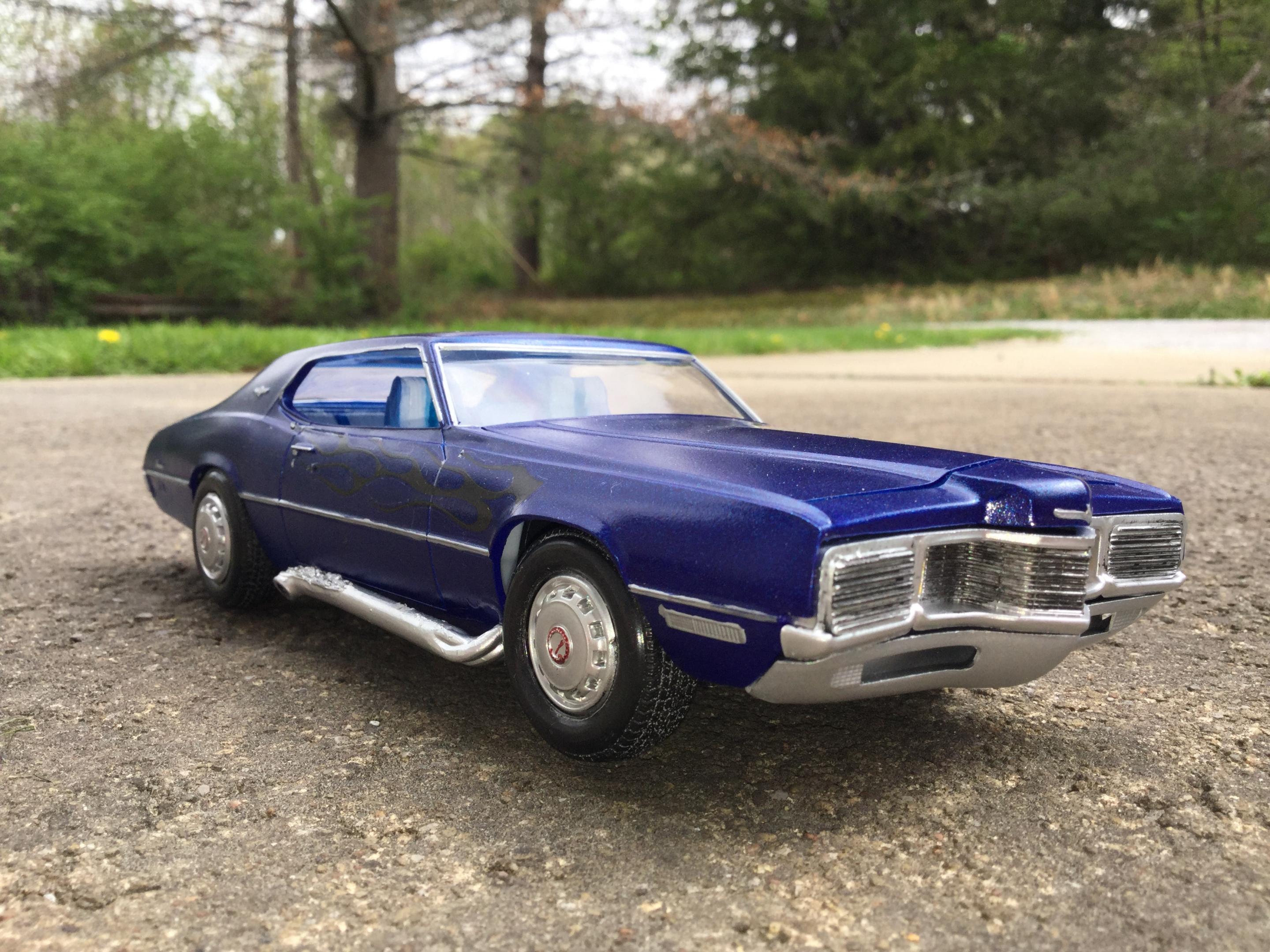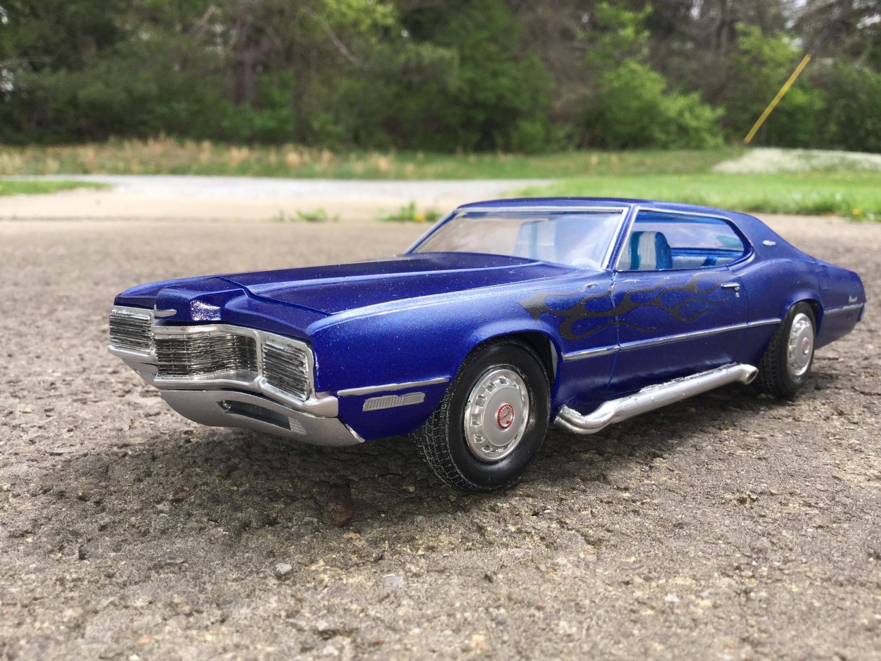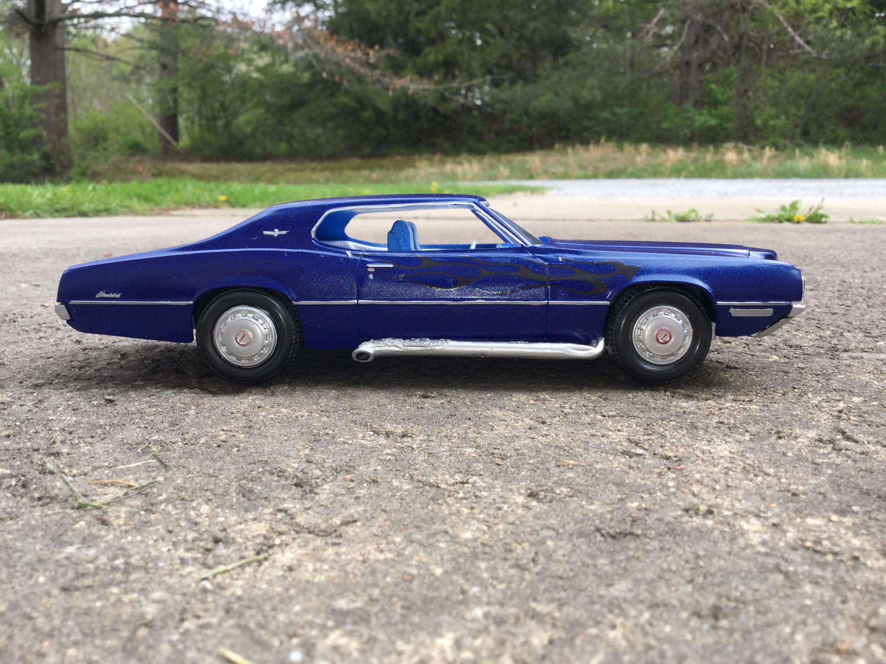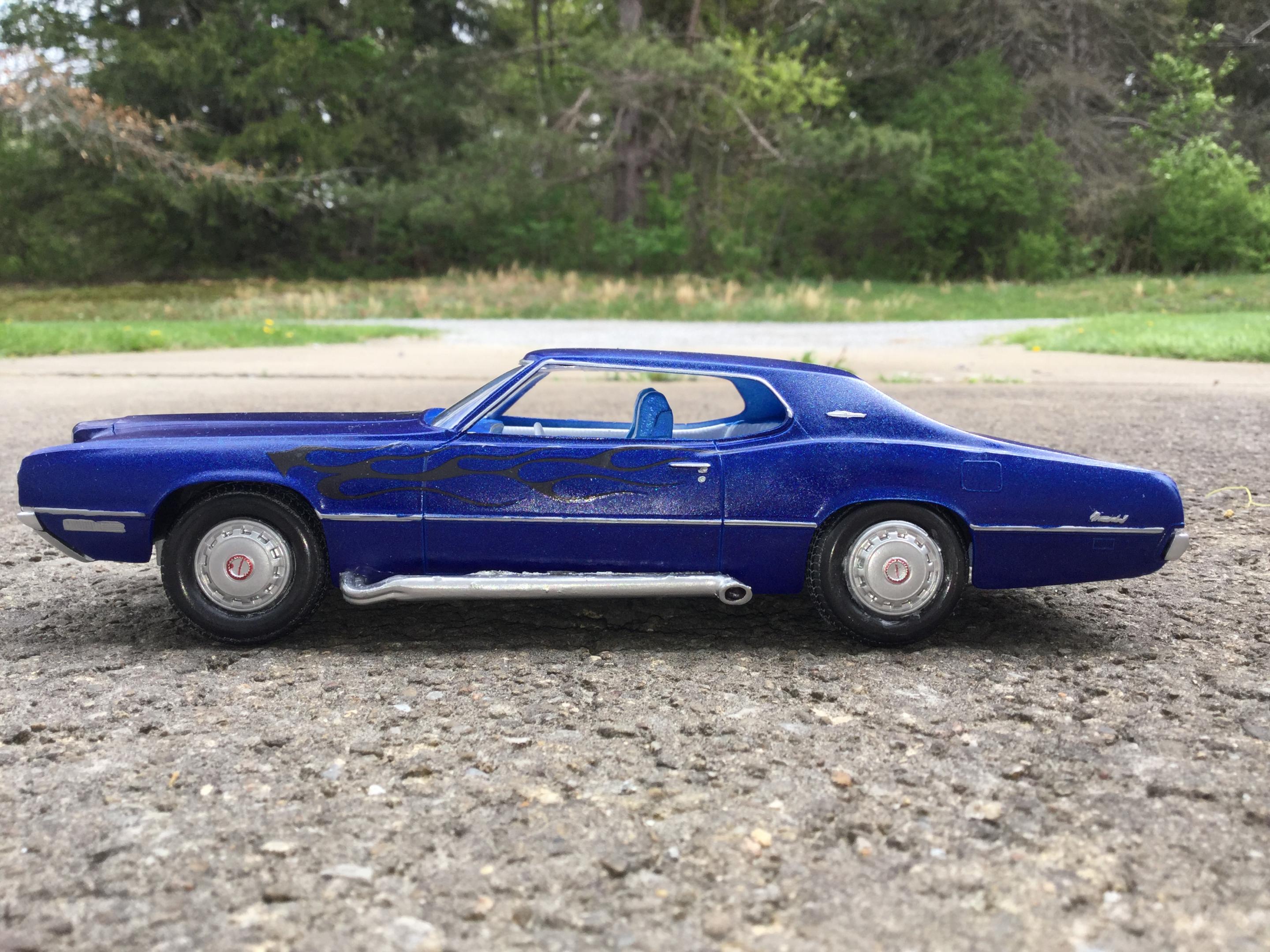 this started off of as a parts kit it was missing the engine and tires and the hood and engine pan was already glued in place i did not have a ford engine that would work for this car so i left the hood and engine pan glued in place i added some side pipes from my parts box and then glued in the custom headlight covers i found some tires that would fit the rims in my tire box i painted the body testors extreme lacquer deja-blue the interior is a two tone i hand painted the areas that were supose to look lke vinyl metallic sapphire and the rest i hand painted white i also put some black flame decals along the sides of the car