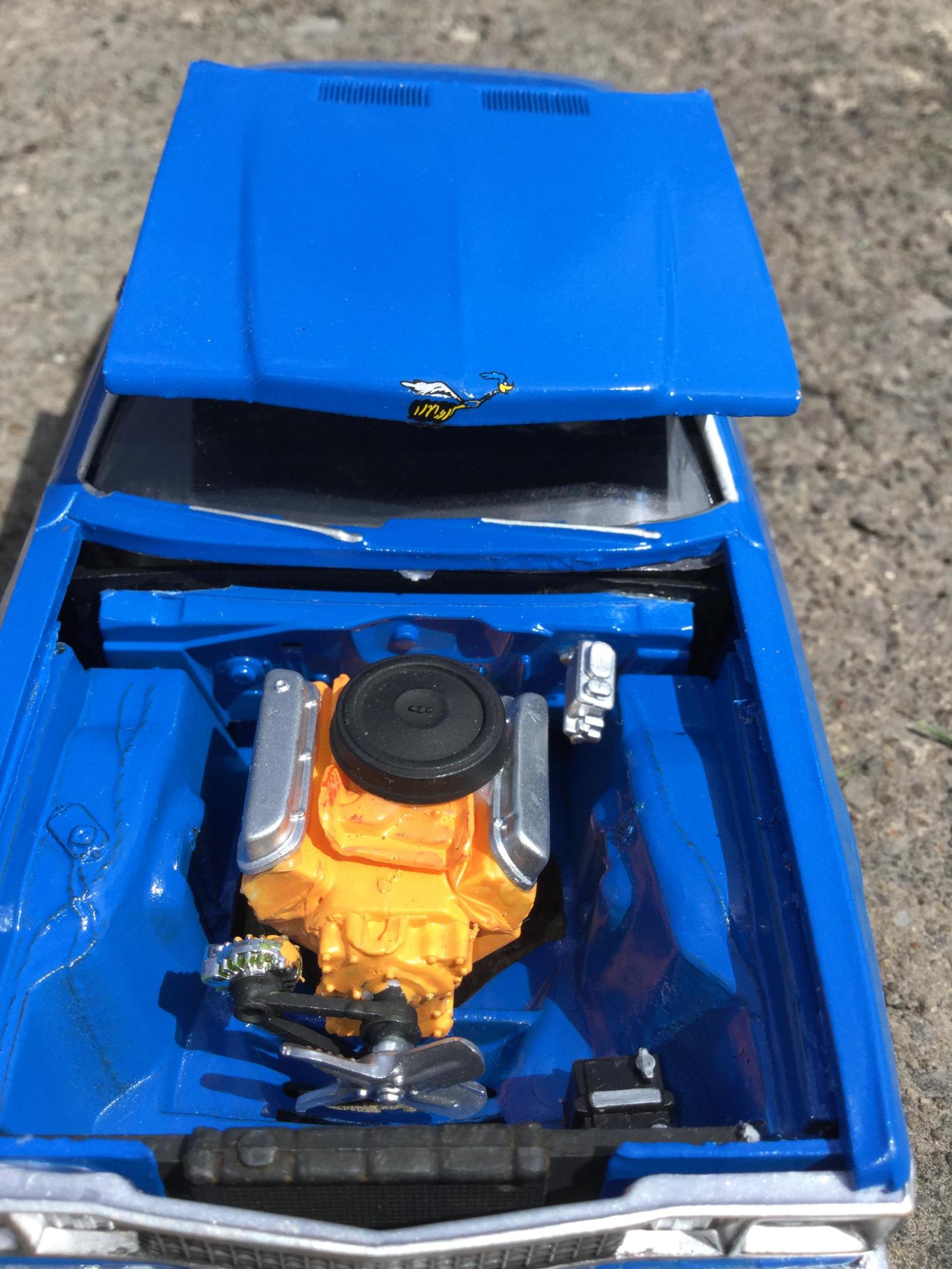 this was another rebuilder i got the decals from thomascoffey1959 i painted the body rust-oleum 2x gloss brilliant blue the original fire wall was missing i used a spare 68 dart one the engine was from my engine parts box