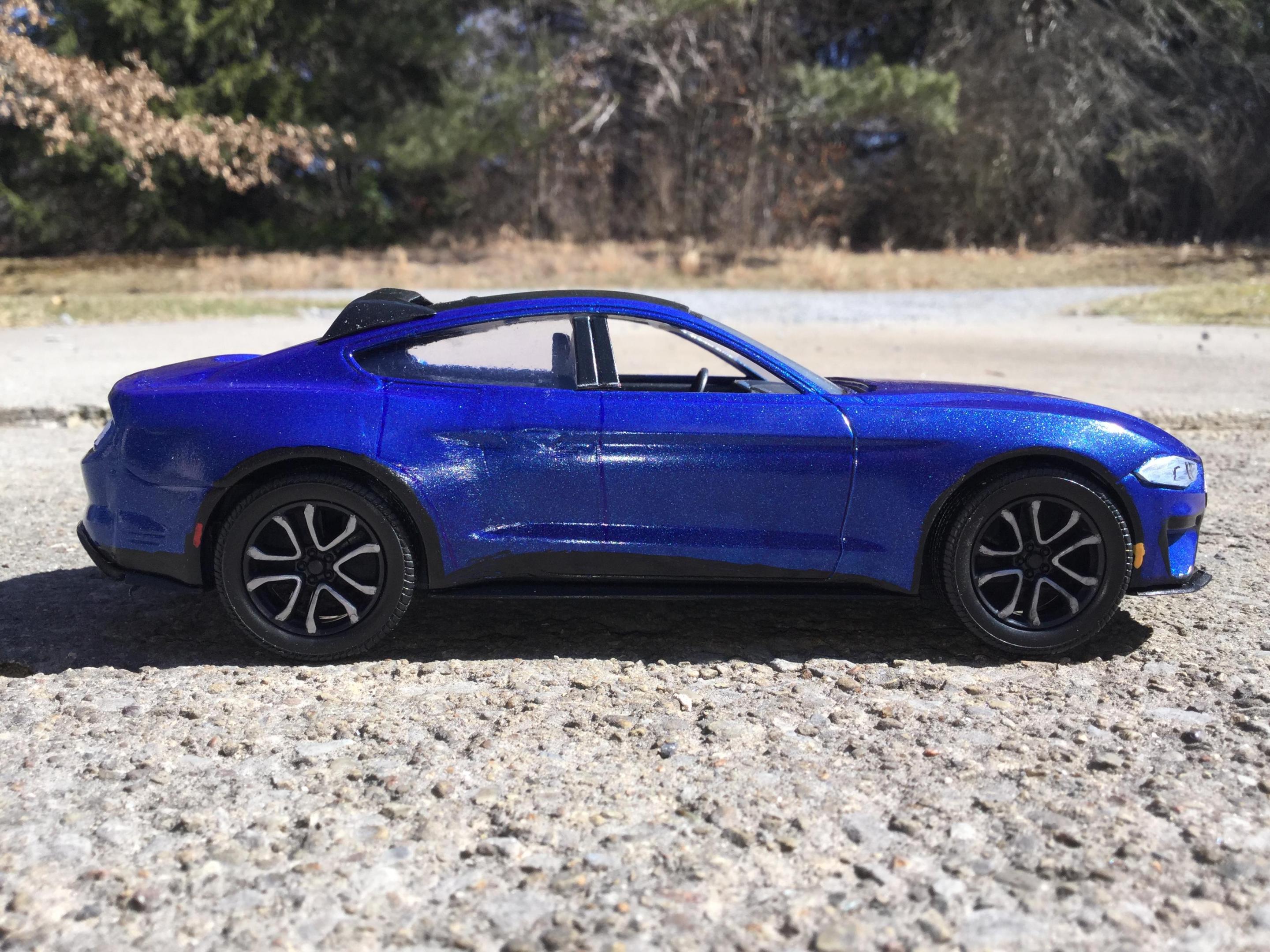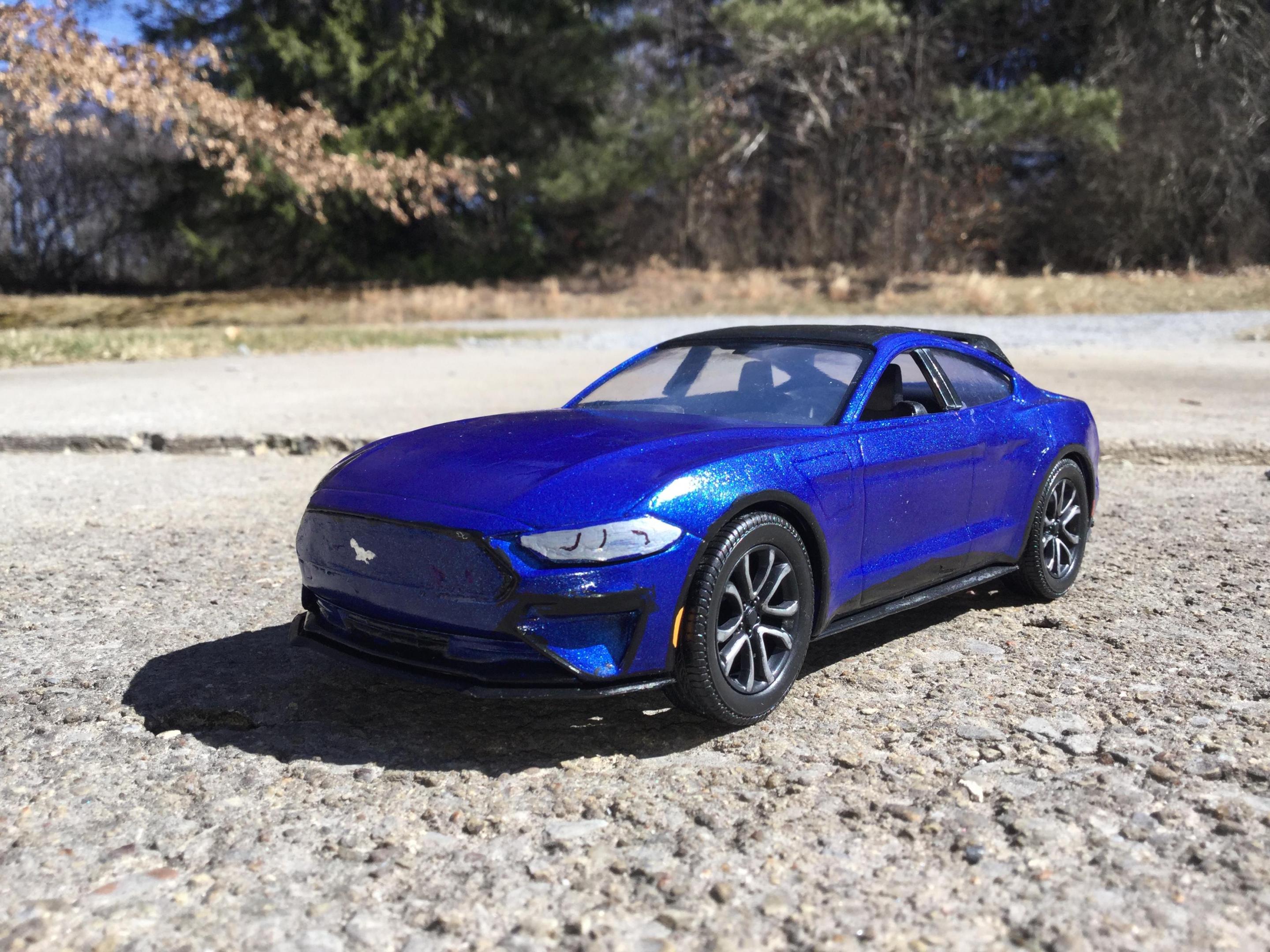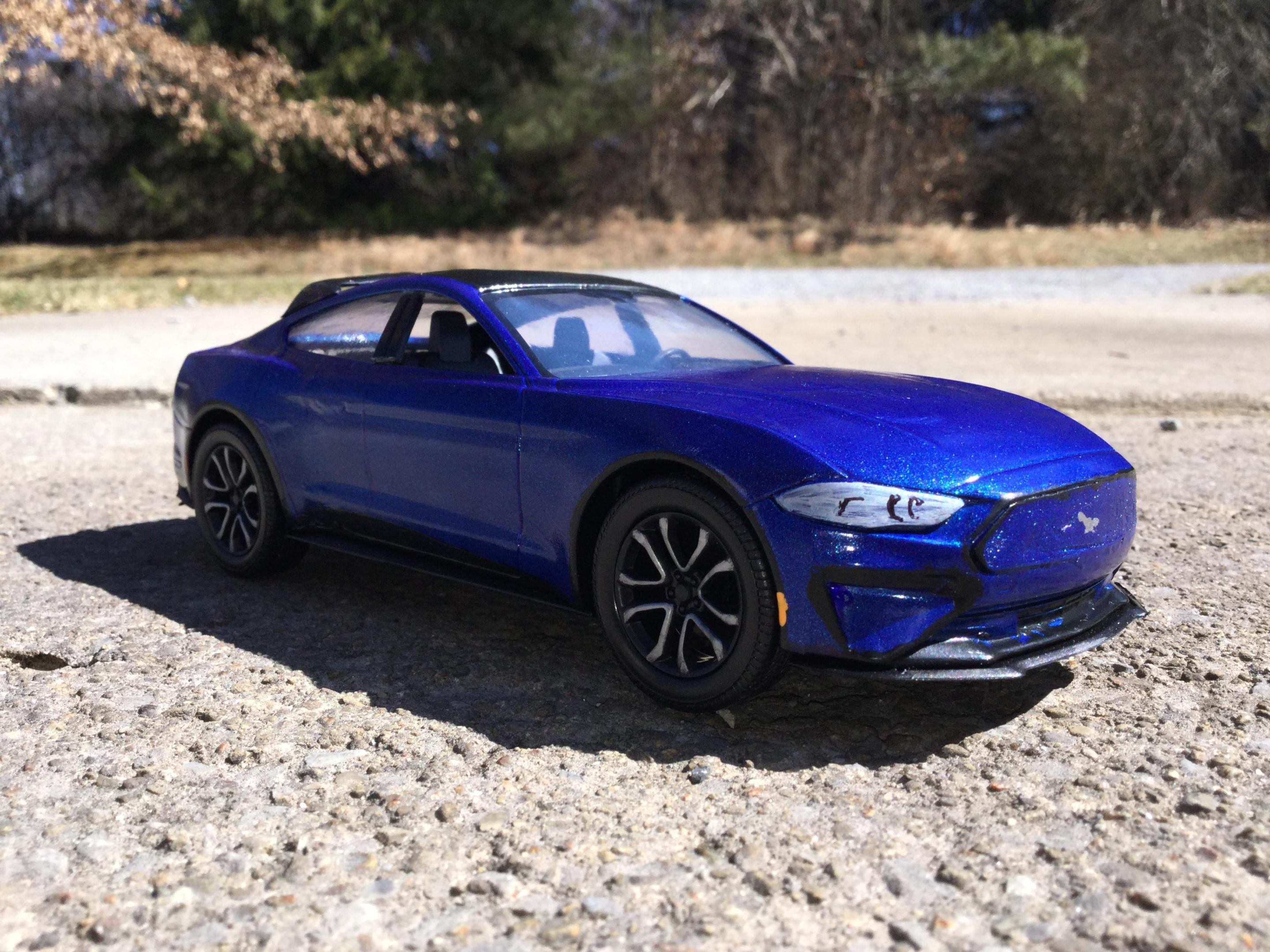 i made this with a revell build and play 2018 mustang kit and some putty and a part from my parts box i think these new mustang mach e's look sharp i had to make a model of one i had to cut apart the interior and remove some the front supports so i could slide the front half of the interior pan forward so the front seats would be in the correct space i filled in the original door panels and gas cap cover door and cut away the door handels sanded away the embossed exhaust tips on the lower rear part i rescribed the new door panels and recharge port cover and the hatch back lift door outline i filled in the the molded in hood scoops and grille i realized after i painted the body and started to put it back together i forgot to fill in the recesses on either side of the lower air dam i used some door posts from a 1/25th 2014 chevy silverado platic toy i bought for parts for custom models and cut them to fit used some clear plastic from a hot wheels packageing for the rear side windows i painted the body testors extreme lacquer de ja blue i also painted a little mustang horse on the grille and center of the taillight panel