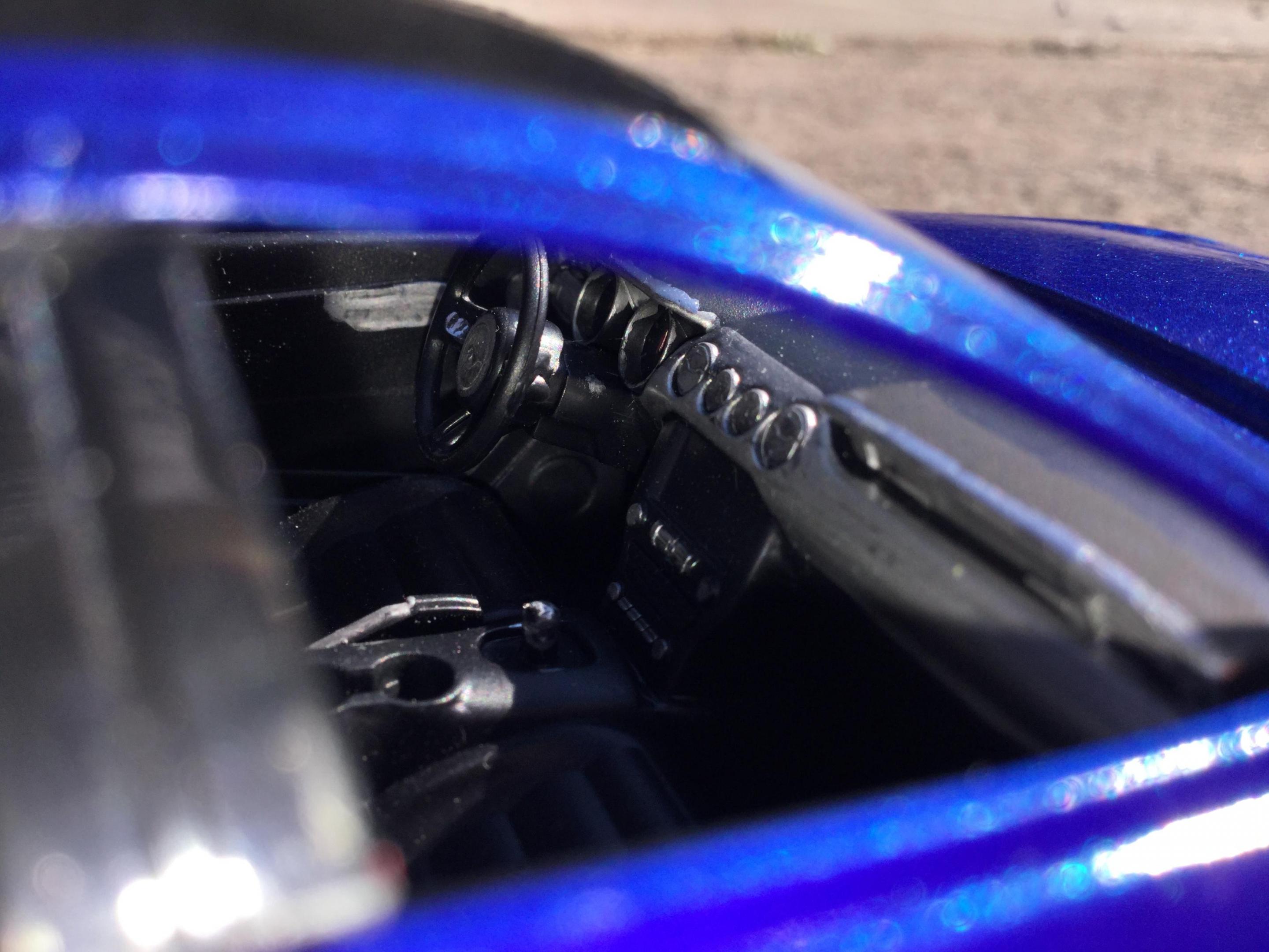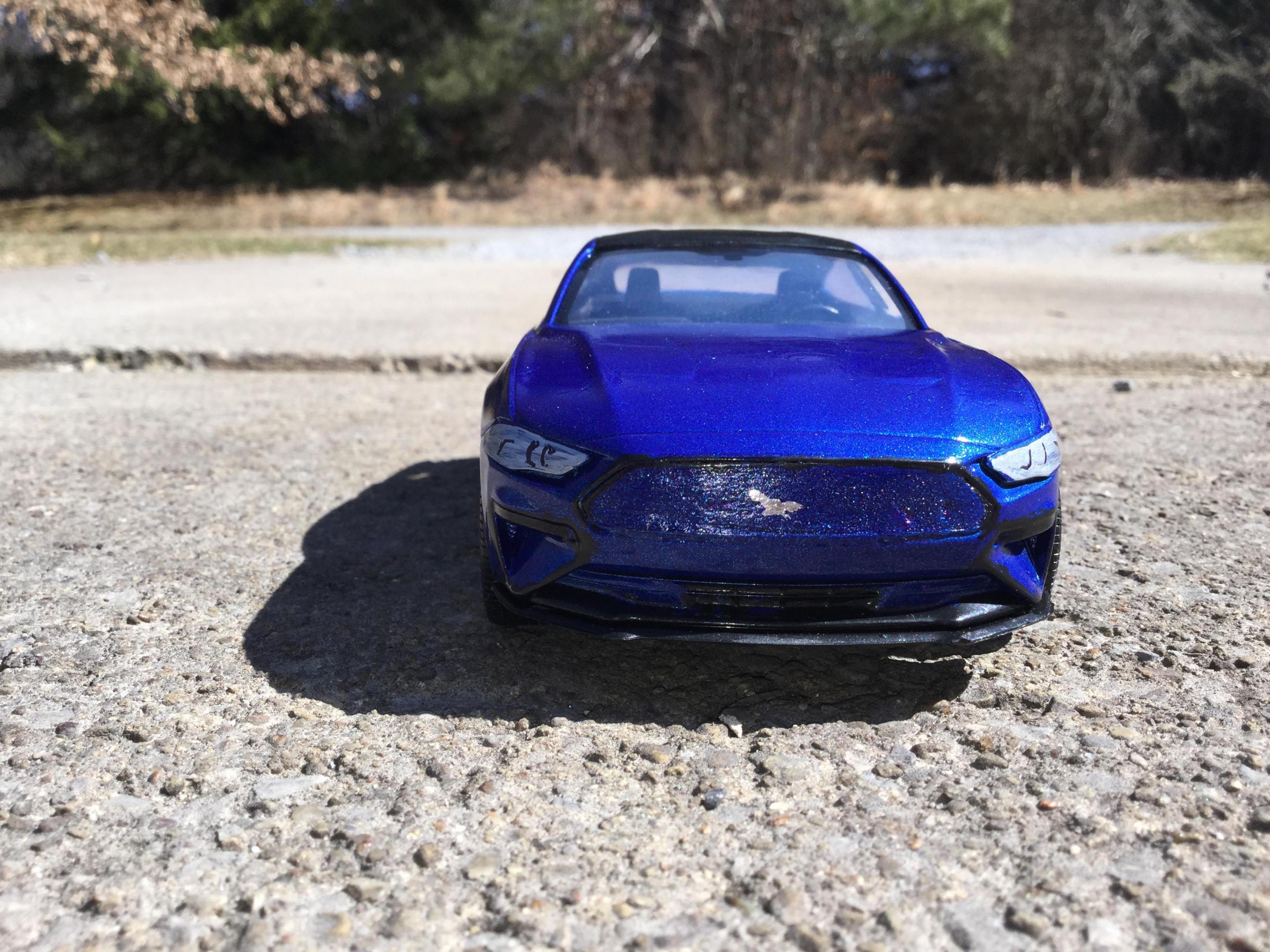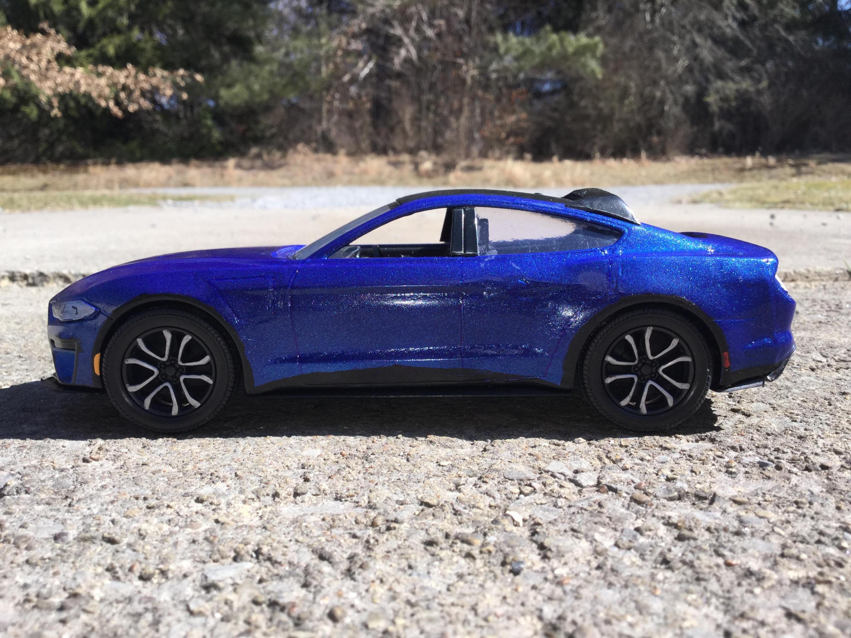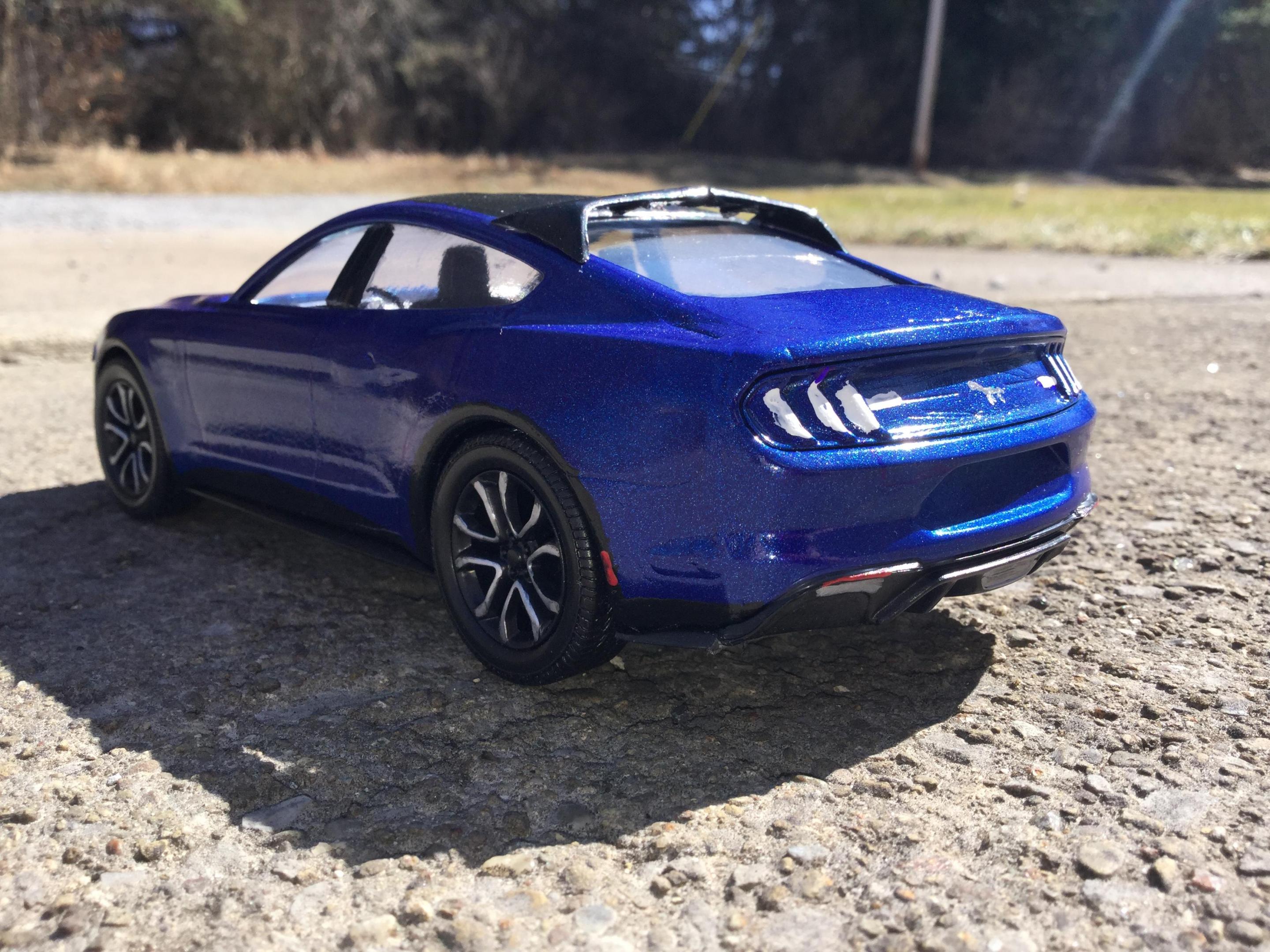 i made this with a revell build and play 2018 mustang kit and some putty and a part from my parts box i think these new mustang mach e's look sharp i had to make a model of one i had to cut apart the interior and remove some the front supports so i could slide the front half of the interior pan forward so the front seats would be in the correct space i filled in the original door panels and gas cap cover door and cut away the door handels sanded away the embossed exhaust tips on the lower rear part i rescribed the new door panels and recharge port cover and the hatch back lift door outline i filled in the the molded in hood scoops and grille i realized after i painted the body and started to put it back together i forgot to fill in the recesses on either side of the lower air dam i used some door posts from a 1/25th 2014 chevy silverado platic toy i bought for parts for custom models and cut them to fit used some clear plastic from a hot wheels packageing for the rear side windows i painted the body testors extreme lacquer de ja blue i also painted a little mustang horse on the grille and center of the taillight panel