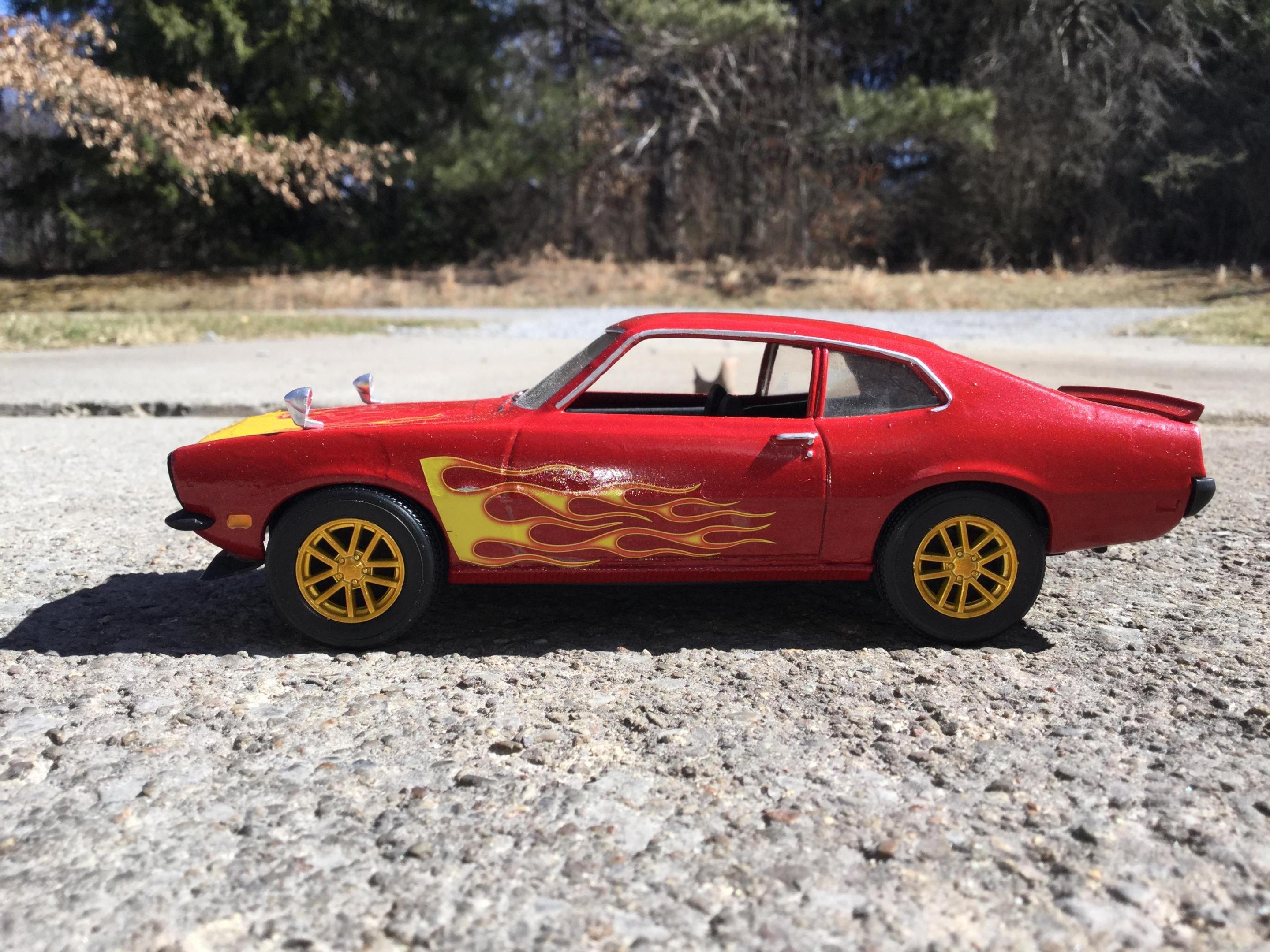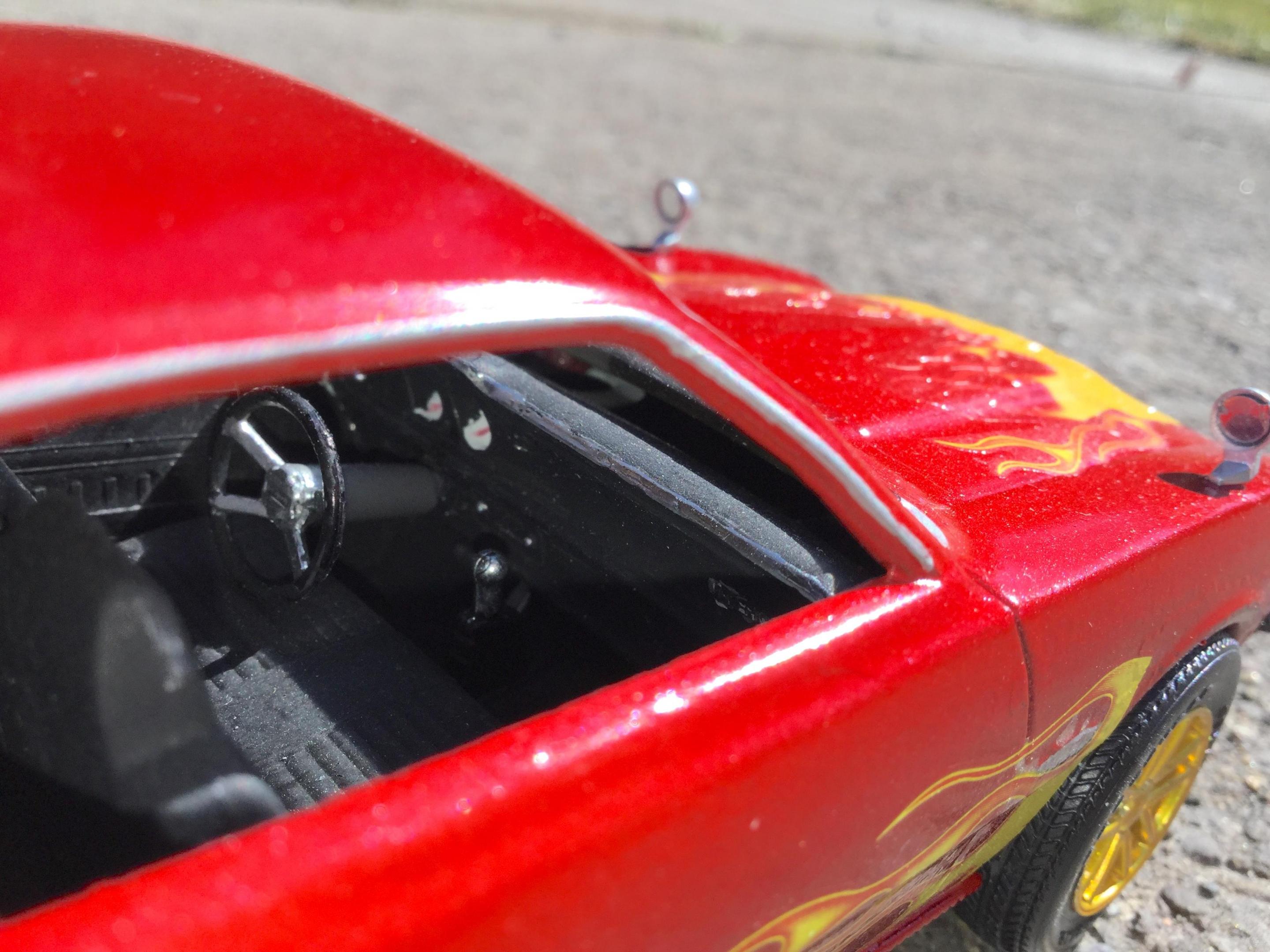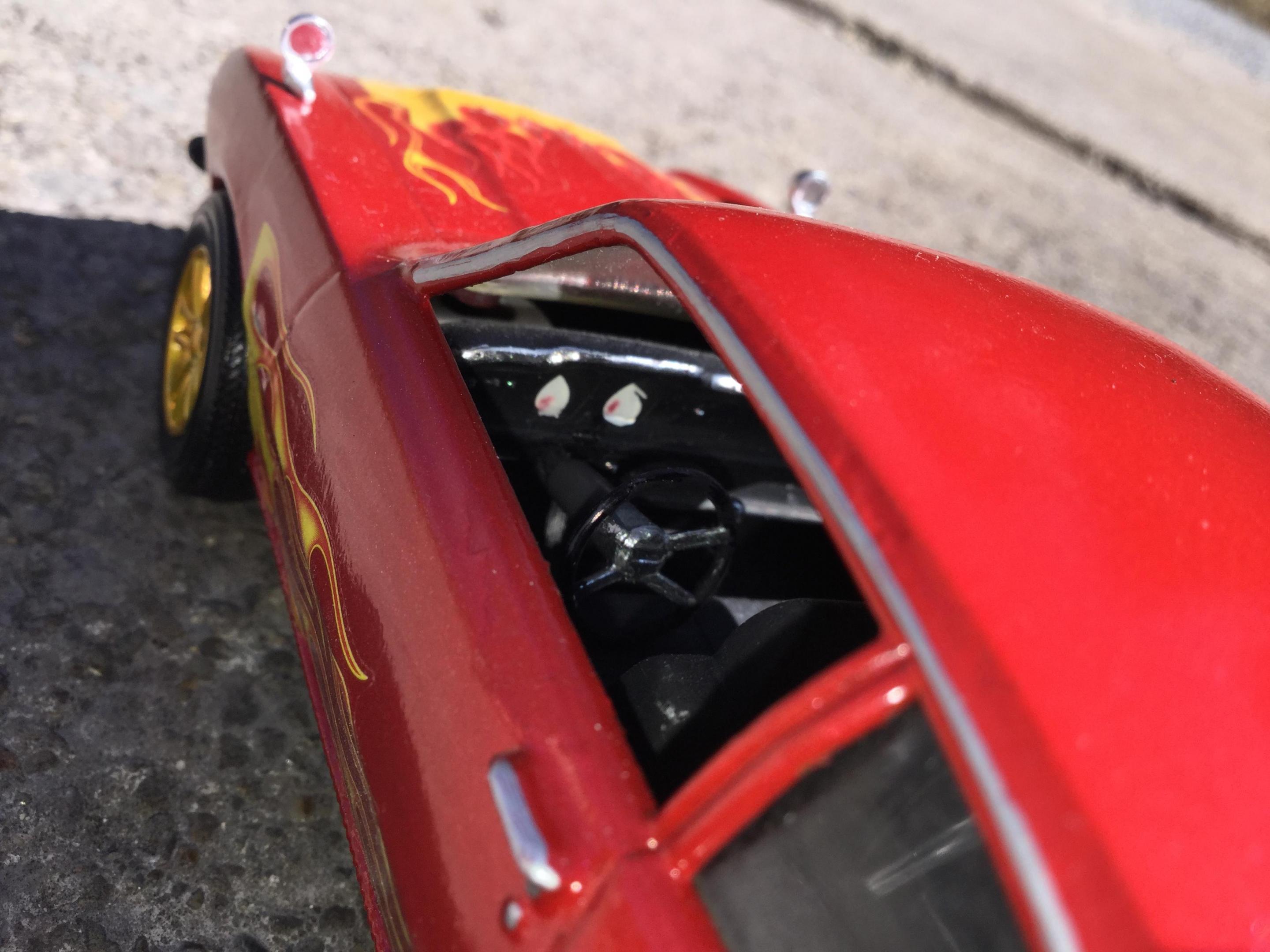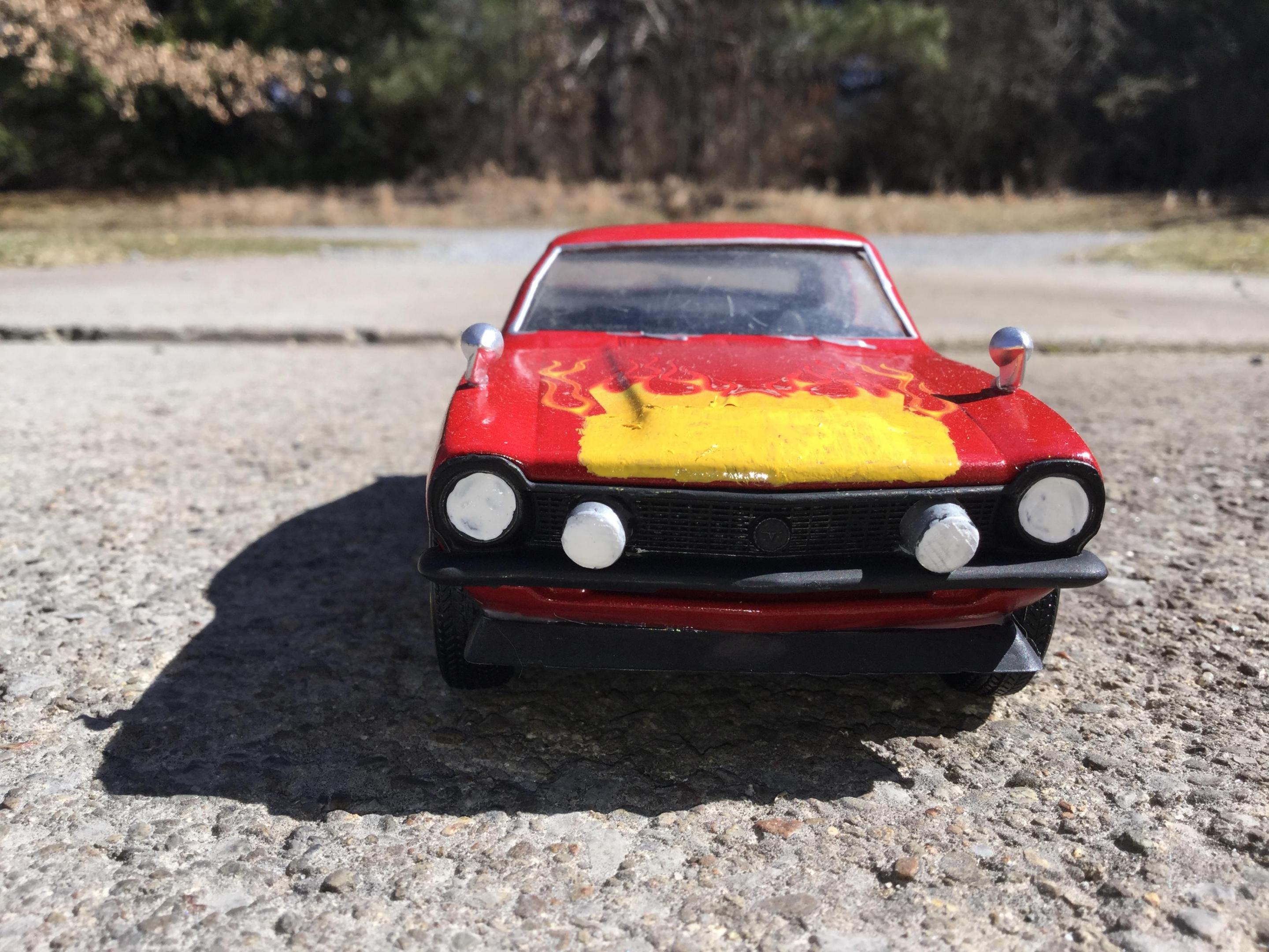 the body i painted with testors extreme lacquer revvin red i used a yellow testors paint pen to paint the extention of the hood flames down to the edge of the hood