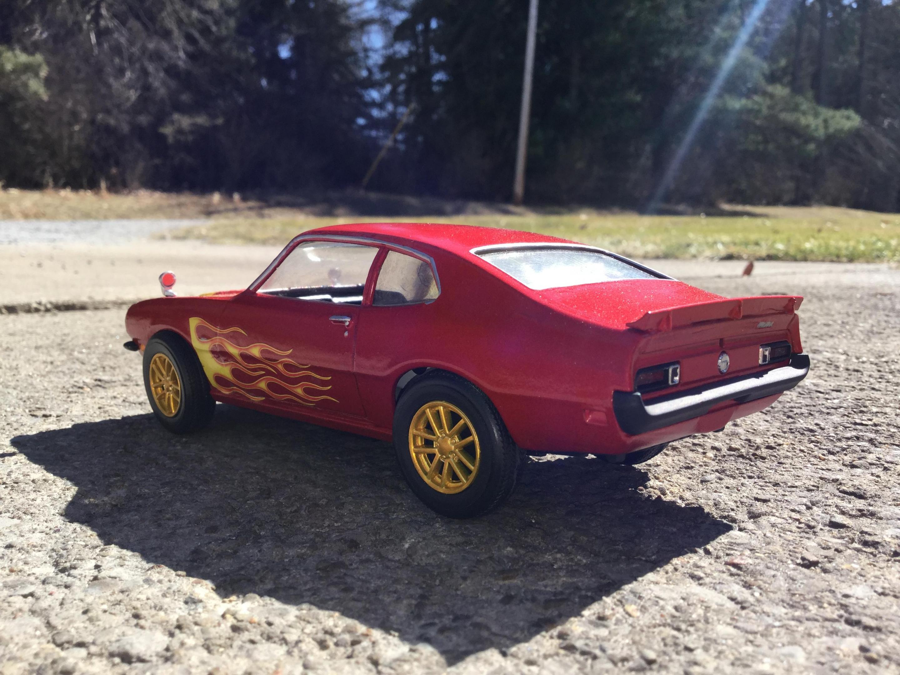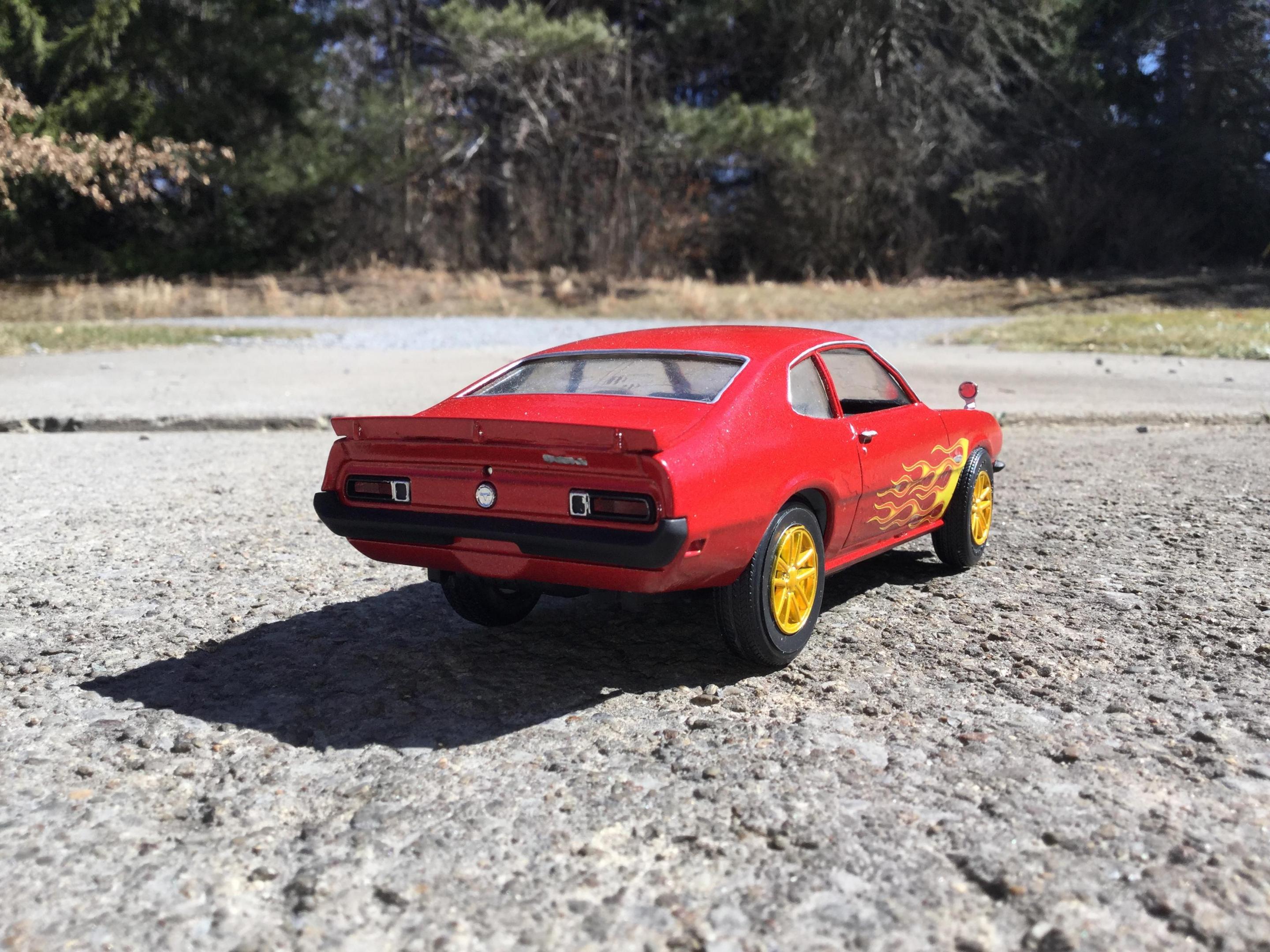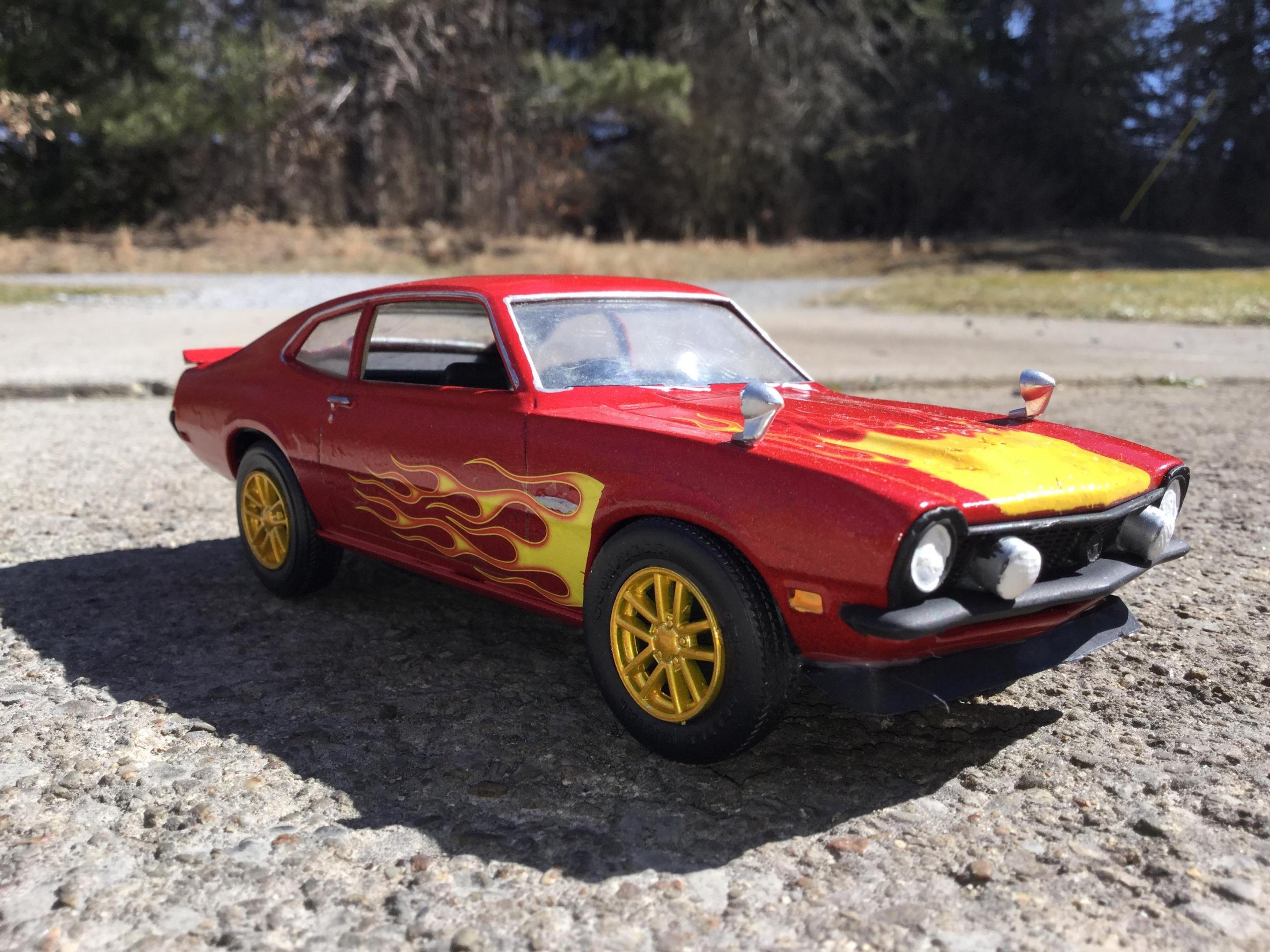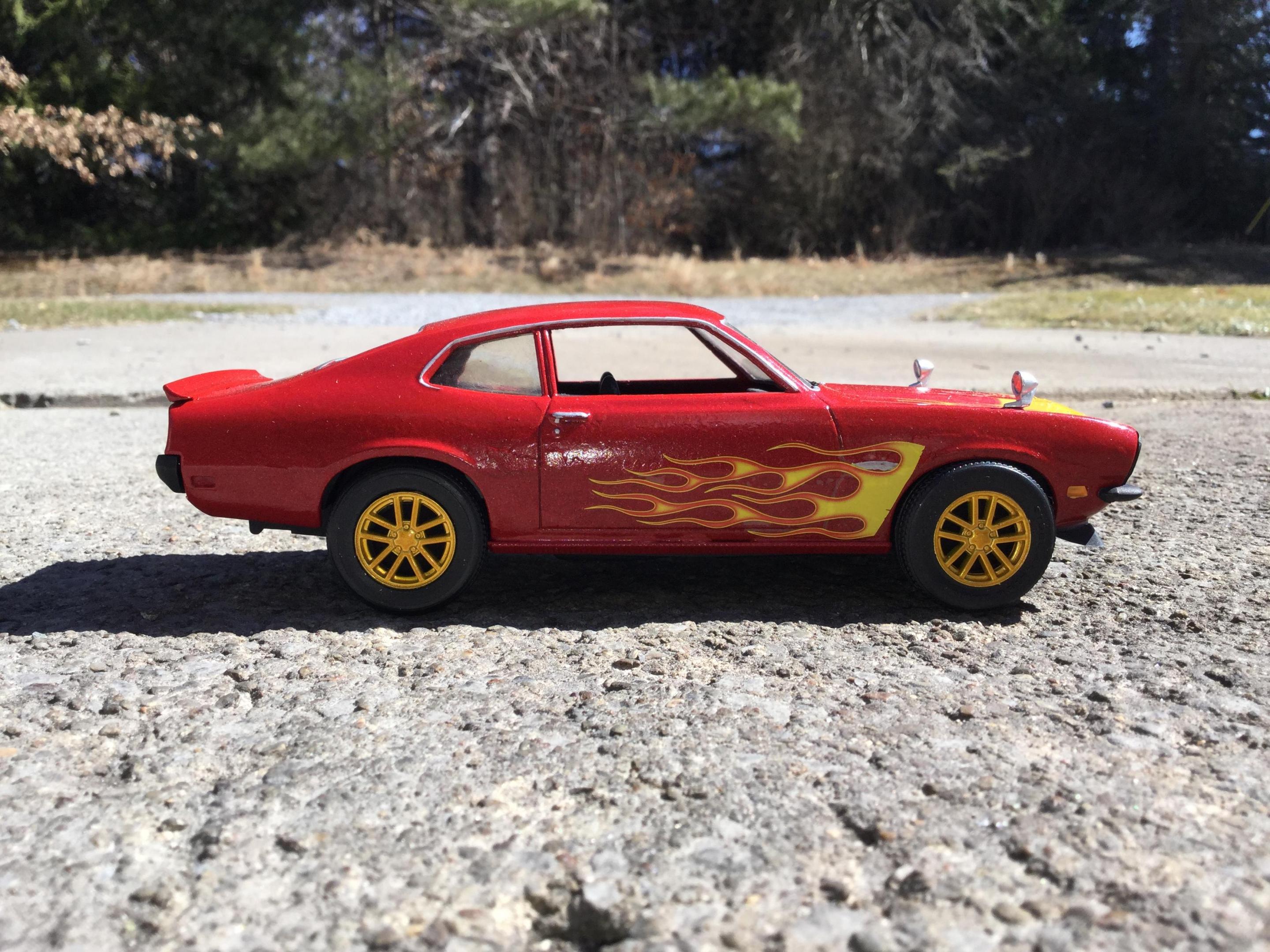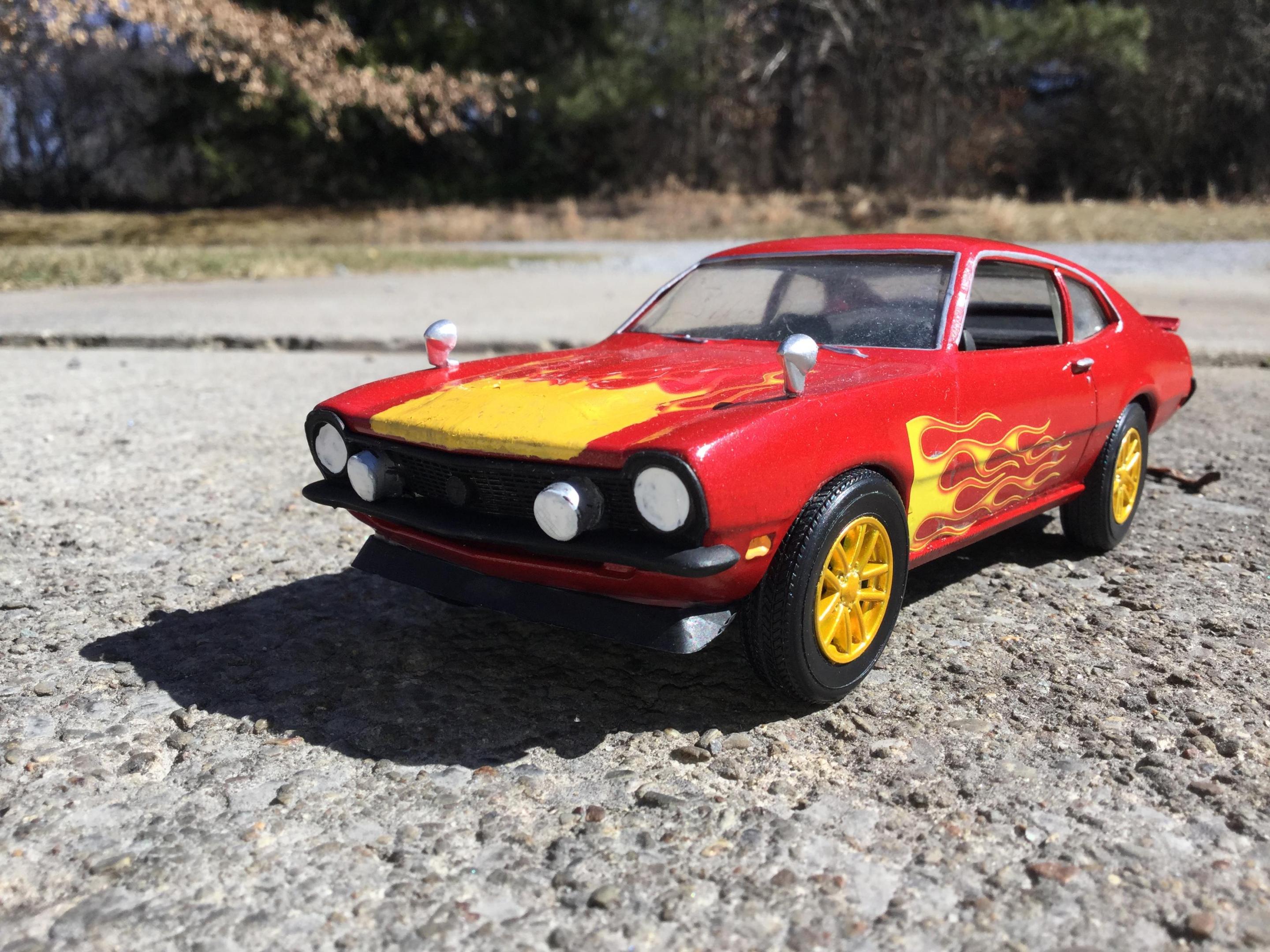 the body i painted with testors extreme lacquer revvin red i used a yellow testors paint pen to paint the extention of the hood flames down to the edge of the hood