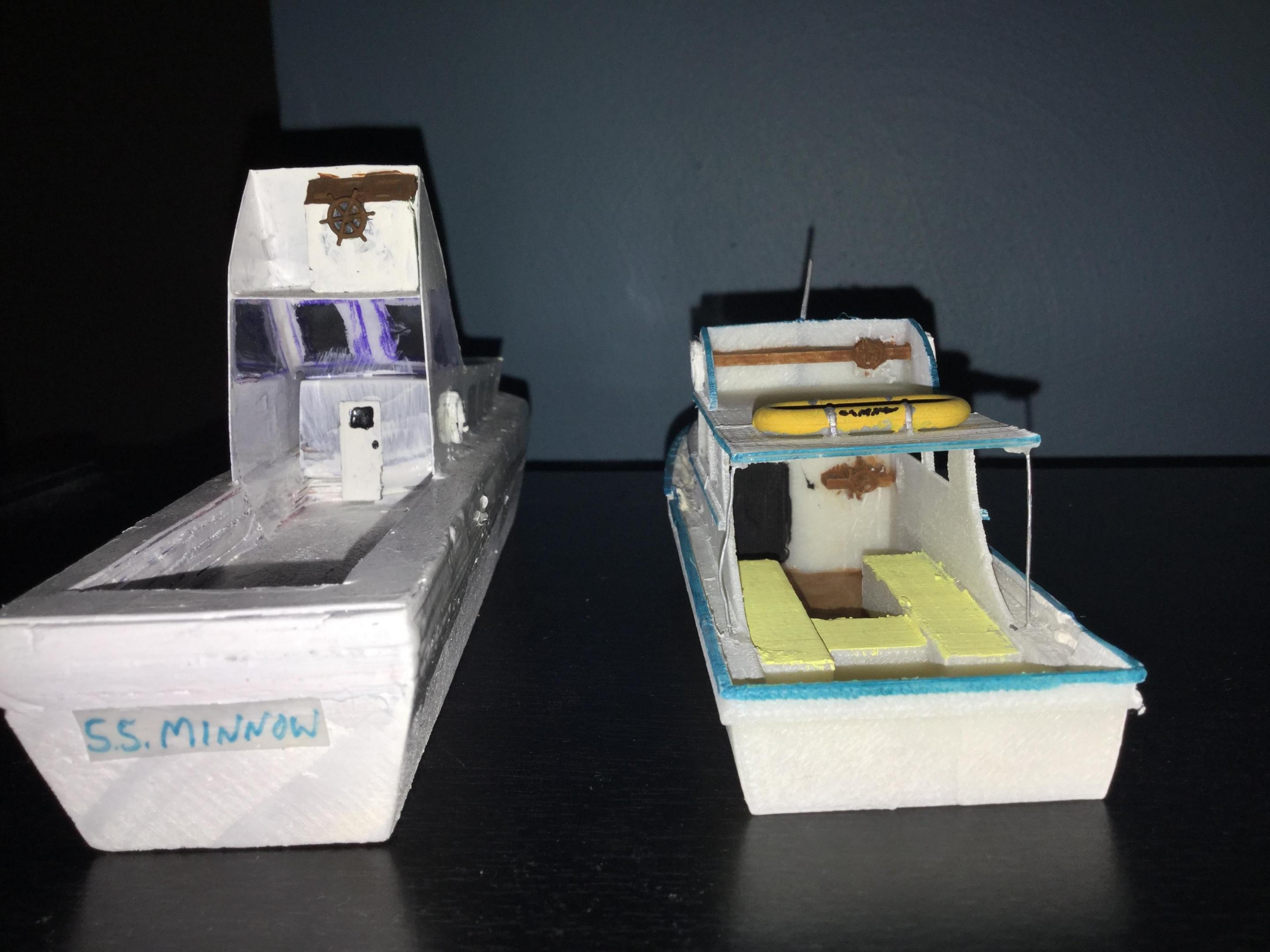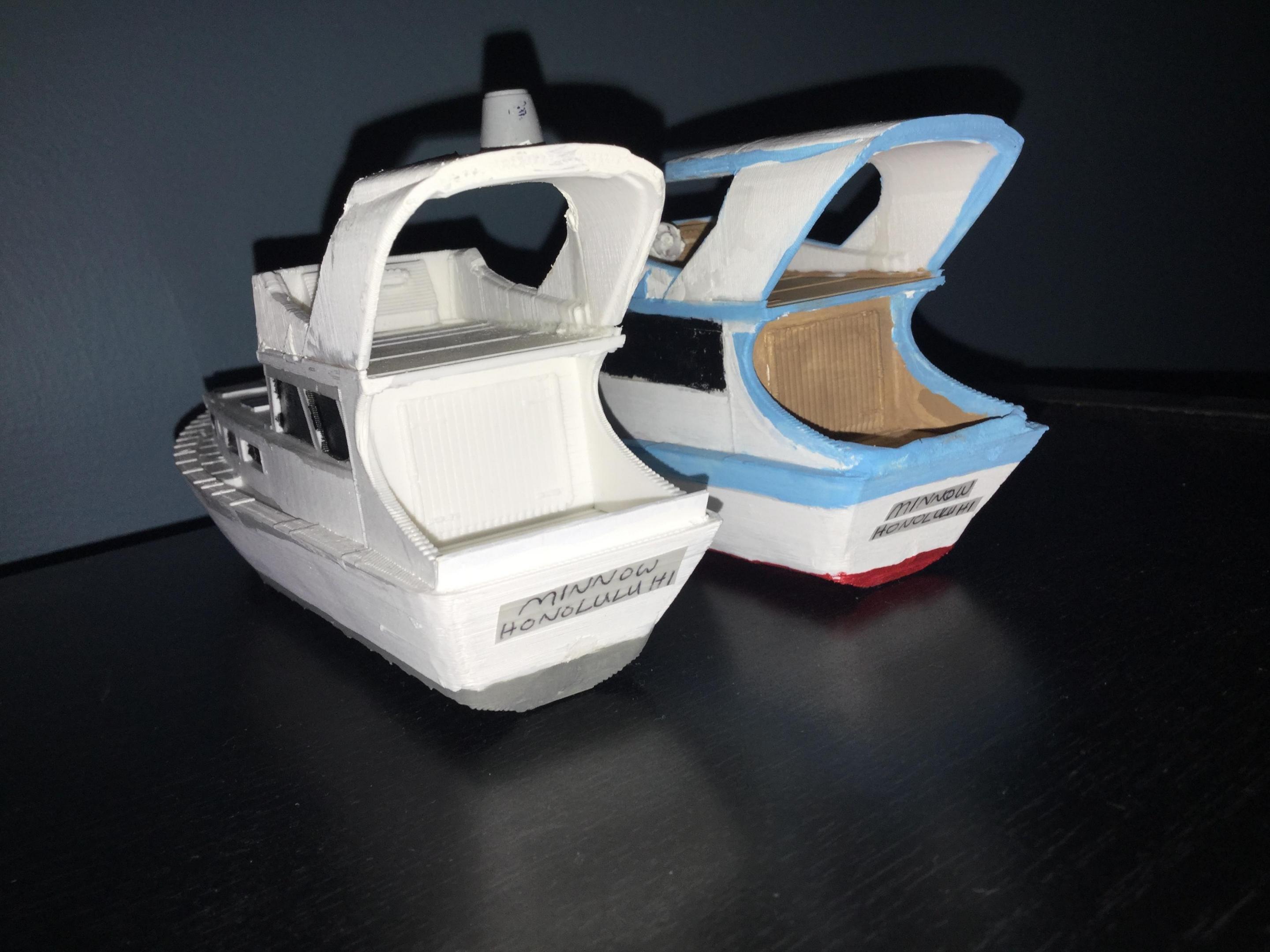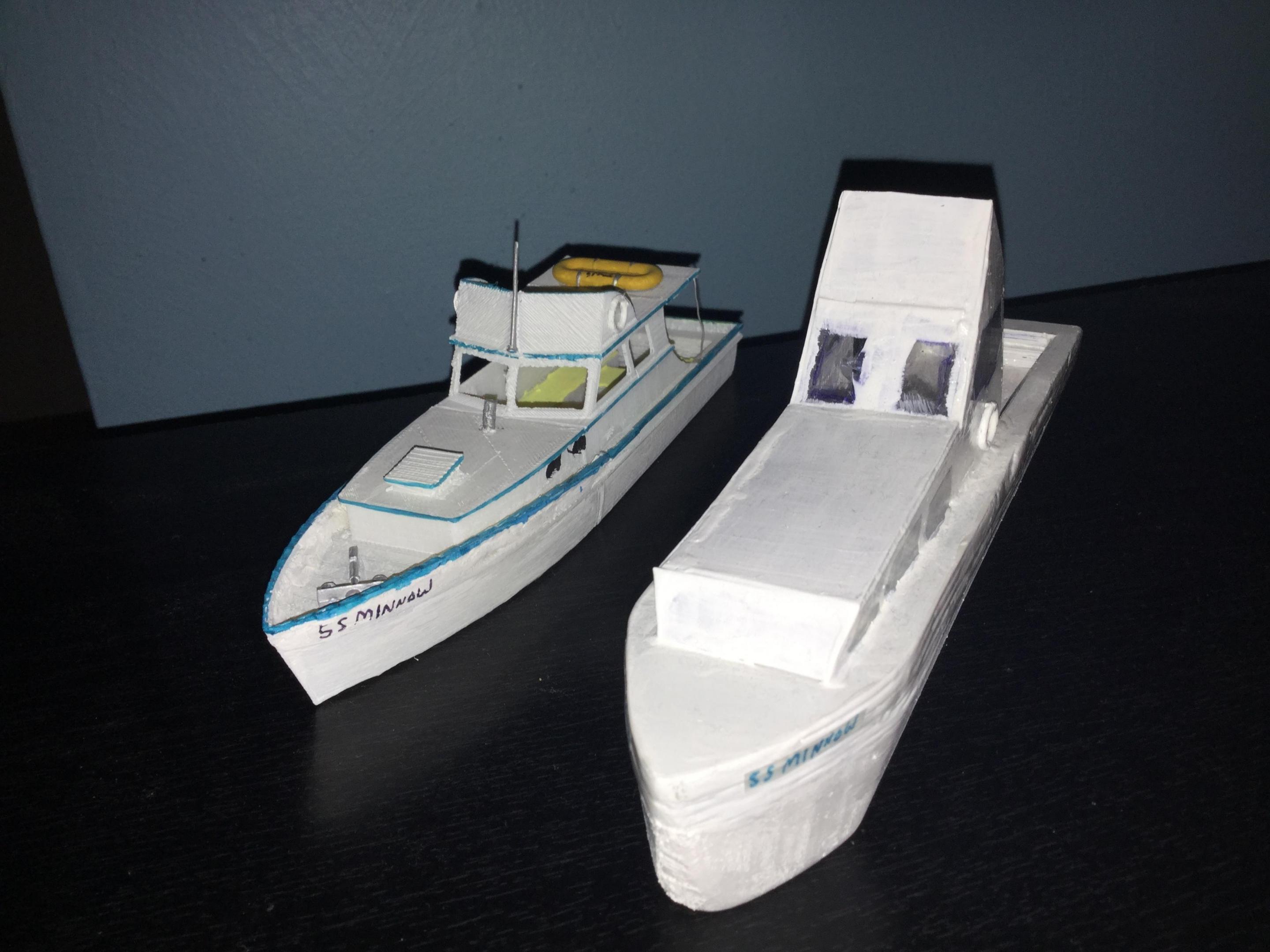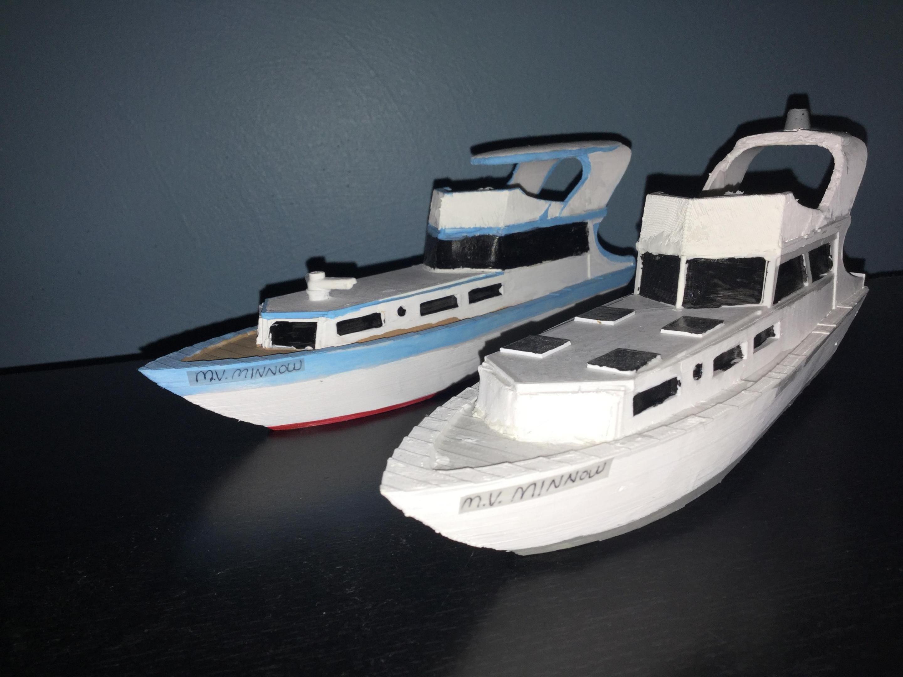 here are my 1/72nd scale s.s minnows and m.v minnows one s.s minnow is from the first season opening of the series and 2nd one is the s.s minnow from the second and third season openings of the series the other 2 are modern what if they remade gilligan's island today i changed the s.s to m.v as thats what it should have been m.v to start with as the minnow was powered by a inboard diesel marine engine not a steam engine what s.s stands for is steam ship and m.v is motor vessel the second and third season opening minnow i scratch built for the most part the the flybridge controls and wheel are from pt-109 model same with the door in the main cabin and the life rings on eaither side of the main cabin most of the hull is wood wich came from a craft store wood model kit which i reshaped and the rest is made from sheet styrene the other 3 minnows are 3d printed with the some small mods i added or changed