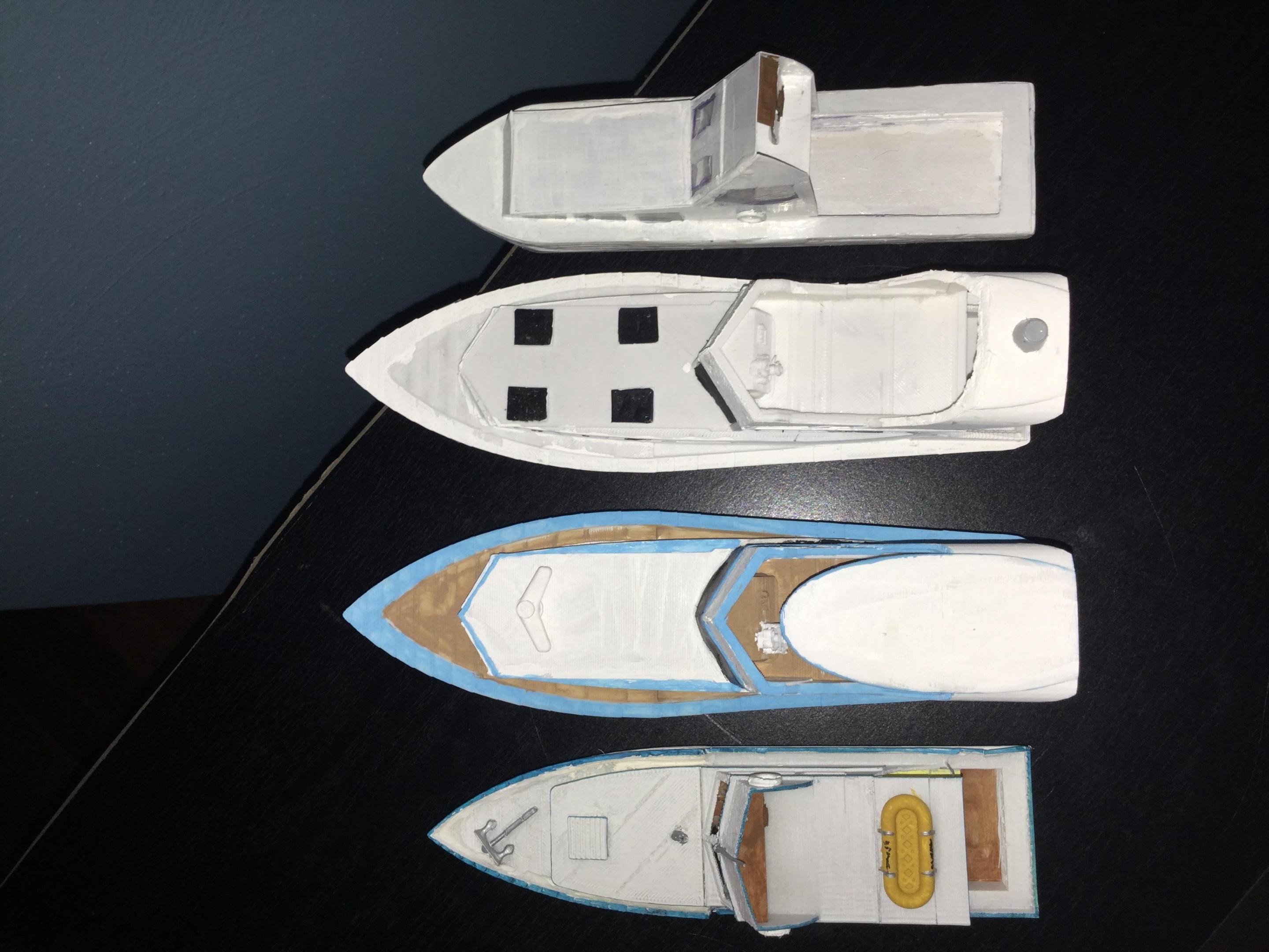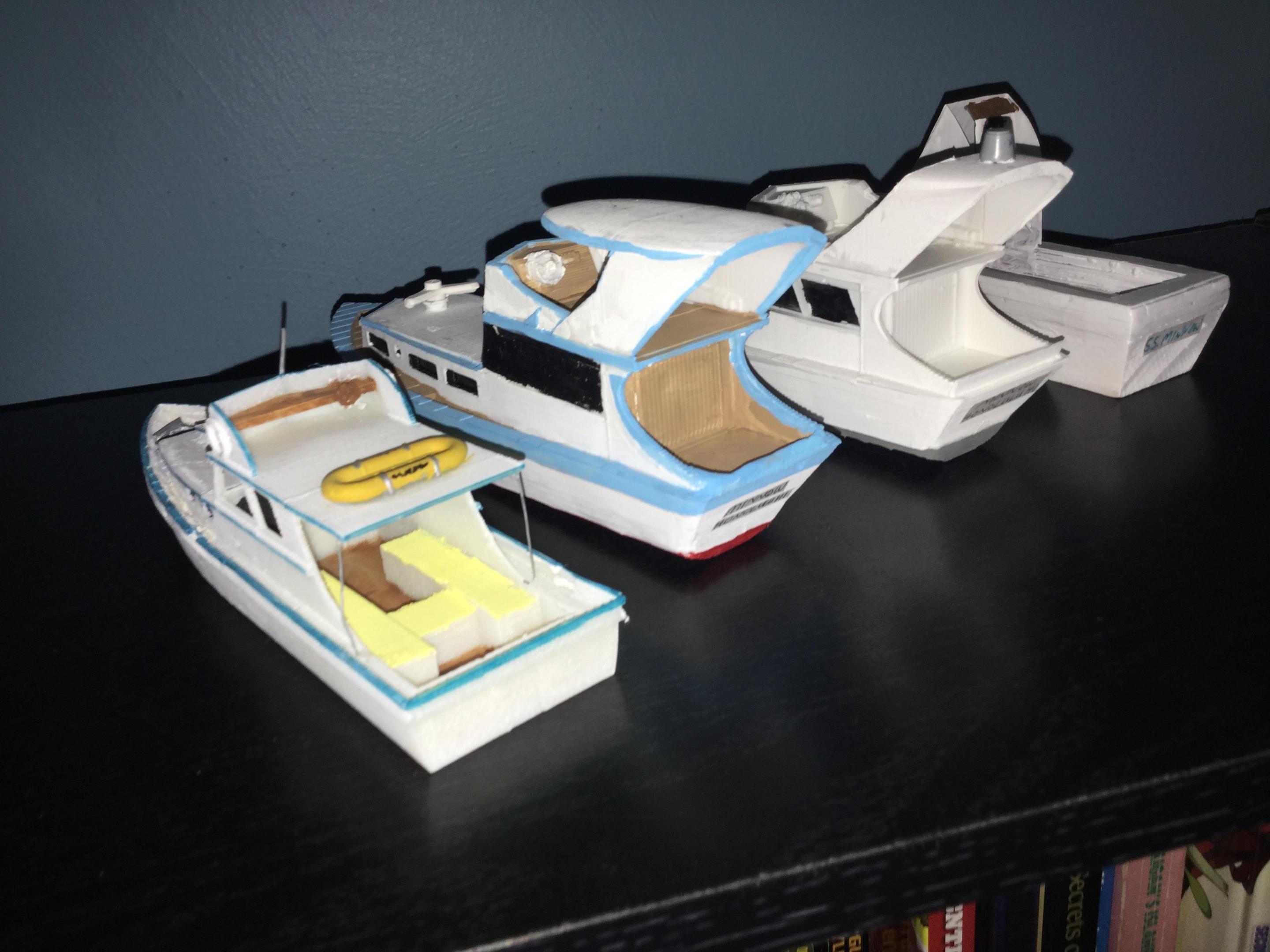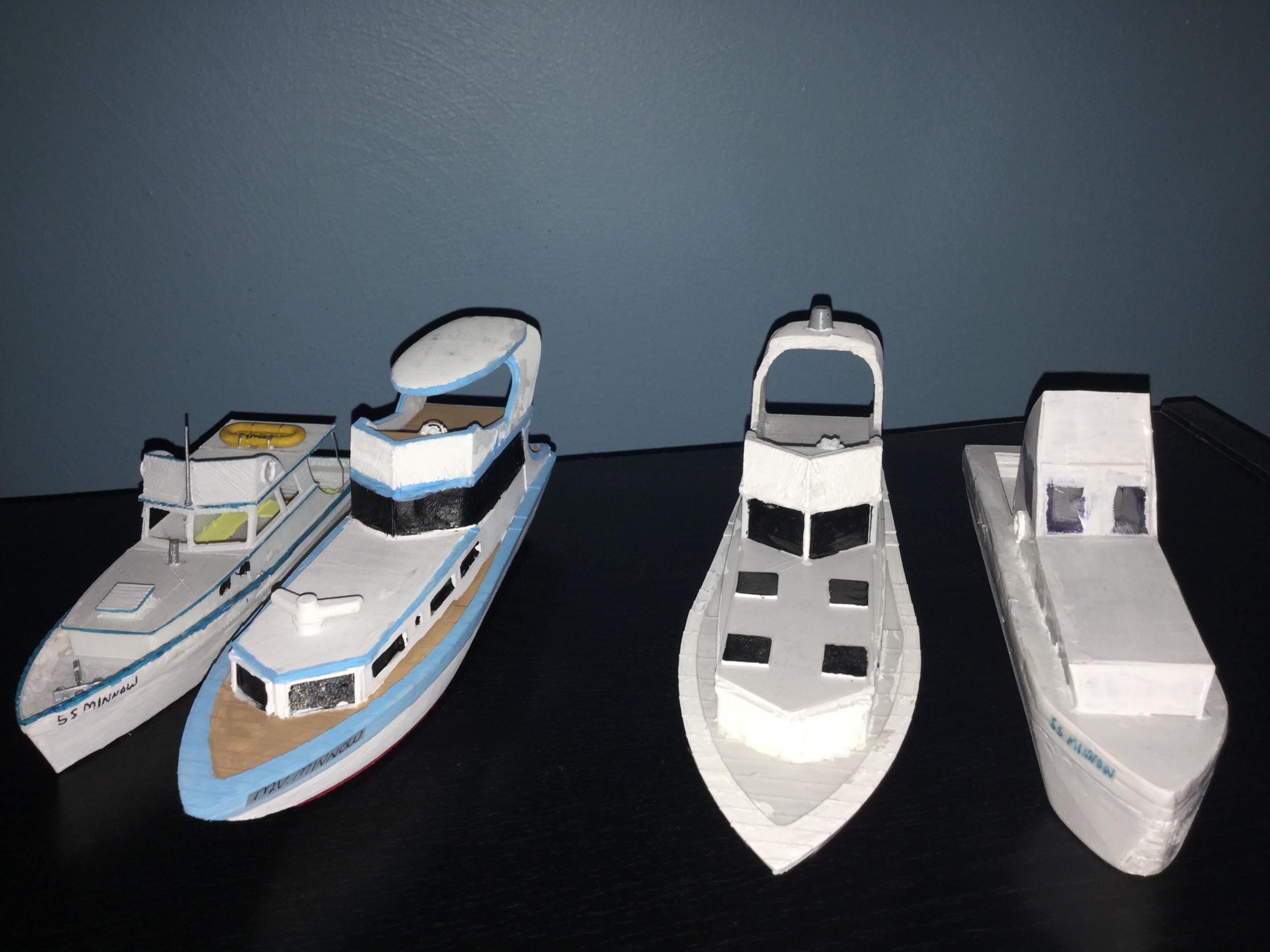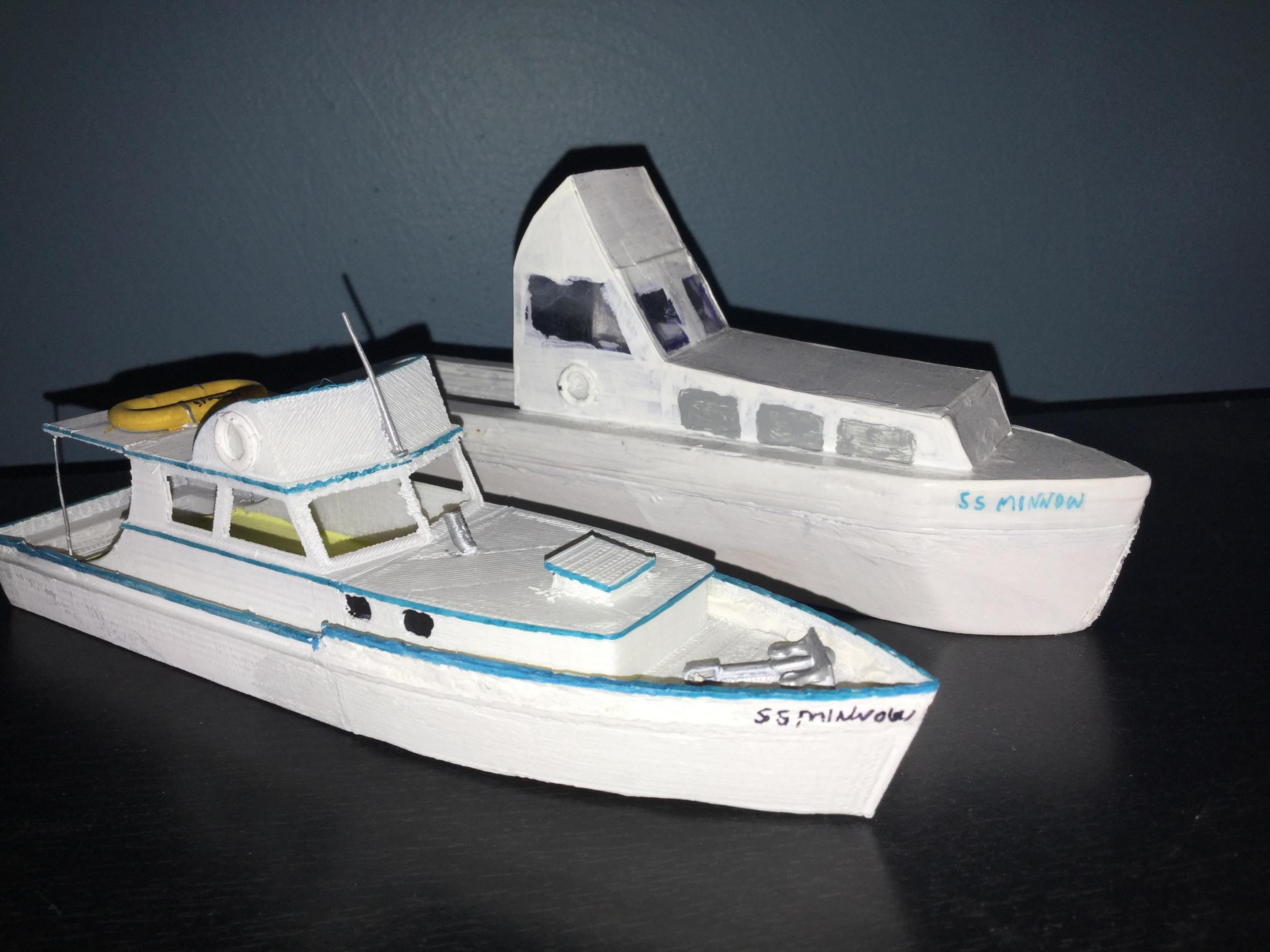 here are my 1/72nd scale s.s minnows and m.v minnows one s.s minnow is from the first season opening of the series and 2nd one is the s.s minnow from the second and third season openings of the series the other 2 are modern what if they remade gilligan's island today i changed the s.s to m.v as thats what it should have been m.v to start with as the minnow was powered by a inboard diesel marine engine not a steam engine what s.s stands for is steam ship and m.v is motor vessel the second and third season opening minnow i scratch built for the most part the the flybridge controls and wheel are from pt-109 model same with the door in the main cabin and the life rings on eaither side of the main cabin most of the hull is wood wich came from a craft store wood model kit which i reshaped and the rest is made from sheet styrene the other 3 minnows are 3d printed with the some small mods i added or changed