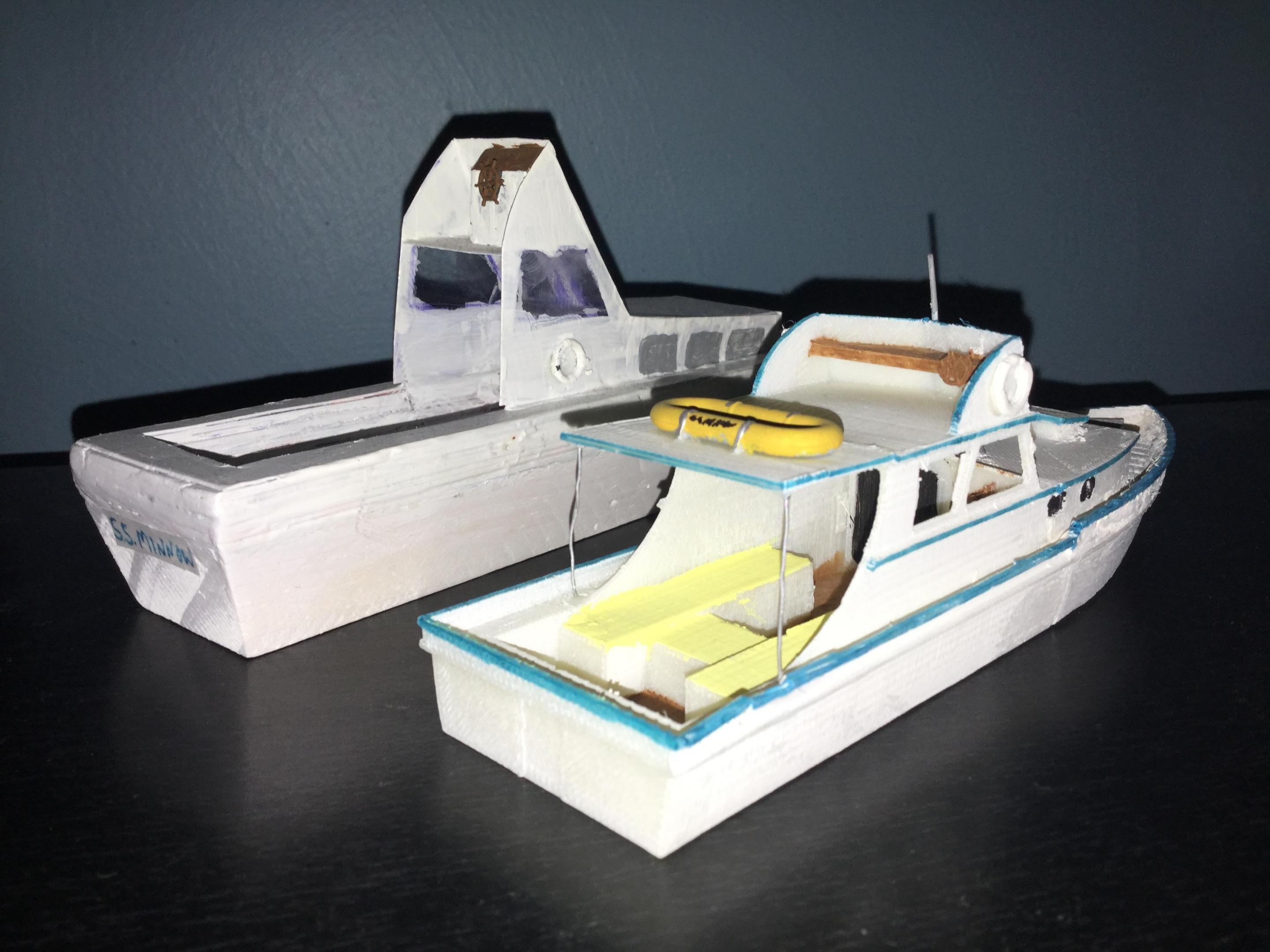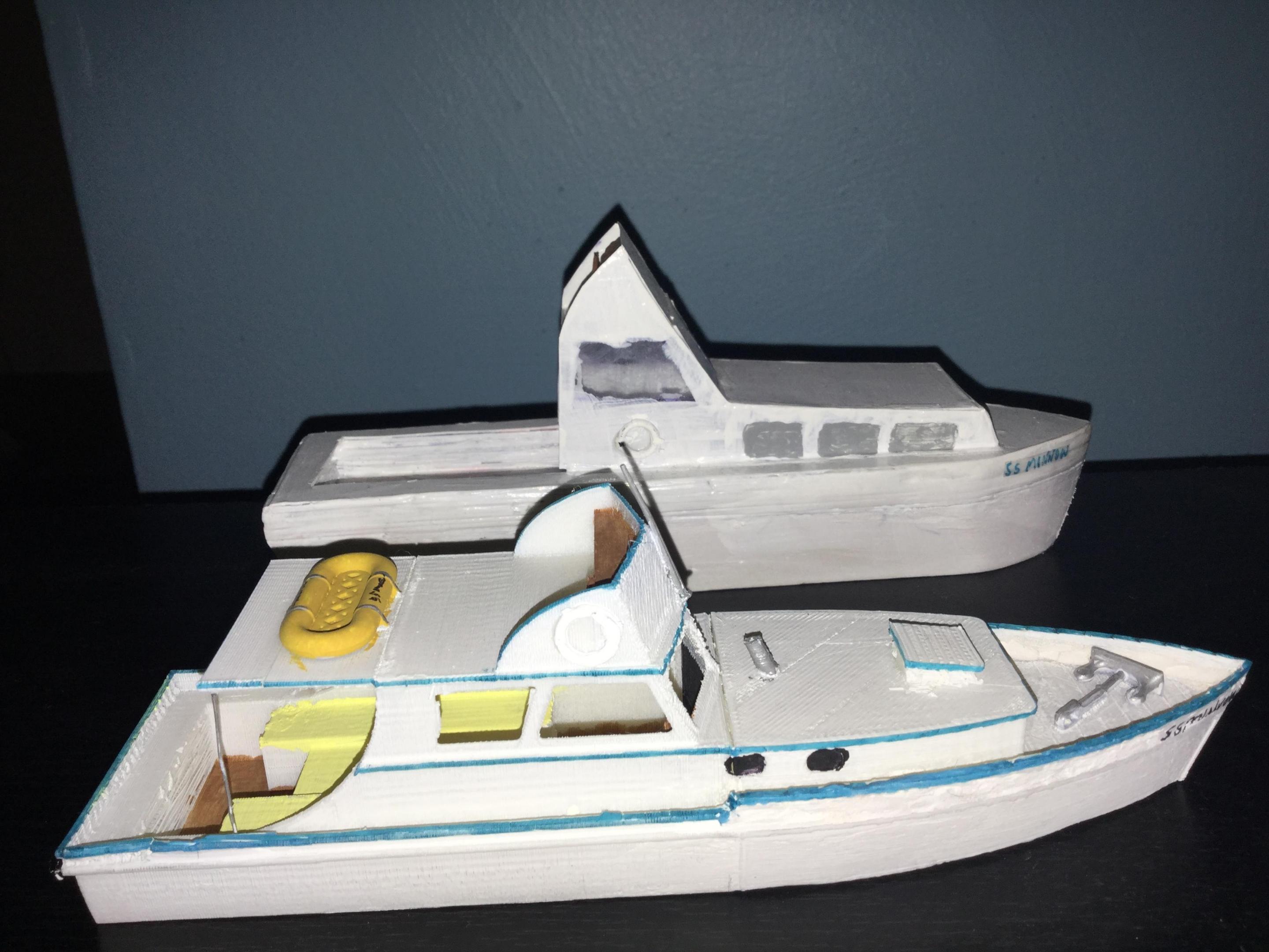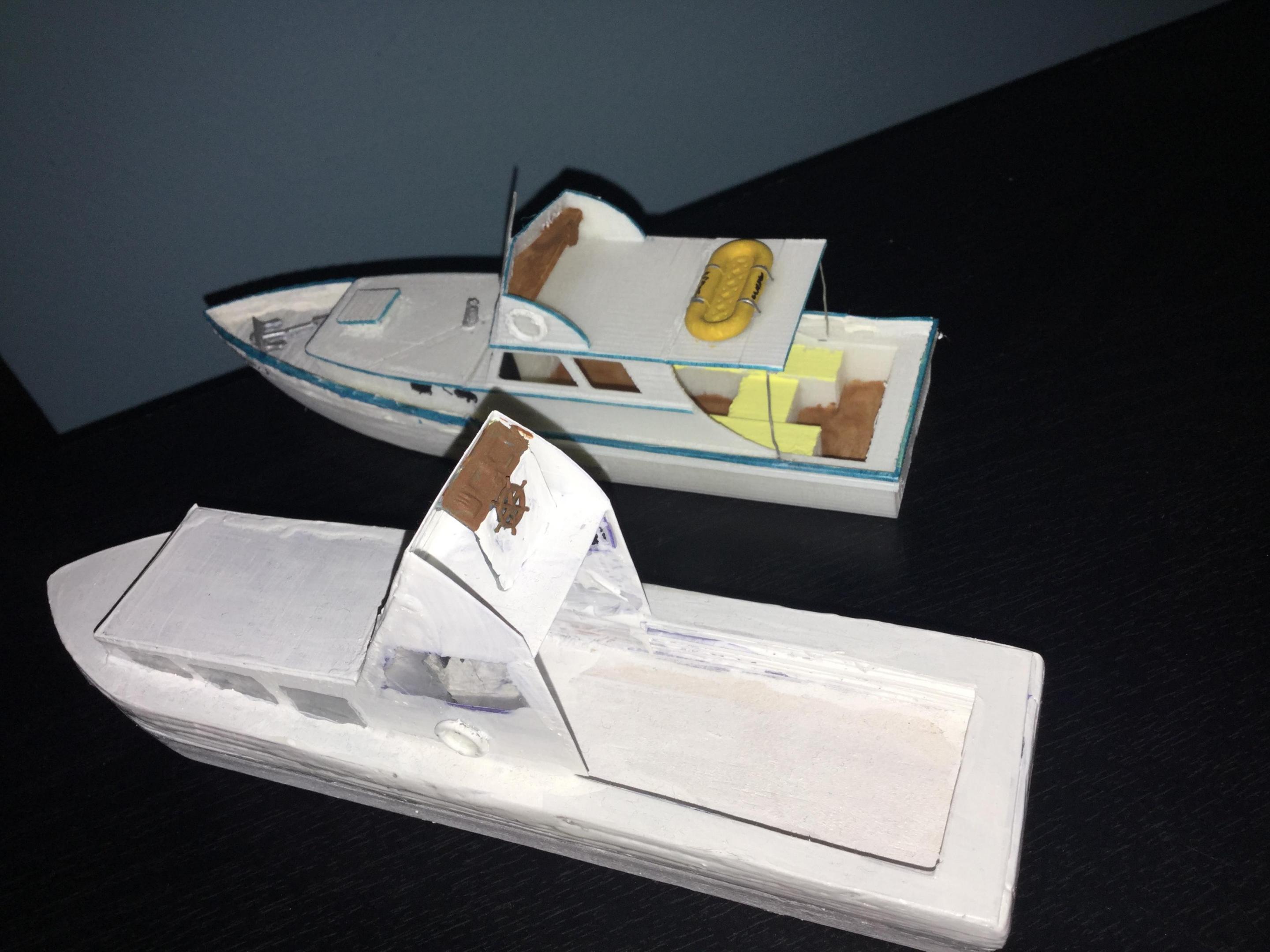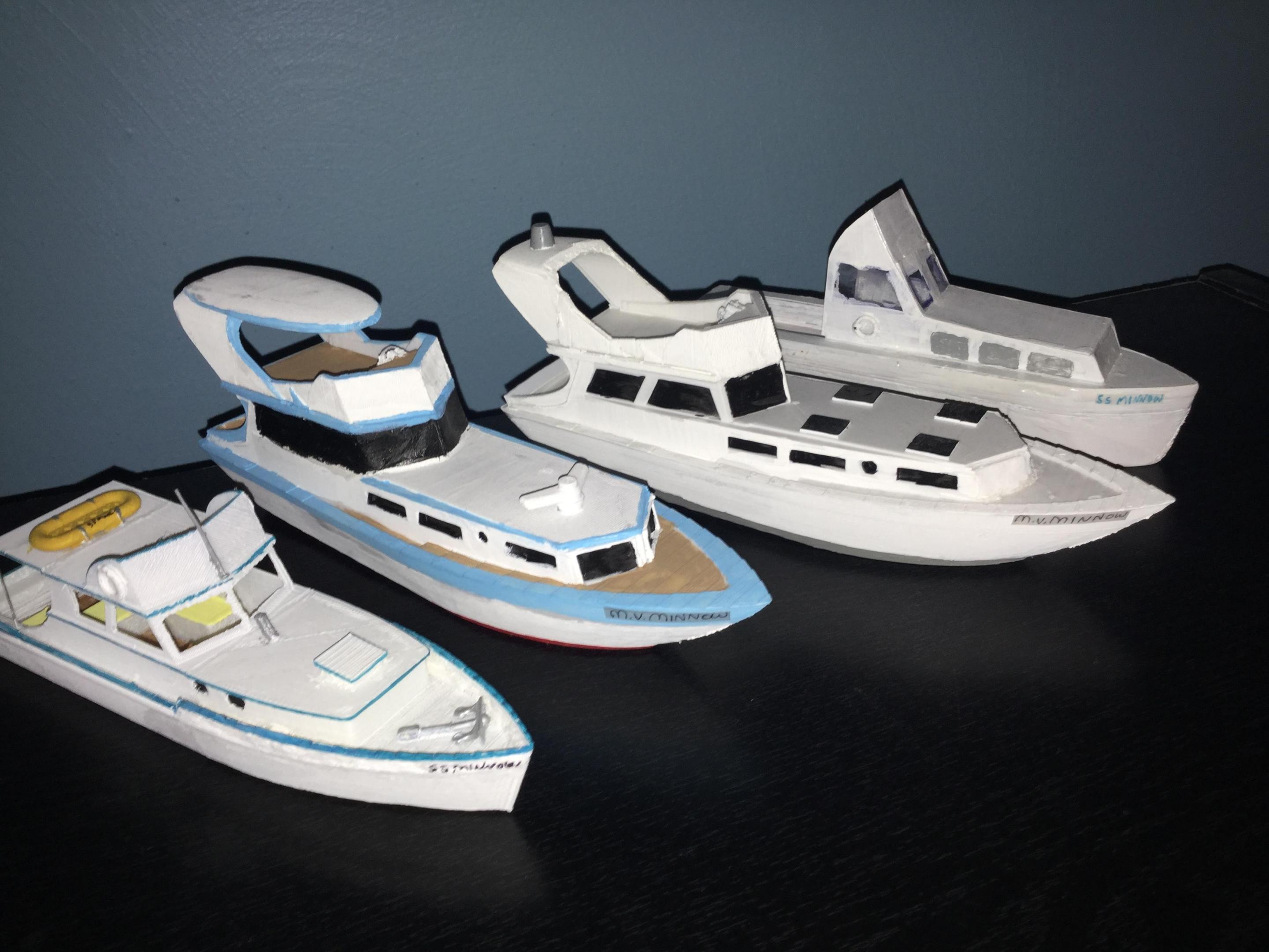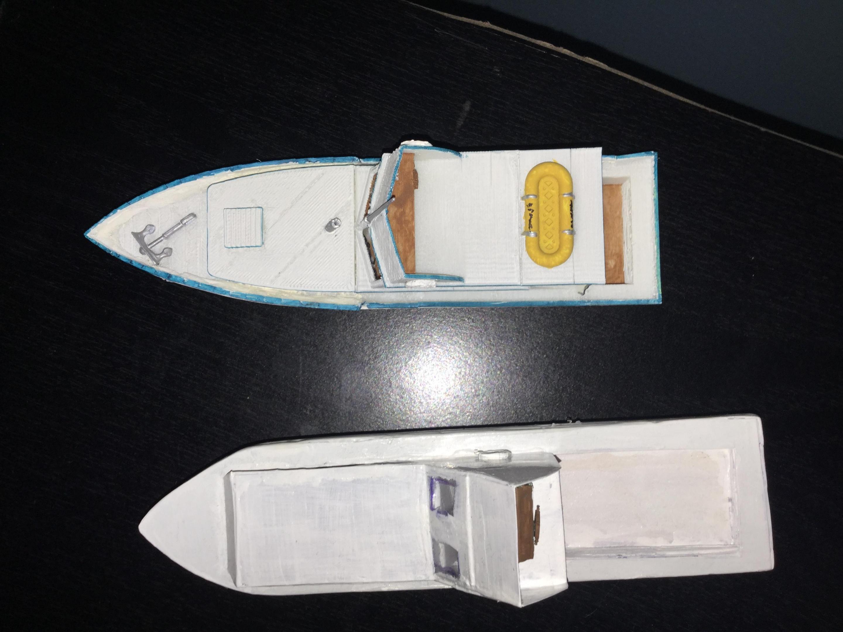 here are my 1/72nd scale s.s minnows and m.v minnows one s.s minnow is from the first season opening of the series and 2nd one is the s.s minnow from the second and third season openings of the series the other 2 are modern what if they remade gilligan's island today i changed the s.s to m.v as thats what it should have been m.v to start with as the minnow was powered by a inboard diesel marine engine not a steam engine what s.s stands for is steam ship and m.v is motor vessel the second and third season opening minnow i scratch built for the most part the the flybridge controls and wheel are from pt-109 model same with the door in the main cabin and the life rings on eaither side of the main cabin most of the hull is wood wich came from a craft store wood model kit which i reshaped and the rest is made from sheet styrene the other 3 minnows are 3d printed with the some small mods i added or changed