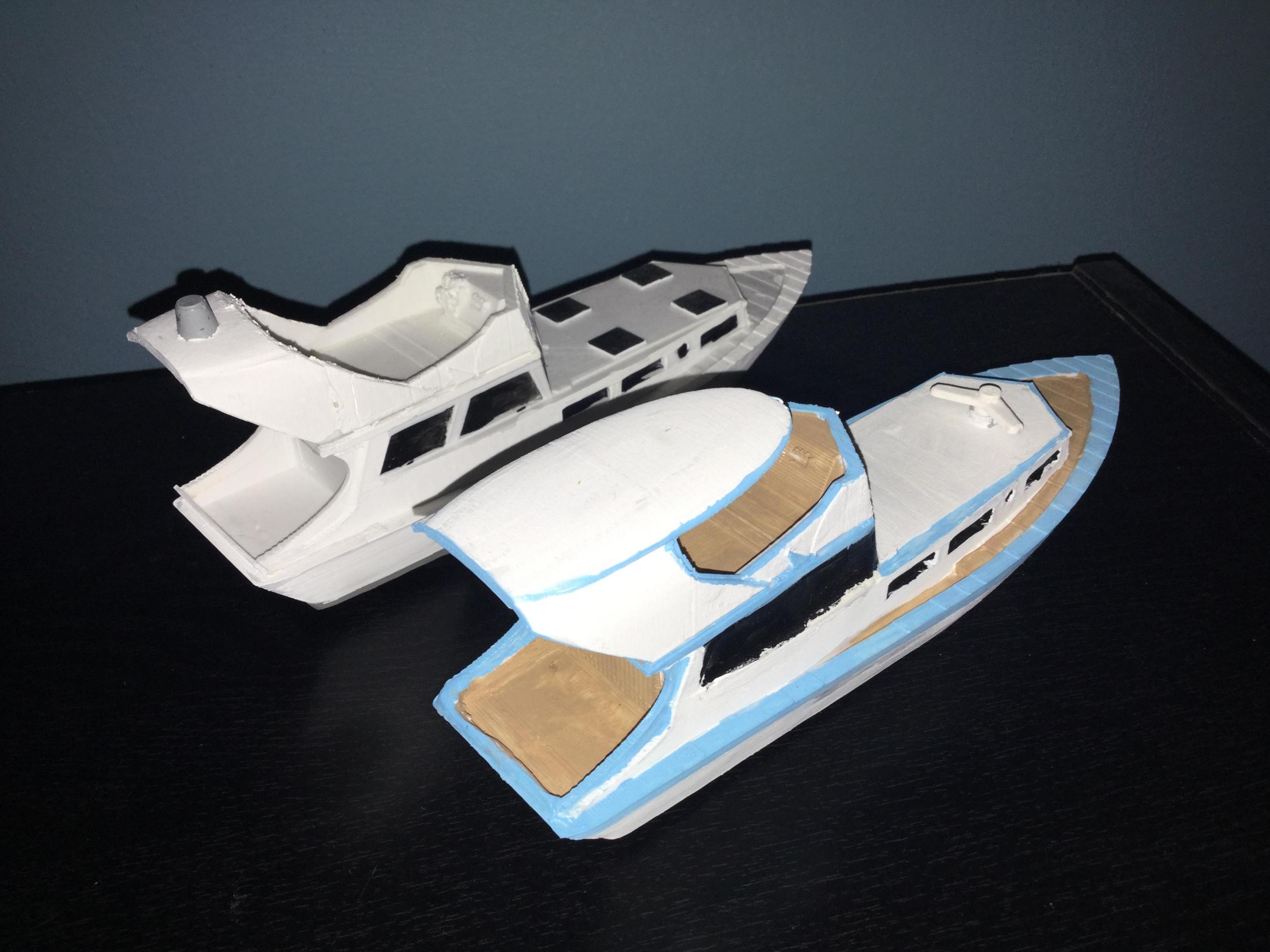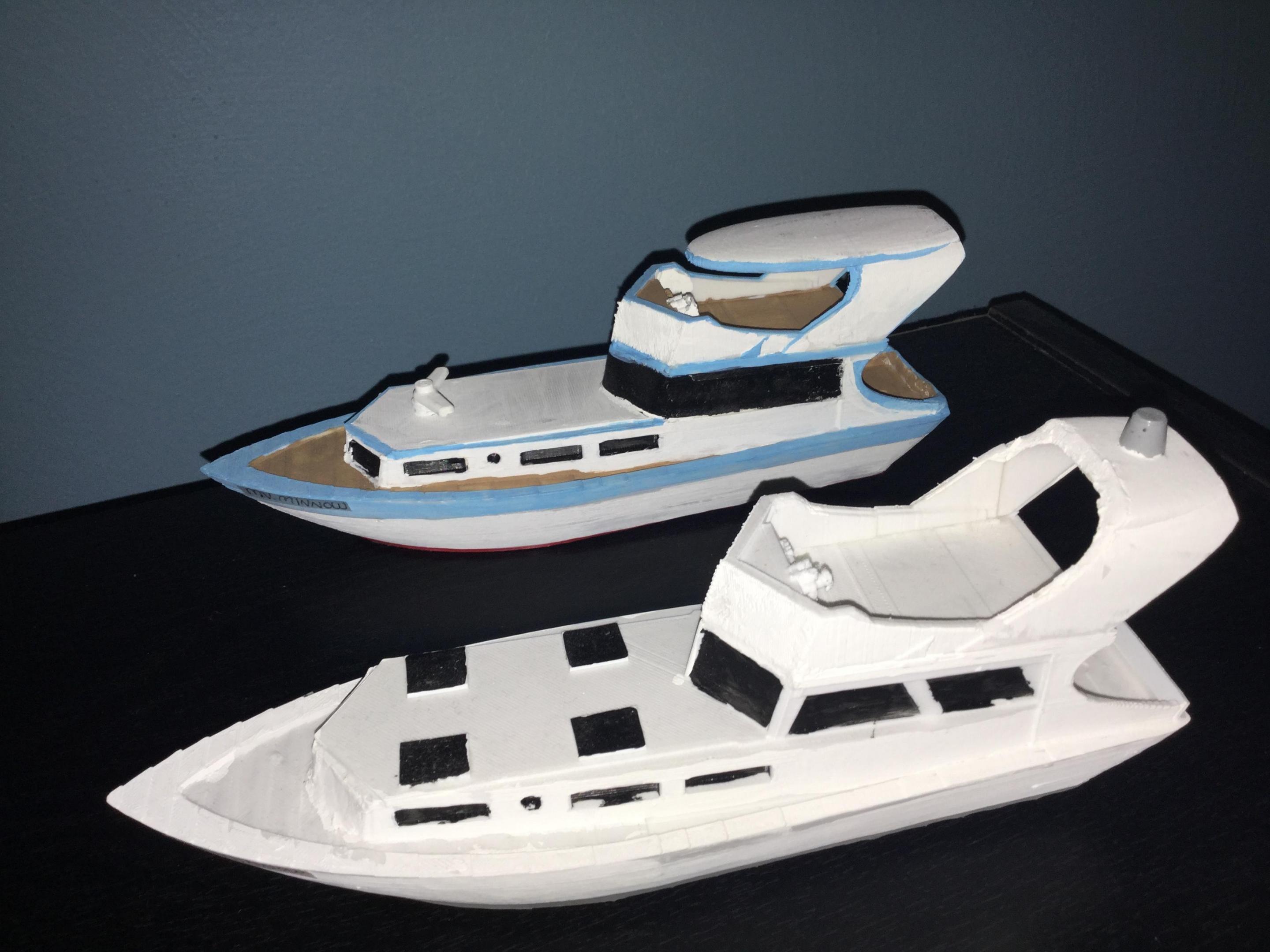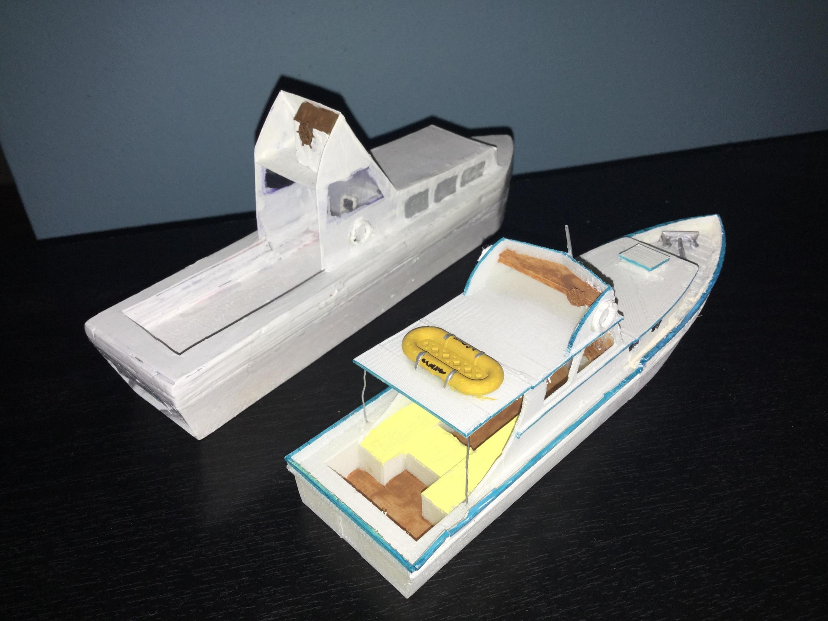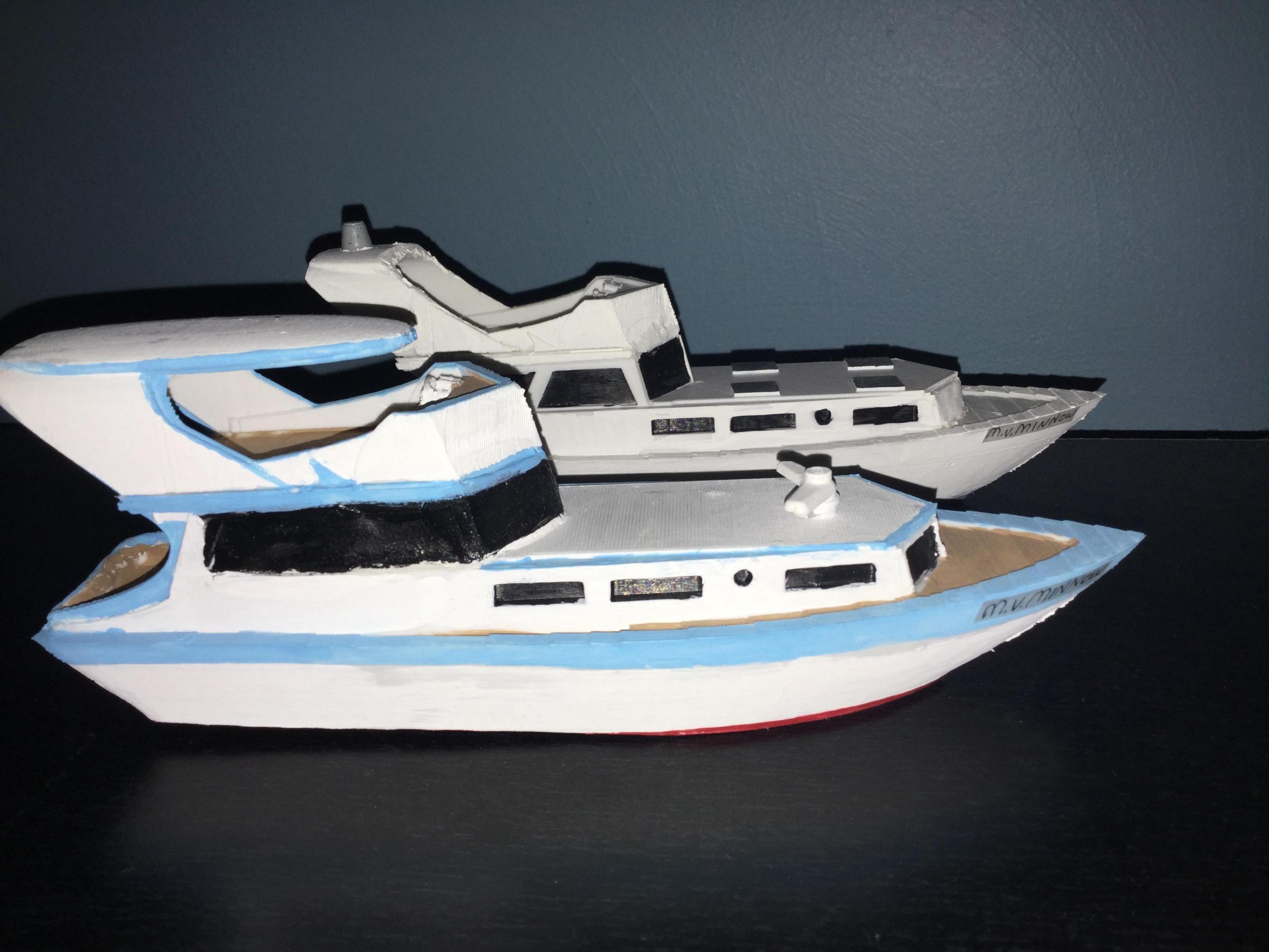 here are my 1/72nd scale s.s minnows and m.v minnows one s.s minnow is from the first season opening of the series and 2nd one is the s.s minnow from the second and third season openings of the series the other 2 are modern what if they remade gilligan's island today i changed the s.s to m.v as thats what it should have been m.v to start with as the minnow was powered by a inboard diesel marine engine not a steam engine what s.s stands for is steam ship and m.v is motor vessel the second and third season opening minnow i scratch built for the most part the the flybridge controls and wheel are from pt-109 model same with the door in the main cabin and the life rings on eaither side of the main cabin most of the hull is wood wich came from a craft store wood model kit which i reshaped and the rest is made from sheet styrene the other 3 minnows are 3d printed with the some small mods i added or changed