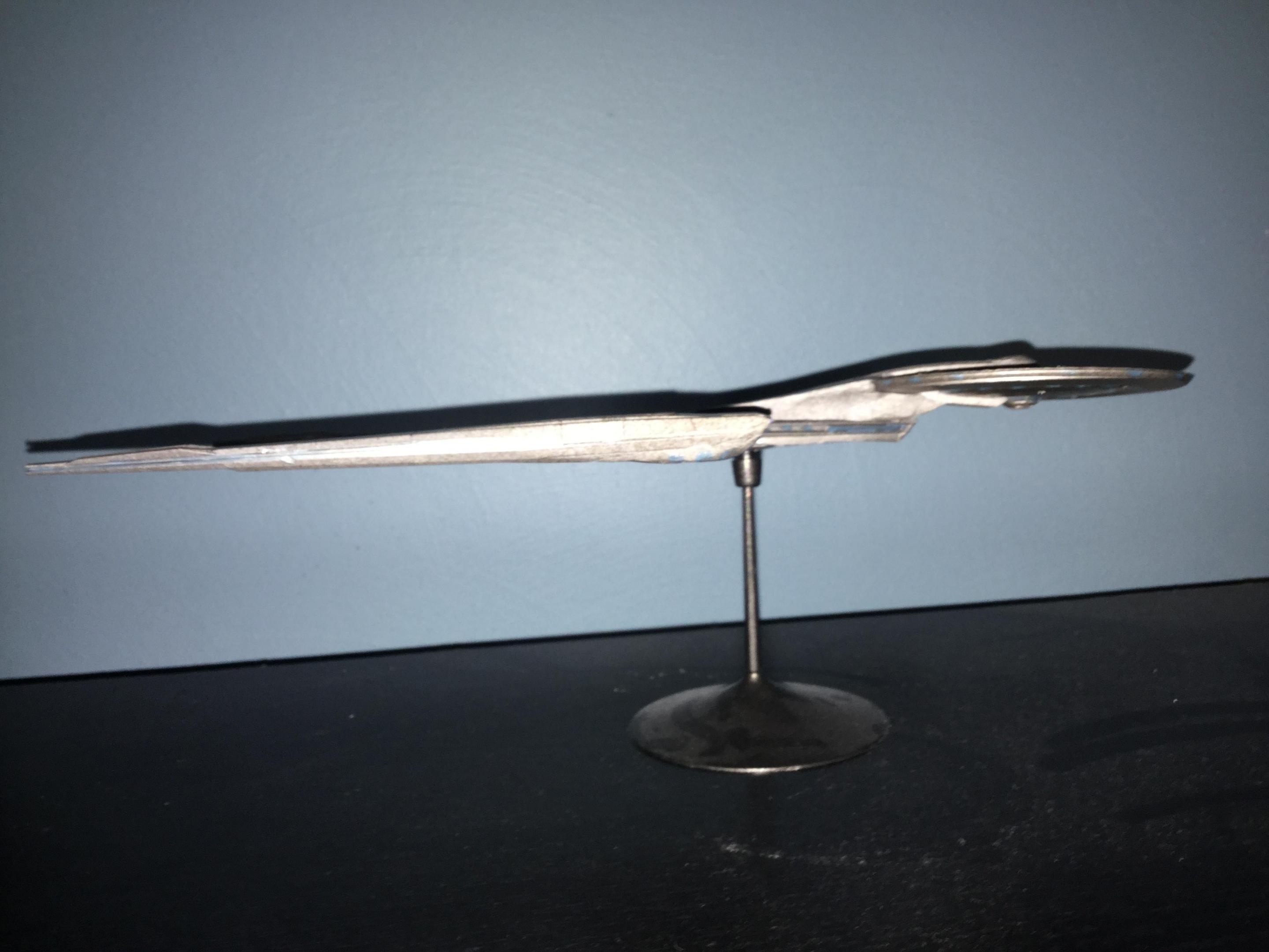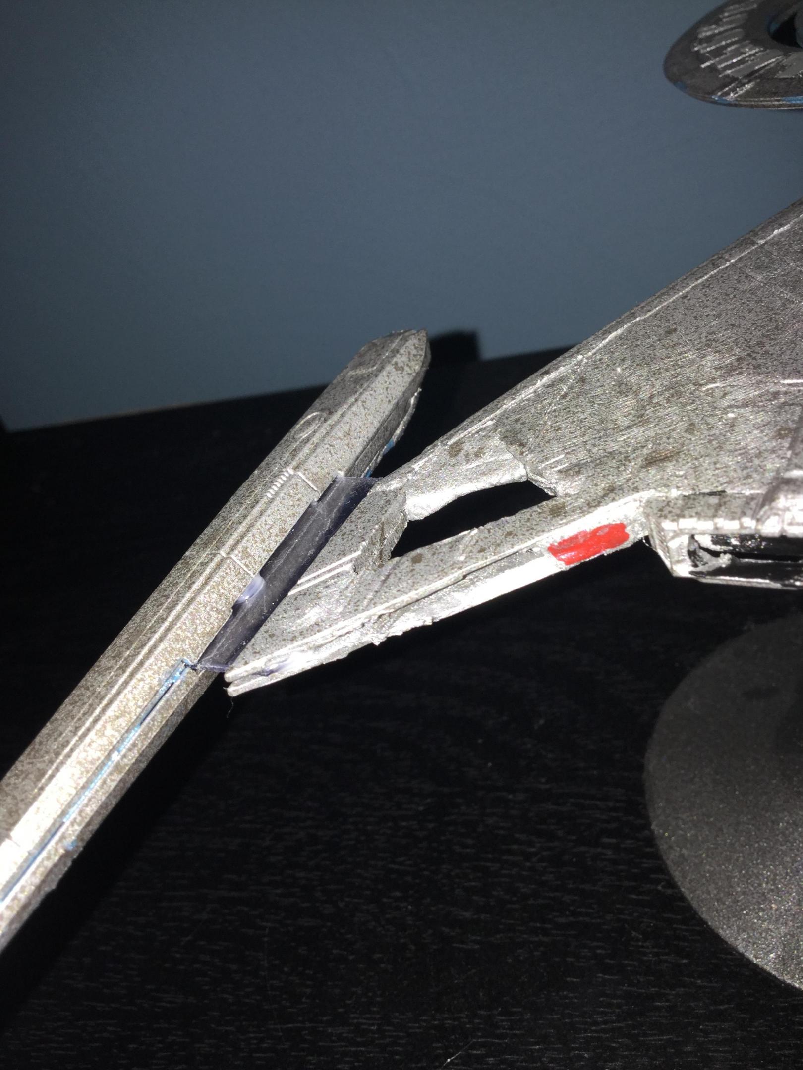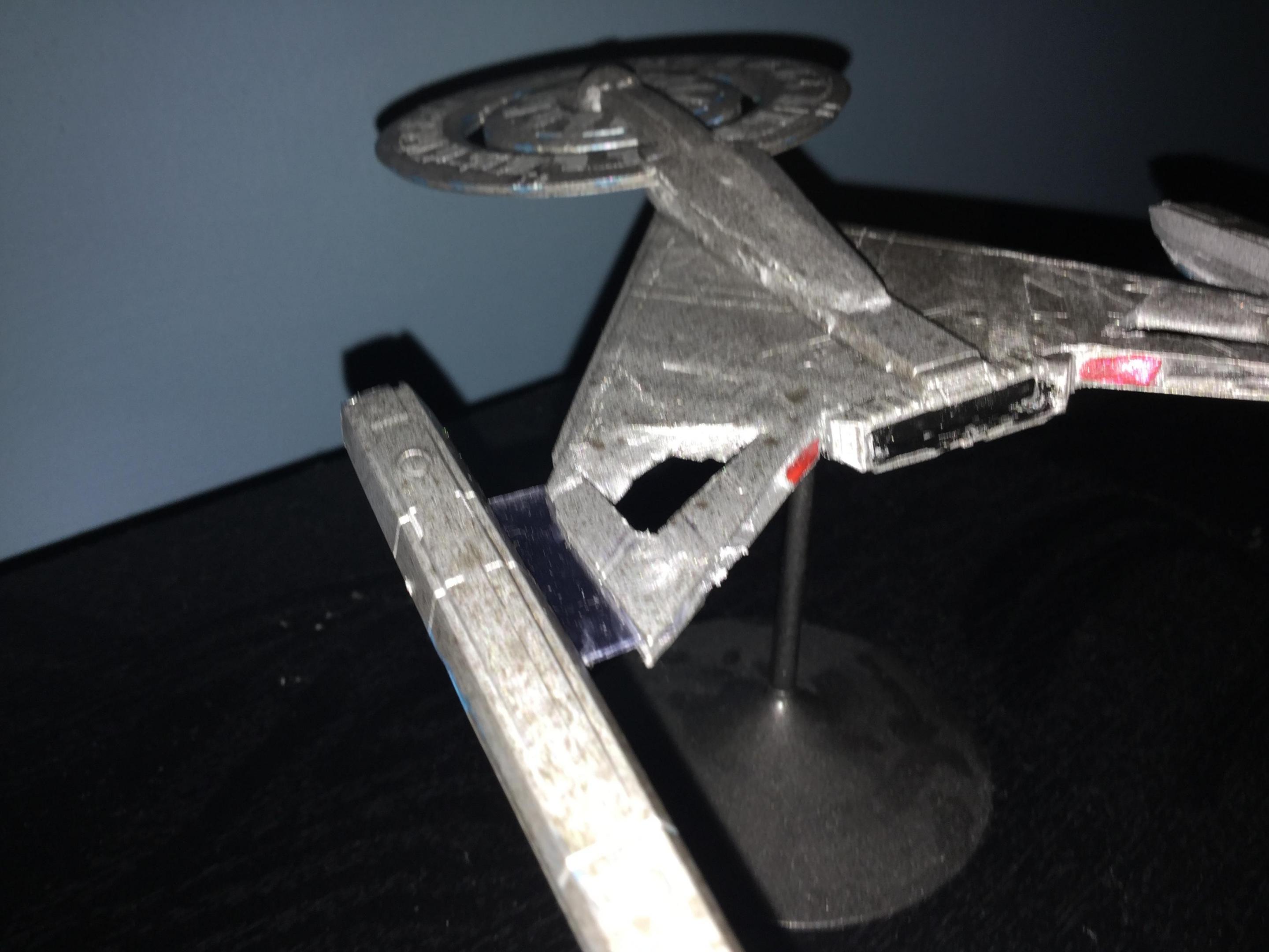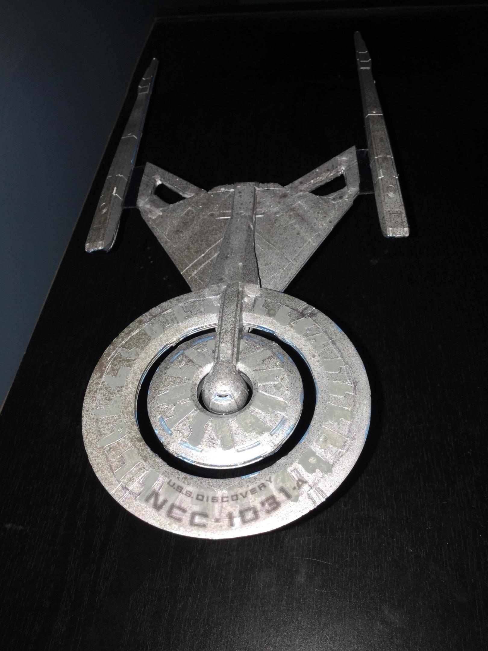 i moded a polar lights 1/2500 scale uss discovery ncc-1031 kit with some cutting some putty some scribing some some plastic to make the refited uss discovery ncc-1031-a so it is up to date with the late 32nd century starfleet in the year 3189 the reason the ship got the -A at the end of the regisrty number with this being only a refit is cause starfleet records show the uss discovery ncc-1031 was destroyed with all hands after the battle with control in the year 2258 and after the temporal wars in the early 31st century all time travel was baned and all devices and ships were destroyed and it was now fully illegal to time travel forward and backwards in time and instead of what starfleet records say happened to the ship and crew and capt pike and his crew on the enterprise and lt ash tyler only surviving section 31 officer left lied to the heads of starfleet during thier debriefing to hide the fact the ship and crew took the sphere data 930 years into the future so nothing like control a.i can happen agian so those are the two main reasons the discovery was given that -A cause as of the 32nd century the discovery and it's crew are all criminals for time traveling that starfleet and the federation are now harbouring and to keep up the pretense the discovery was destroyed and that is is a new ship with a new crew to the other groups who singed those temporal accords at the end of the temporal cold wars the ship now has programable matter intergrated into it's original computers and systems which now allow for detached nacelles that improves manuverbility and increased efficency in flight and since warp is limited to low warp speeds of warp 1 and 2 the discovery's spore drive makes the ship very valuble to starfleet as a rapid responder