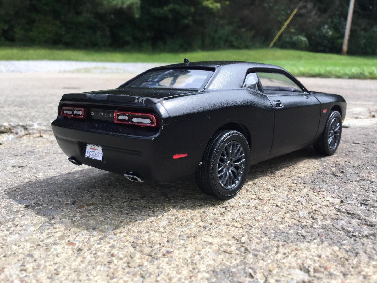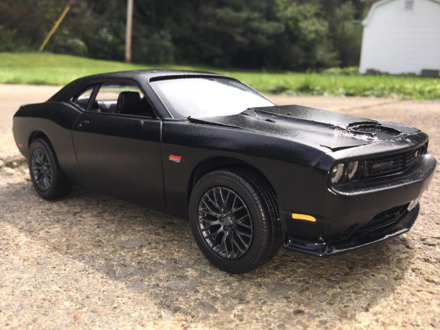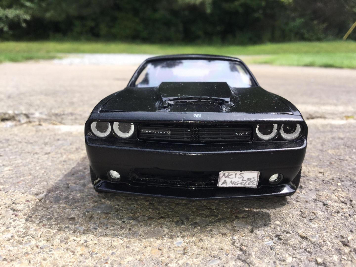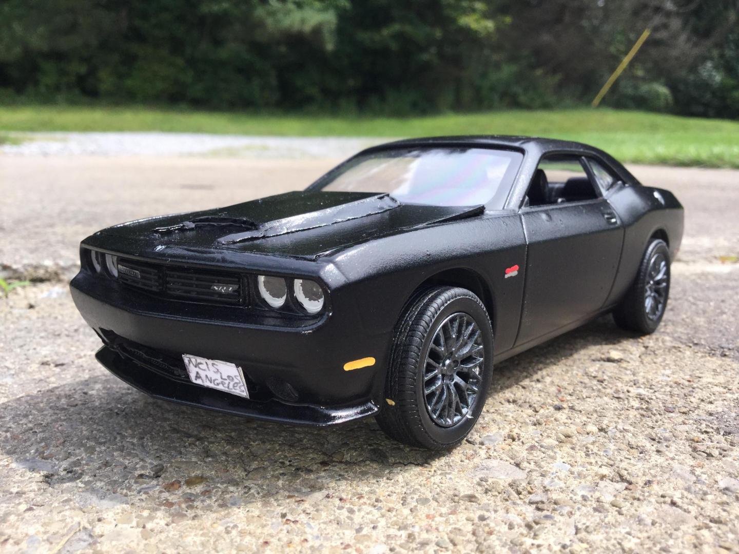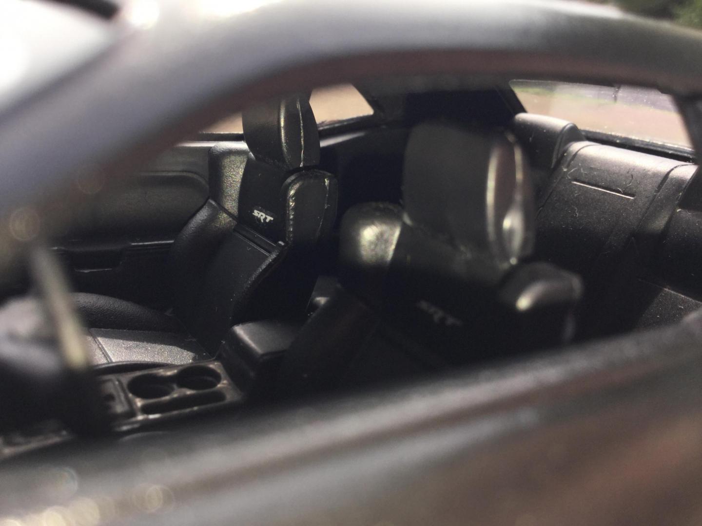 16. this was another rebuilder i got it was missing it's hood and engine the body was painted red and black same with the wheels and the interior i made the new hood with the 2015 srt hood scoop i also made the front vanity plate and part of the rear licence plate i repainted the wheels gun metal and the interior black and re glued the decals to the dash and i addded some srt logo's to the front seats and i wrote the srt logo on the rear spoiler added some decals to the grille and between the tail lights and painted the the head lights to look more real i made the little sat radio antenna on the roof also
