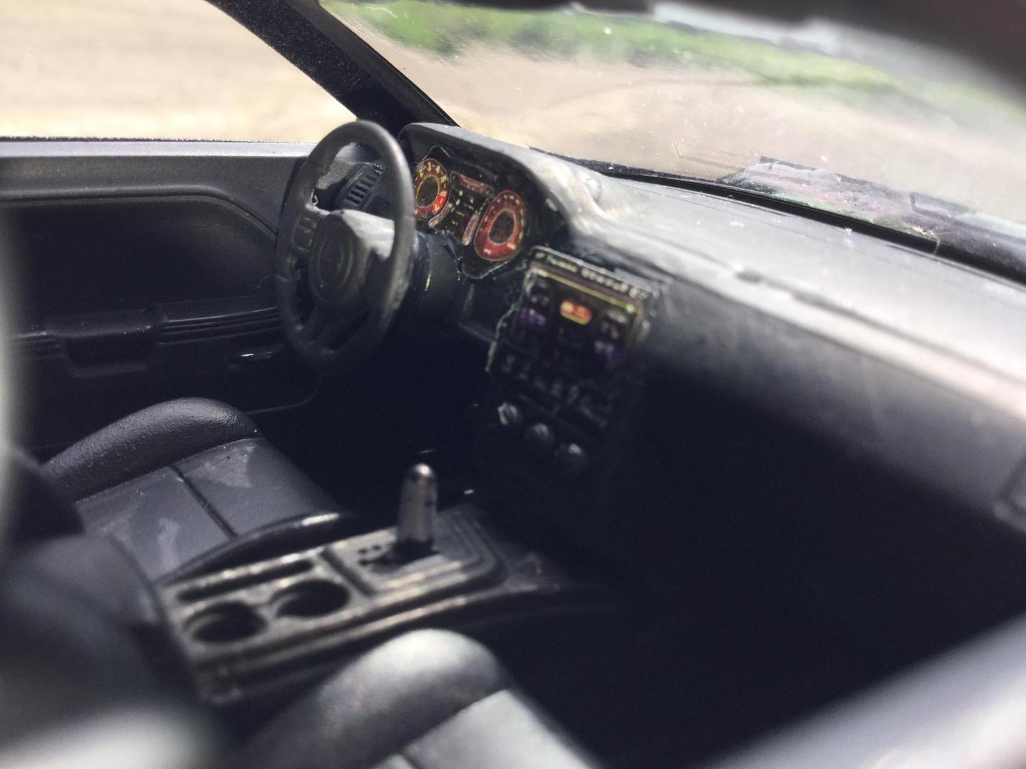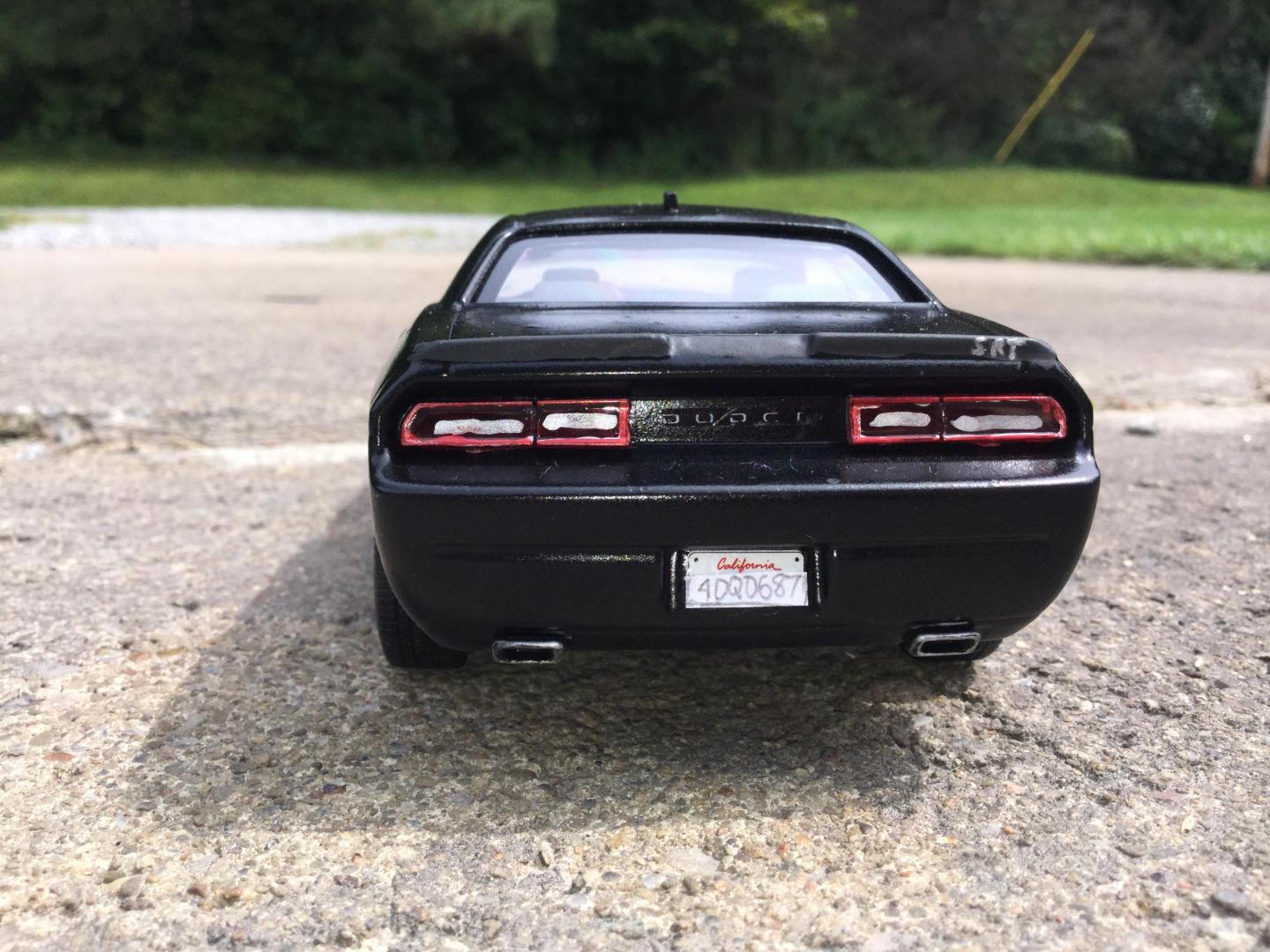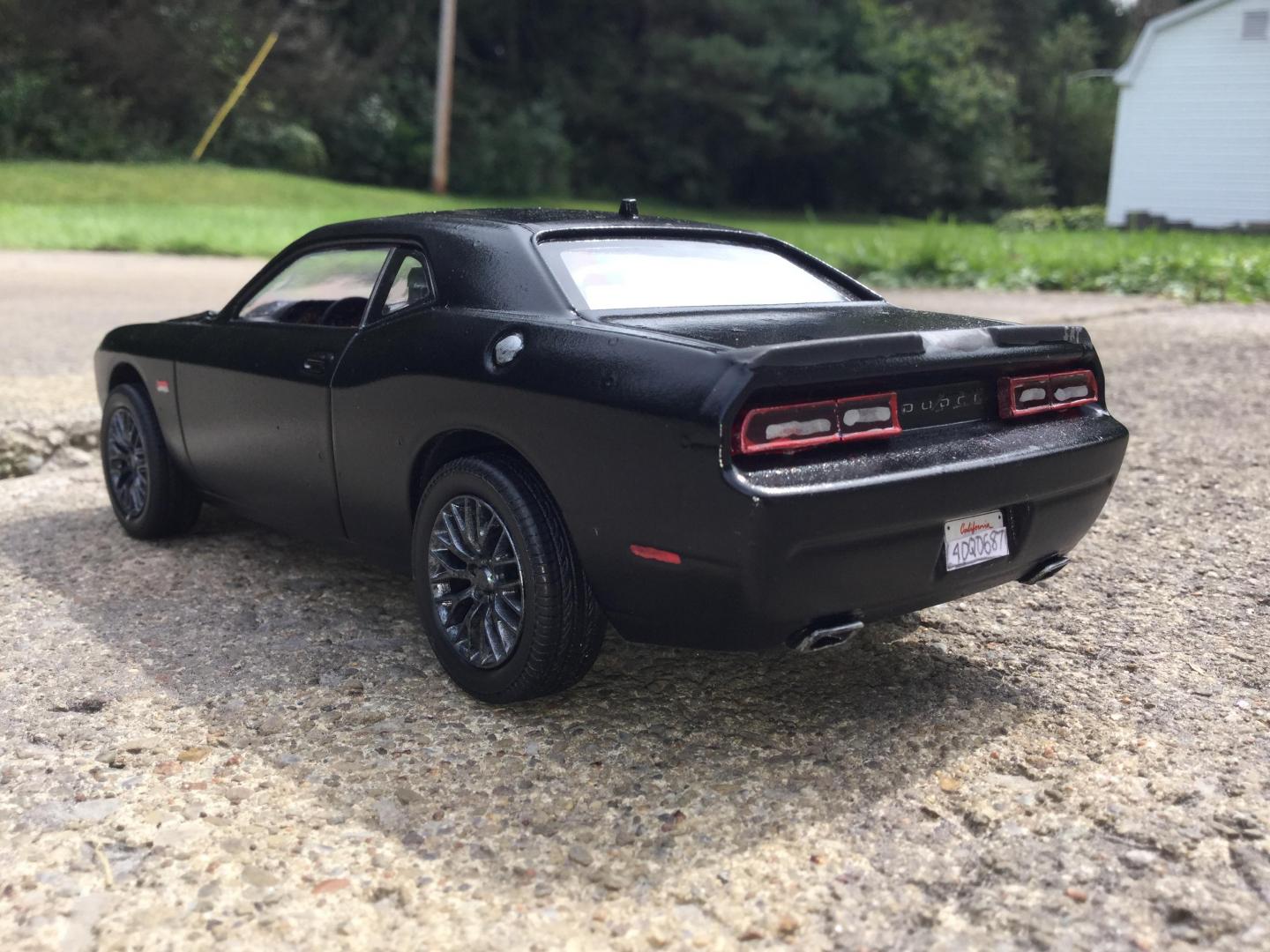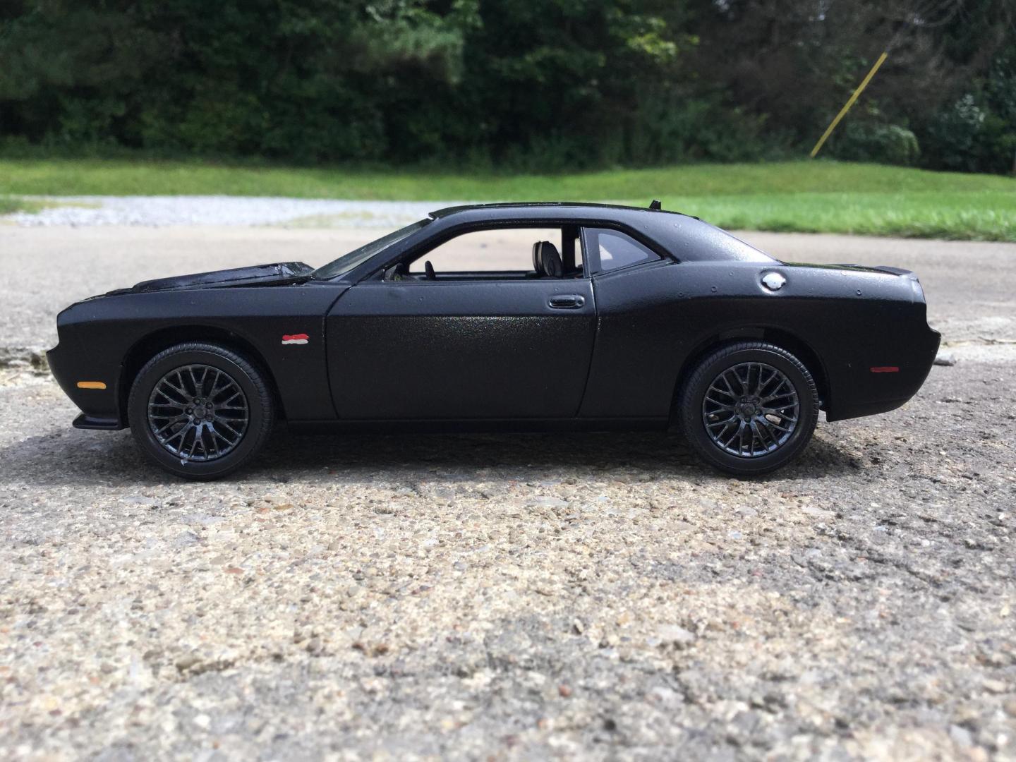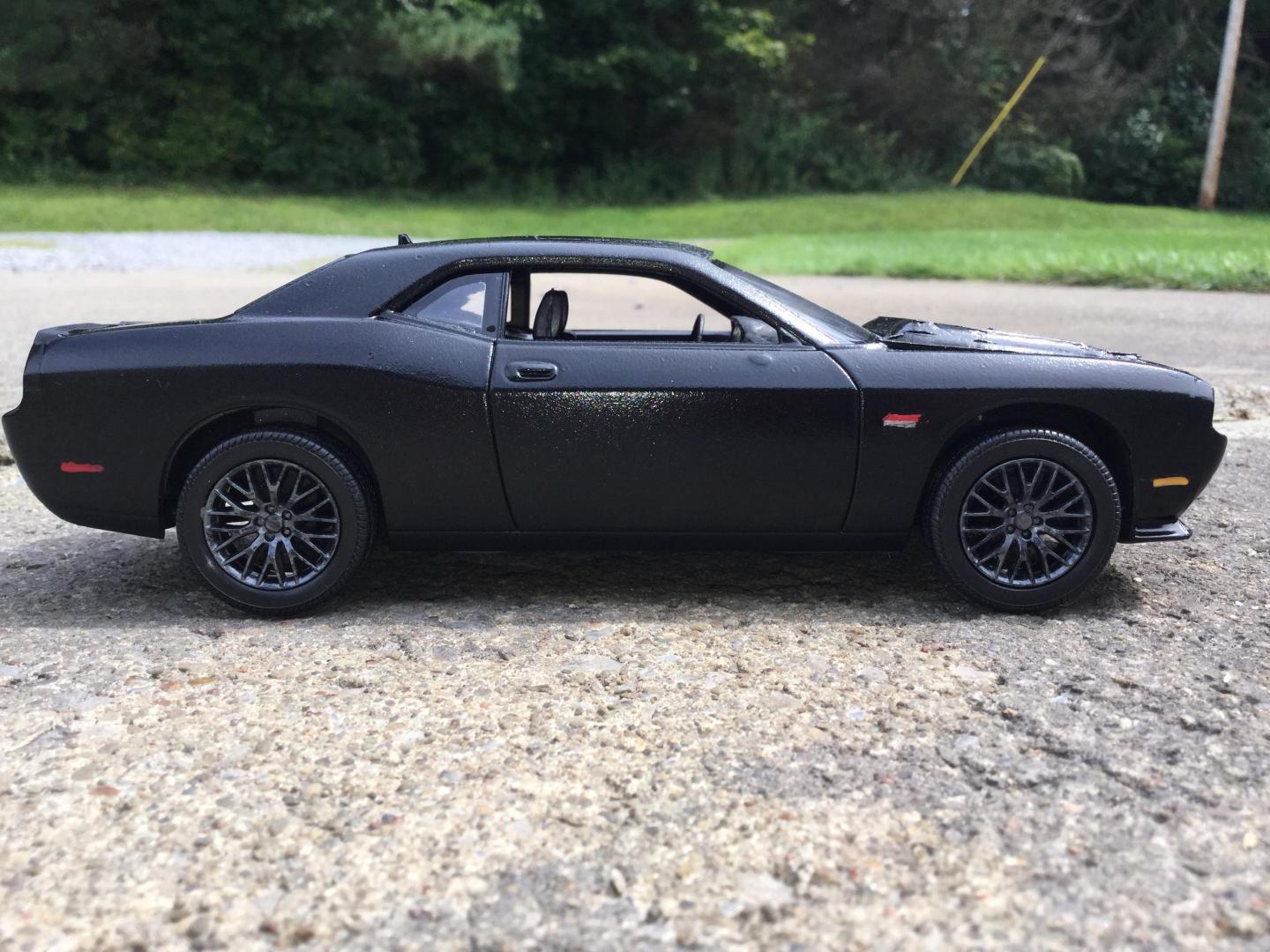 16. this was another rebuilder i got it was missing it's hood and engine the body was painted red and black same with the wheels and the interior i made the new hood with the 2015 srt hood scoop i also made the front vanity plate and part of the rear licence plate i repainted the wheels gun metal and the interior black and re glued the decals to the dash and i addded some srt logo's to the front seats and i wrote the srt logo on the rear spoiler added some decals to the grille and between the tail lights and painted the the head lights to look more real i made the little sat radio antenna on the roof also