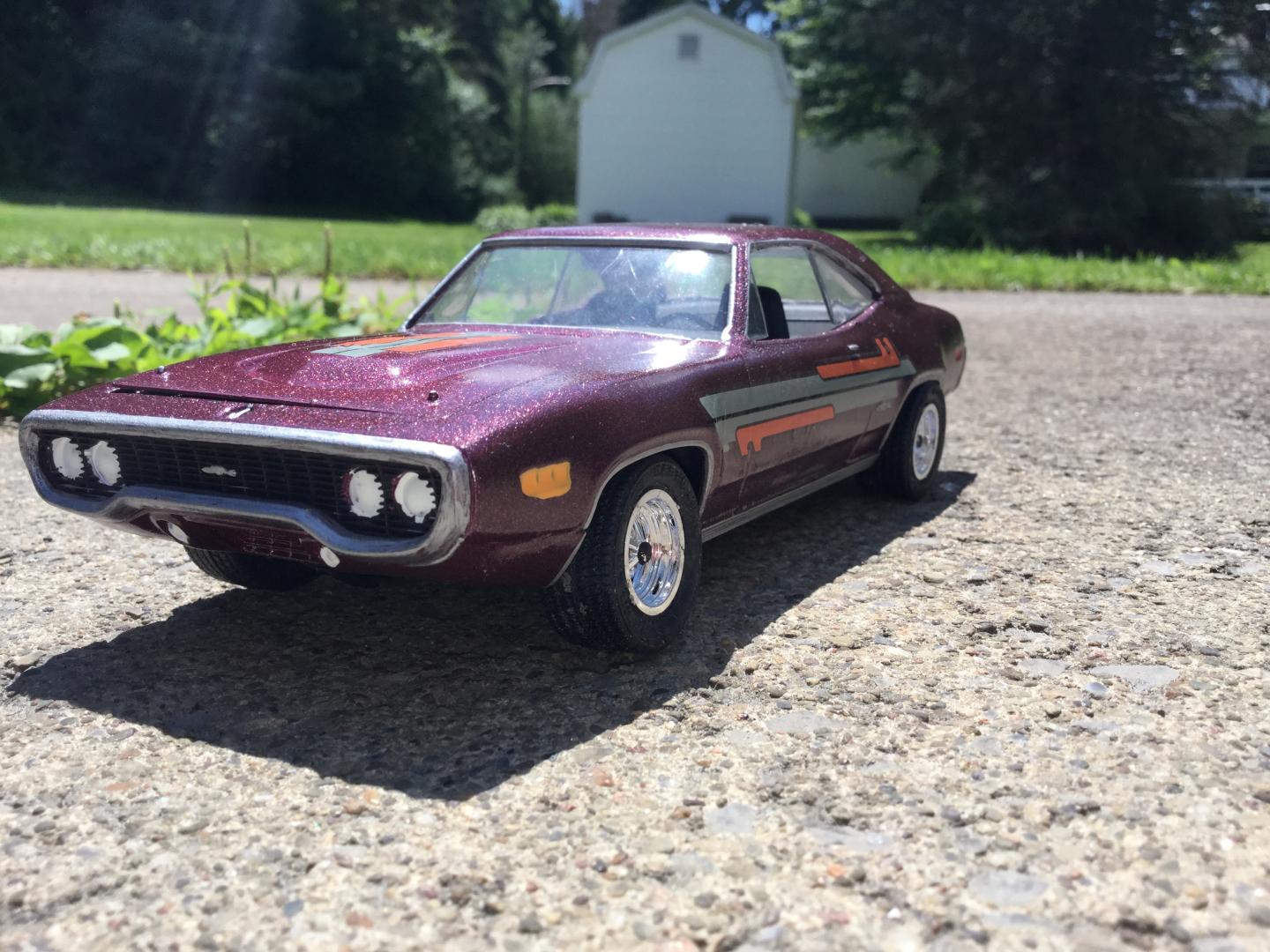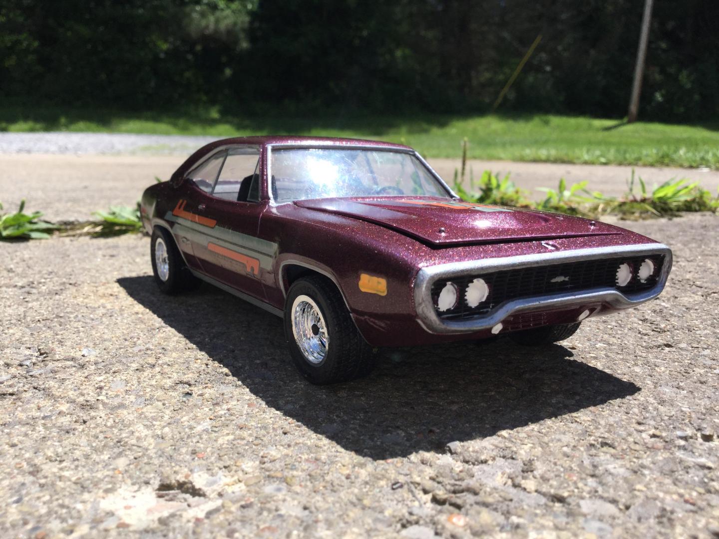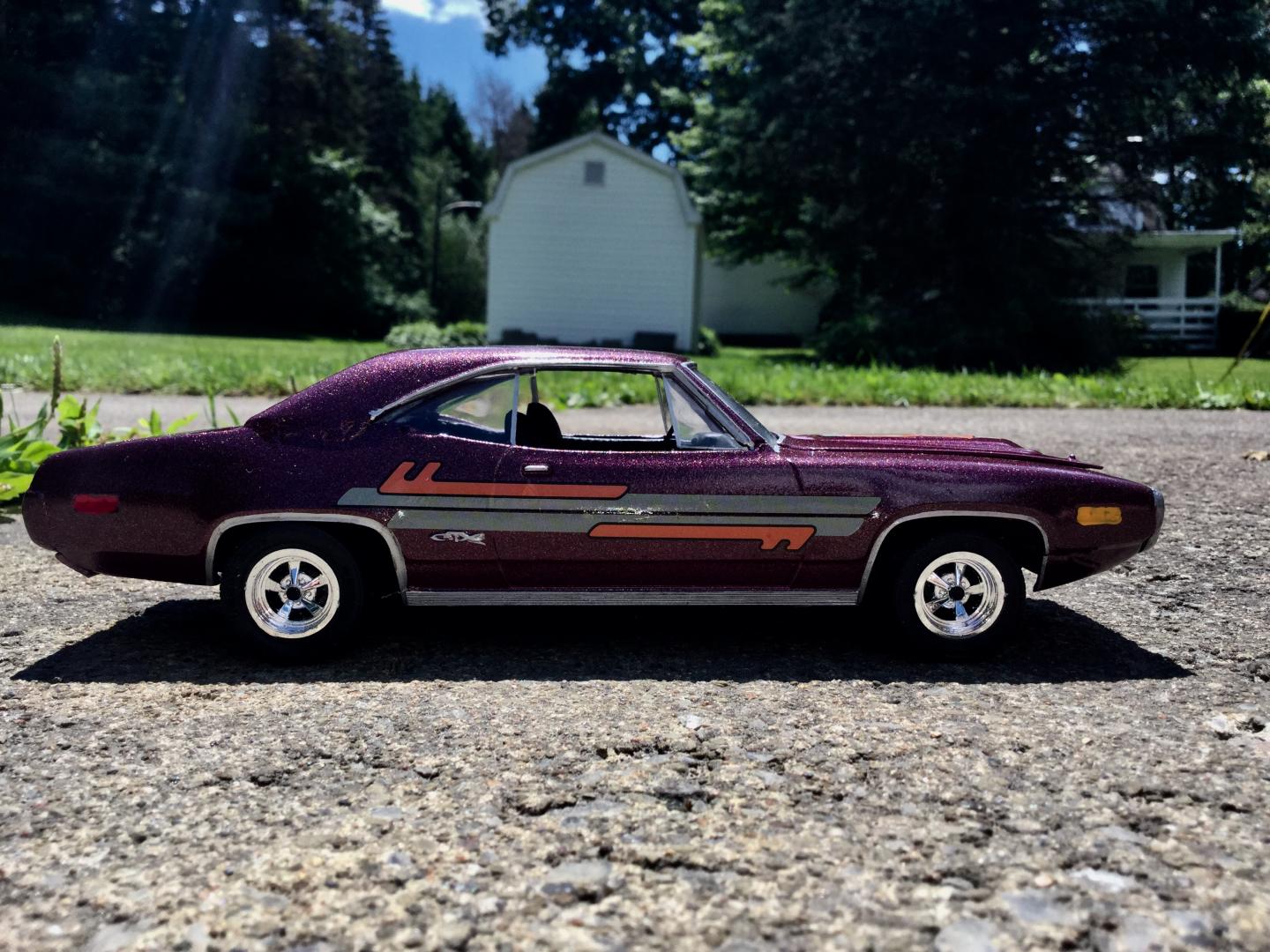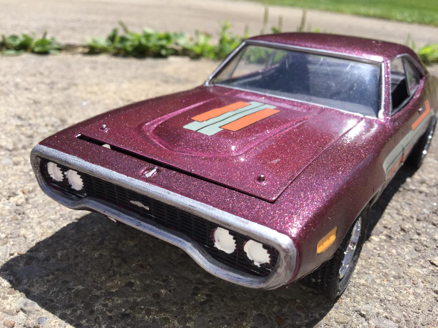 this was a 71 gtx was a parts car it was missing it's roof and wheels and tires and wheel backs most of the engine so i took a roof from a 69 superbee body i had and merged it with the body even though both were monogram kits and 1/24th scale it was not a easy joining of the roof to the body i used valve covers and air cleaner and carborator and fan belt and fan from my parts bags to rebuild the engine the hood also does not fit the body right either for some reason i painted it with kylon shimmer metallic black cherry decals came my decal box
