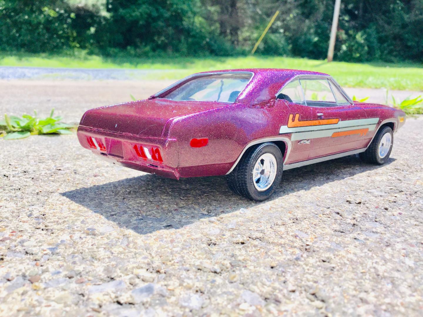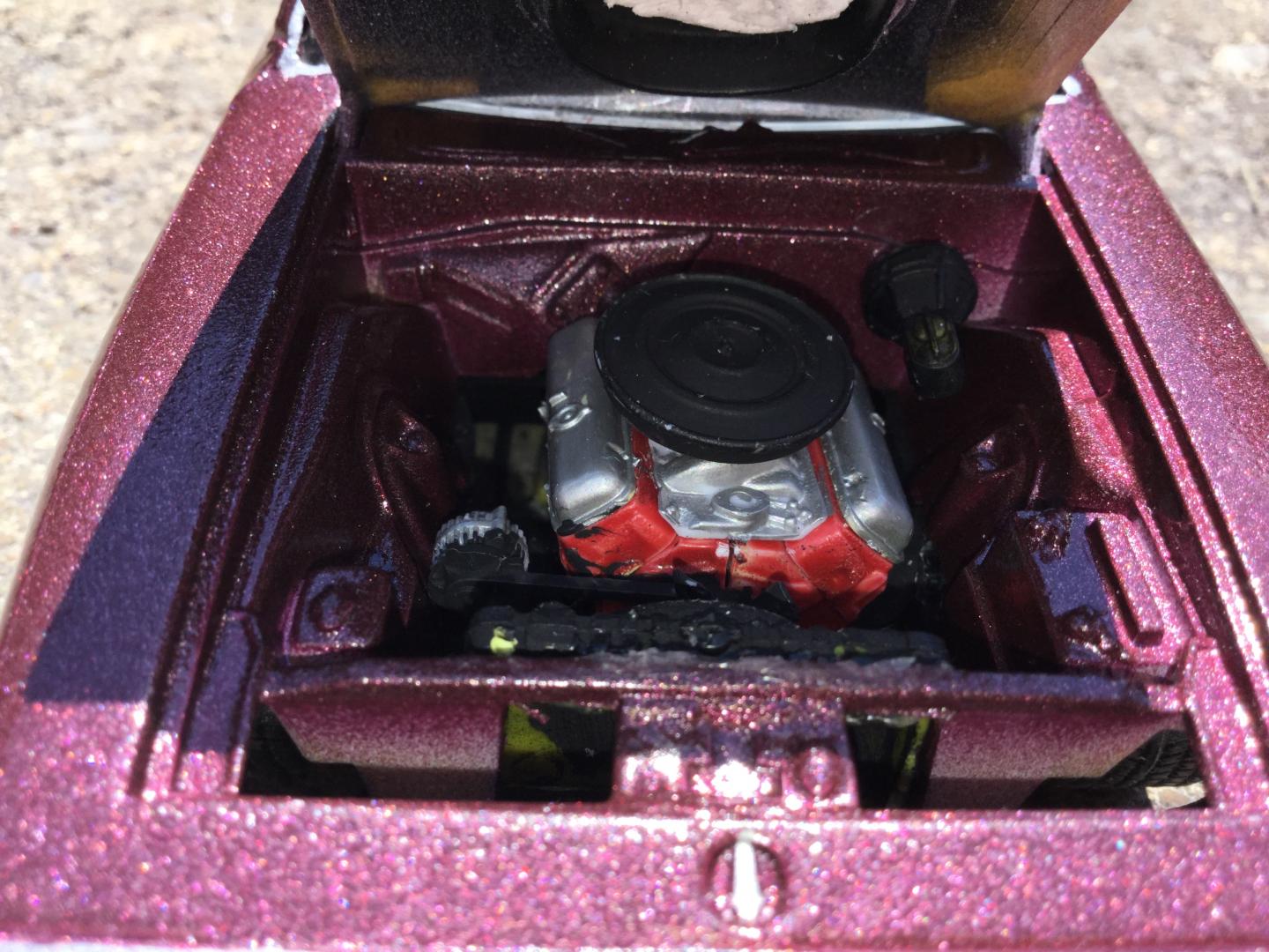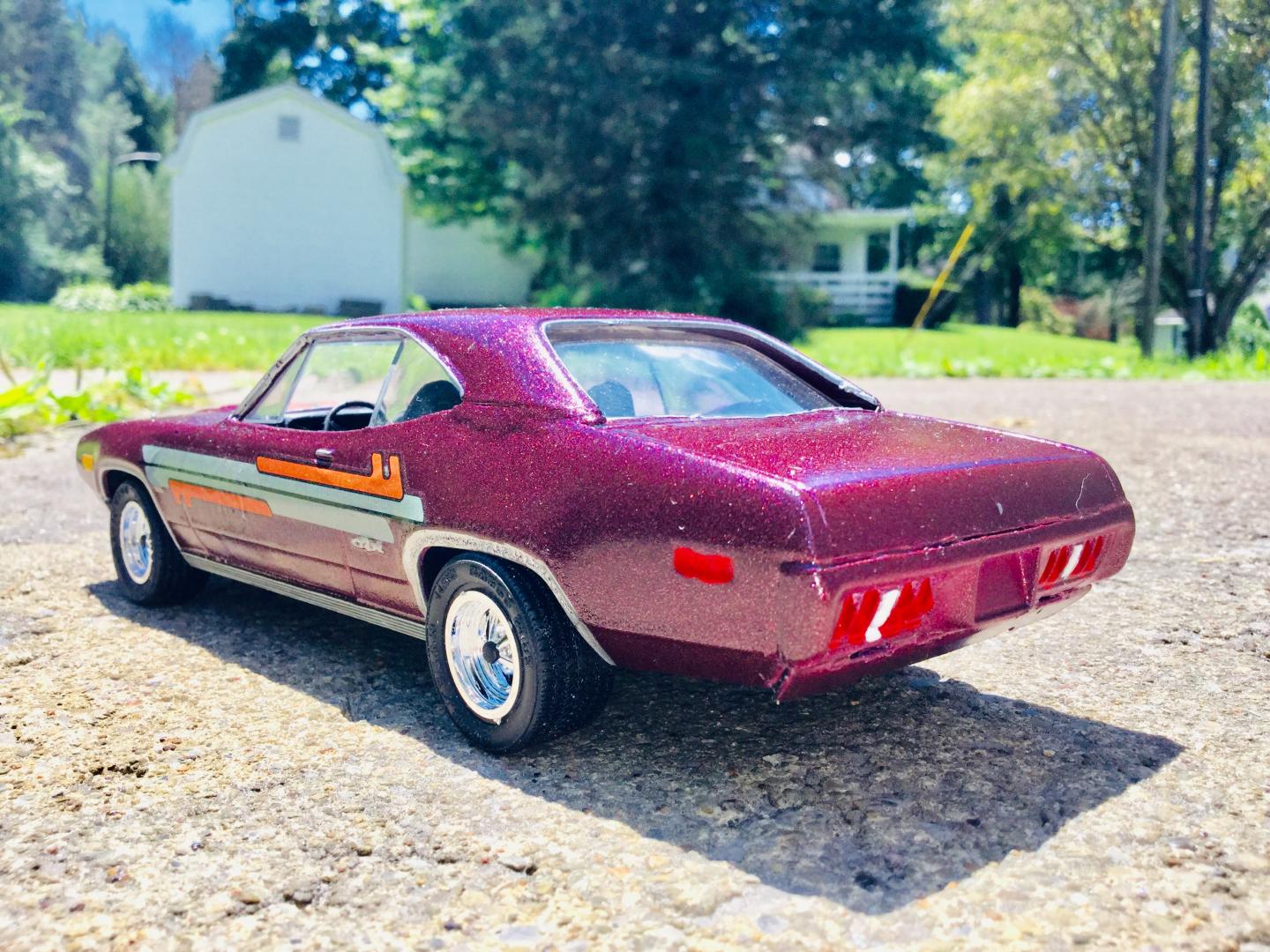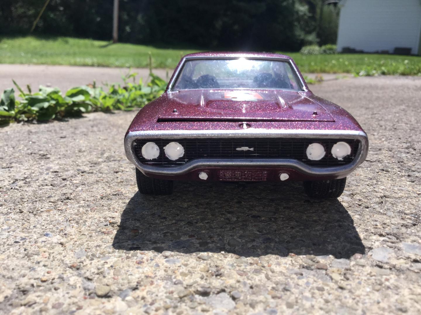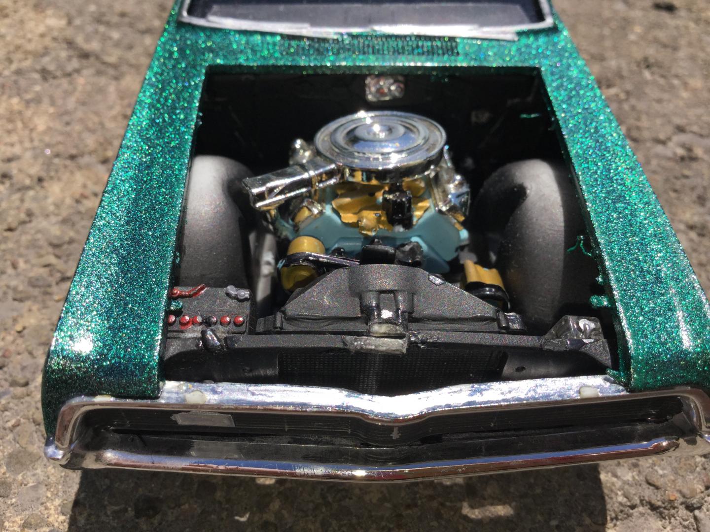 this was a 71 gtx was a parts car it was missing it's roof and wheels and tires and wheel backs most of the engine so i took a roof from a 69 superbee body i had and merged it with the body even though both were monogram kits and 1/24th scale it was not a easy joining of the roof to the body i used valve covers and air cleaner and carborator and fan belt and fan from my parts bags to rebuild the engine the hood also does not fit the body right either for some reason i painted it with kylon shimmer metallic black cherry decals came my decal box