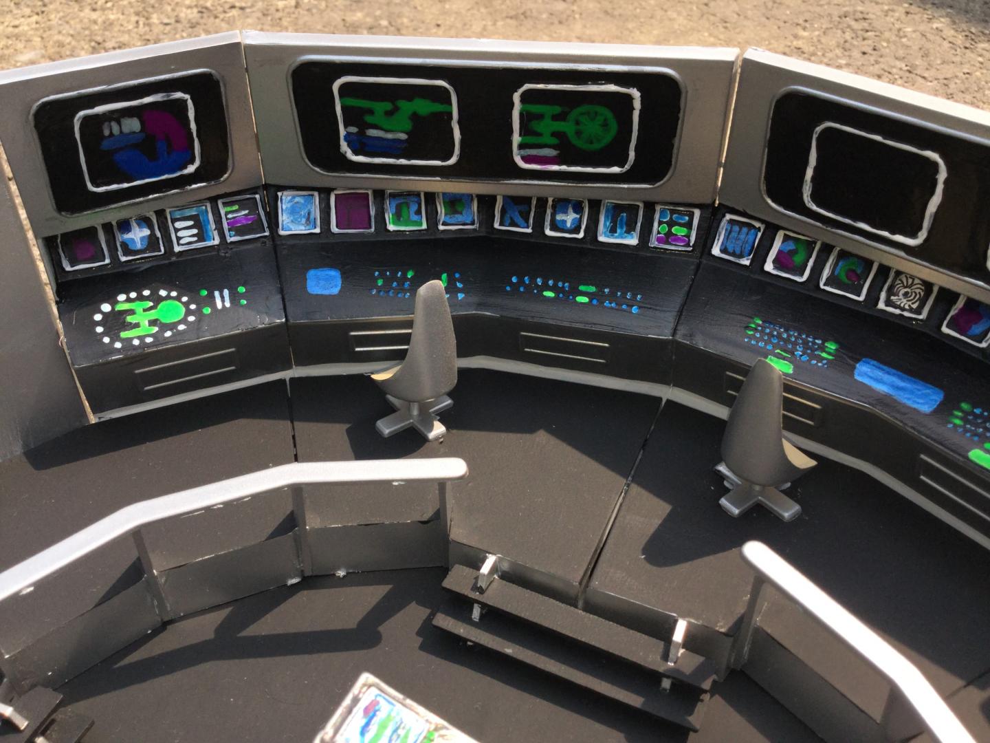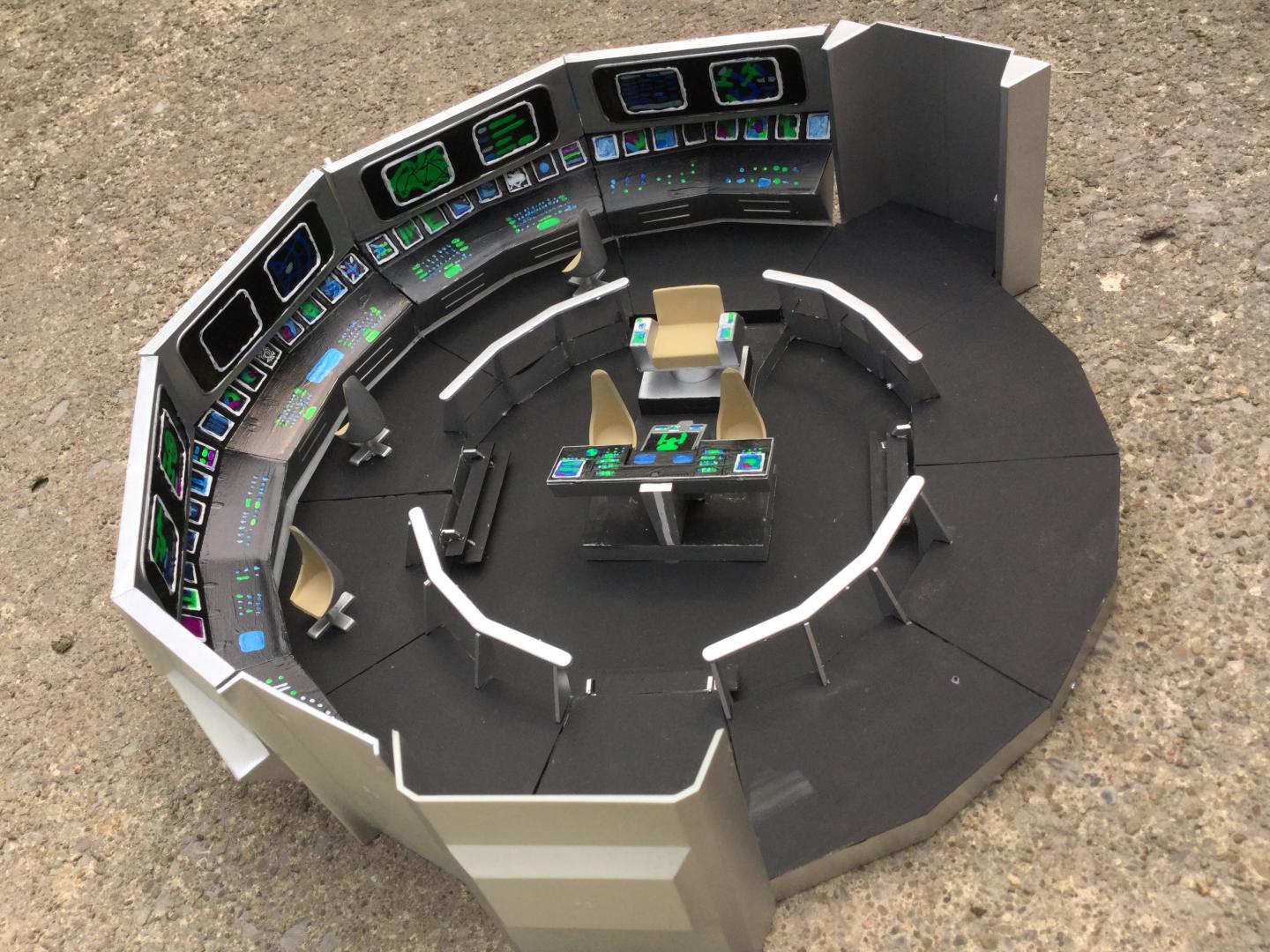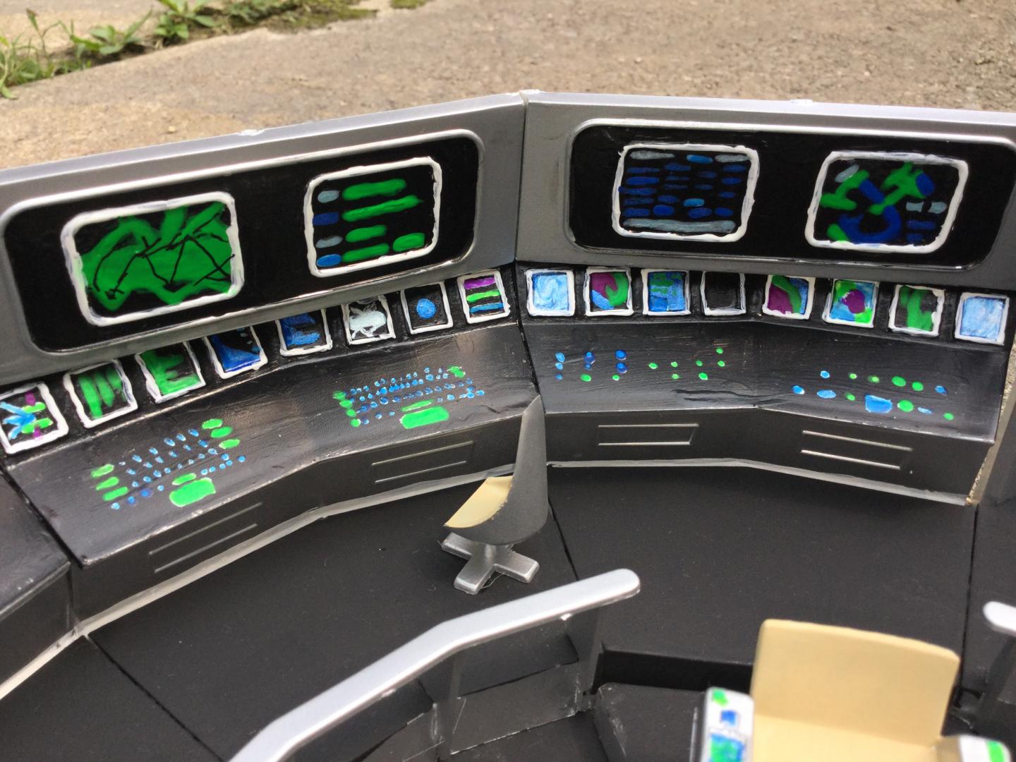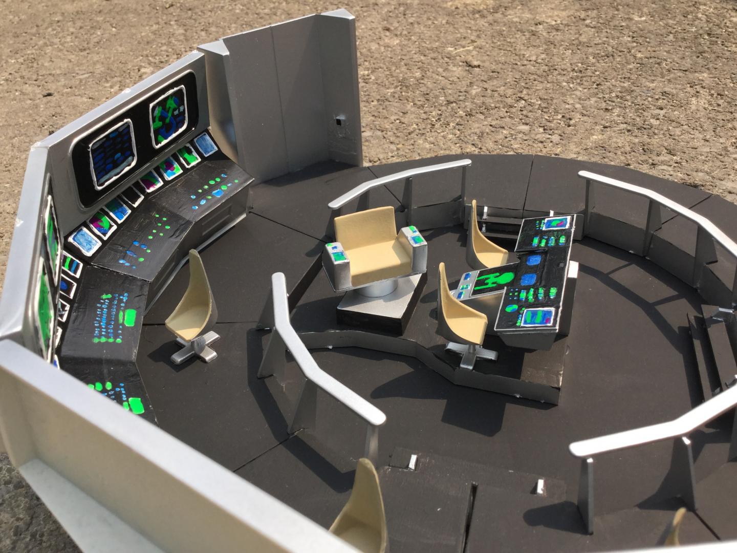 this is is a constitution class starship bridge from star trek i did not want it to the uss enterprise's bridge just another connie i hand panted all the computer screens and control interfaces the seat cushions and the black floor the view screen display is the only decal fromthe kit i used i did not glue the captians chair on the base so i could turn it to fase the other stations to the right of the chair i changed some of the stations positions from were they were and removed a coulpe chairs to make 2 of the stations be standing ones i based the colors of the bridge on the cage enterprise the star trek 6 enterprise -a and the computer screens and interfaces are based on the ones on the star trek 4-6 enterprise-a