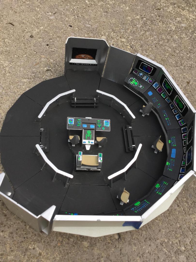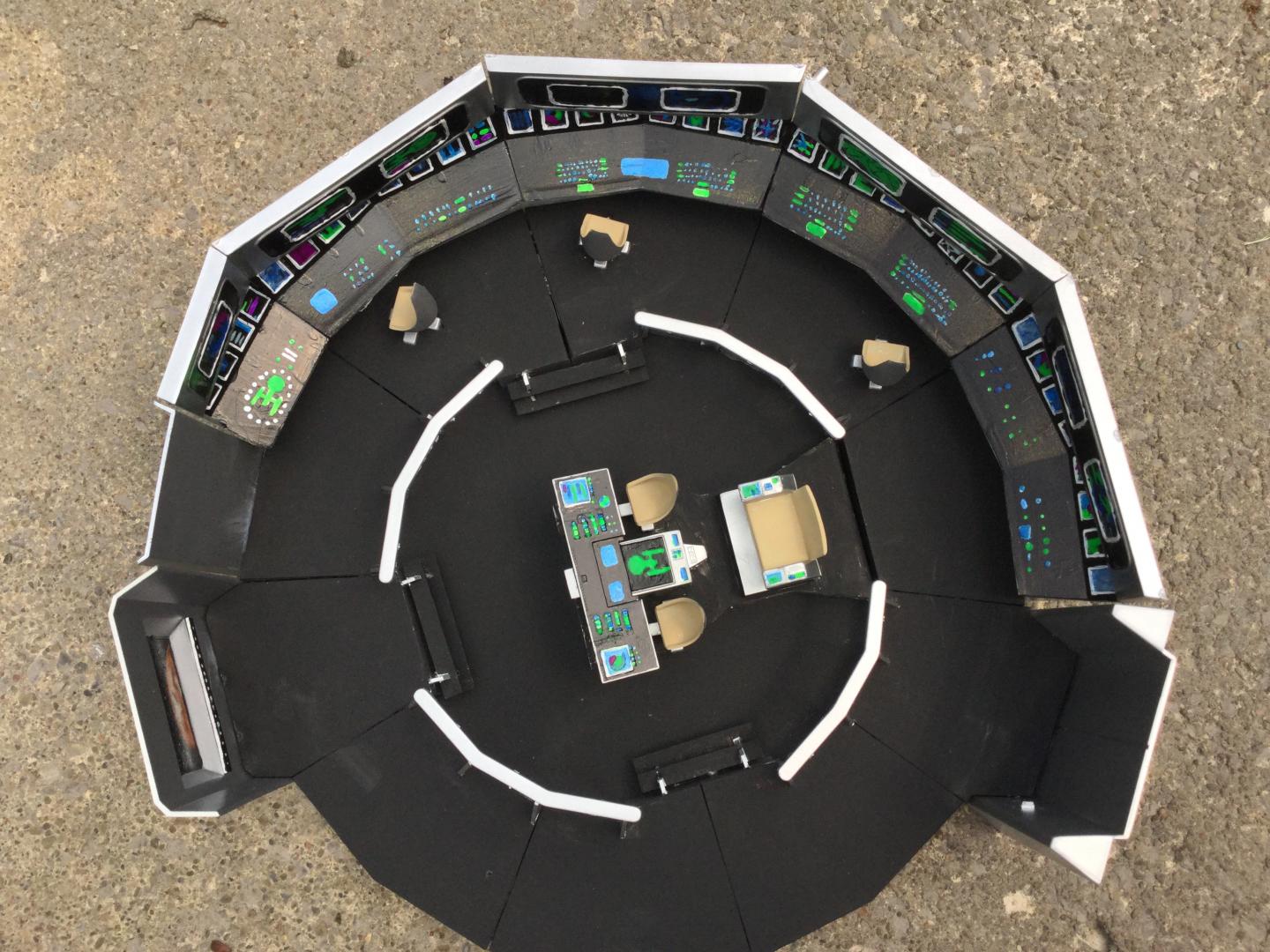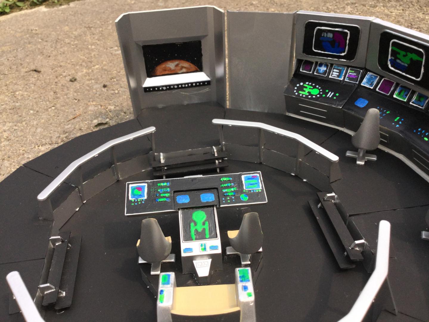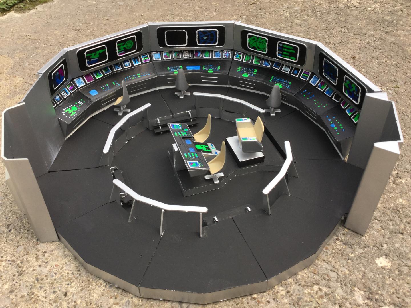 this is is a constitution class starship bridge from star trek i did not want it to the uss enterprise's bridge just another connie i hand panted all the computer screens and control interfaces the seat cushions and the black floor the view screen display is the only decal fromthe kit i used i did not glue the captians chair on the base so i could turn it to fase the other stations to the right of the chair i changed some of the stations positions from were they were and removed a coulpe chairs to make 2 of the stations be standing ones i based the colors of the bridge on the cage enterprise the star trek 6 enterprise -a and the computer screens and interfaces are based on the ones on the star trek 4-6 enterprise-a