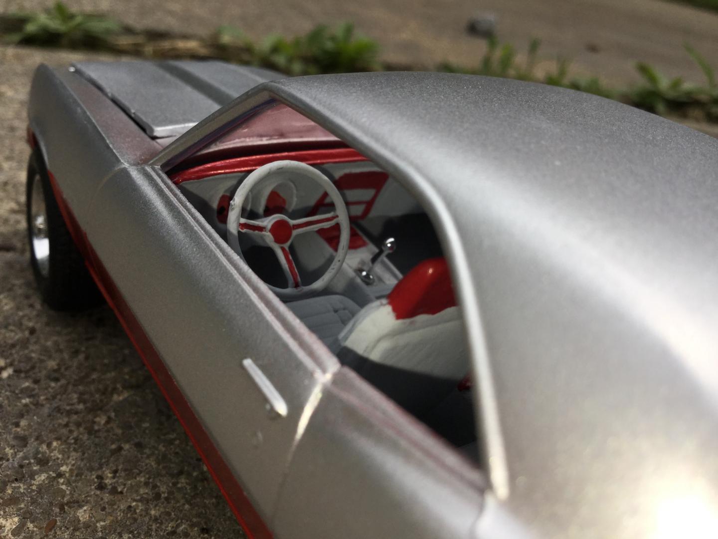 this is another rebuilder the original engine was missing it's carborator and air cleaner so i added some custom ones and i gave it a custom two tone silver and red paint job even did the interior in grey and red i dont think the hood that it had was the original one it does not fit that well
