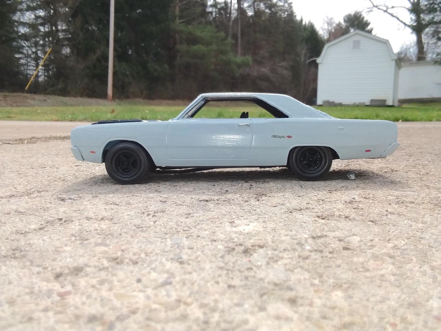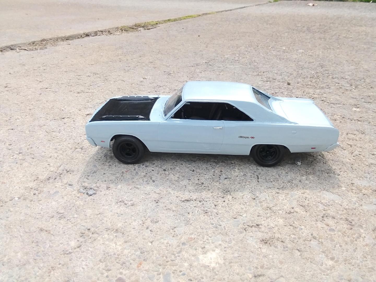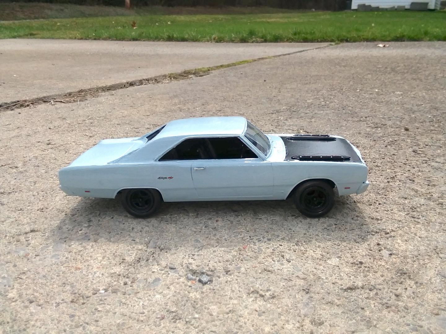 here is a custom kitbash i recently finished i used a 68 dart rebuilder i had and grille from a mpc 69 charger parts car used .060 plastic card to lengthen the rear pilars i made a new hood and scribed the front grille surround panel lines and moded the tail lights i based the paint job on the grey and black 70 us charger they used for fast five which was set in brazil so they should have used one of these chargers instead