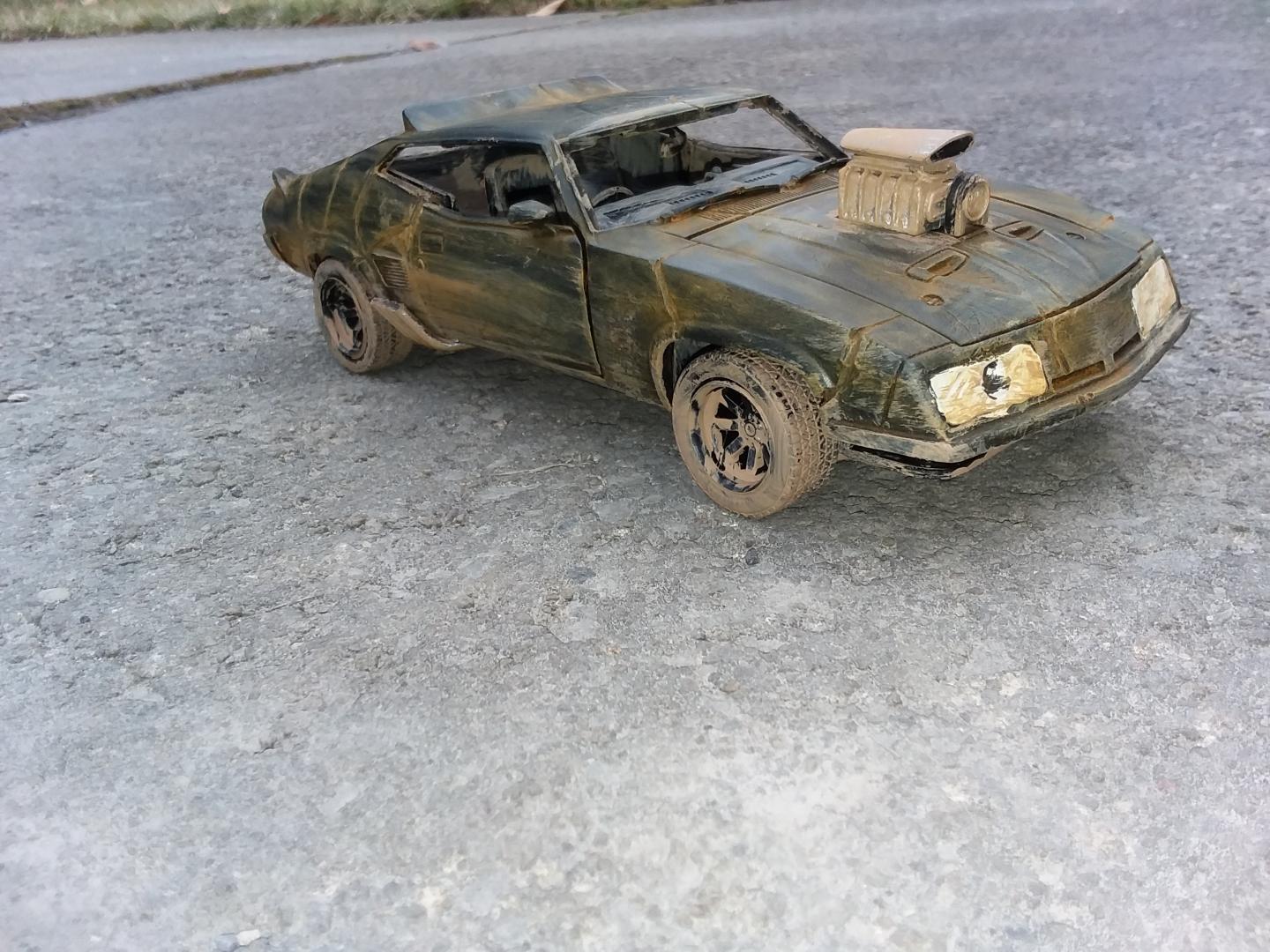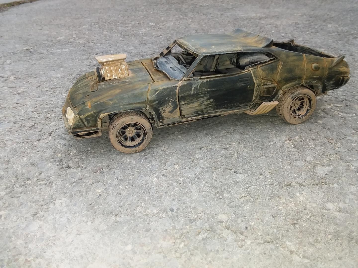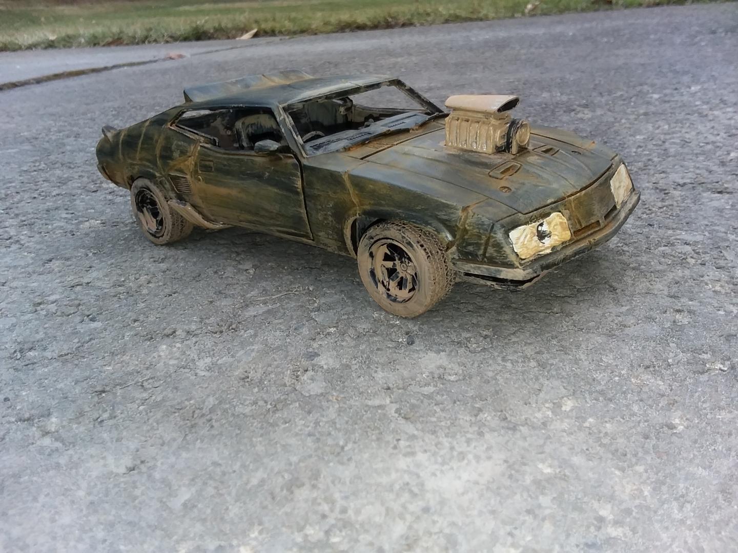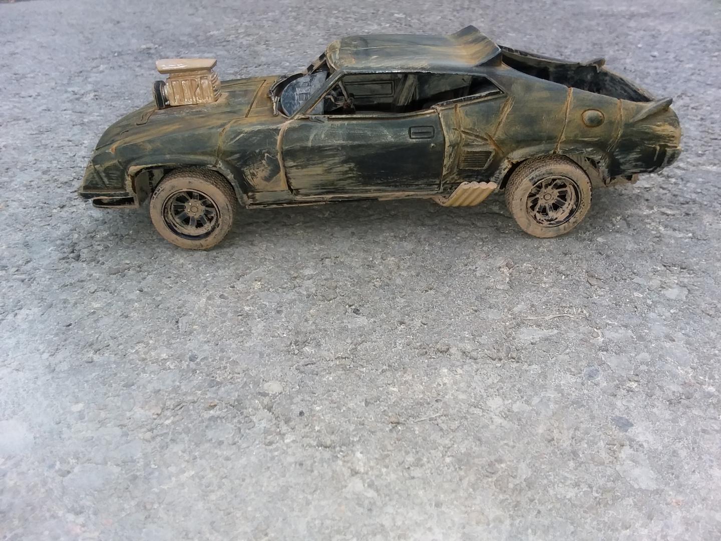 here is my 1/24th scale greenlight diecast mad max interceptor i modified to look like it did at the end of the mad max fury road prequal video game called mad max i did have to do the fury road version of the head lights cause there was no way i could cut out the molded in diecast head light covers to make the smashed out head light covers so i just drilled a hole in the center of the one and used the dremel to make cuts around the whole to make it look like cracks i used the dremel to cut off the diecast trunk lid and lower front air dam and to make all the gashes in the body of the car i cut away the back seat and removed the front passenger seat and the police radio and police dash light and modified the exaust pipes allong the sides and weathered the interior and wheels and chassie to look like dried dirt and mudd and then used rust weathering powder to weather the body and added a dried mudd and dirt paint to areas of the body