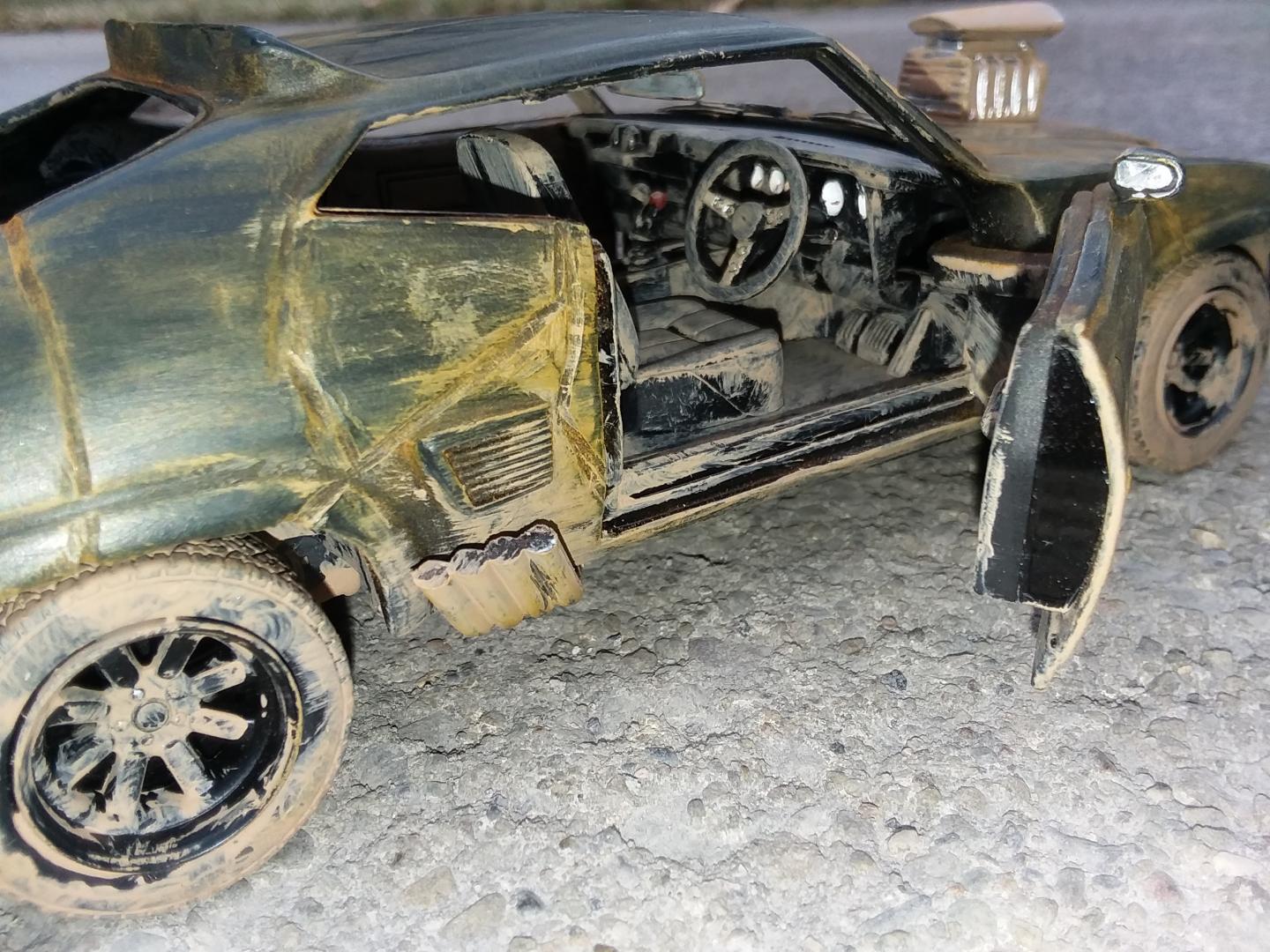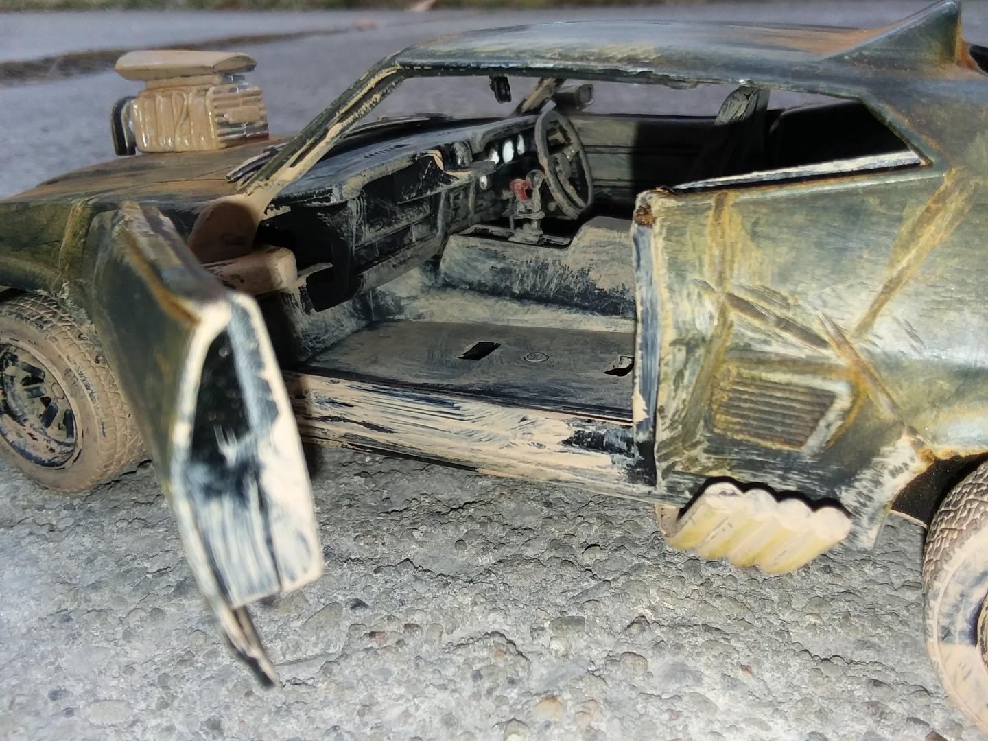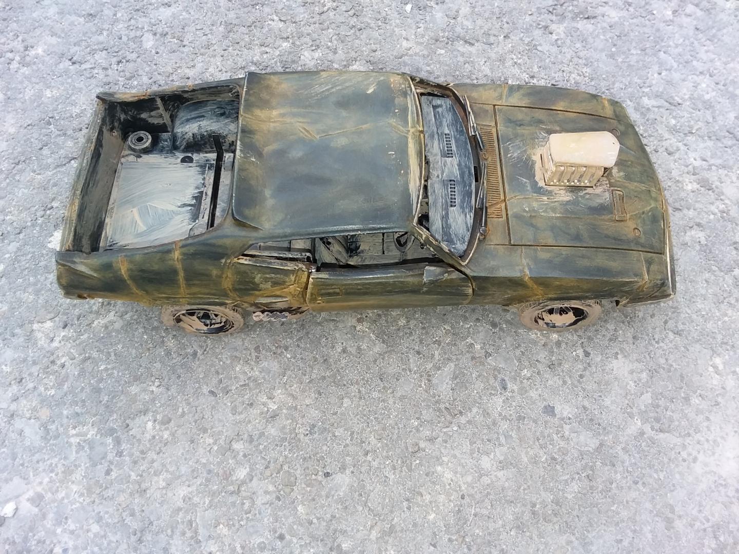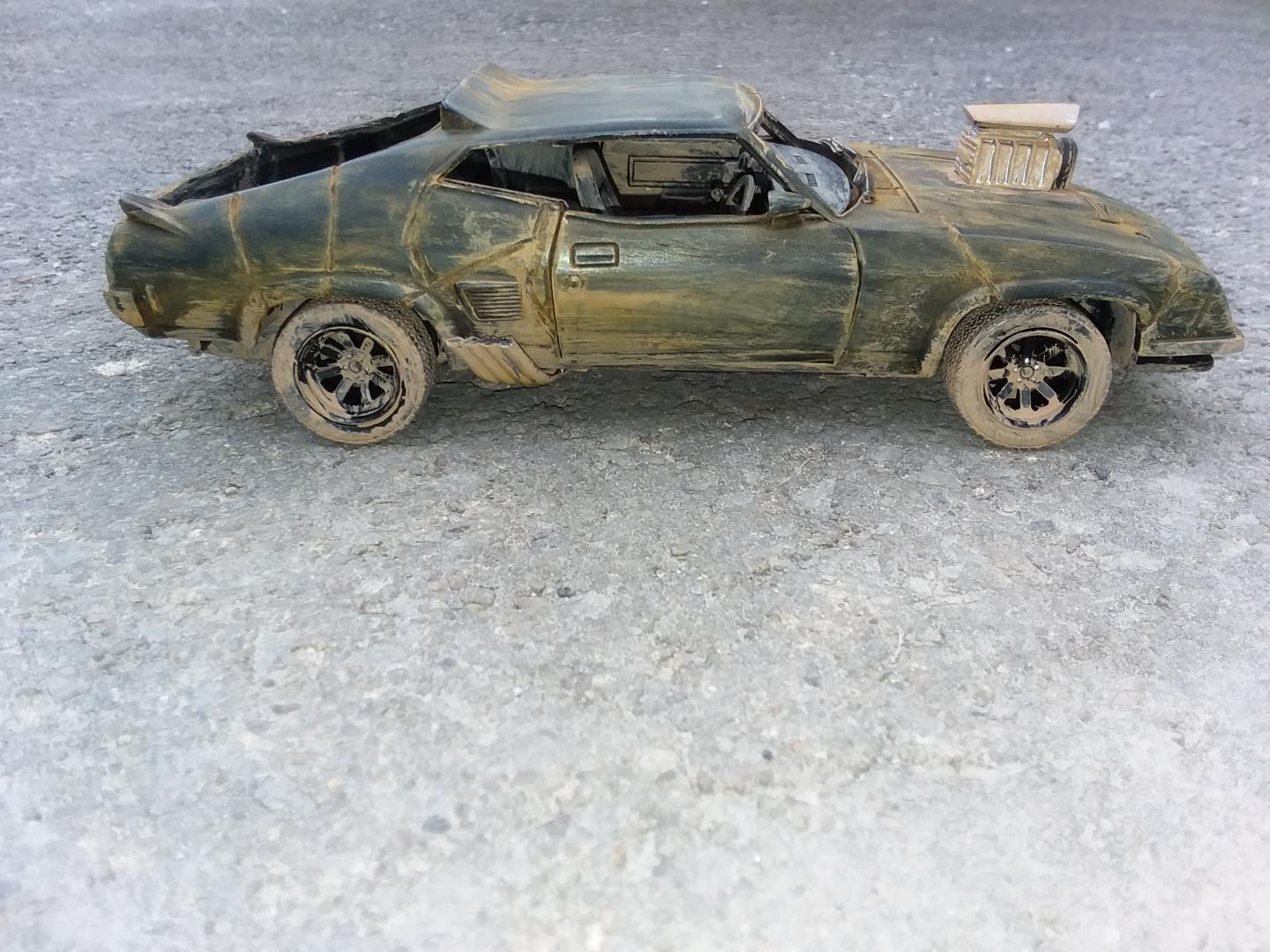 here is my 1/24th scale greenlight diecast mad max interceptor i modified to look like it did at the end of the mad max fury road prequal video game called mad max i did have to do the fury road version of the head lights cause there was no way i could cut out the molded in diecast head light covers to make the smashed out head light covers so i just drilled a hole in the center of the one and used the dremel to make cuts around the whole to make it look like cracks i used the dremel to cut off the diecast trunk lid and lower front air dam and to make all the gashes in the body of the car i cut away the back seat and removed the front passenger seat and the police radio and police dash light and modified the exaust pipes allong the sides and weathered the interior and wheels and chassie to look like dried dirt and mudd and then used rust weathering powder to weather the body and added a dried mudd and dirt paint to areas of the body