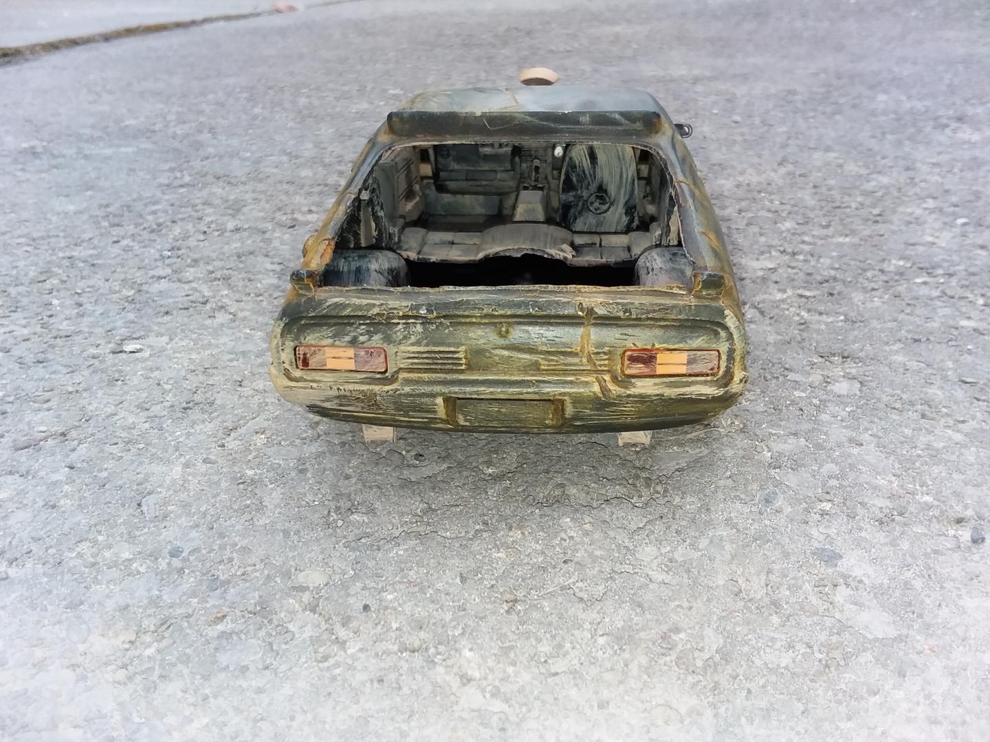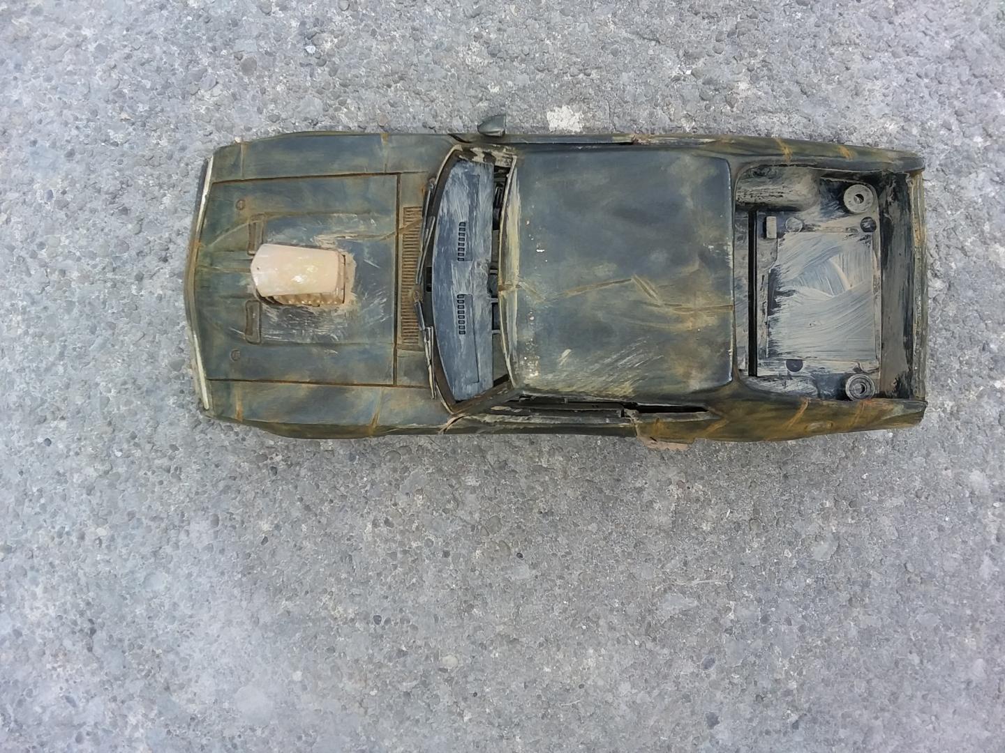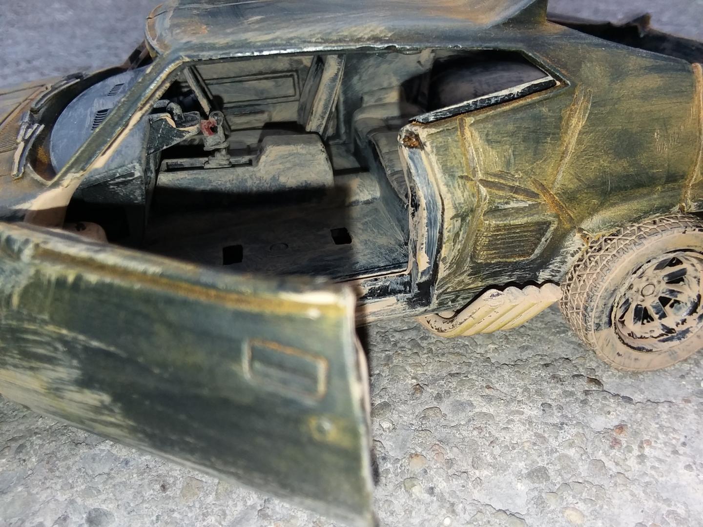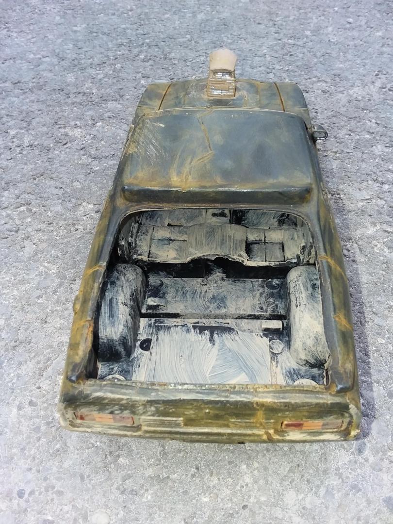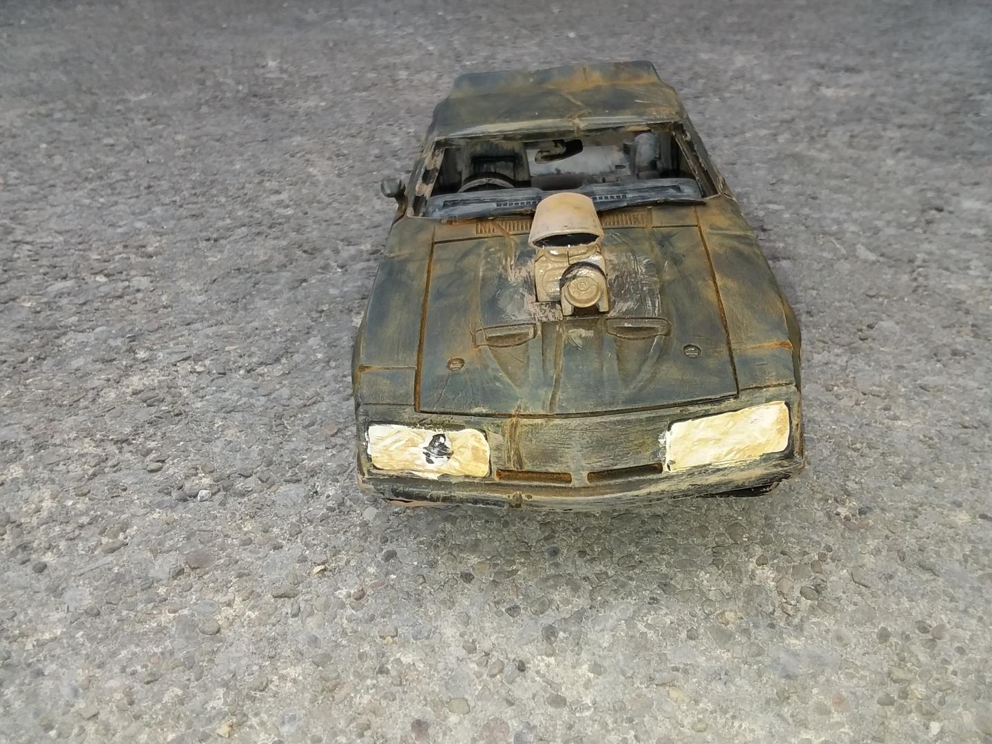 here is my 1/24th scale greenlight diecast mad max interceptor i modified to look like it did at the end of the mad max fury road prequal video game called mad max i did have to do the fury road version of the head lights cause there was no way i could cut out the molded in diecast head light covers to make the smashed out head light covers so i just drilled a hole in the center of the one and used the dremel to make cuts around the whole to make it look like cracks i used the dremel to cut off the diecast trunk lid and lower front air dam and to make all the gashes in the body of the car i cut away the back seat and removed the front passenger seat and the police radio and police dash light and modified the exaust pipes allong the sides and weathered the interior and wheels and chassie to look like dried dirt and mudd and then used rust weathering powder to weather the body and added a dried mudd and dirt paint to areas of the body