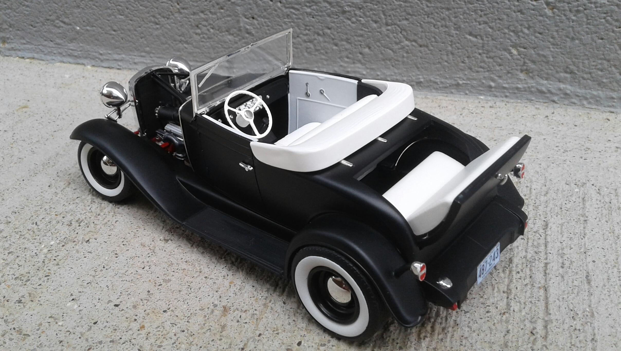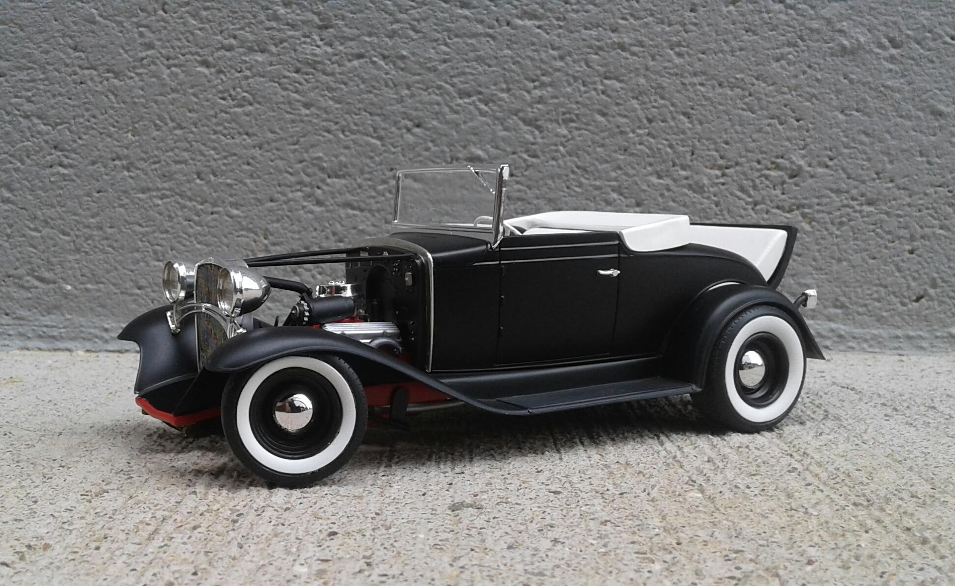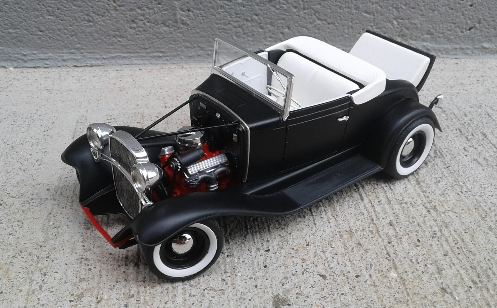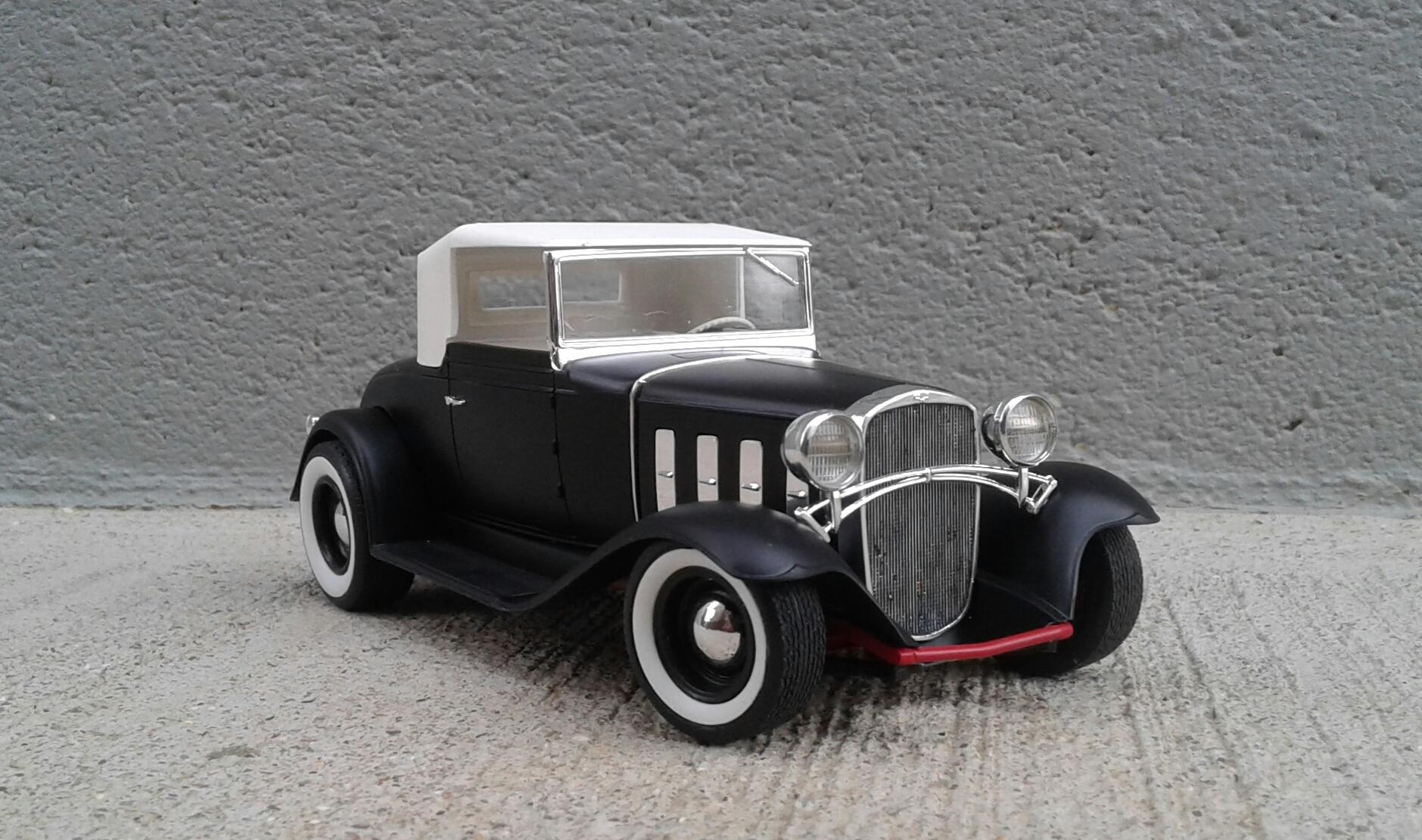 With the overwhelming popularity of the '32 Ford, it's Chevrolet counterpart receives about as much love as an ugly stepchild (no offense to ugly stepkids). They're a pretty rare sight for whatever reason. A rodded Chevy seems to be very rare. Even though I'm a Ford guy, I thought it was time to change that. Since I've stalled on no less than five projects this year, I wanted something simple. No details. No major changes. Just something almost box stock. The idea was to build something that someone could've built in their back yard or building back in the day. The biggest change was the engine. I swapped the anemic six cylinder for the 283 from the Revell '57 Chevy Sedan. I had to modify the belt and pulley setup to get them under the hood. The chrome breather from an AMT '55 Corvette and rocker covers from the parts box finished it off. It was covered with the very last squirt of Tamiya Bright Red. On the chassis, I moved two crossmembers to accommodate the engine, lowered the rearend and did an axle over conversion on the frontend. Luckily, I was able to keep the poseable steering. I cut away the bumper brackets front and rear. Then added a spreader bar up front. It was covered with Dupli Color Bright Red. On the body, all I did was remove the spare tire wells, filled a couple of holes, deleted the horns on the headlight bars and made new stalks for the stock taillights (my kit was missing one). It was then covered with Tamiya Semi Gloss Black. The interior is straight out of the box with different sheens of black and white. Tires are the old Good Year SCS's with painted whitewalls. Wheels are from two different AMT kits for the different offsets painted with Model Masters Semi Gloss Black. As usual, I had some trials and tribulations with this build. I'm definitely not a hot rod builder! But, in the end, I captured the look I was after. I'm pretty happy with how it turned out. Not my best. Not my worst. But, it'll do. Thanx for checking it out! Now I just gotta decide on which of my five previous projects to work on next!