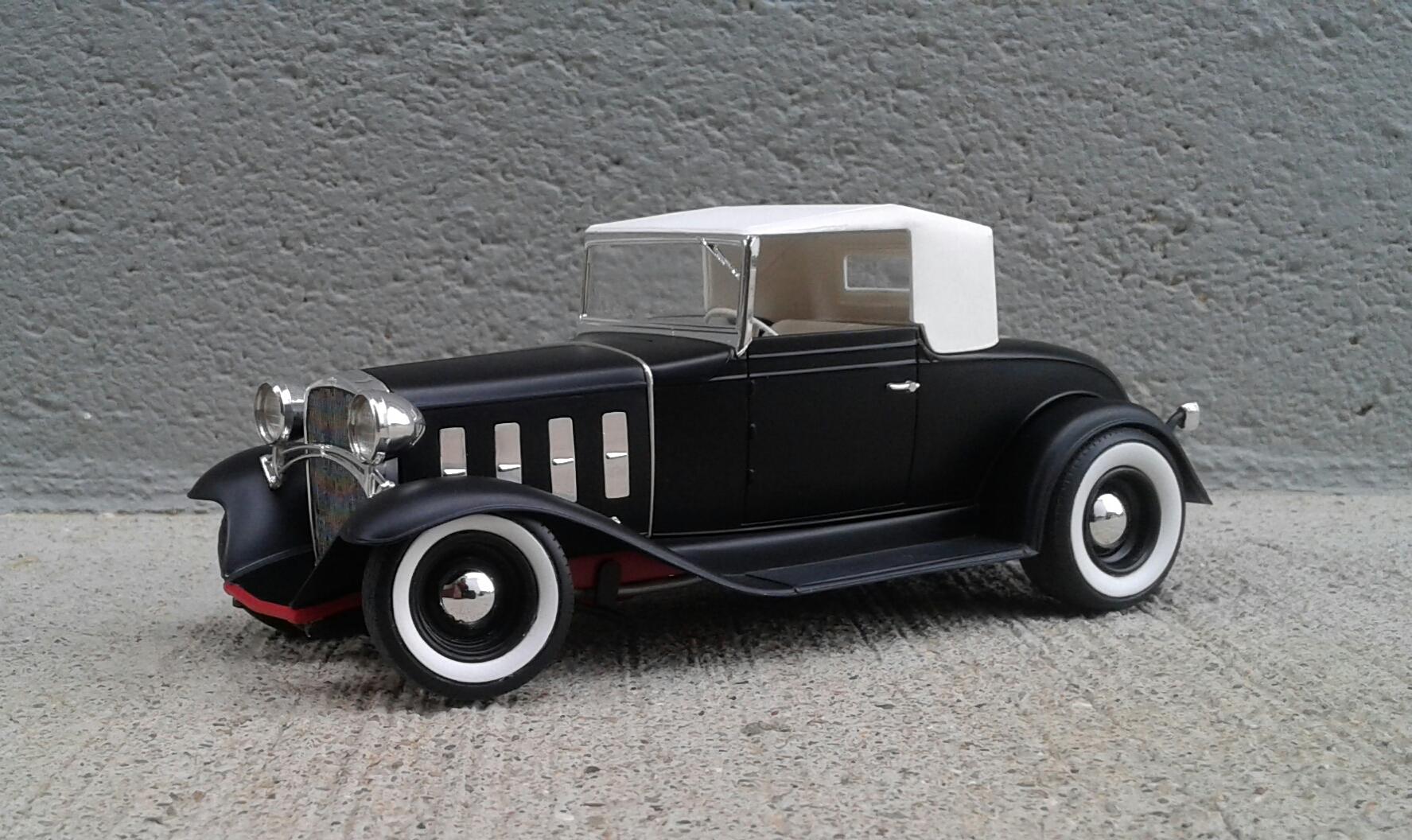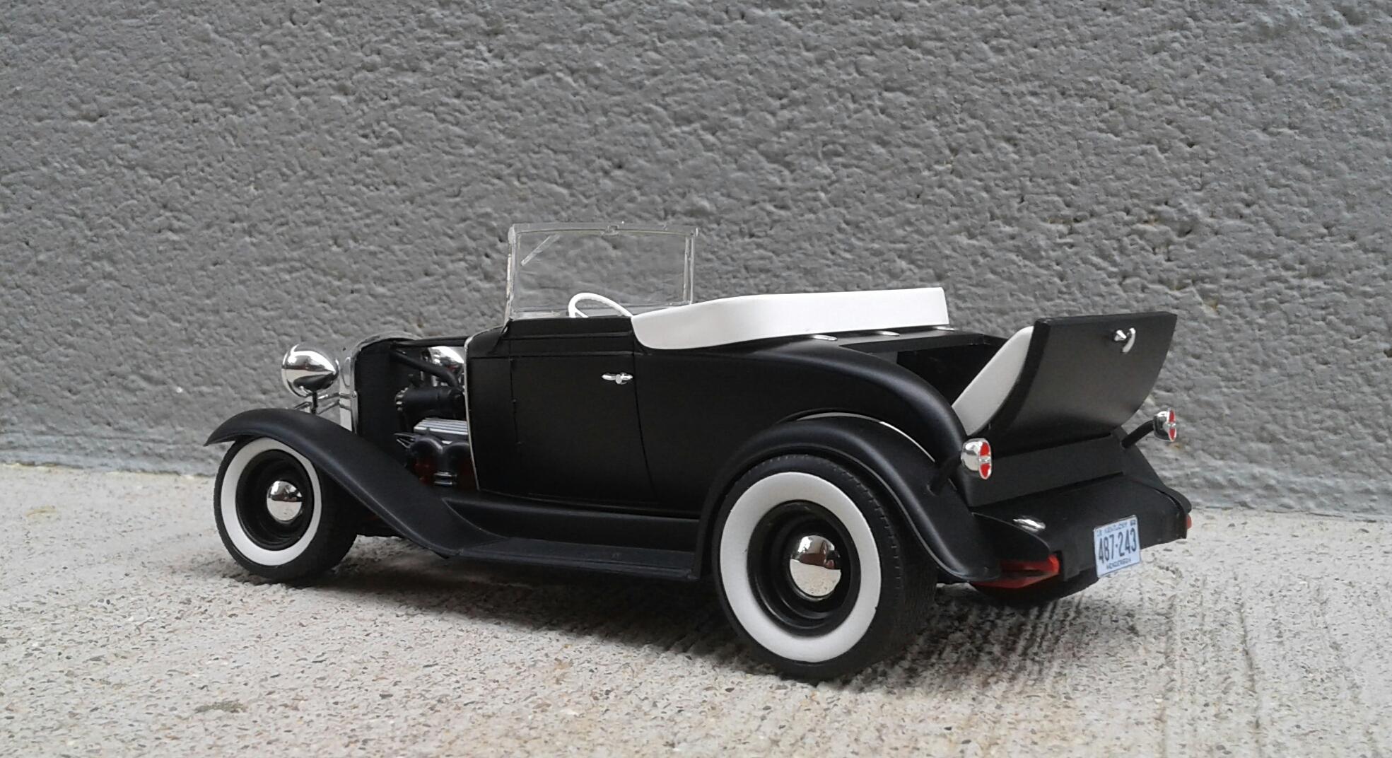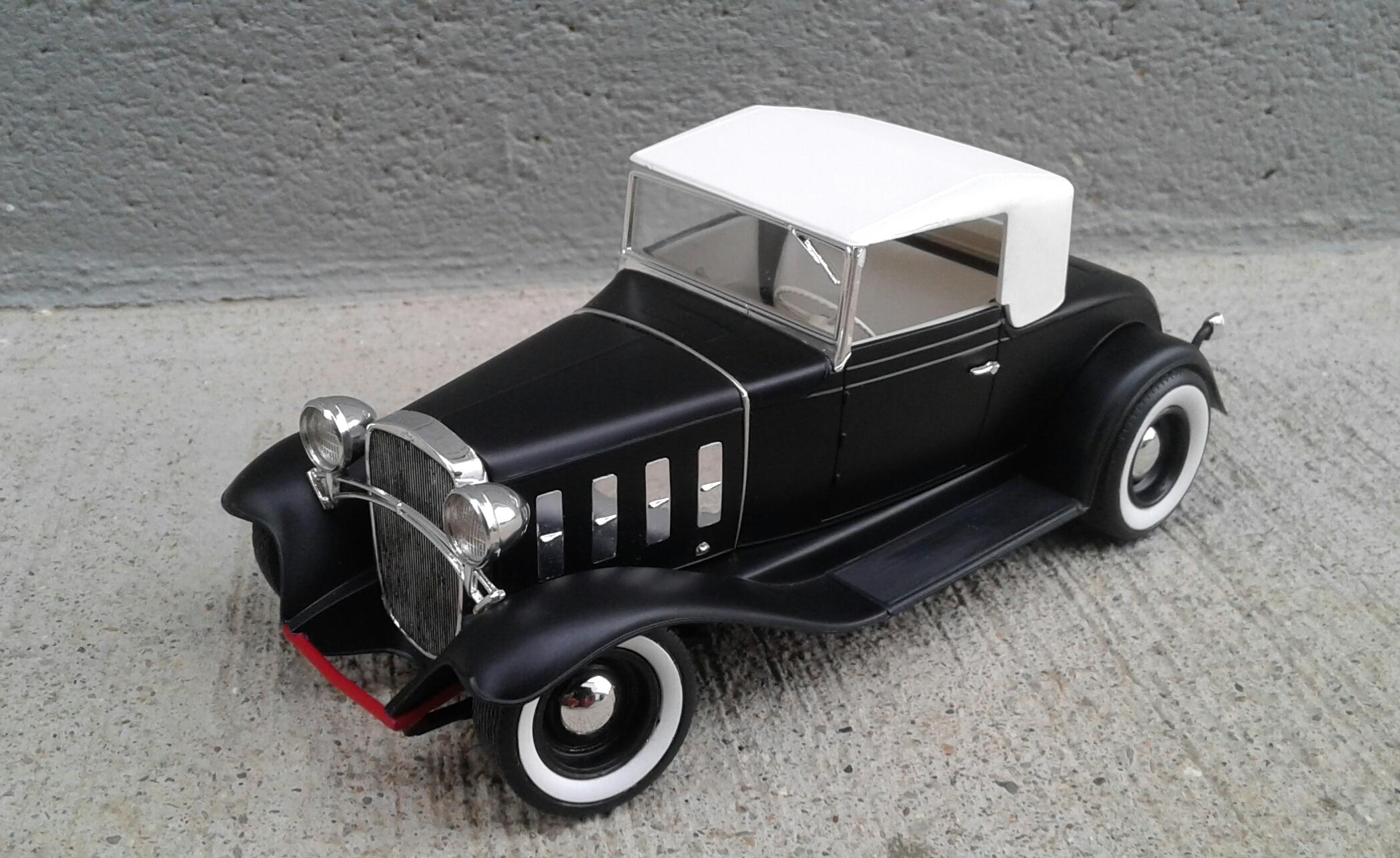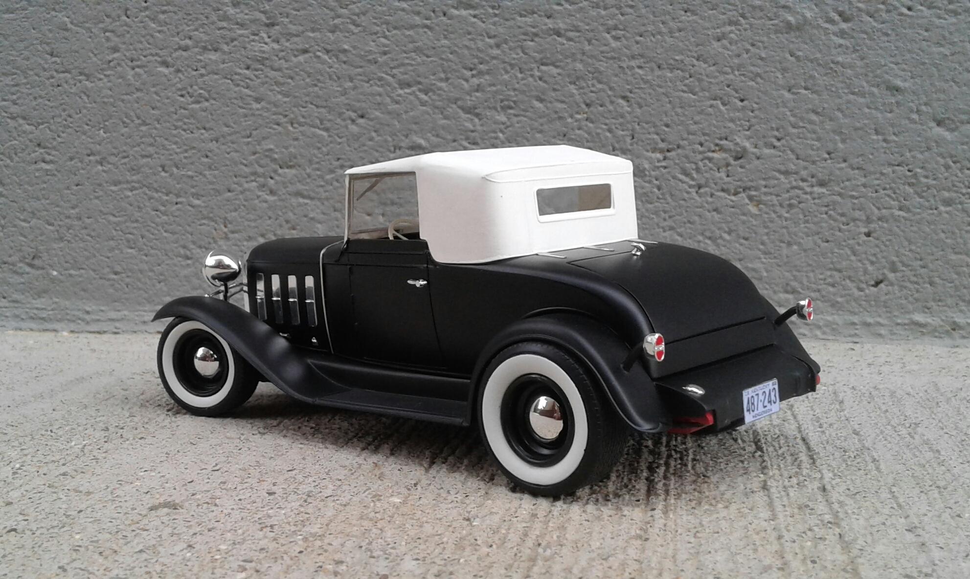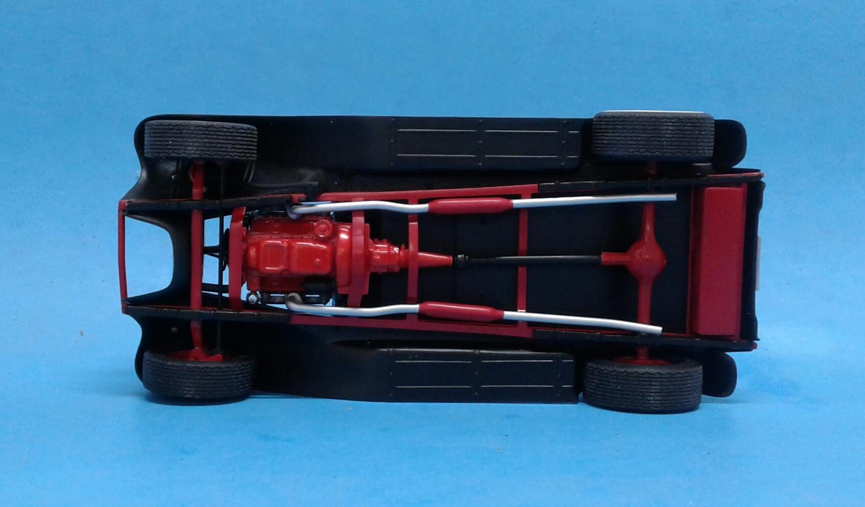 With the overwhelming popularity of the '32 Ford, it's Chevrolet counterpart receives about as much love as an ugly stepchild (no offense to ugly stepkids). They're a pretty rare sight for whatever reason. A rodded Chevy seems to be very rare. Even though I'm a Ford guy, I thought it was time to change that. Since I've stalled on no less than five projects this year, I wanted something simple. No details. No major changes. Just something almost box stock. The idea was to build something that someone could've built in their back yard or building back in the day. The biggest change was the engine. I swapped the anemic six cylinder for the 283 from the Revell '57 Chevy Sedan. I had to modify the belt and pulley setup to get them under the hood. The chrome breather from an AMT '55 Corvette and rocker covers from the parts box finished it off. It was covered with the very last squirt of Tamiya Bright Red. On the chassis, I moved two crossmembers to accommodate the engine, lowered the rearend and did an axle over conversion on the frontend. Luckily, I was able to keep the poseable steering. I cut away the bumper brackets front and rear. Then added a spreader bar up front. It was covered with Dupli Color Bright Red. On the body, all I did was remove the spare tire wells, filled a couple of holes, deleted the horns on the headlight bars and made new stalks for the stock taillights (my kit was missing one). It was then covered with Tamiya Semi Gloss Black. The interior is straight out of the box with different sheens of black and white. Tires are the old Good Year SCS's with painted whitewalls. Wheels are from two different AMT kits for the different offsets painted with Model Masters Semi Gloss Black. As usual, I had some trials and tribulations with this build. I'm definitely not a hot rod builder! But, in the end, I captured the look I was after. I'm pretty happy with how it turned out. Not my best. Not my worst. But, it'll do. Thanx for checking it out! Now I just gotta decide on which of my five previous projects to work on next!