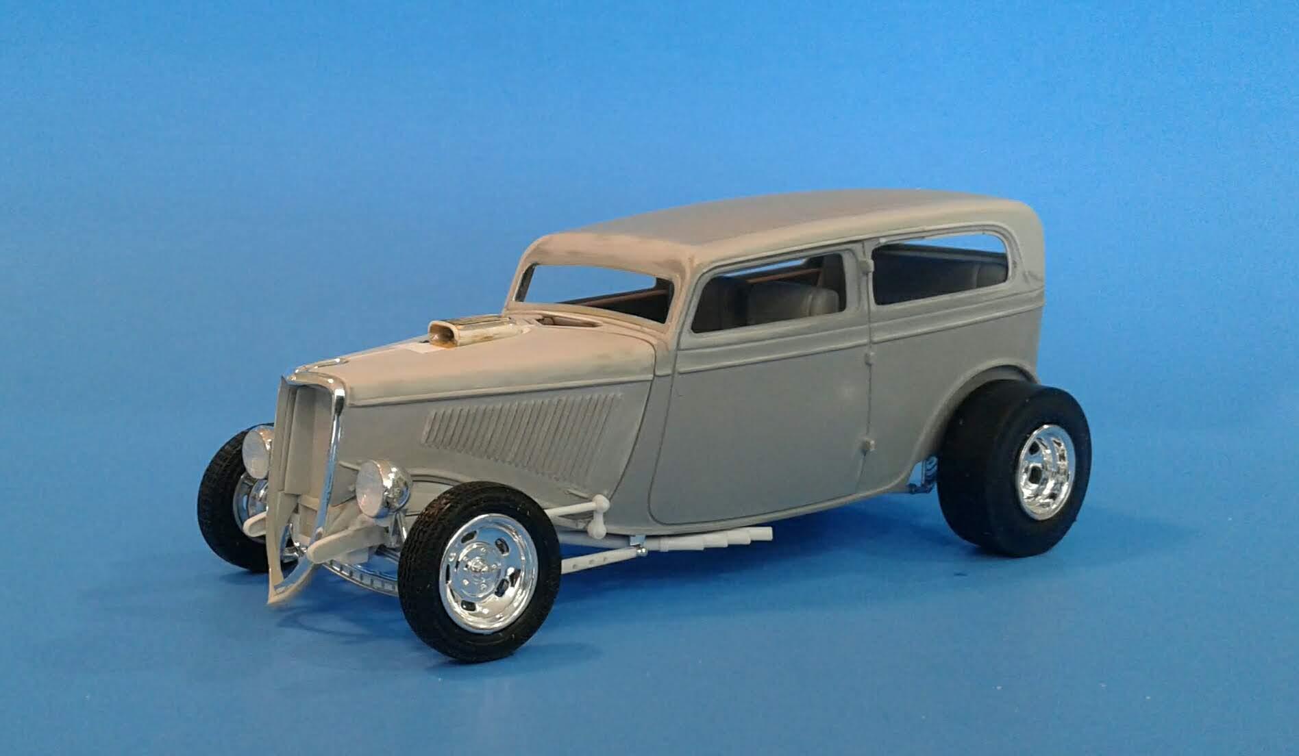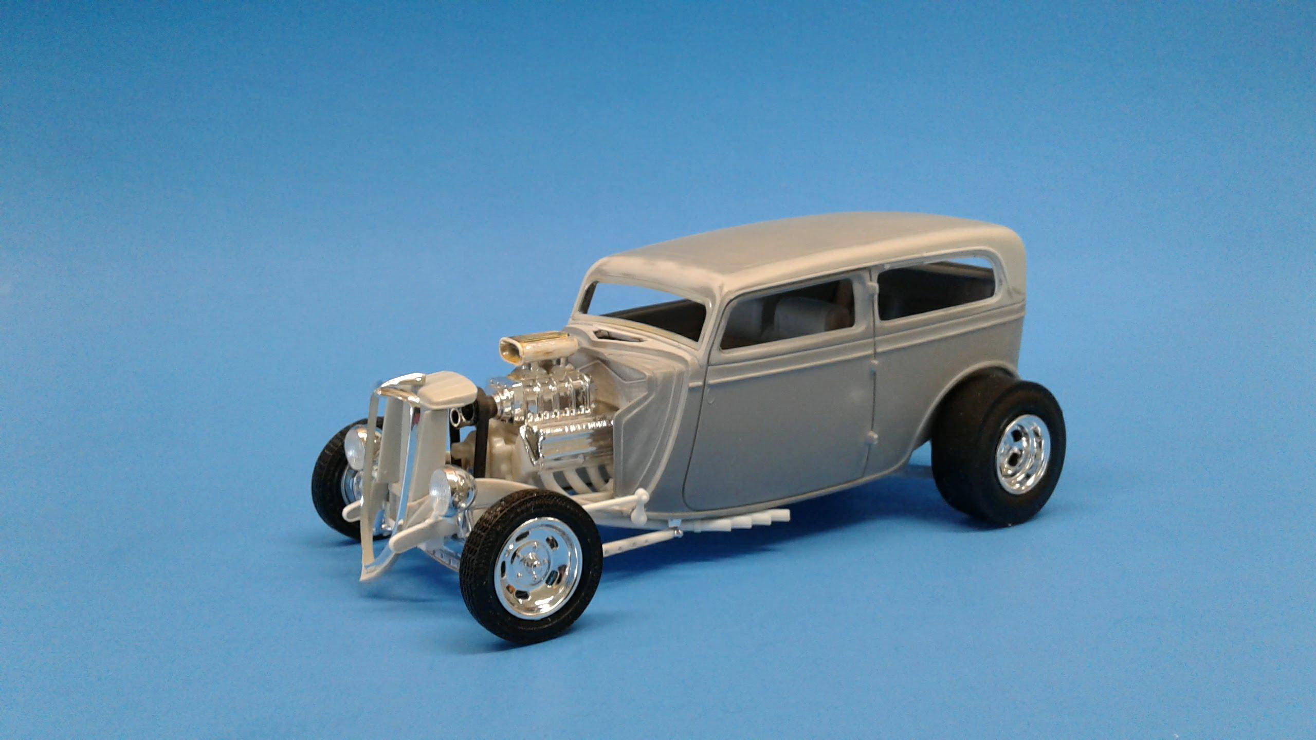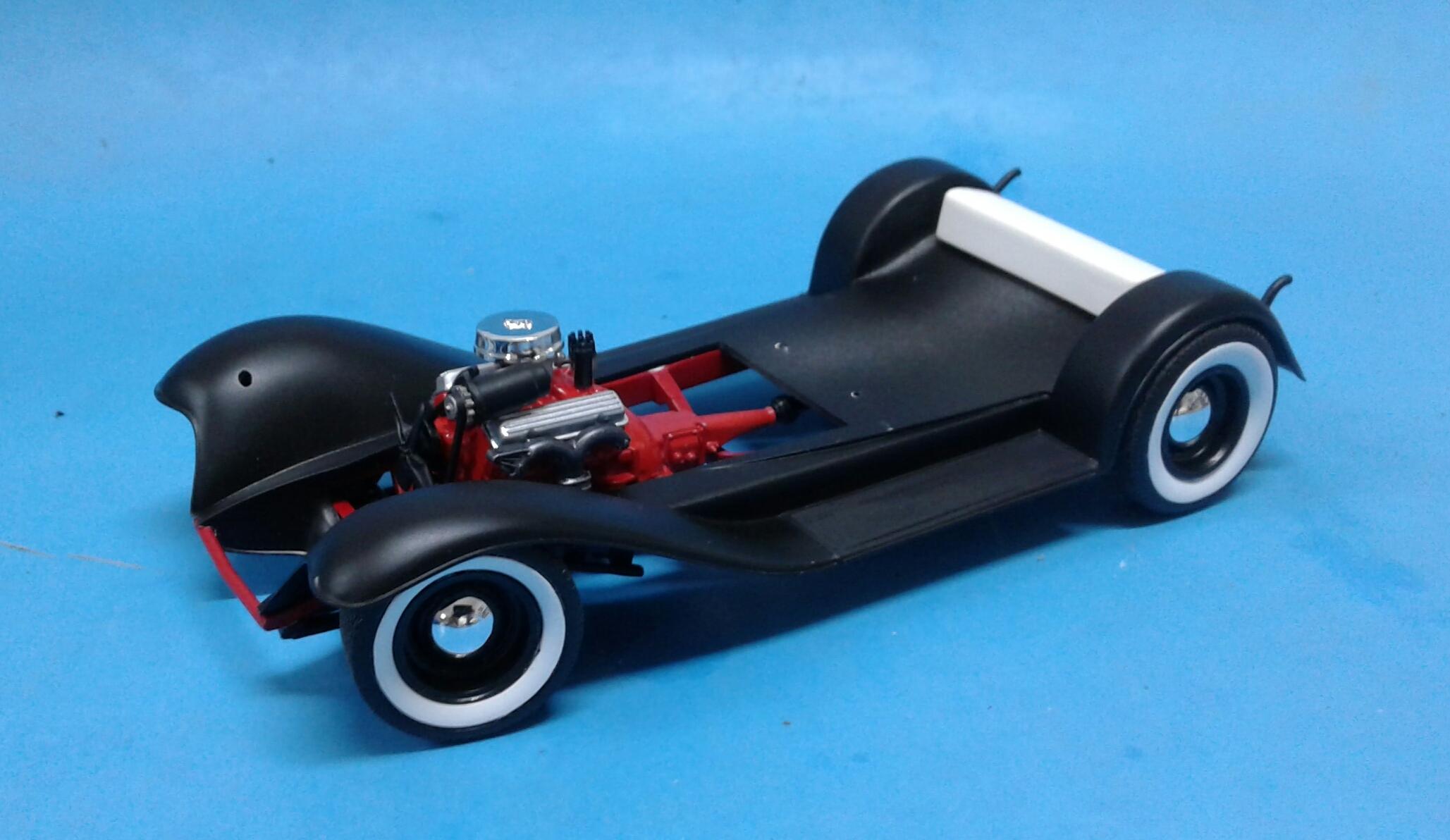 I now have the engine done and glued in. No details. I just want a simple (or as simple as it can be) type build. I also have the fenders glued to the chassis. I decided to keep the rumble seat instead of turning it into a hinged trunk. -