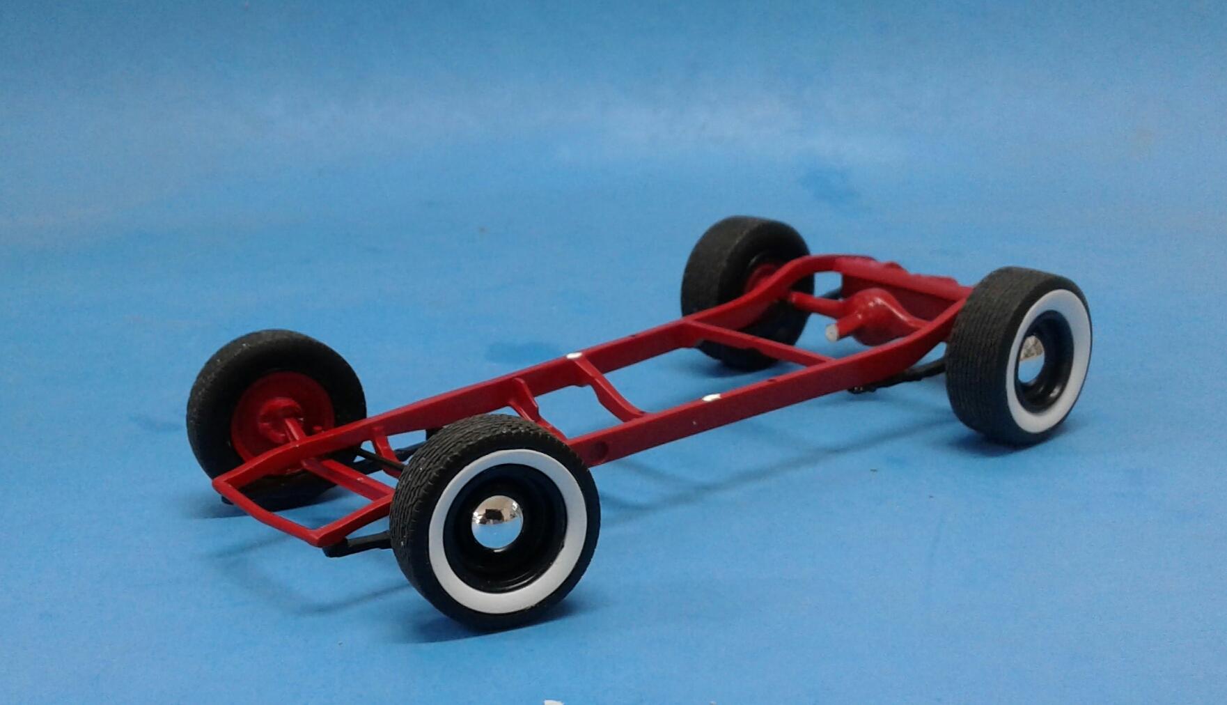 I have finally settled on the wheel and tire setup on this thing! This is what I was looking for! They tie everything together! The black, white and chrome. The wheels aren't seated into the tires in this photo as the paint on the tires wasn't completely dry. But, I couldn't wait to see what they looked like! With the budget look it has, I'm going to just build the engine as it would have came out of a '57 Chevy. The only addition will be a chrome air cleaner. Now I can maybe make some progress and get this thing done! -
