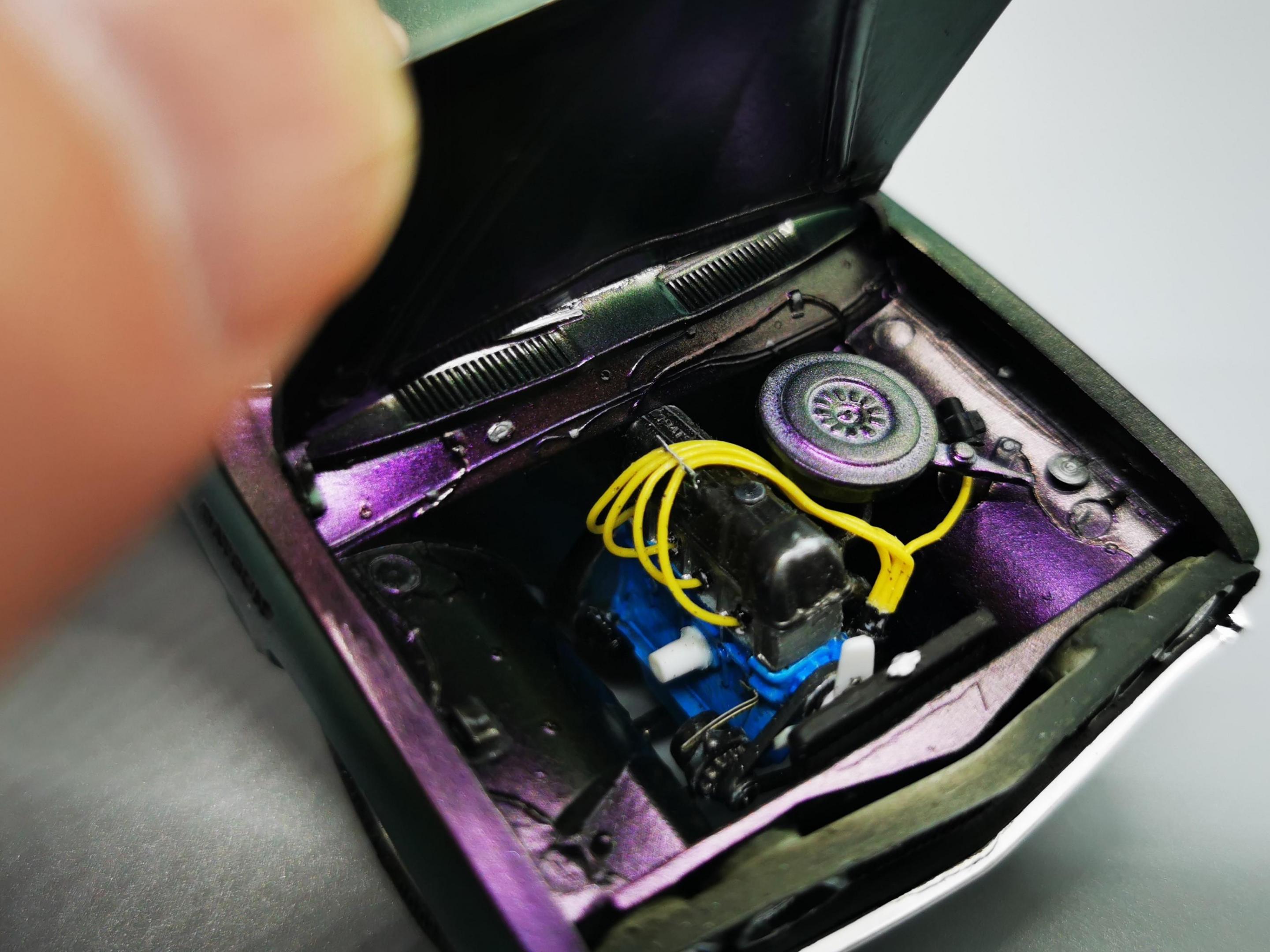 16. An older kit and not as well thought out as some of the other kits from this era. Many of the parts did not quite fit right or didn't have proper attachment points but overall not too bad. I have done worse. Paint messed up on me in the clear stage and the red plastic bleed through was quite apparent but this was more of a test car than anything to try and see if I can do stripes. Turns out I can do stripes. Cool. Interesting car and honest, looks a lot better in person than any of my photos. Something about the roundness of the car make it hard to photograph. Thanks for looking. Full build video on my YouTube channel.