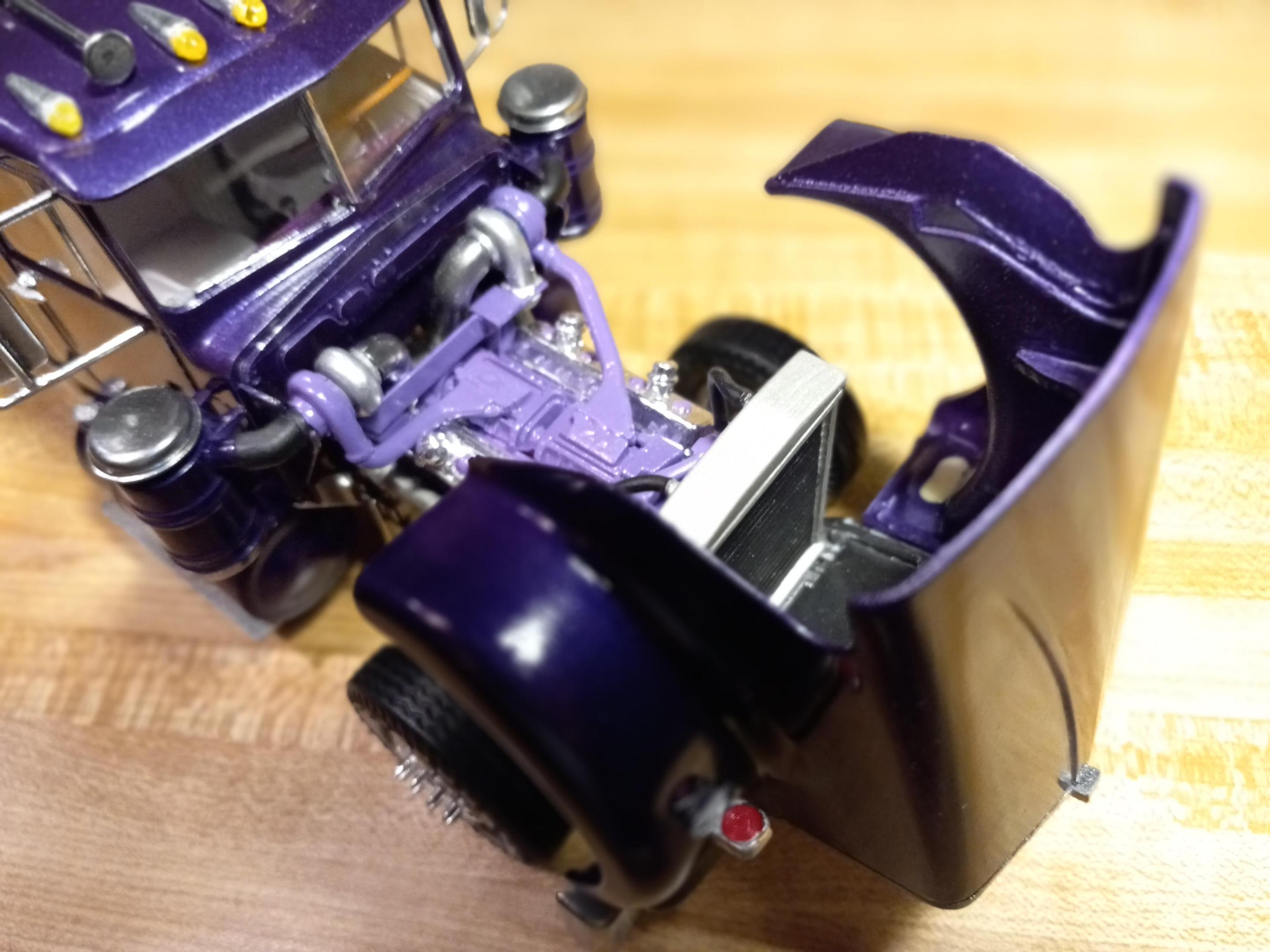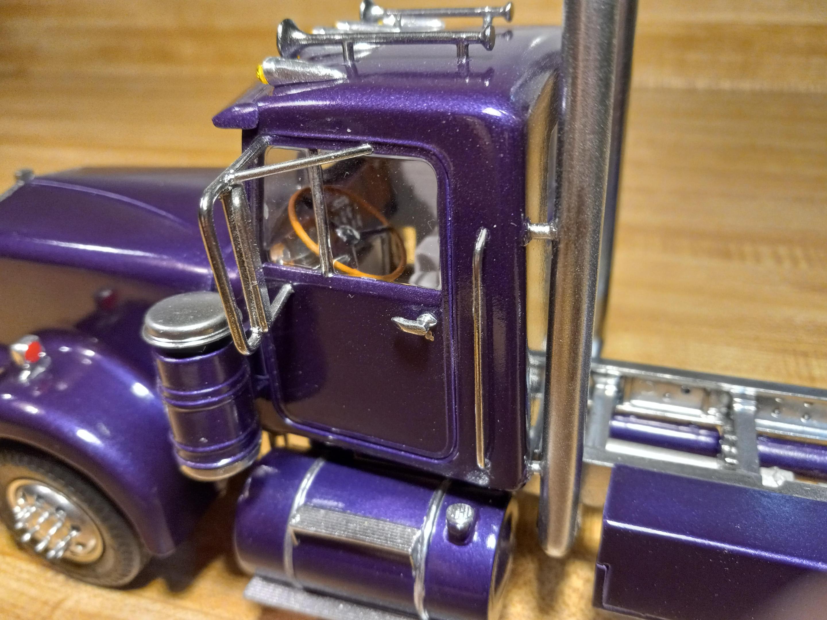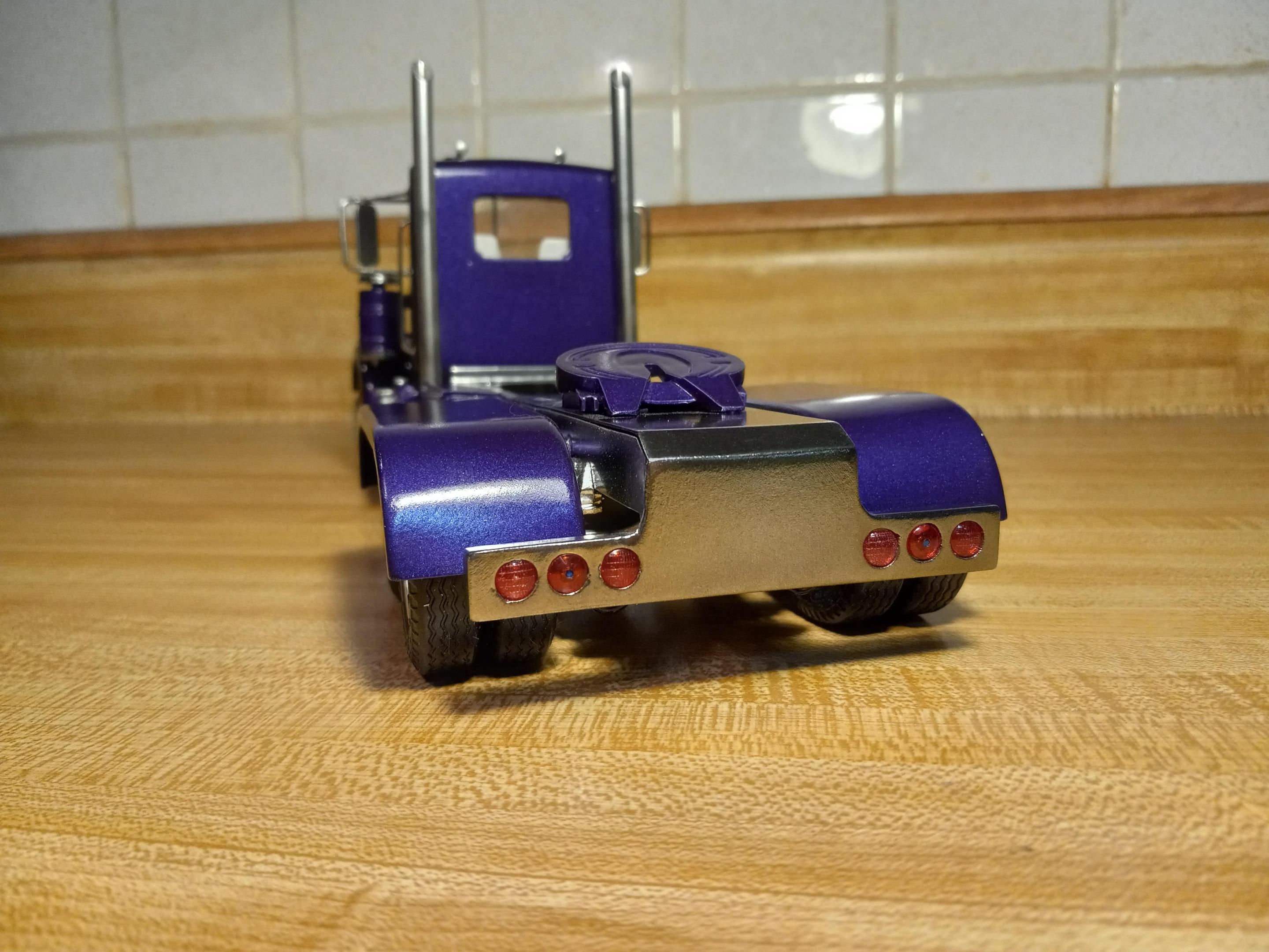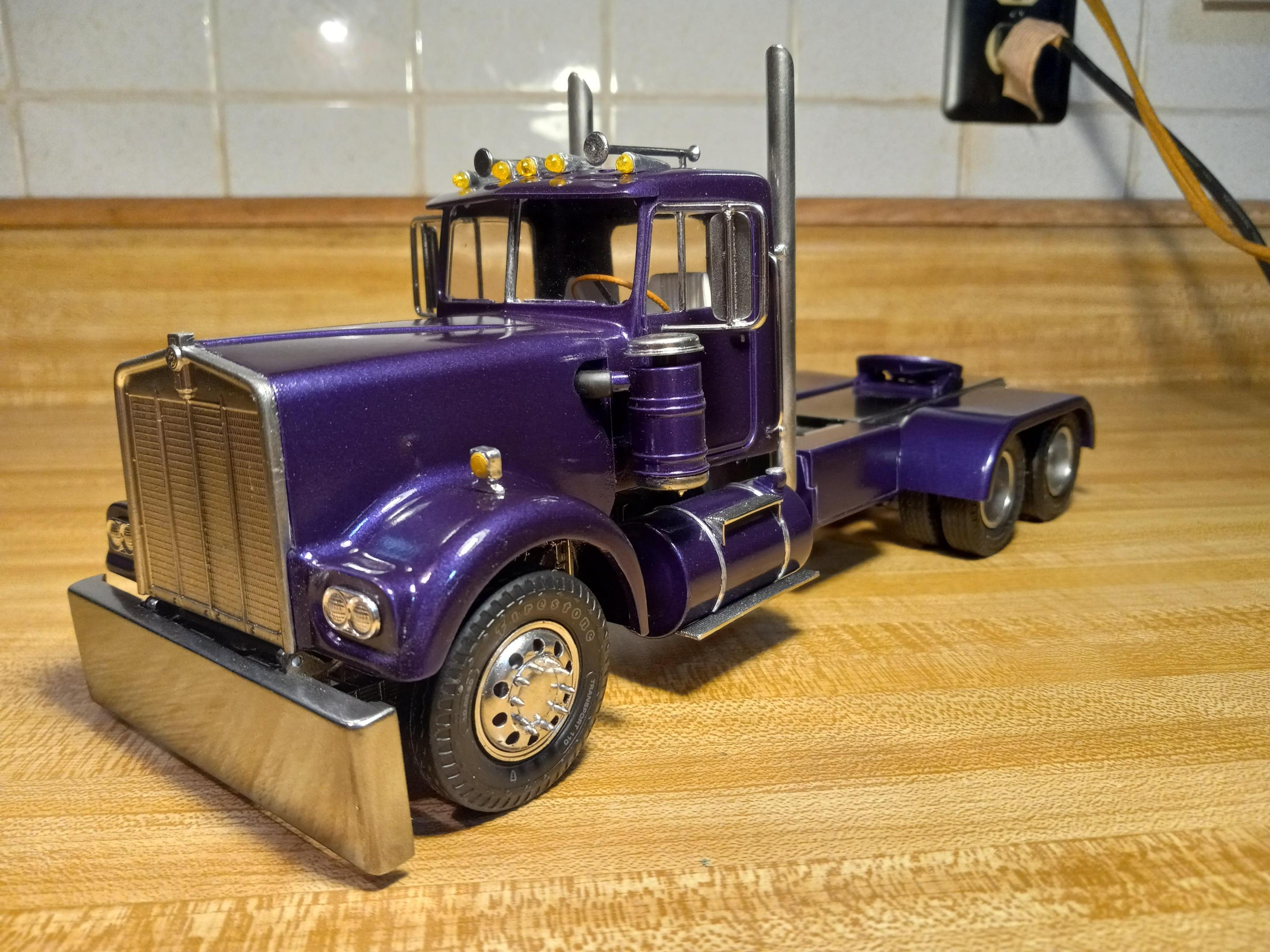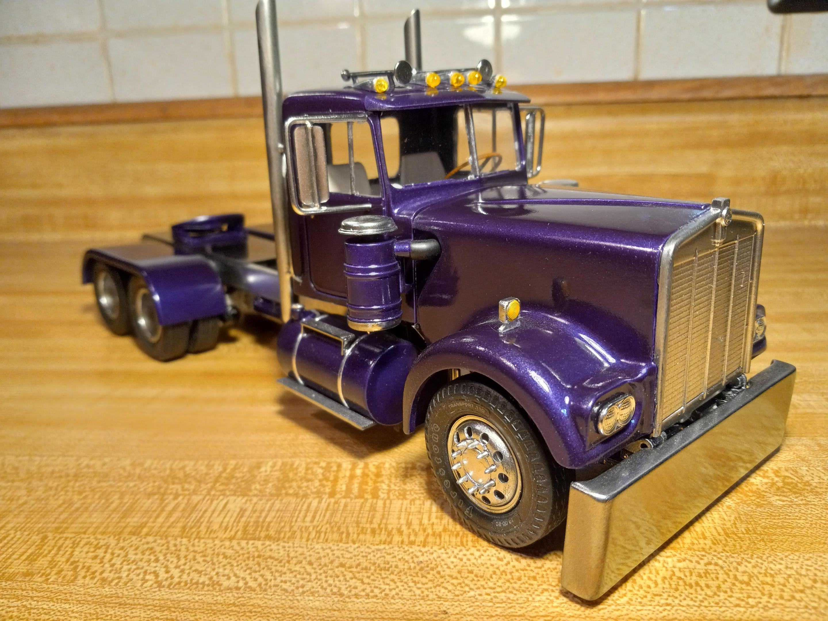 Kenworth from AMT Challenge mixer kit,added v-12 detroit from Malone Super Boss. Had to move cab back 1/4 inch, stretched hood, made new engine and cab mounts.dropped front axle 1/4 inch to get it low chromed frame,scratch built front and rear bumpers, exhaust, scratched new mirrors.made new turbo brackets to connect to stock air cleaners.added some blue dot tailights.Paint is testors purplelicious, thanks for looking.