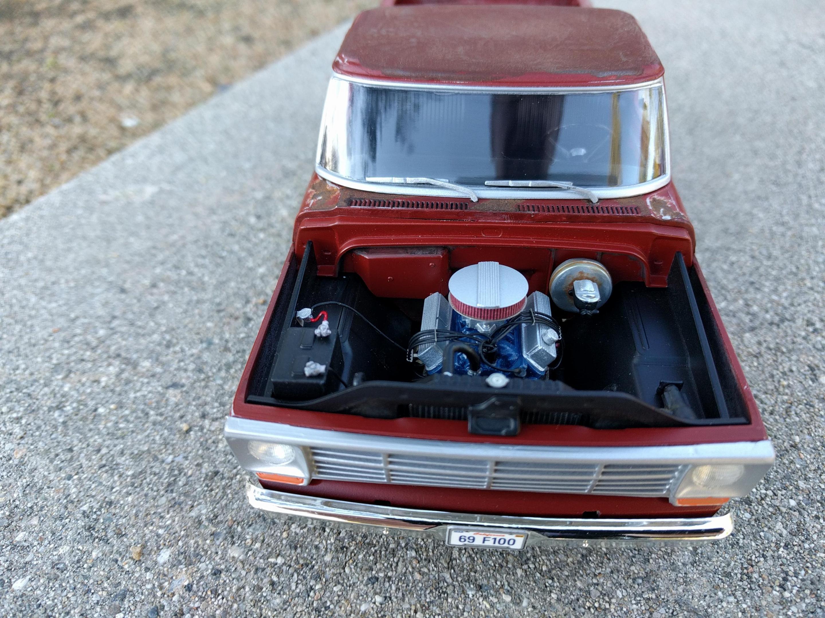 My motor is recently rebuilt so I didn't really feel a need to weather it. My truck has power steering so I had to add another pulley for the p/s pump. My air cleaner and valve covers are from some resin / p/e kit for small block fords. I added the ribs to them myself using some micro styrene rod. Distributor is actually wired 1542 etc.