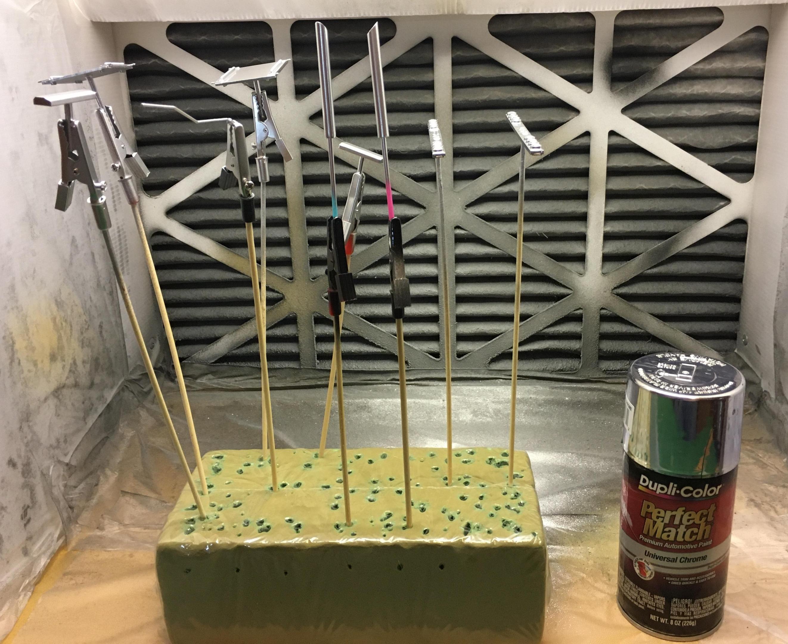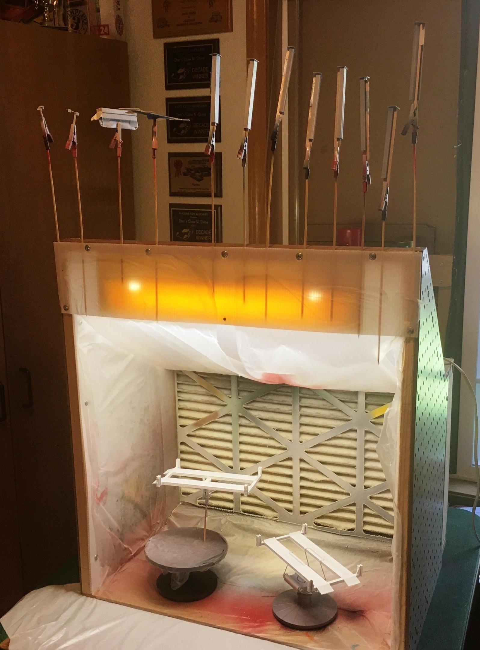 I do the same. Sprue rods CA to inconspicuous areas of the part to be painted. Alligator clips attached to bamboo skewers. I try to paint in large batches which leaves you with where to park the wet parts. The material I used to line my paint booth is corrugated plastic. It hold freshly painted item up out of the way. I also have a piece of floral foam and a model box full of cardboard strips glued together. -