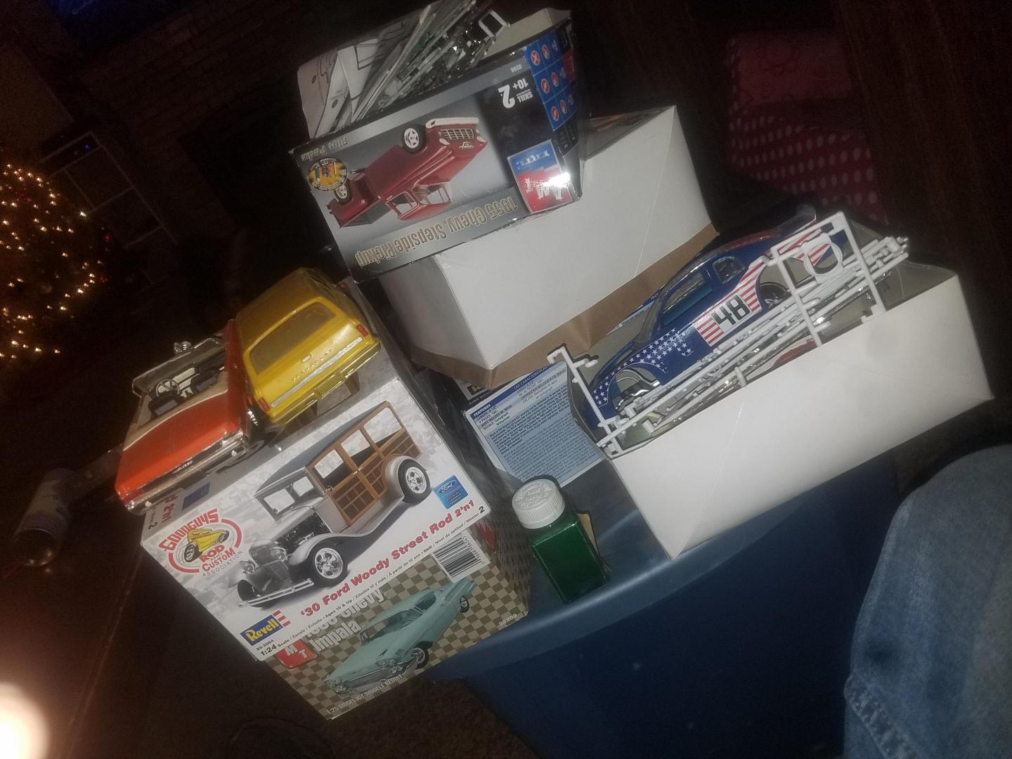 Well I got a call from my dad last night saying he had found a box I may be interested in out in the storage building So I stopped by after work... Turns out it was some kits from when I was a kid! Some are half built but at least 4 are opened but untouched! Thought they were lost to a house fire years ago... Score!!! Not pictured is a 70 Boss 429 mustang 71 Cuda convertible. Johann Sox and Martin 71 Cuda. AC Cobra 65 Riviera And some year of a GTX that I haven't looked at. A 55 Nomad 62 Impala convertible And another giant box of parts!! It was like Christmas came early... and it's all my old stuff!! And 2 of my dads old build from his childhood. I'm thrilled!