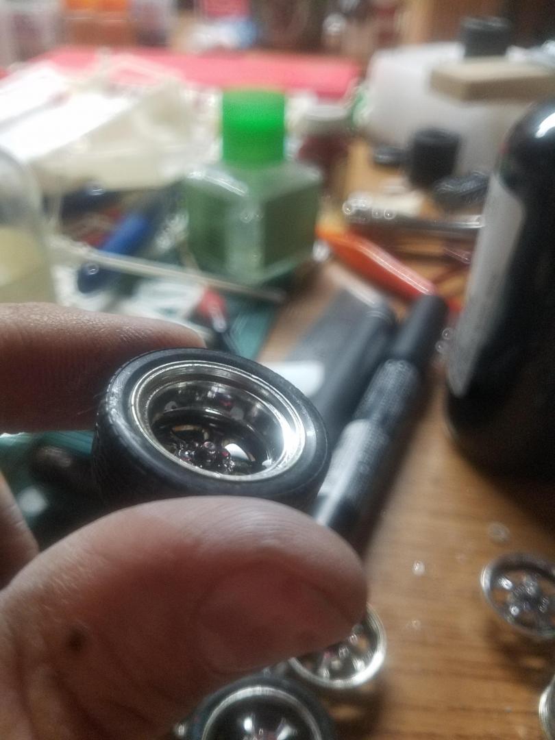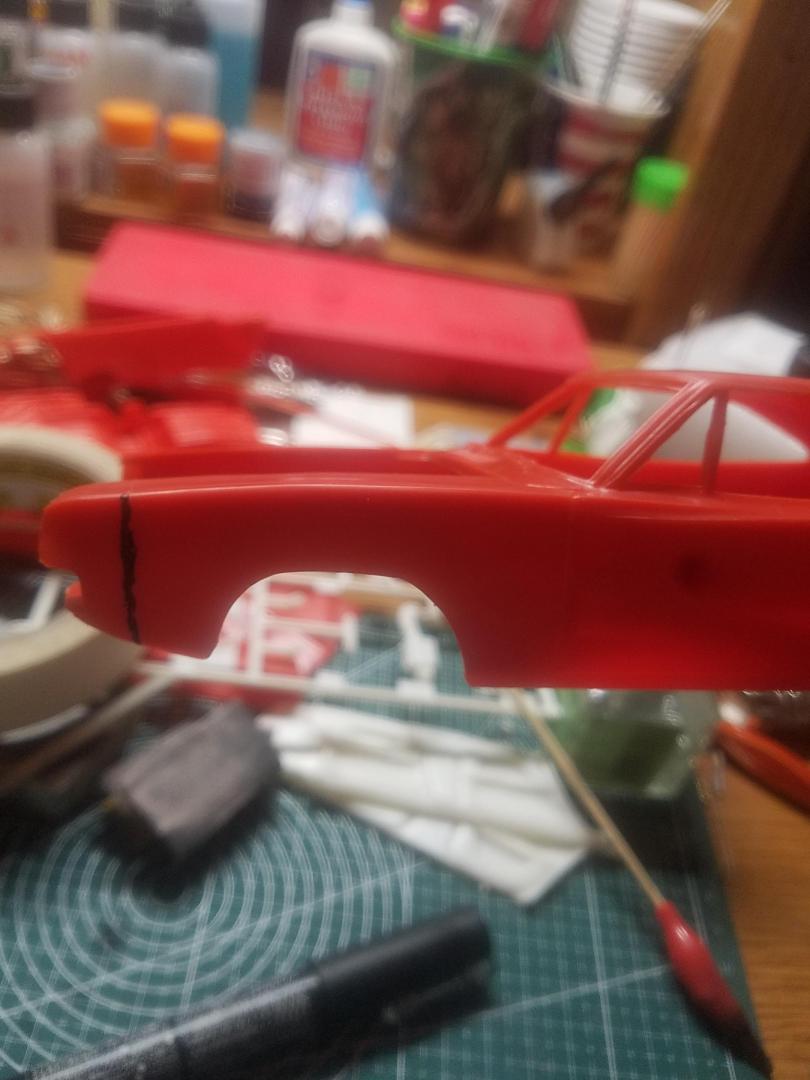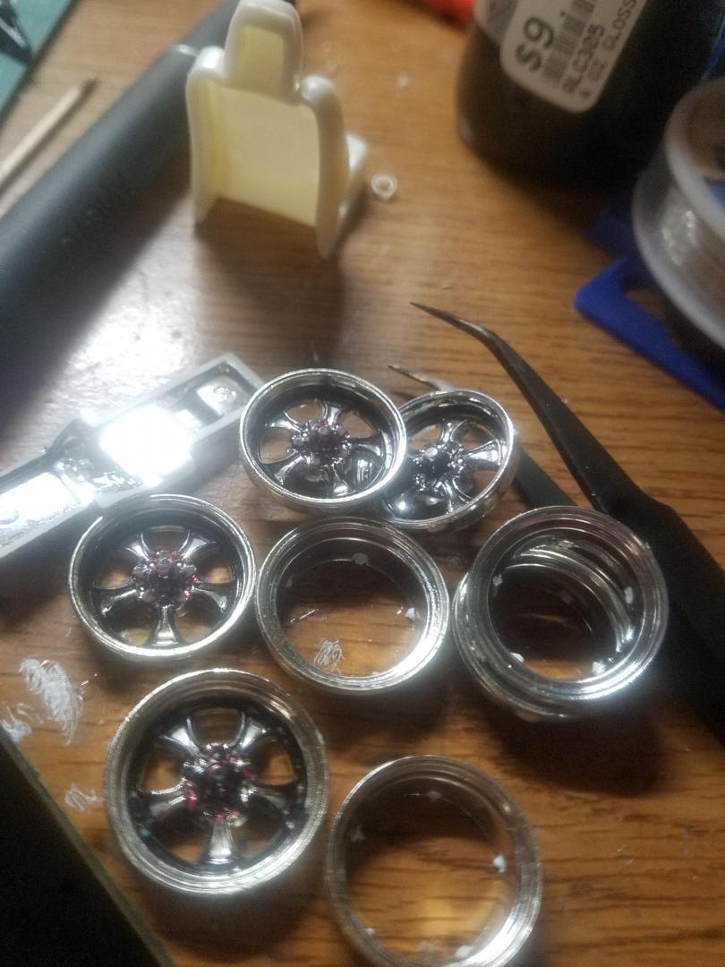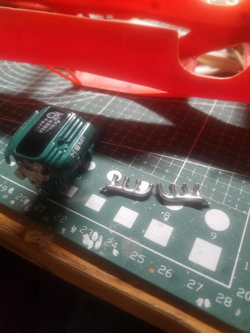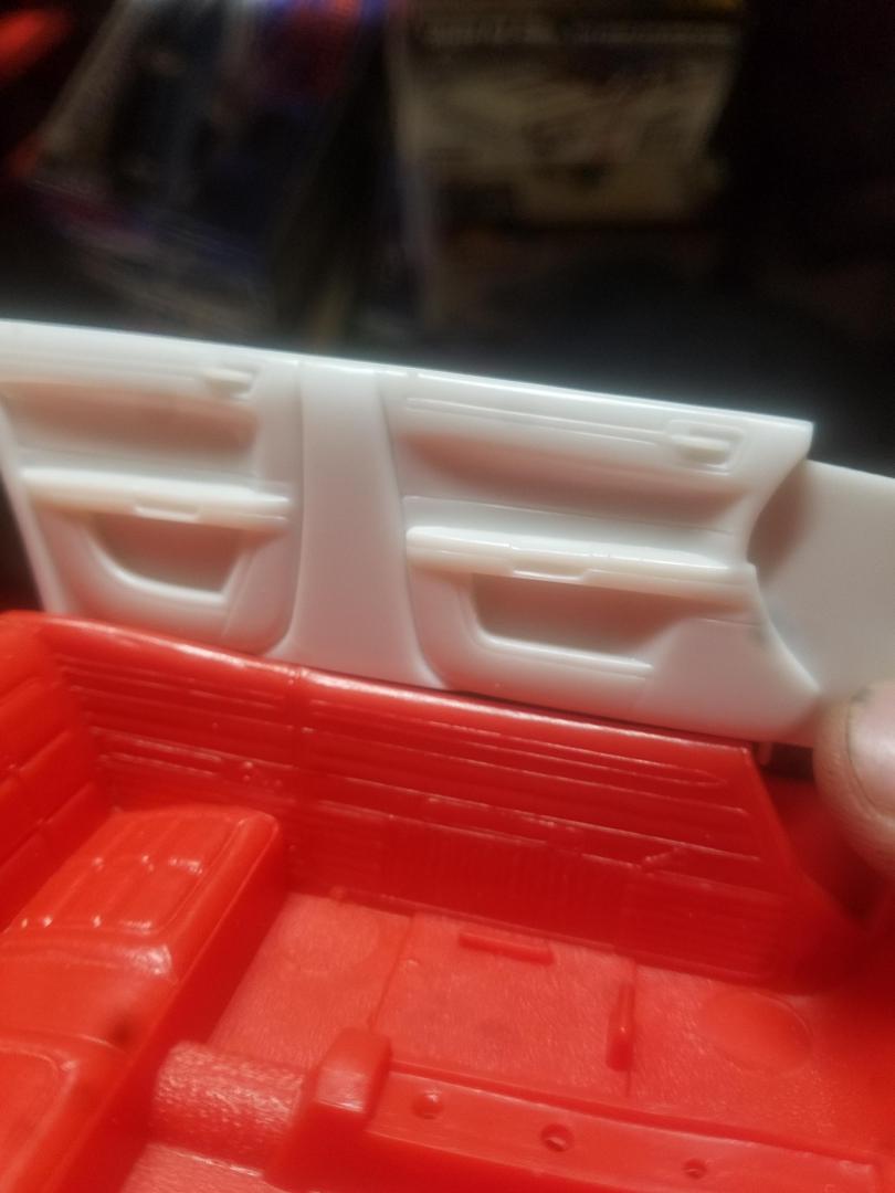 Ok, so here I've got the front fenders scribed for where I want to cut to shorten the front end. The black is just there for it to show in the photo. Here is where I have shaved the "door handles" (blobs that were crooked and uneven on both sides). This is a sink mark that's right on a mold line...(gonna be fun to correct) I got the engine pretty close to done, still have a few more parts to add and some detail painting to do on it, the engine color is a mix of blue, green, and Pontiac engine blue metallic. The manifolds are Alclad Chrome. And I put a hand grenade decal on the intake cover. Have to modify these door panels to fit the dimensions of the interior tub. Salvaged these wheels from the parts box, I think they came from some station wagon kit when I was a kid? Gonna throw them in some stripper I was going go use the factory 300 wheels and tires but felt I needed less back spacing in the rear... unfortunately I do not have any wide rear tires for a rim this size (and no clue where to get any) I've also contemplated making this a convertible... as I think that would look pretty awsome!