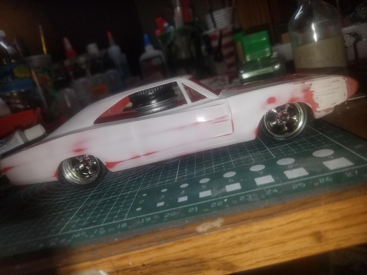 Another update... I worked all morning to get the front end and hood cut down. And do some more general body work. I typically work on 1 side at a time. So I done some filling/sanding and then a coat of Alclad white primer and some block sanding. I had to cut the chassis pan from the 300 to fit correctly in the Daytona body.. and have it line up properly as I want to retain the 300s suspension and drivetrain. I solved my real wheels back spacing issues and made them deeper by using the wheel backs from these very wheels and just reversed everything so the wheel back is on the front and the rim is facing the outside... neat little trick I figured out by fooling around with them. Still have strip them and get the alclad on the outer "rings" I managed to get the nose cone on and the gaps filled with some Evercoat spot putty I had in the 1:1 shop... it's a bit more durable and rigid vs the Hobby stuff. I had to cut some styrene strips (evergreen) to make some "locators/ supported for the nose cone. I also opened the lower part or the cone, as I'm going to make a custom intake/airbox. After sanding/shaping the spot putty, I spread a layer of Tamiya white putty, as it's much finer... kinda like "dolphin glaze" for 1:1. Also got the hood cut to fit, but still need to remove the hoodpins. And this is about what I want the overall stance to be like. the interior is gonna be a BEAR! I'll update again once I have more completed. Thanks for looking.