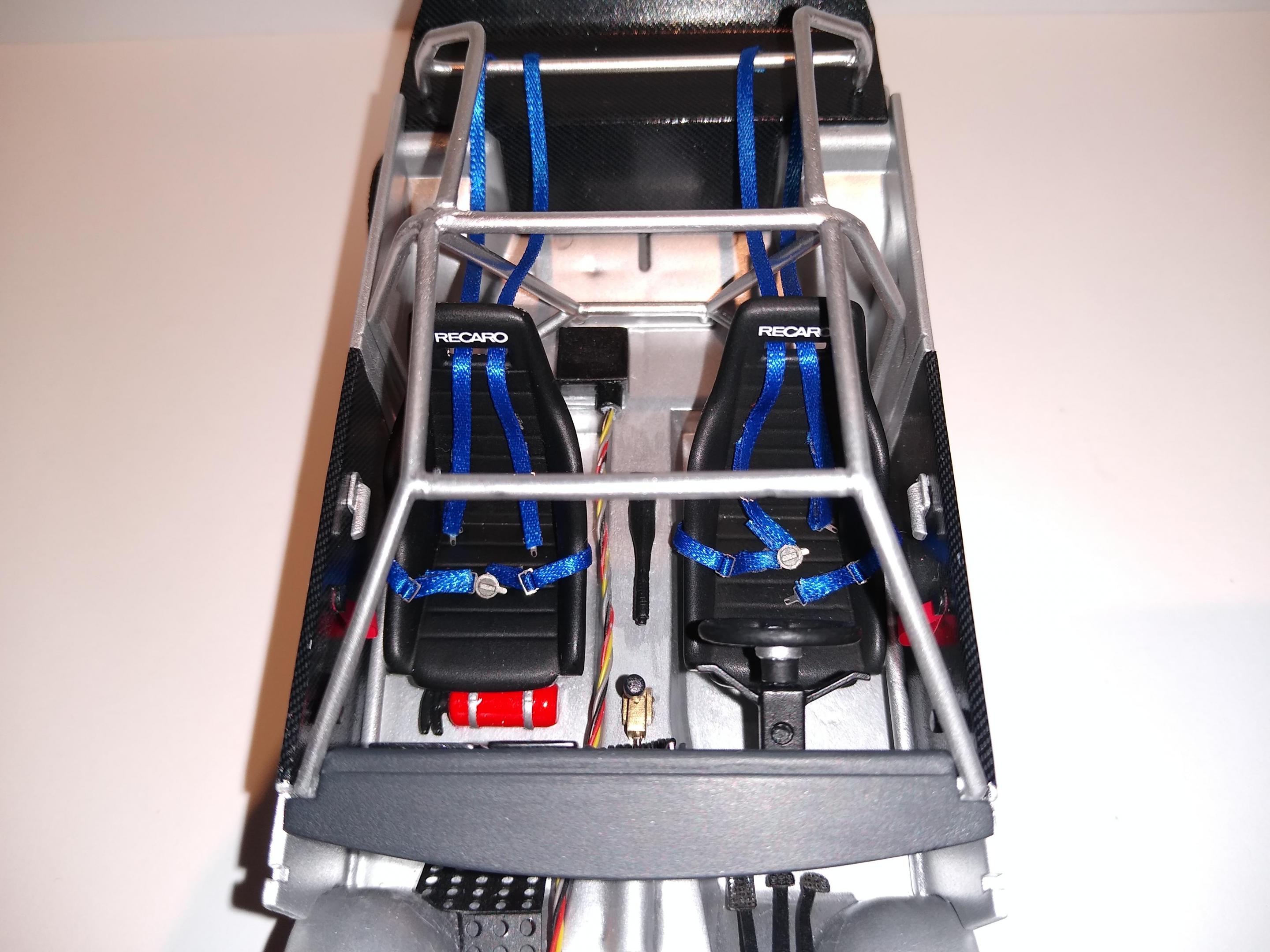 Bit of progress made, plus a whole lot of ground re-traced. The short story is that I had to buy a second kit and redo the body from scratch...? If anyone reading ever does this kit, my advice is to treat the side vents with maximum care!! Anyway, shell #2 is now ready for a clear coat: The colour is Tamiya light gunmetal, which I am a new fan of, and while #2 is an improvement over the first one, MANY hours have disappeared in the process! Still, second kits always bring small luxuries so I can now show a side by side comparison of the upgraded exhaust tips (badass) next to the kit ones (lame): I think all the interior components are complete now so I've started assembling: The co-driver footplate was in the PE kit. I made a junction box to terminate the wiring harness so I don't have to think about where it all goes afterwards! The last interior element has been the door cards: (Before & after courtesy of the new kit again!) Because the plan is to have open front windows, I thought I'd add some extra rally detail & have carbon fibre door cards. I didn't fancy laying decals over the existing door furniture so I stripped & filled them to leave a flat surface. I scratch built oversized "brushed aluminium" levers, plus some "nylon" racing door pulls using the seatbelt material supplied in separate Hasegawa rally car kit. Thanks for looking ?