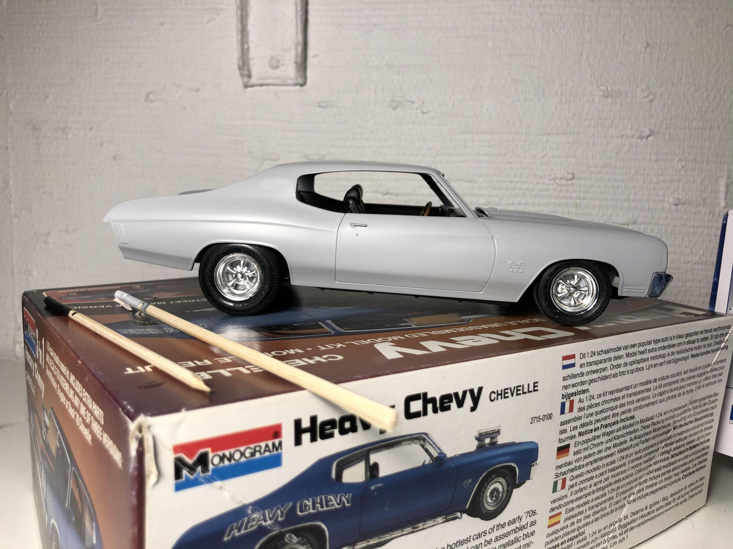 So I got this from Tradera, Swedish eBay real cheap with a missing motor and some parts, no wheels and tires. It’s the Monogram Heavy Chevy Chevelle so it’s a low parts count model to begin with. Plan is to slap it together. Partsbox wheels, tires and some other bits and pieces.