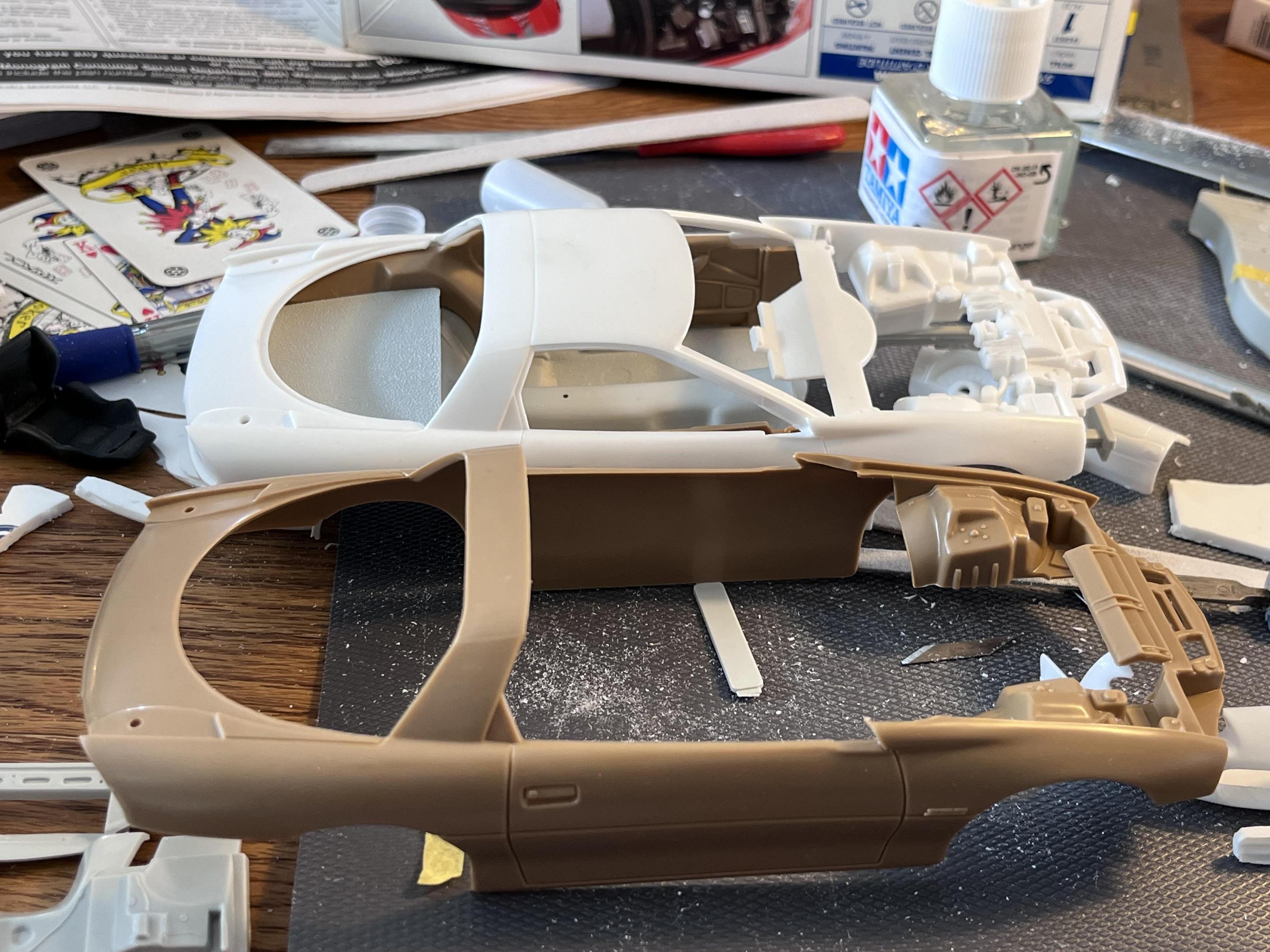 So I have had an idea to make a replica of the Camaro that I imported to Sweden from CA back in 2009. And this week I got hacking on it. I wanted to make at top as I had so I had purchased a ‘93 amt to kit bash to make the best ‘98 I could. I first started by hacking out the grill with a 10 blade so I can replicate my one that only had the uruthane bumper and a polished grill so the plastic grill insert had to go. next up was the t tops which meant hacking up both the ‘93 and the ‘98. Make a new reinforcement piece to replicate the 1:1. I decided to keep the revell windscreen due to the wipers on the amt was molded to the glass. I will be using the amt chassi and most part of the interior since it’s more accurate in my opinion with the sail panels and speakers.