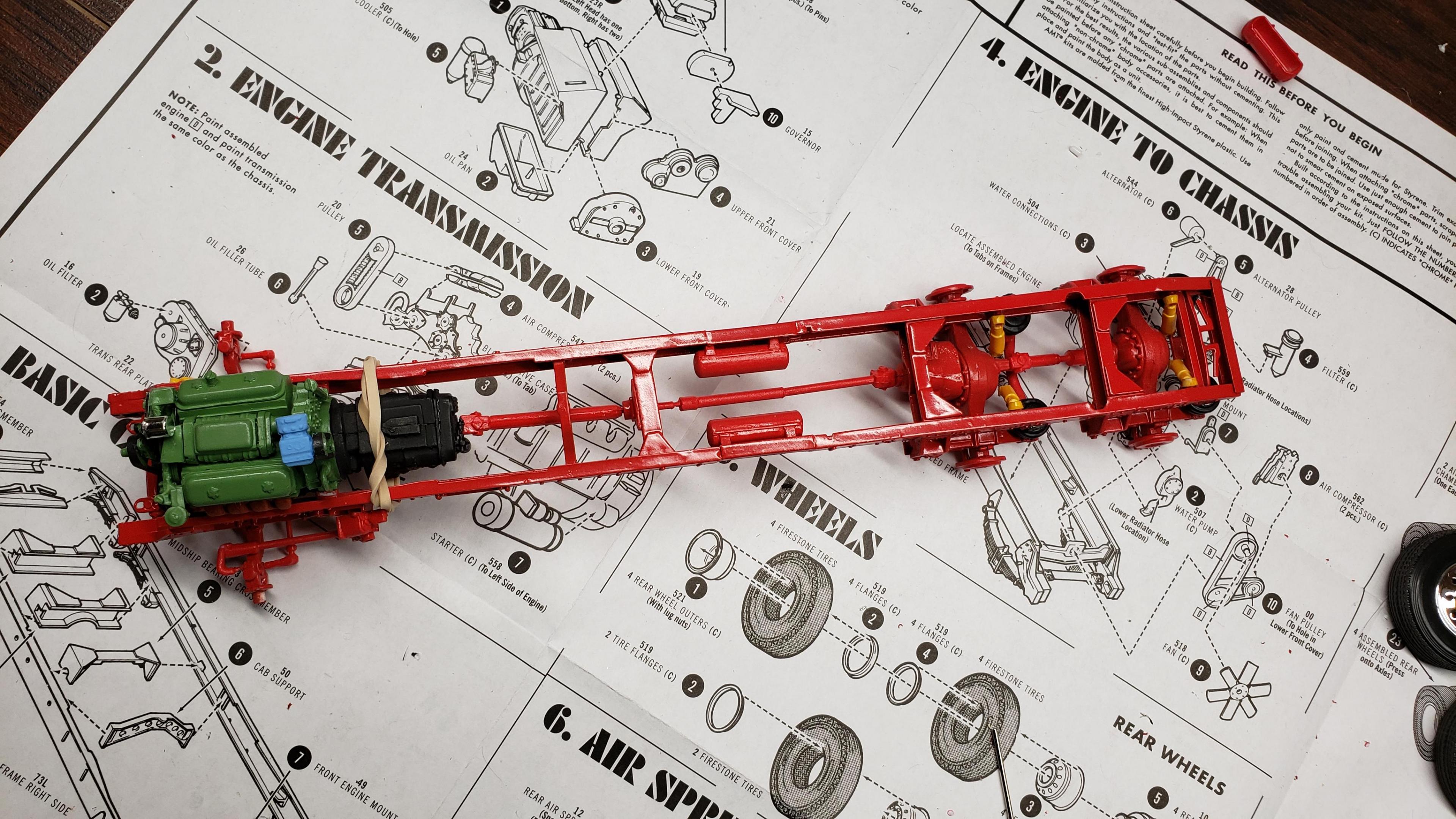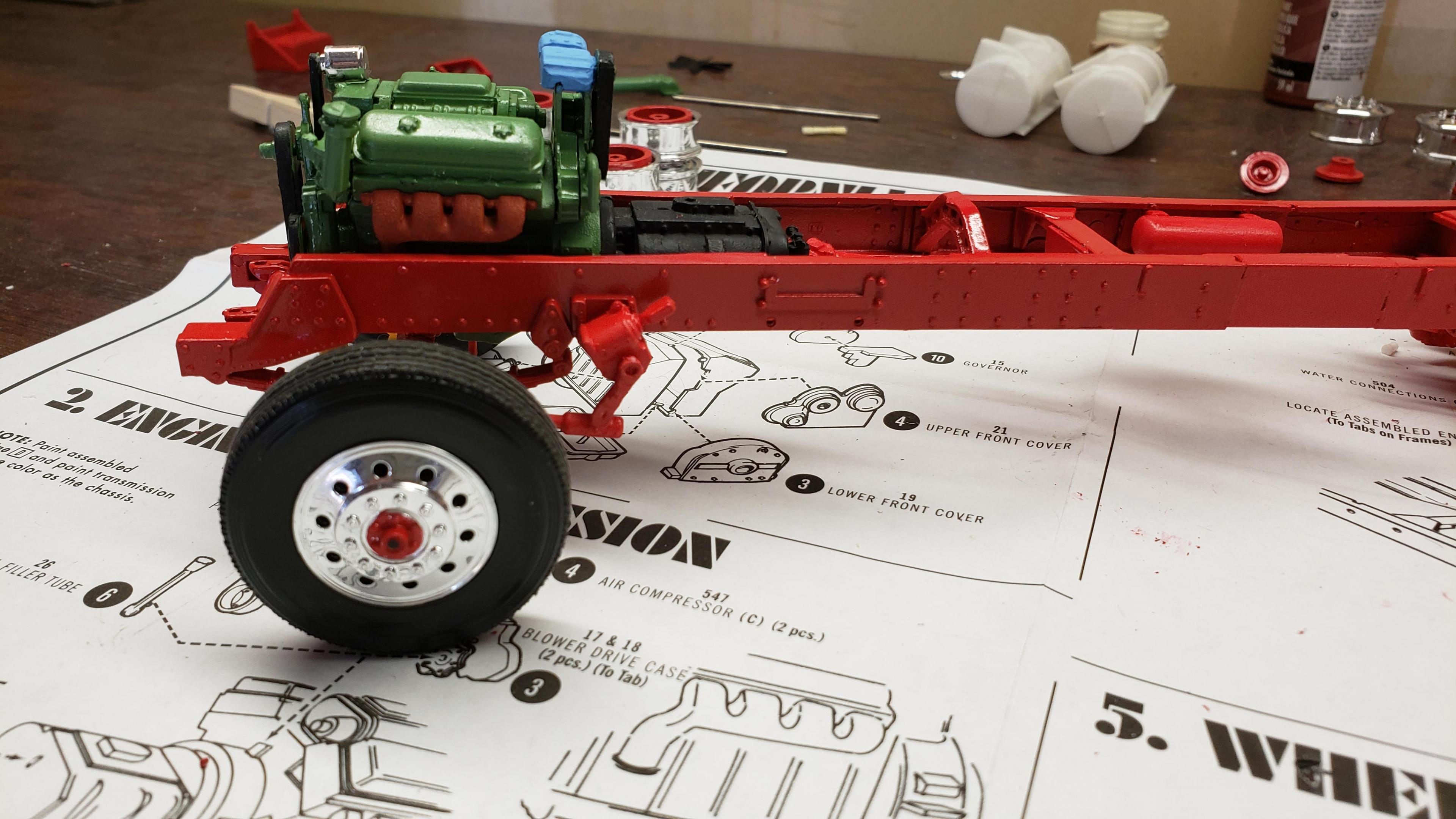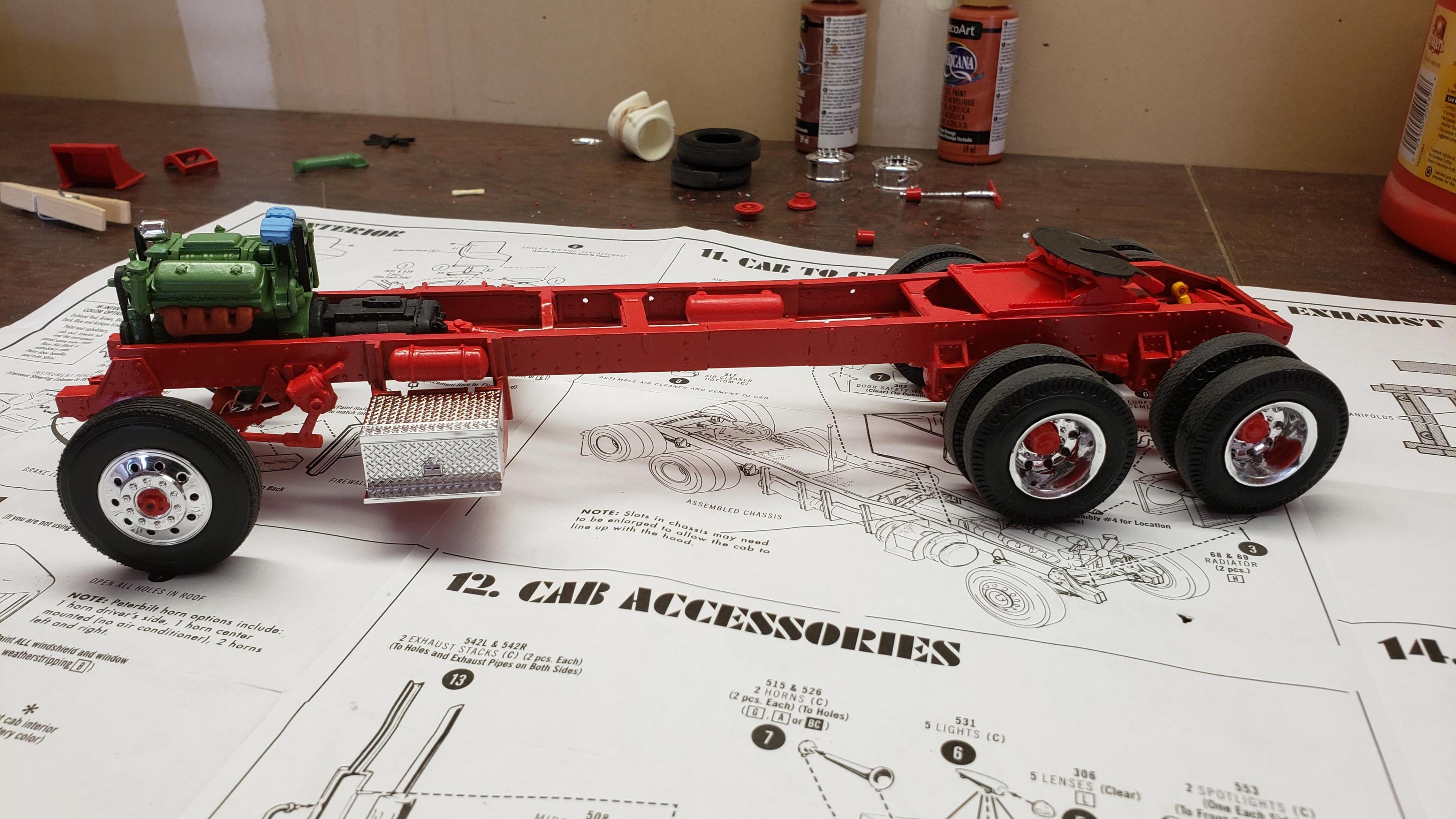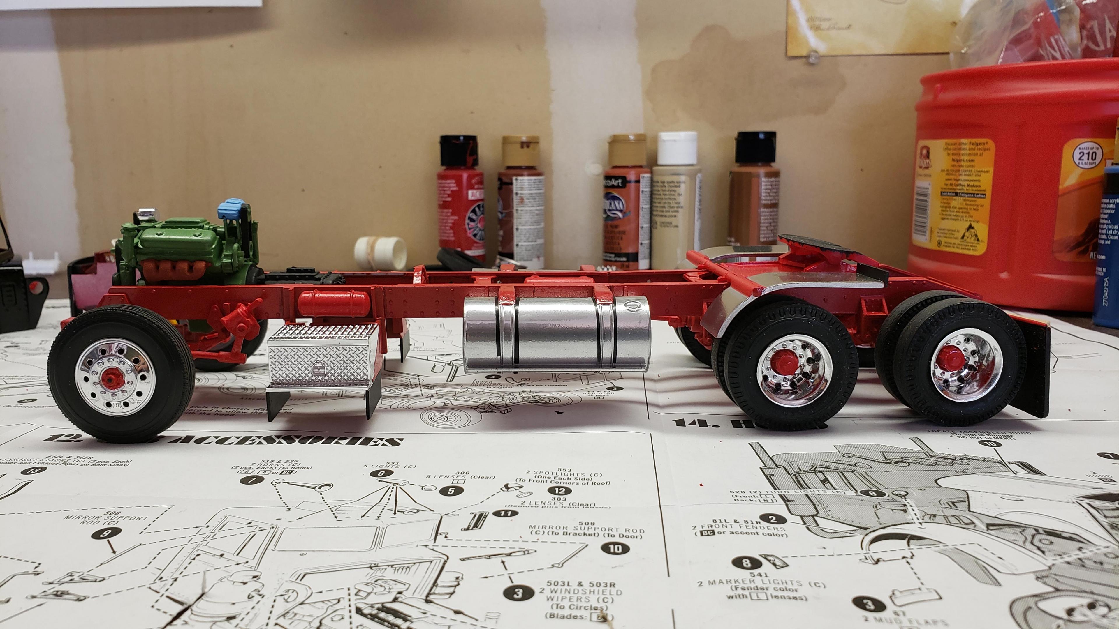 I've started to build the most recent release of the Round 2 359. First, a few things about the kit. I've built AMT kits before, and the kit is just as I expected. These molds are old, and there's lots of flash, seams, mutant parts, etc. Pieces don't fit together. I was surprised that it did not include the sleeper, but not a big deal, since I'm building a daycab anyways. But I'm very disappointed that there is no visor. I'm guessing the visor is on the sleeper parts tree. Anyways, I got to work on the engine and chassis. I started by stretching the frame, 2' in scale This is my first time building the detroit, it went together ok I painted the chassis, and mounted the engine I relocated the air tanks inside the frame, as I will be using longer fuel tanks on both sides I don't like the rounded look of the older style front wheels with the rings, so I decided to use snap wheels from the parts box They didn't quite match up to the axle the right way, so I wound up making bushings from styrene rod to attach them to the axle and have them at the correct width