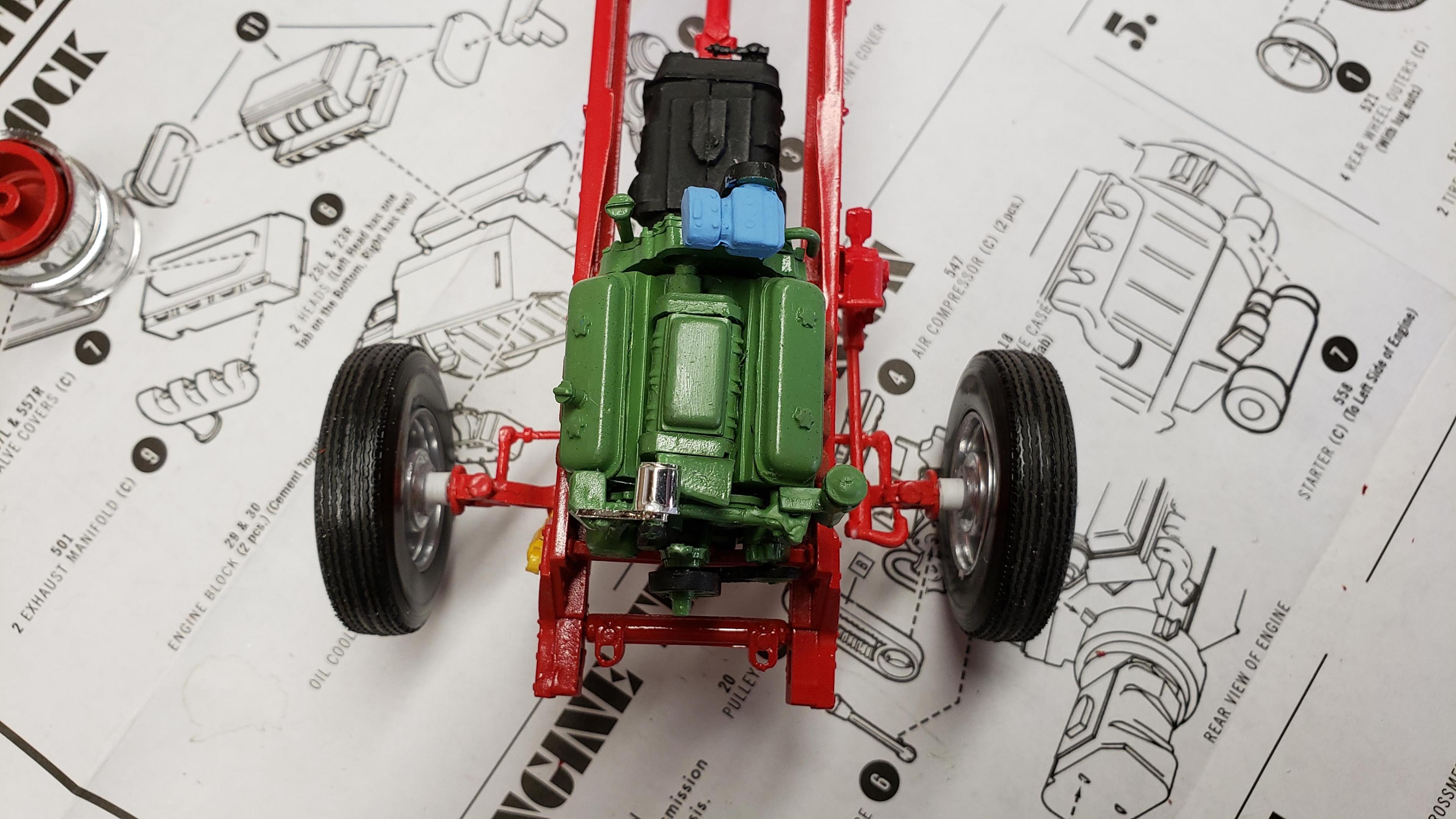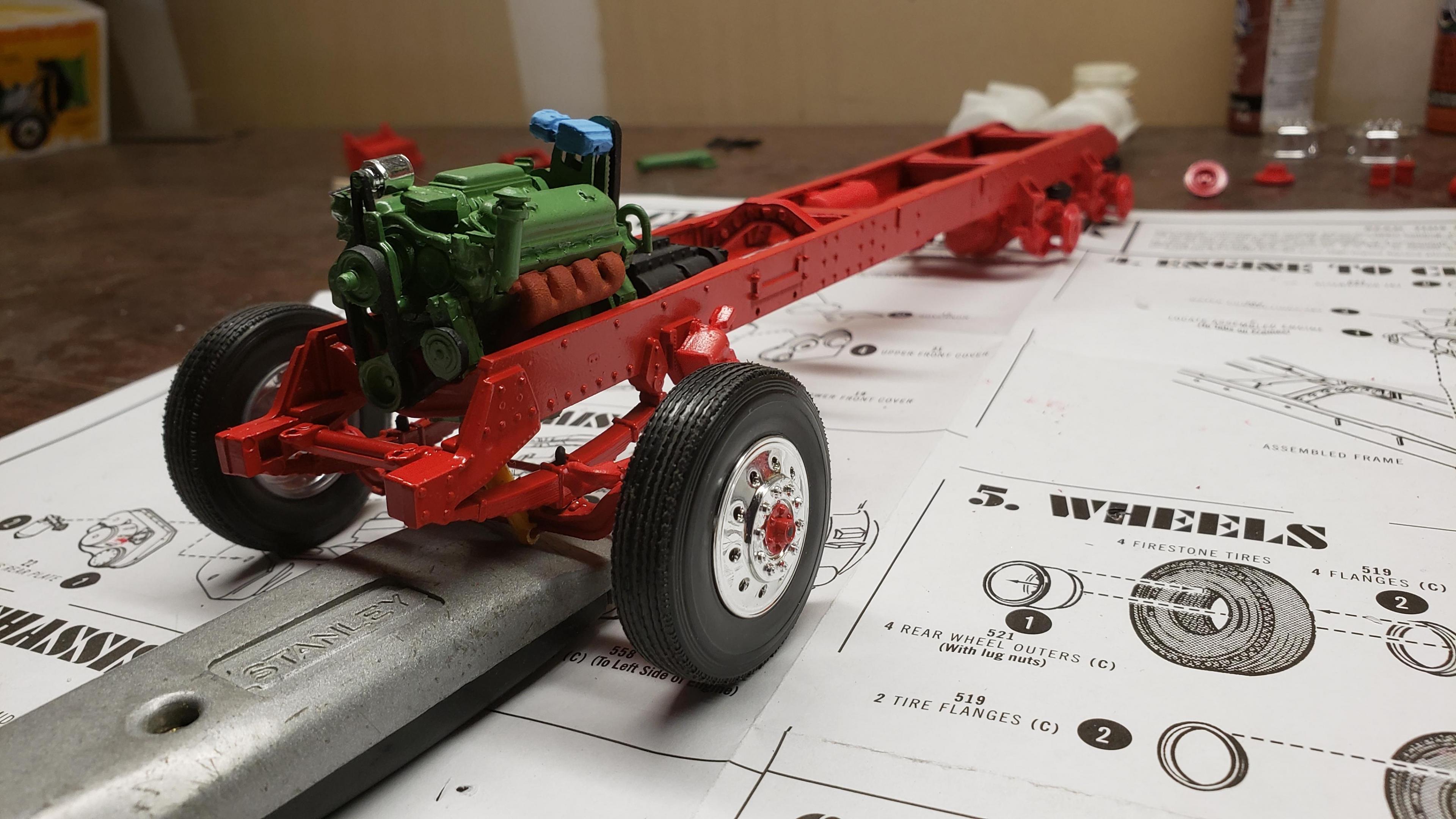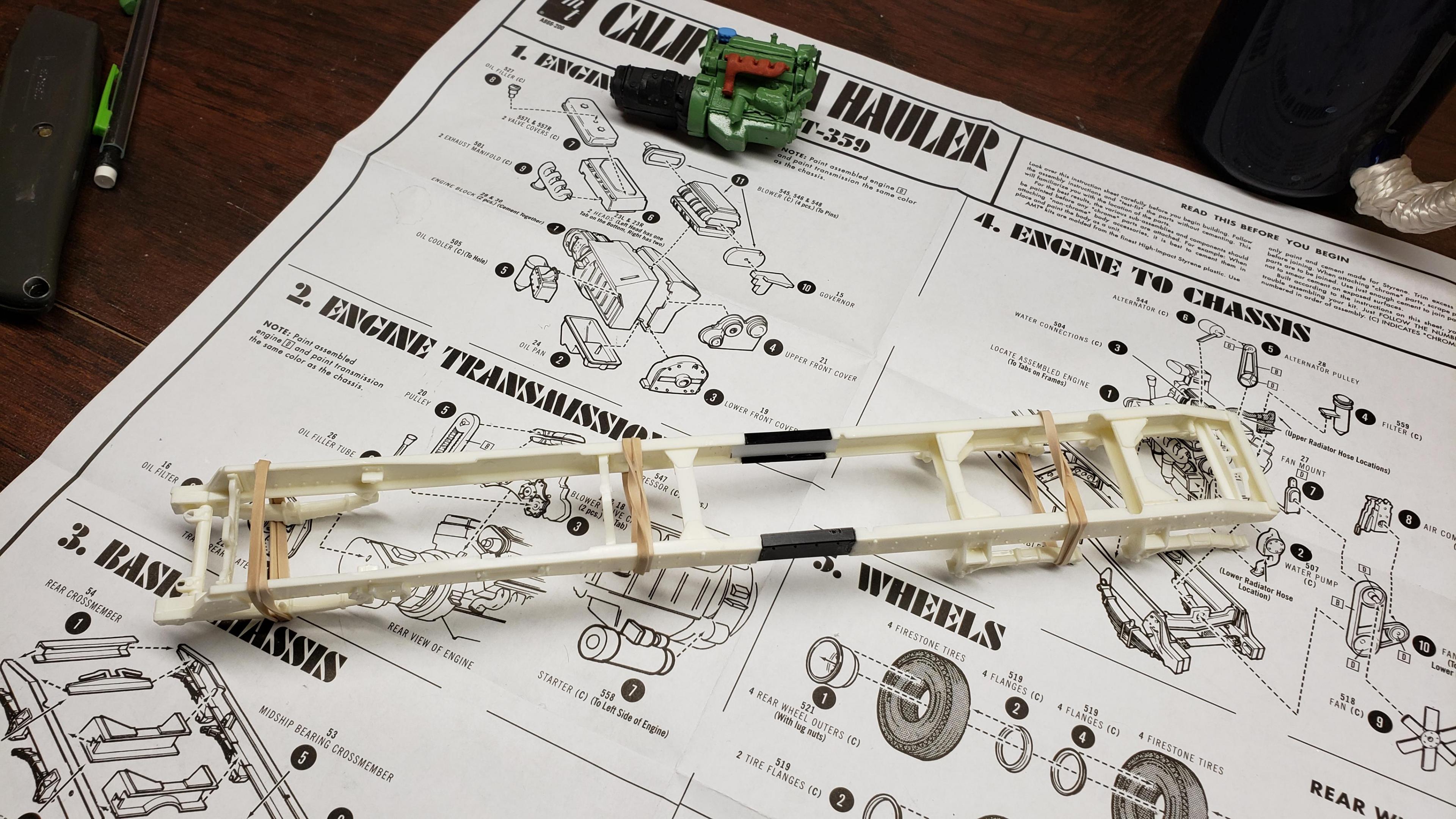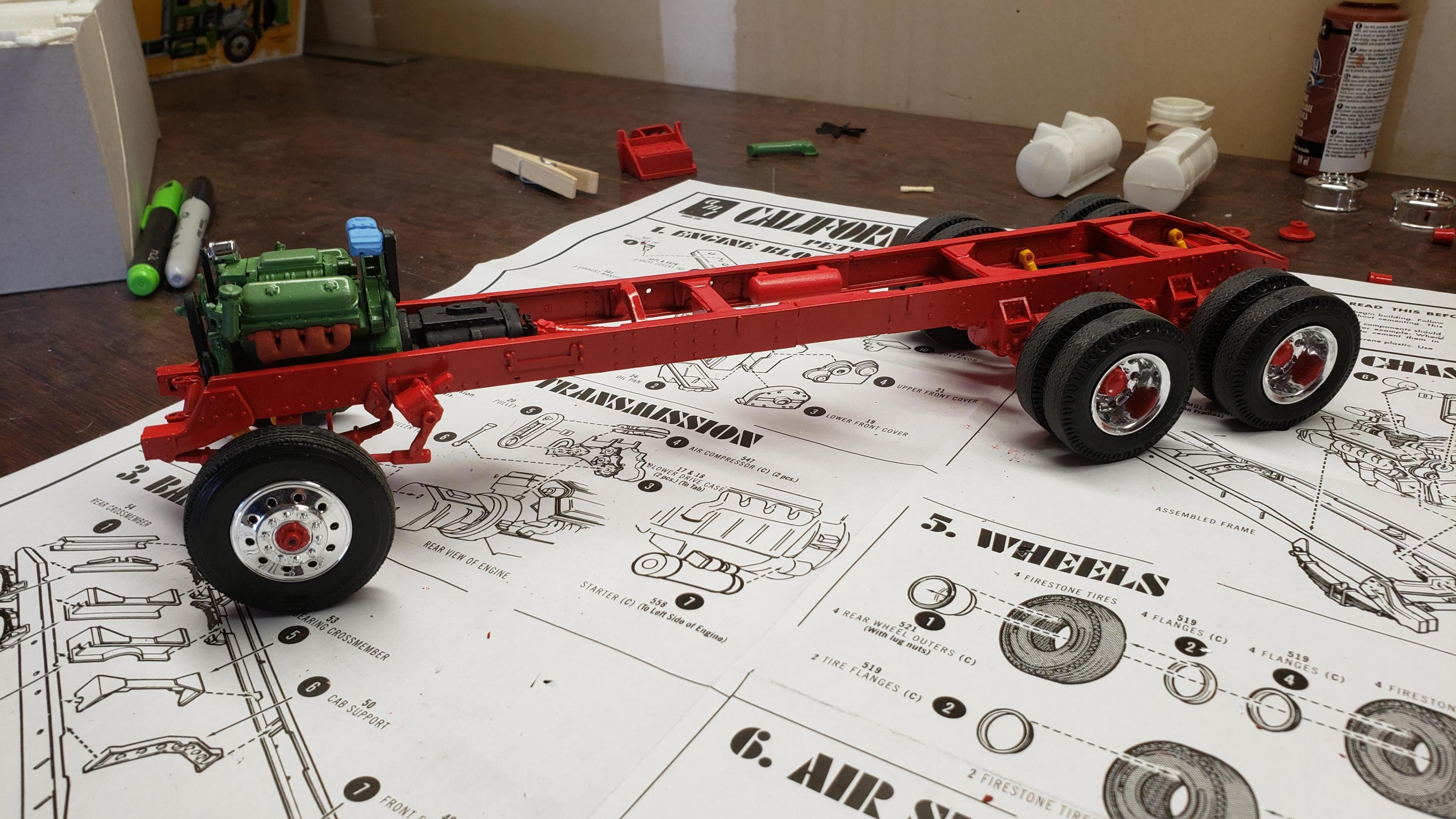 I've started to build the most recent release of the Round 2 359. First, a few things about the kit. I've built AMT kits before, and the kit is just as I expected. These molds are old, and there's lots of flash, seams, mutant parts, etc. Pieces don't fit together. I was surprised that it did not include the sleeper, but not a big deal, since I'm building a daycab anyways. But I'm very disappointed that there is no visor. I'm guessing the visor is on the sleeper parts tree. Anyways, I got to work on the engine and chassis. I started by stretching the frame, 2' in scale This is my first time building the detroit, it went together ok I painted the chassis, and mounted the engine I relocated the air tanks inside the frame, as I will be using longer fuel tanks on both sides I don't like the rounded look of the older style front wheels with the rings, so I decided to use snap wheels from the parts box They didn't quite match up to the axle the right way, so I wound up making bushings from styrene rod to attach them to the axle and have them at the correct width