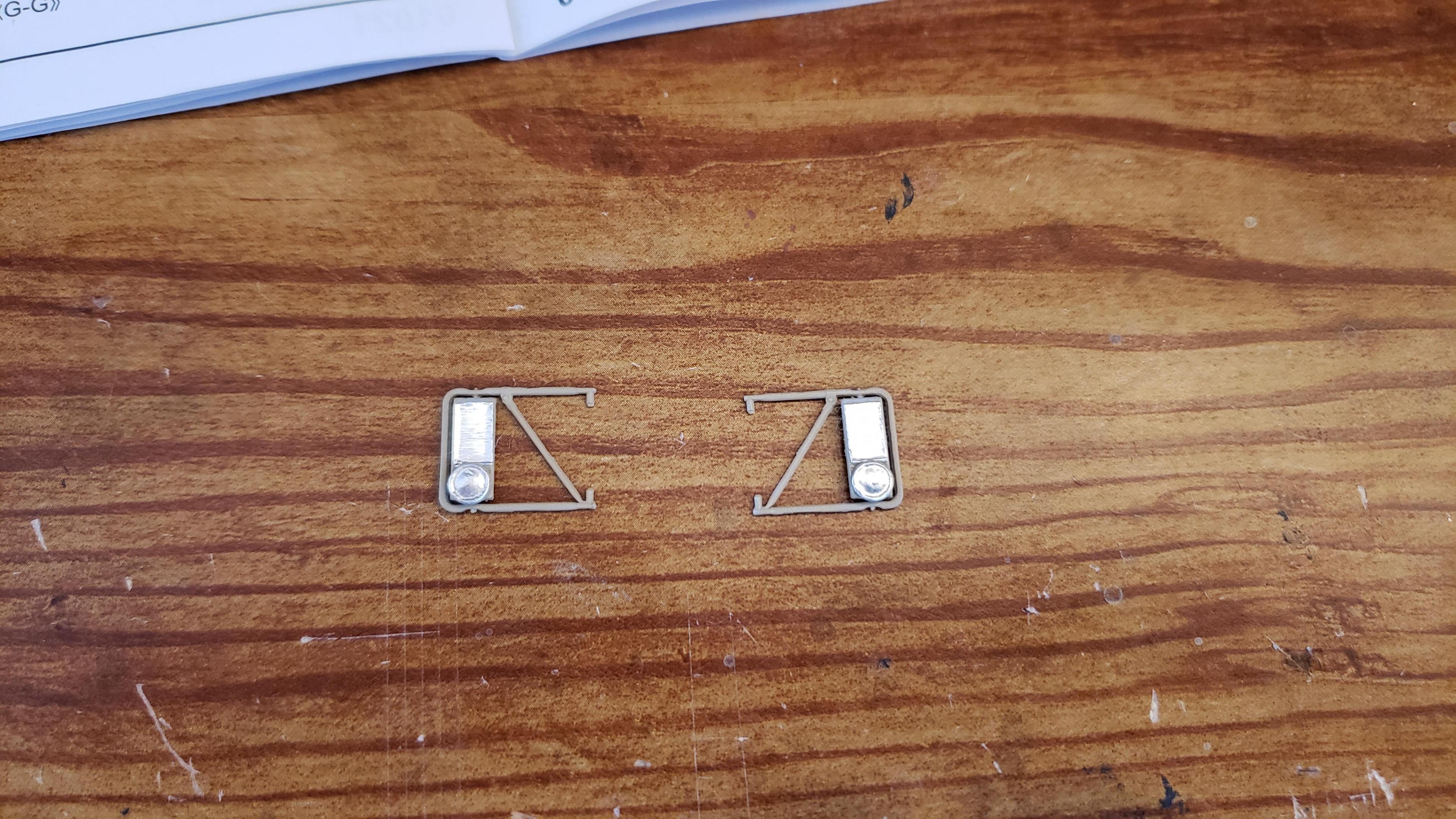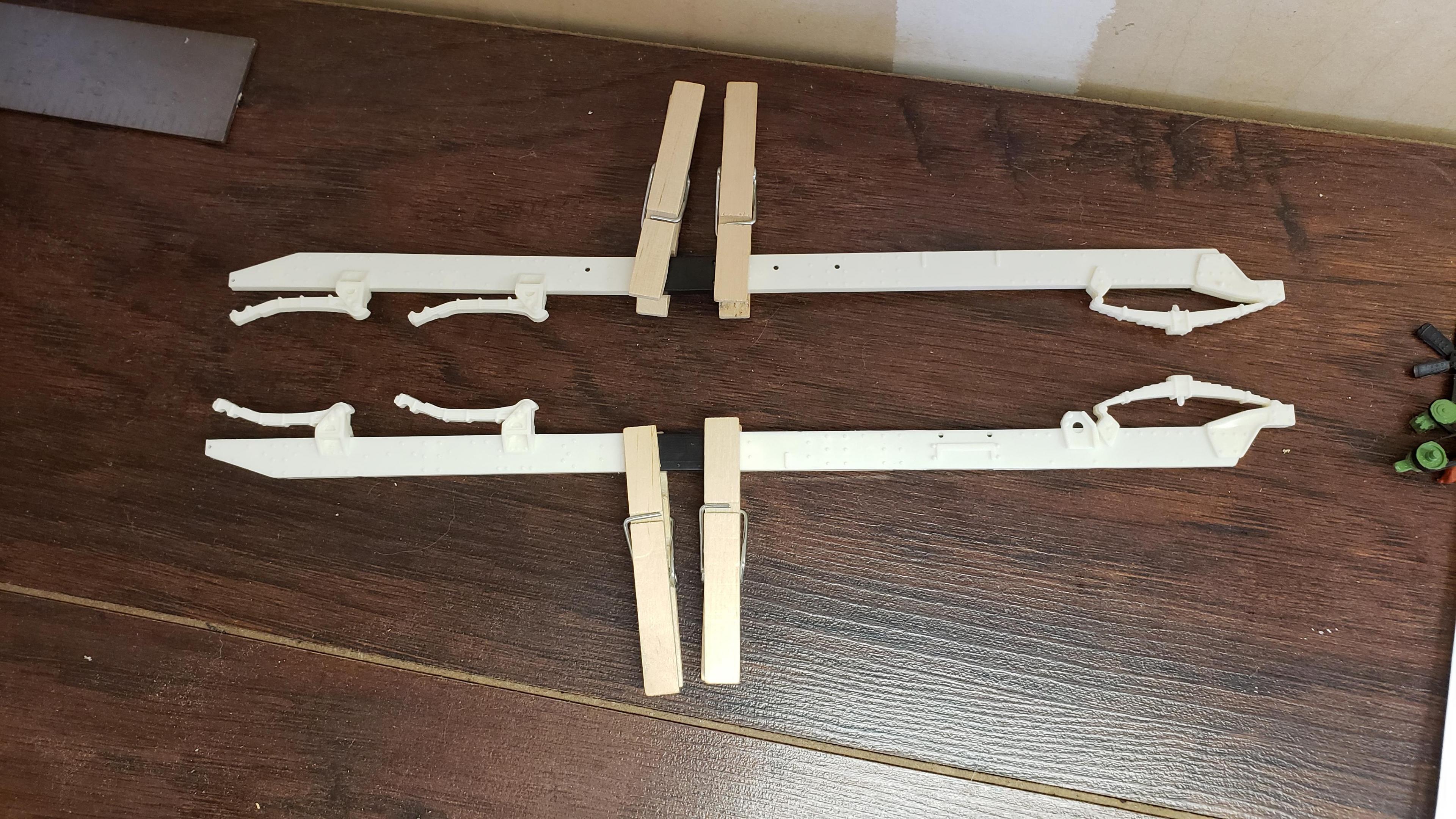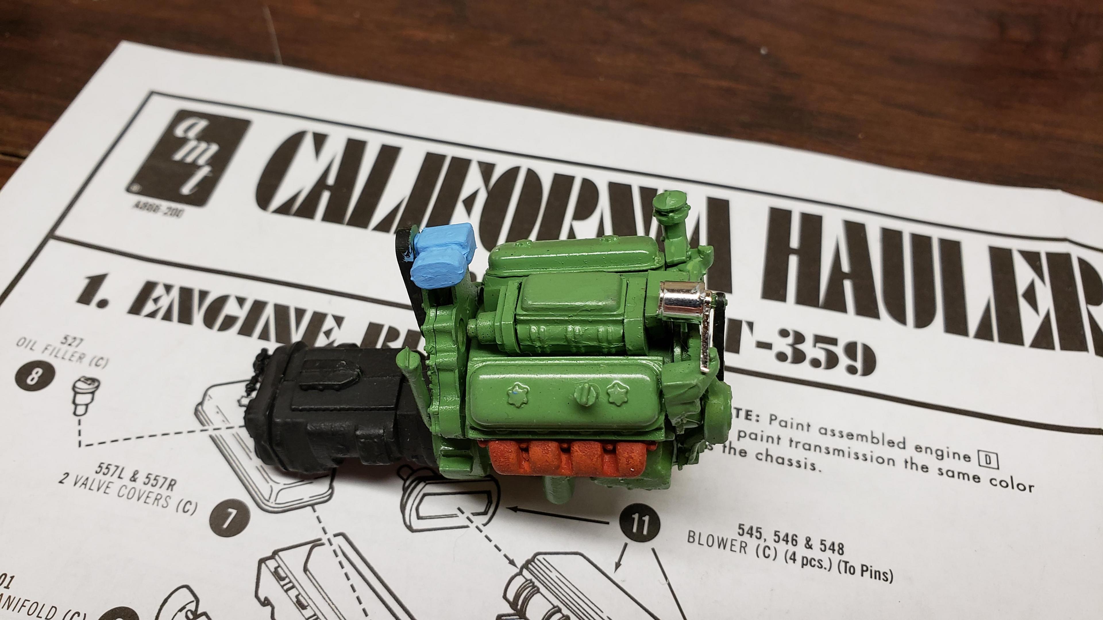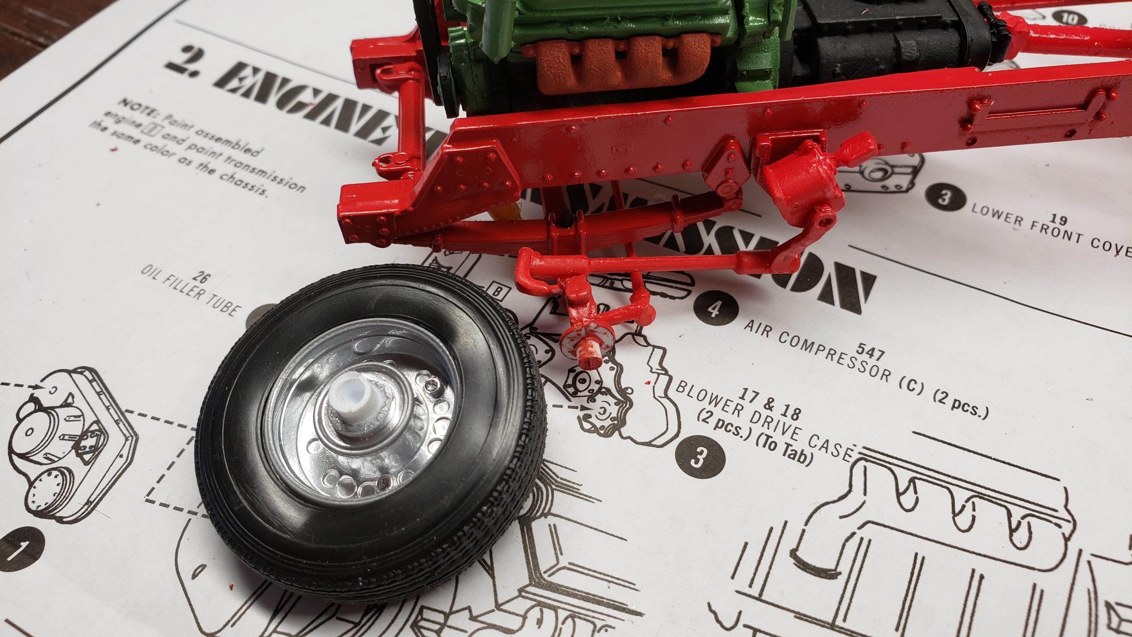 I've started to build the most recent release of the Round 2 359. First, a few things about the kit. I've built AMT kits before, and the kit is just as I expected. These molds are old, and there's lots of flash, seams, mutant parts, etc. Pieces don't fit together. I was surprised that it did not include the sleeper, but not a big deal, since I'm building a daycab anyways. But I'm very disappointed that there is no visor. I'm guessing the visor is on the sleeper parts tree. Anyways, I got to work on the engine and chassis. I started by stretching the frame, 2' in scale This is my first time building the detroit, it went together ok I painted the chassis, and mounted the engine I relocated the air tanks inside the frame, as I will be using longer fuel tanks on both sides I don't like the rounded look of the older style front wheels with the rings, so I decided to use snap wheels from the parts box They didn't quite match up to the axle the right way, so I wound up making bushings from styrene rod to attach them to the axle and have them at the correct width
