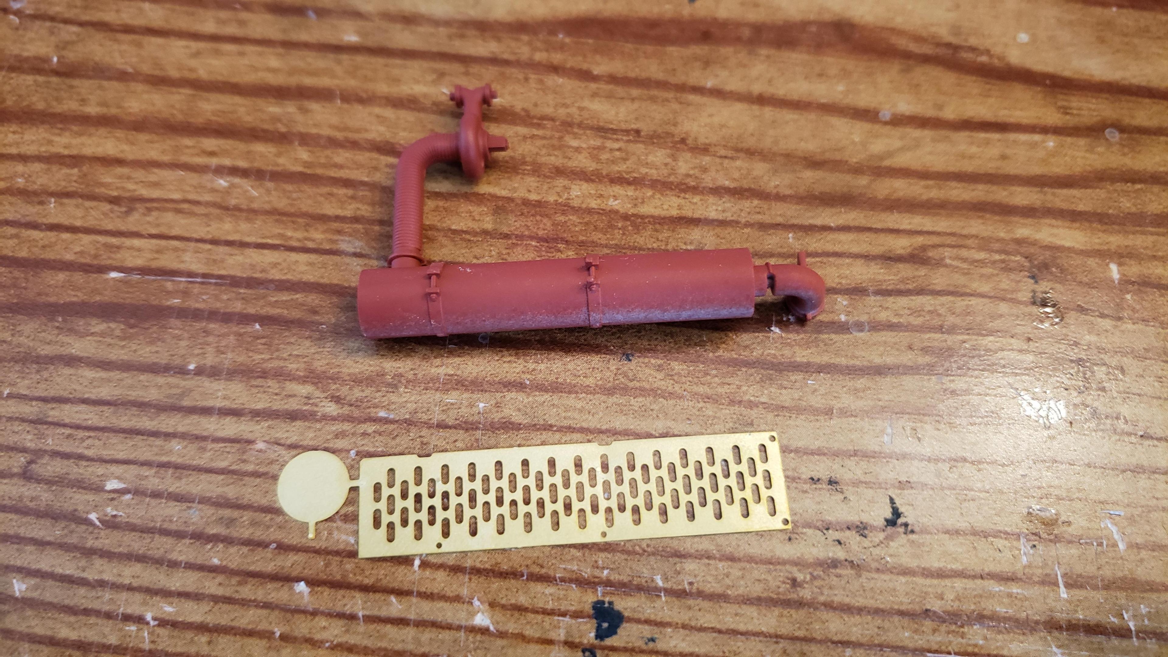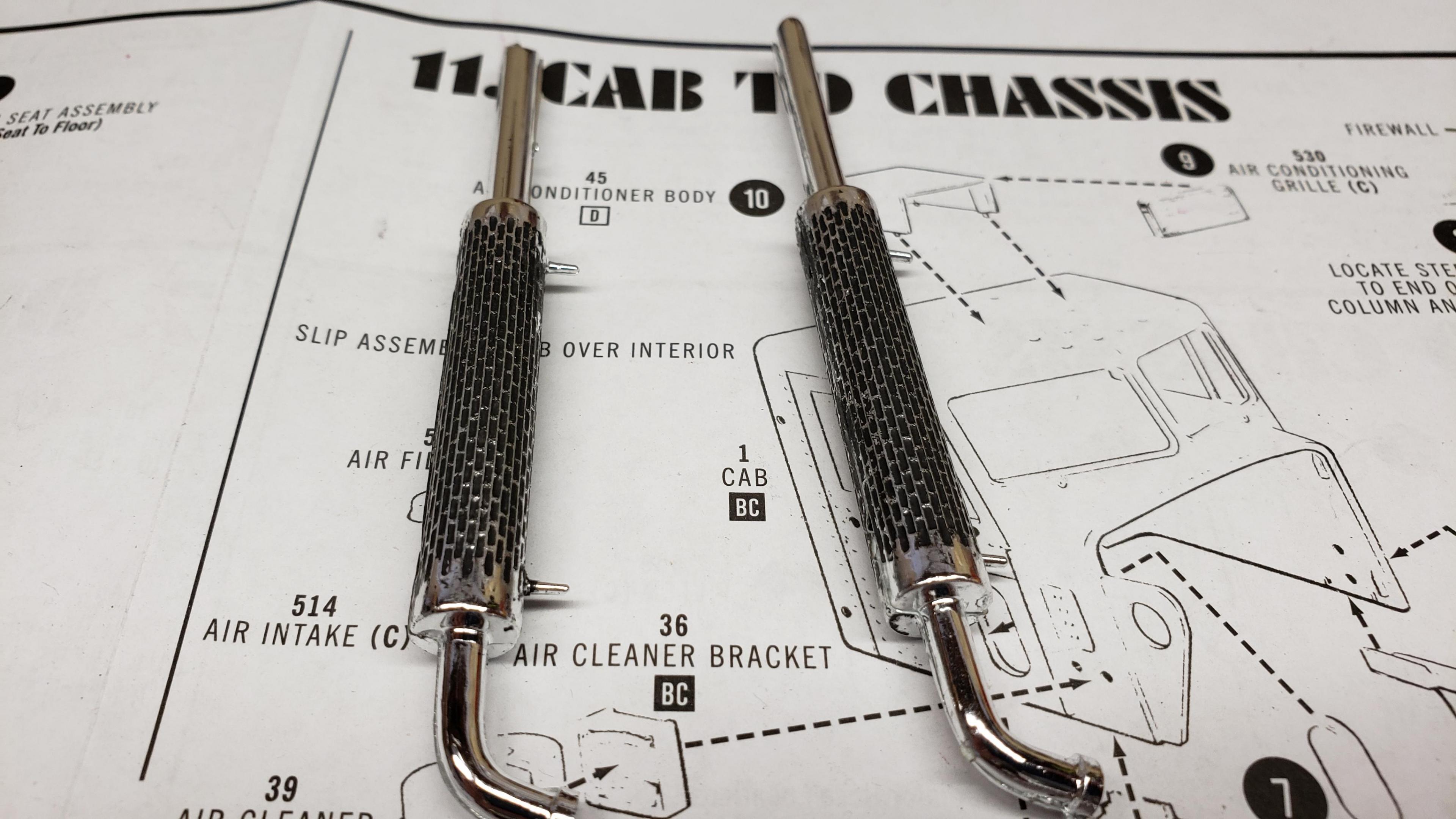 Some more progress... I cut out the air filter relief on the driver's side of the hood for the other air filter And I detailed the exhaust heat shields, I'll be using the taller stacks from the snap kit And a little mock up with the cab and hood just sitting in place I have the air intake piping all set up, but can't put it in place until I mount the cab. I like to do the decals before I mount it, since it's much easier. So I'm at a standstill until I get the decals which are on order. Thanks for looking