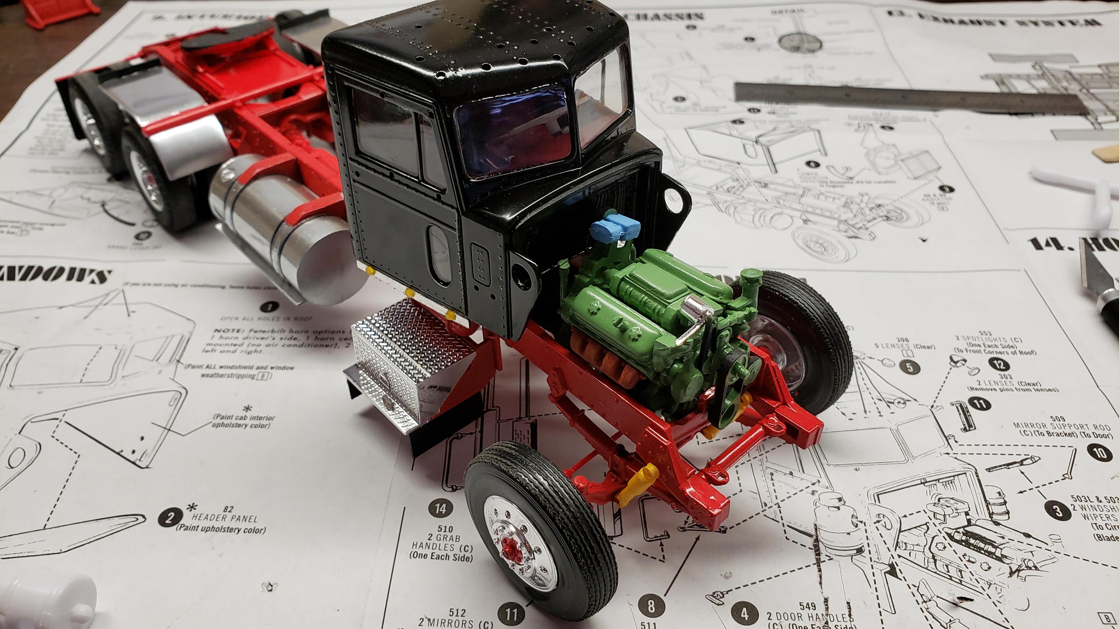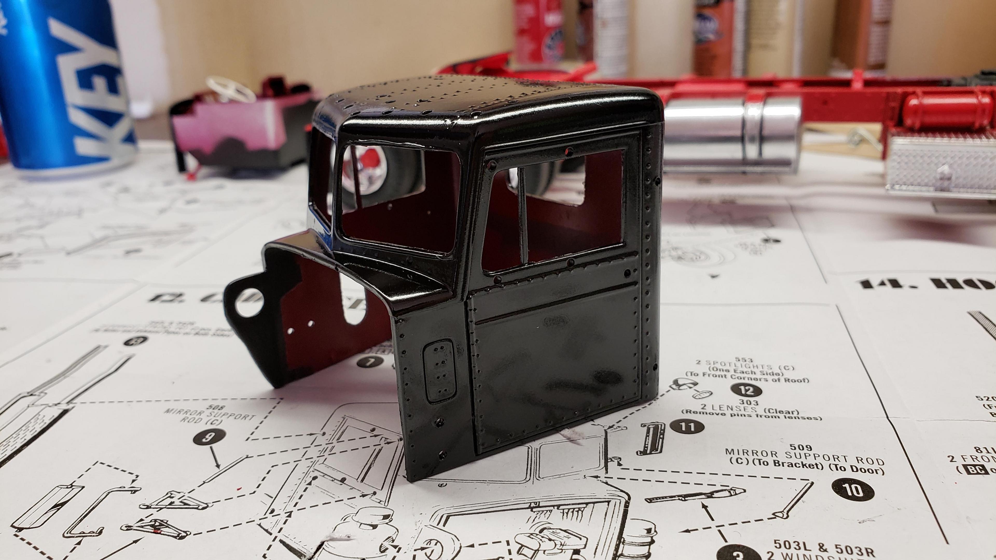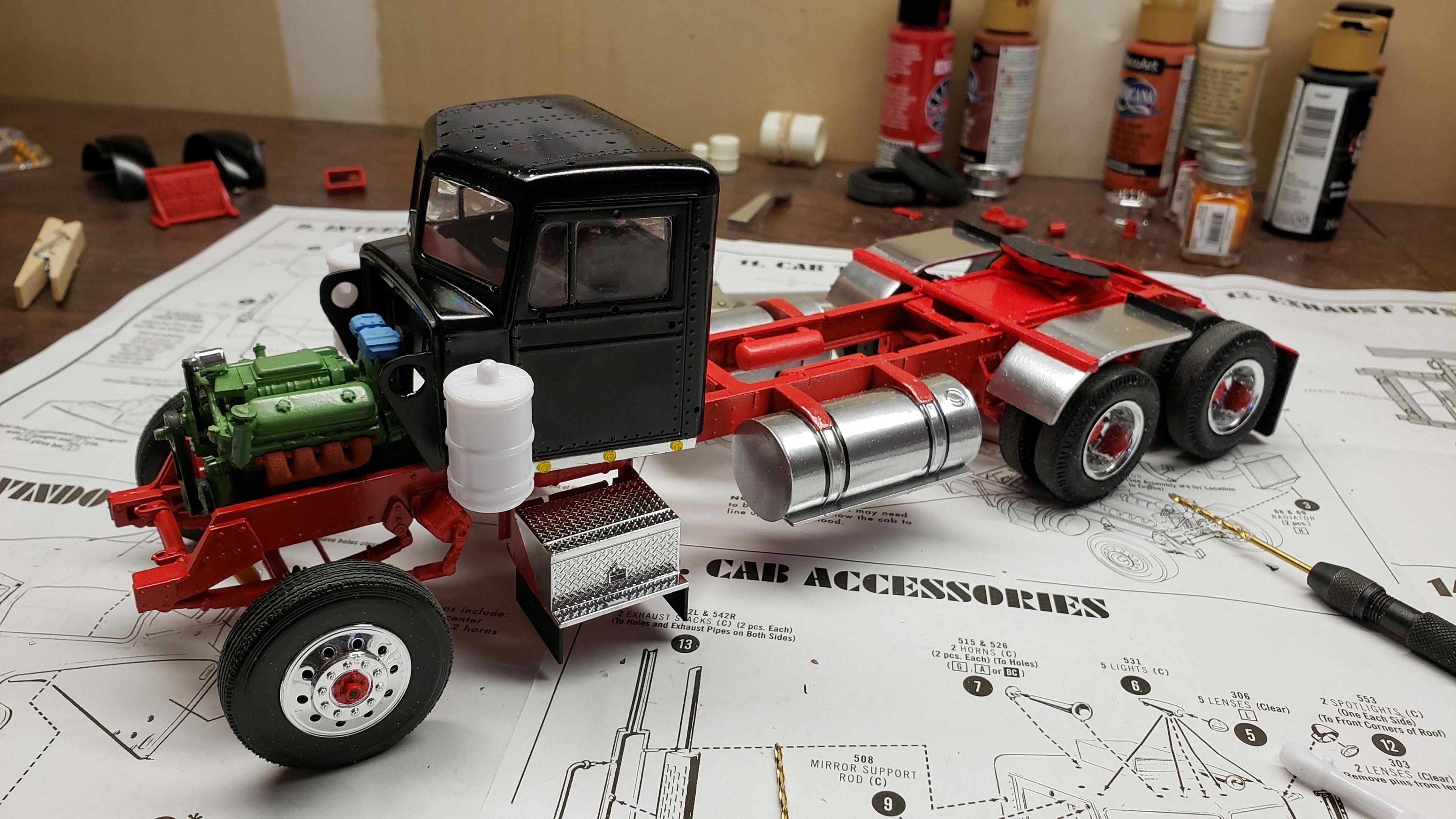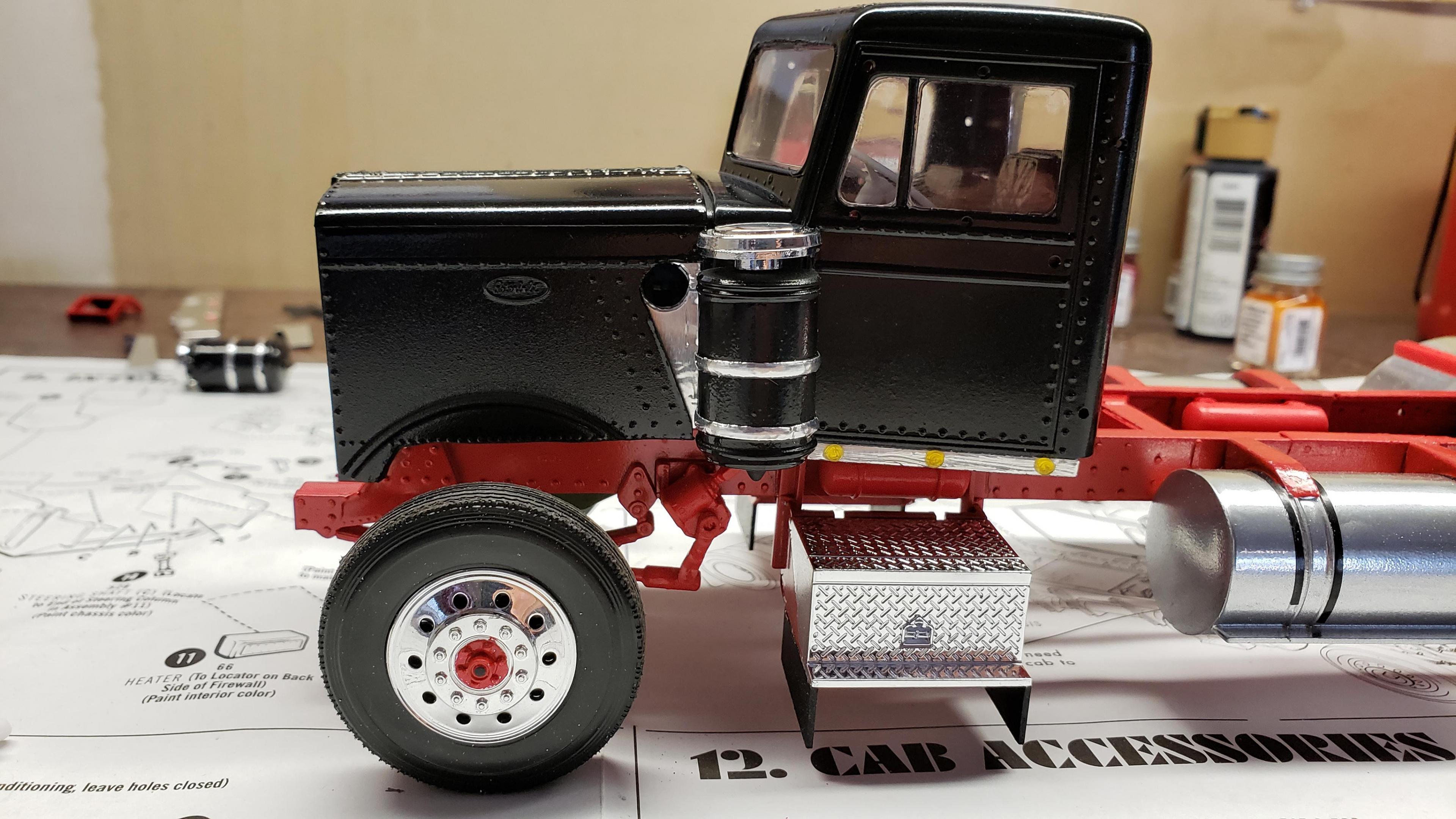 Some more progress here. I got the cab put together. I painted the doors, and applied a gloss clear coat. I can then apply the decals without the "silvering." I let the decals set, then applied a clear dull coat. I'm happy with the results. I also got the decals on the outside of the doors, and front of the cab I put together the muffler and heat shield A little more work on the cab and got it mounted. I made mirror lenses from metallic duct tape I put the glad hands on the back for the pintle hitch Started work on the platform And put the engine cover together Fuel tank and fenders on I just have the winch, 5th wheel, platforms and spare tire left