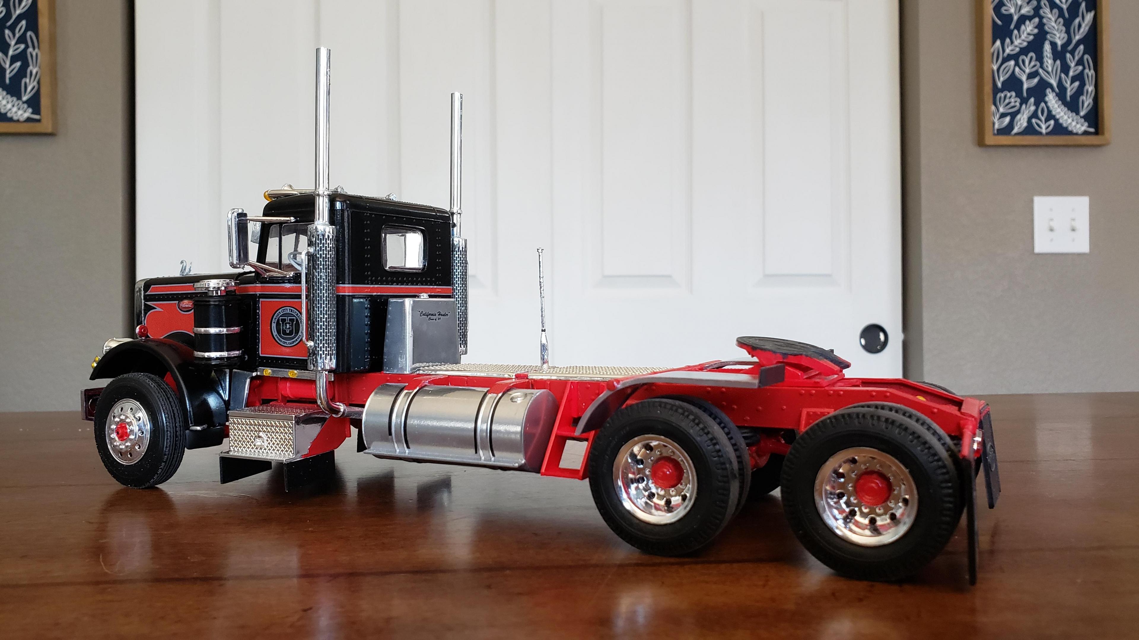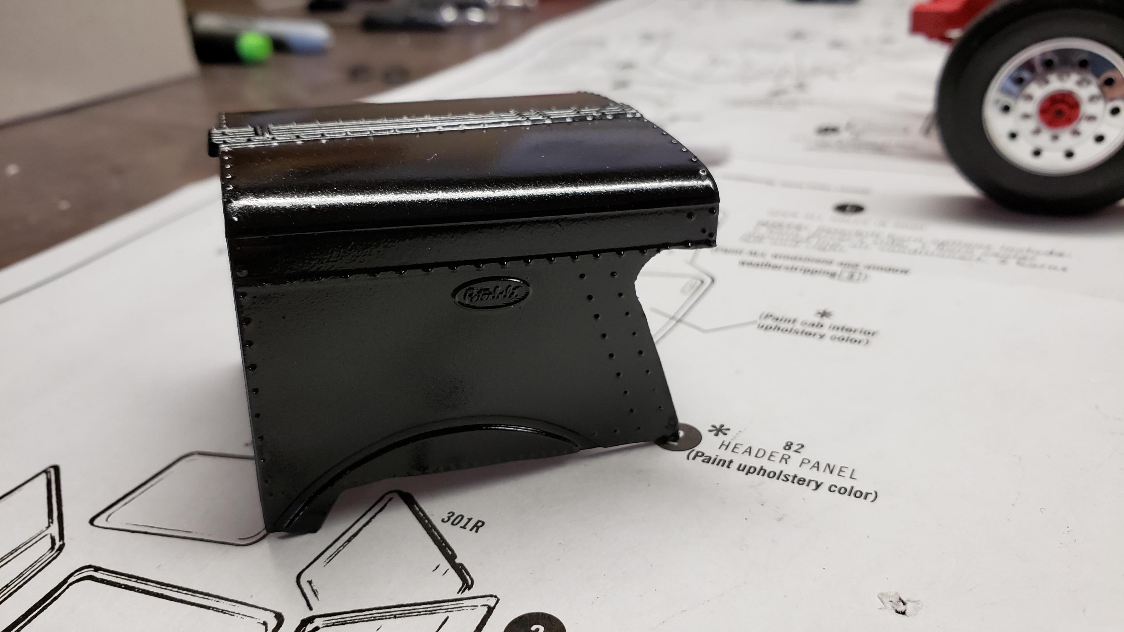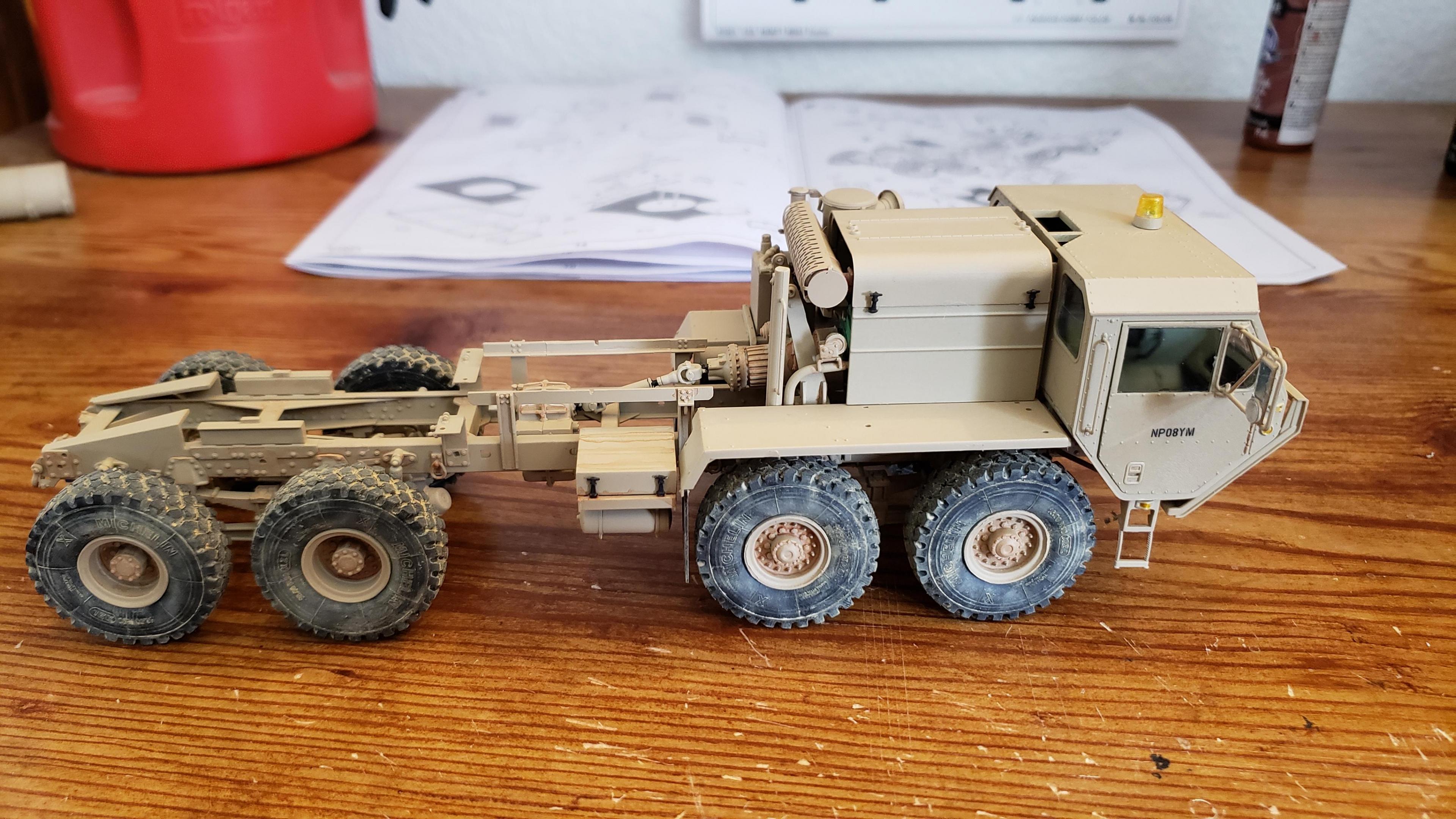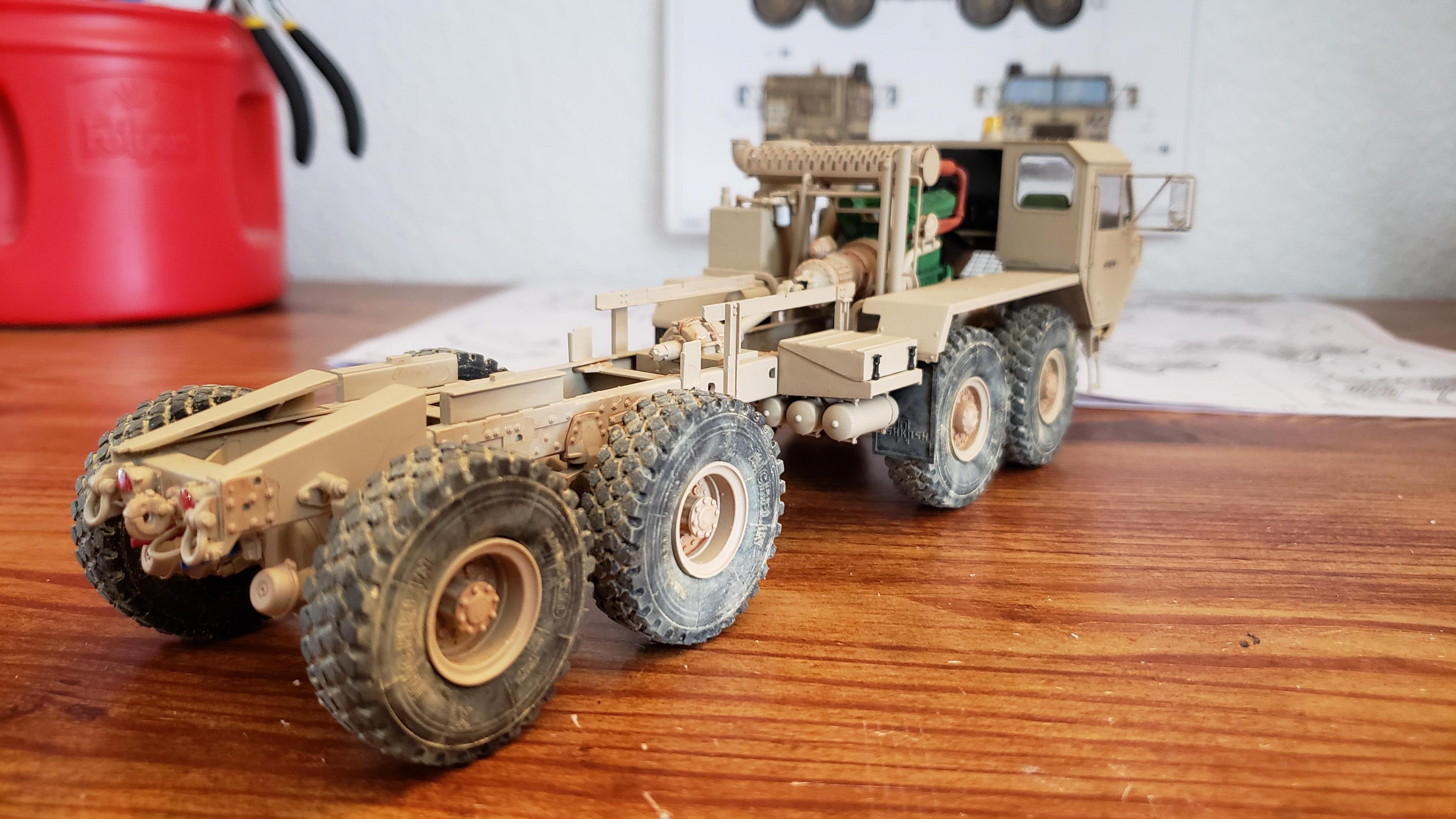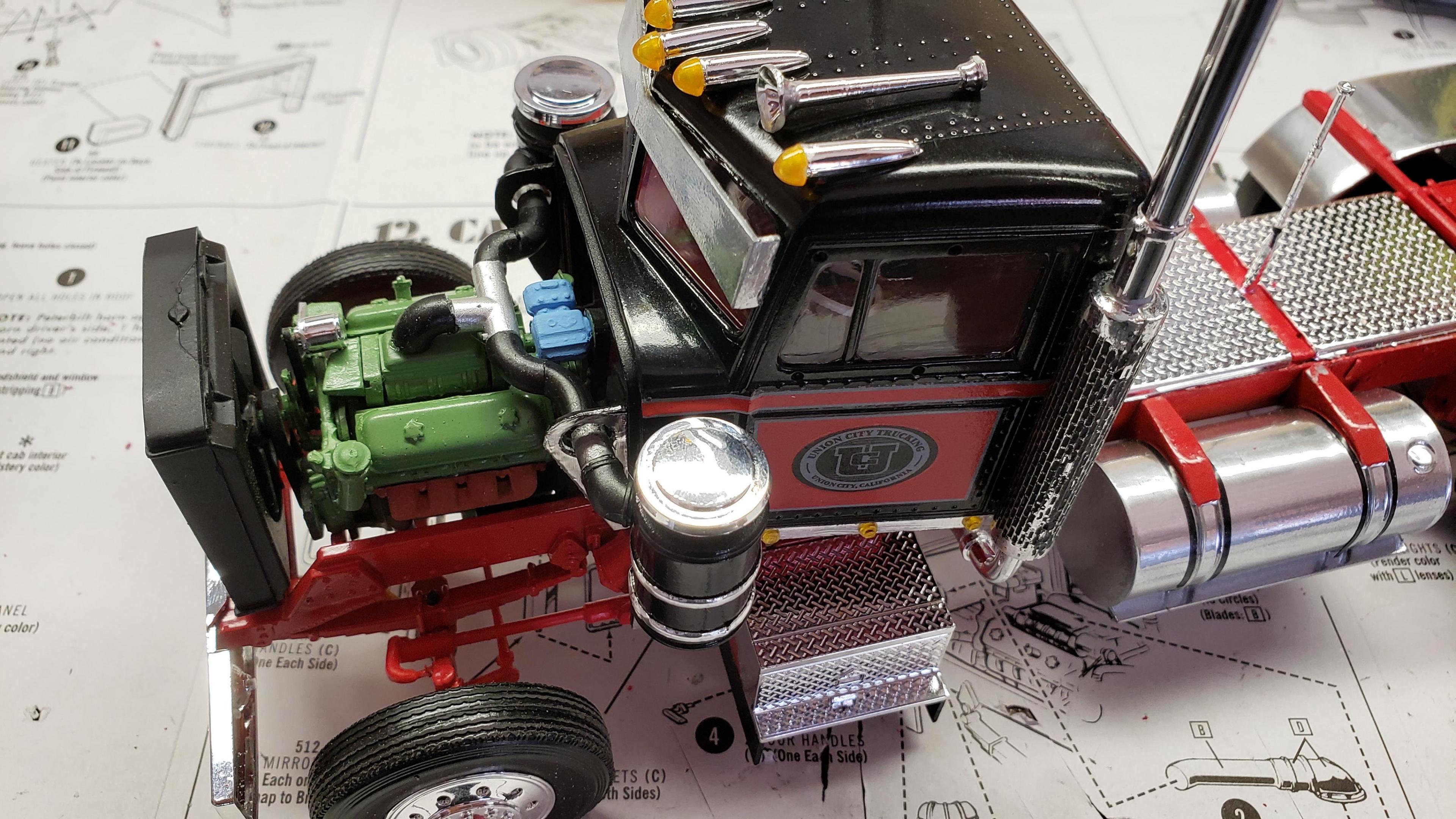 Some more progress here. I got the cab put together. I painted the doors, and applied a gloss clear coat. I can then apply the decals without the "silvering." I let the decals set, then applied a clear dull coat. I'm happy with the results. I also got the decals on the outside of the doors, and front of the cab I put together the muffler and heat shield A little more work on the cab and got it mounted. I made mirror lenses from metallic duct tape I put the glad hands on the back for the pintle hitch Started work on the platform And put the engine cover together Fuel tank and fenders on I just have the winch, 5th wheel, platforms and spare tire left