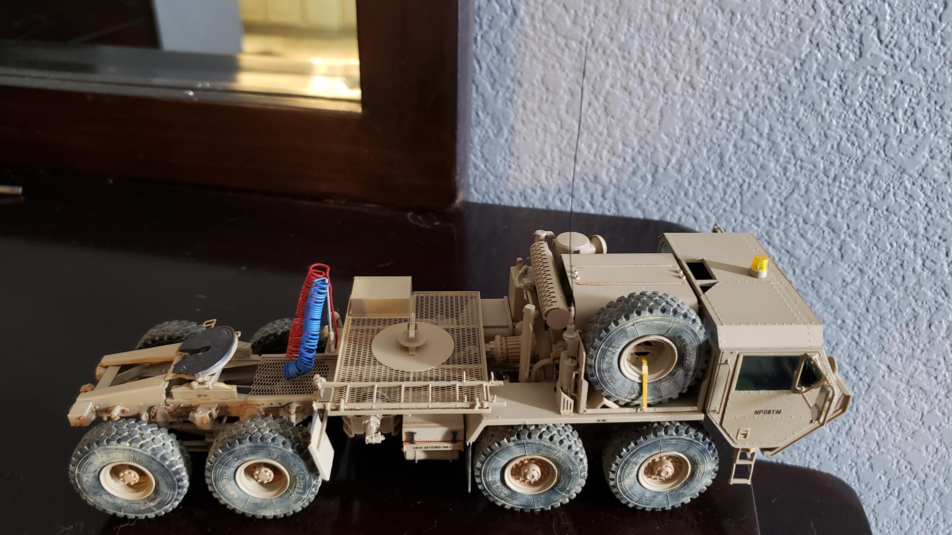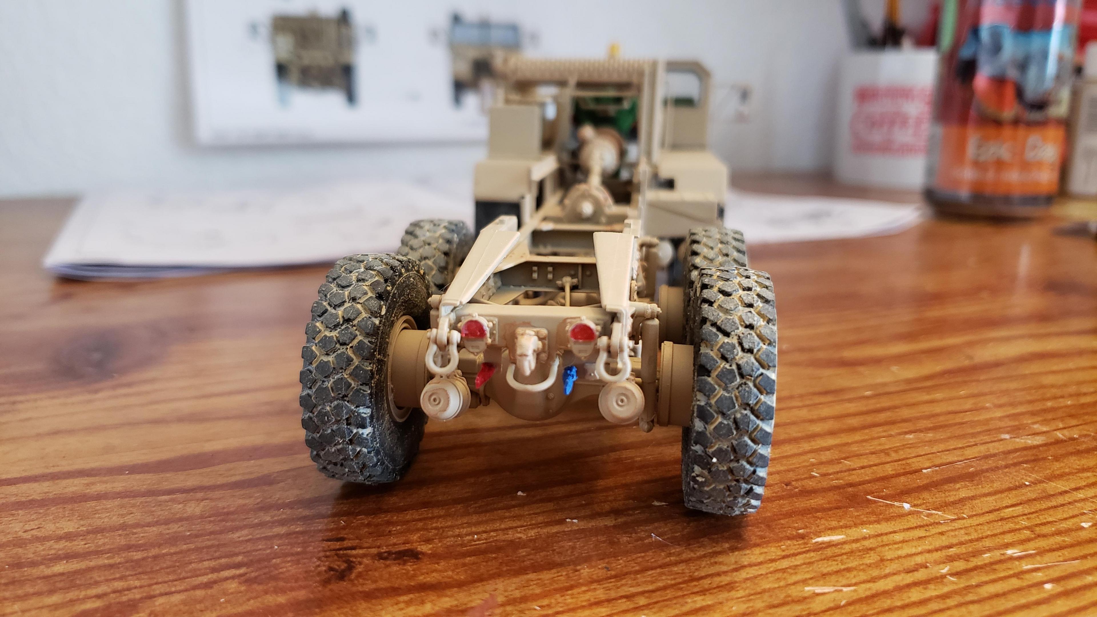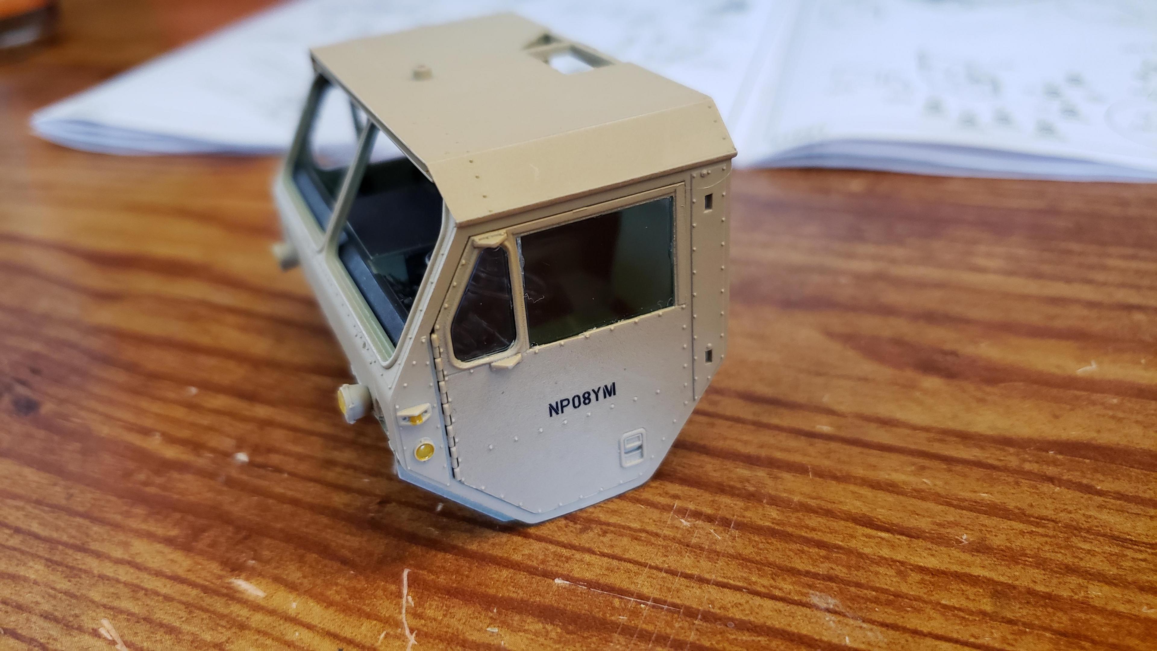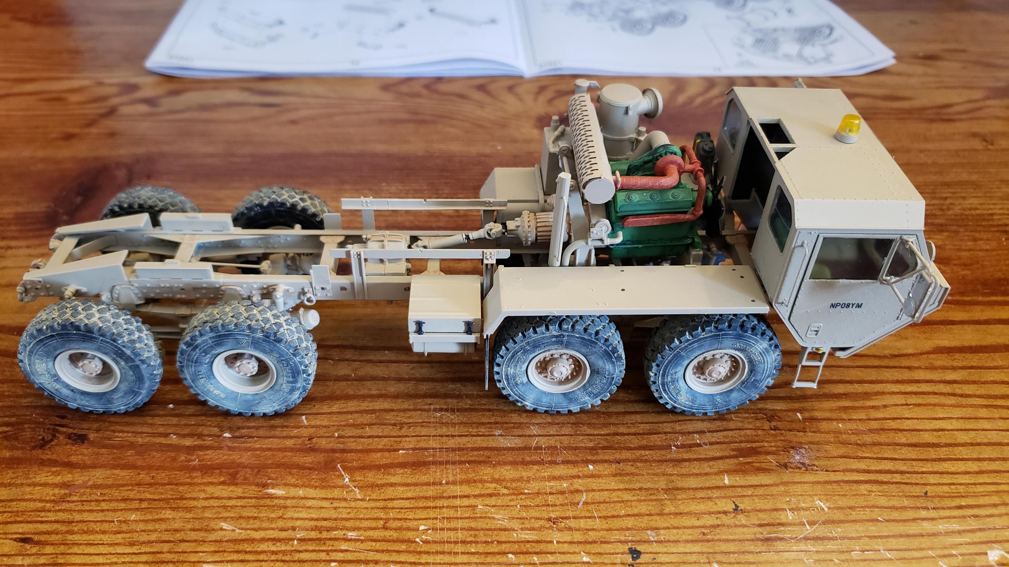 Some more progress here. I got the cab put together. I painted the doors, and applied a gloss clear coat. I can then apply the decals without the "silvering." I let the decals set, then applied a clear dull coat. I'm happy with the results. I also got the decals on the outside of the doors, and front of the cab I put together the muffler and heat shield A little more work on the cab and got it mounted. I made mirror lenses from metallic duct tape I put the glad hands on the back for the pintle hitch Started work on the platform And put the engine cover together Fuel tank and fenders on I just have the winch, 5th wheel, platforms and spare tire left