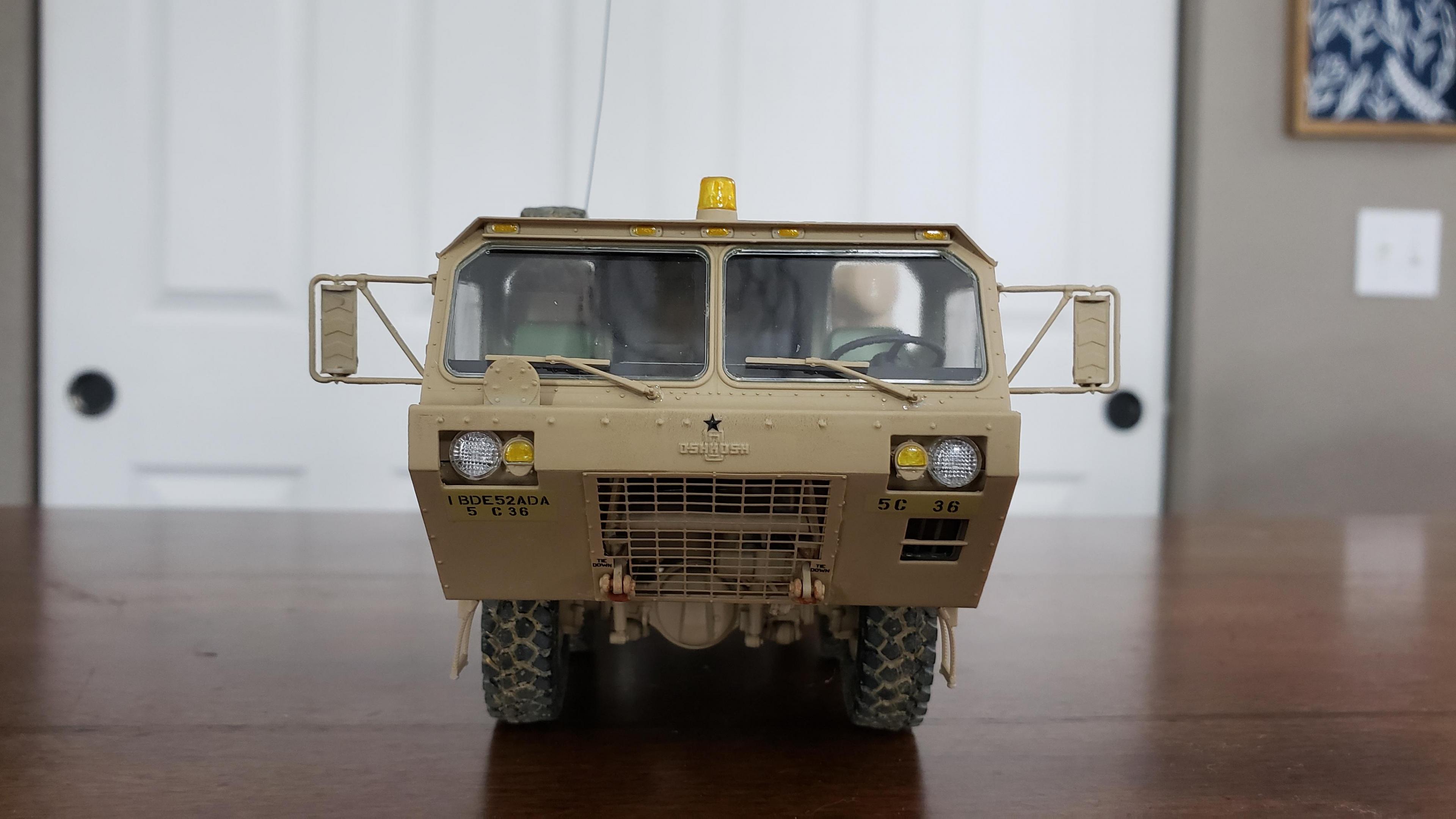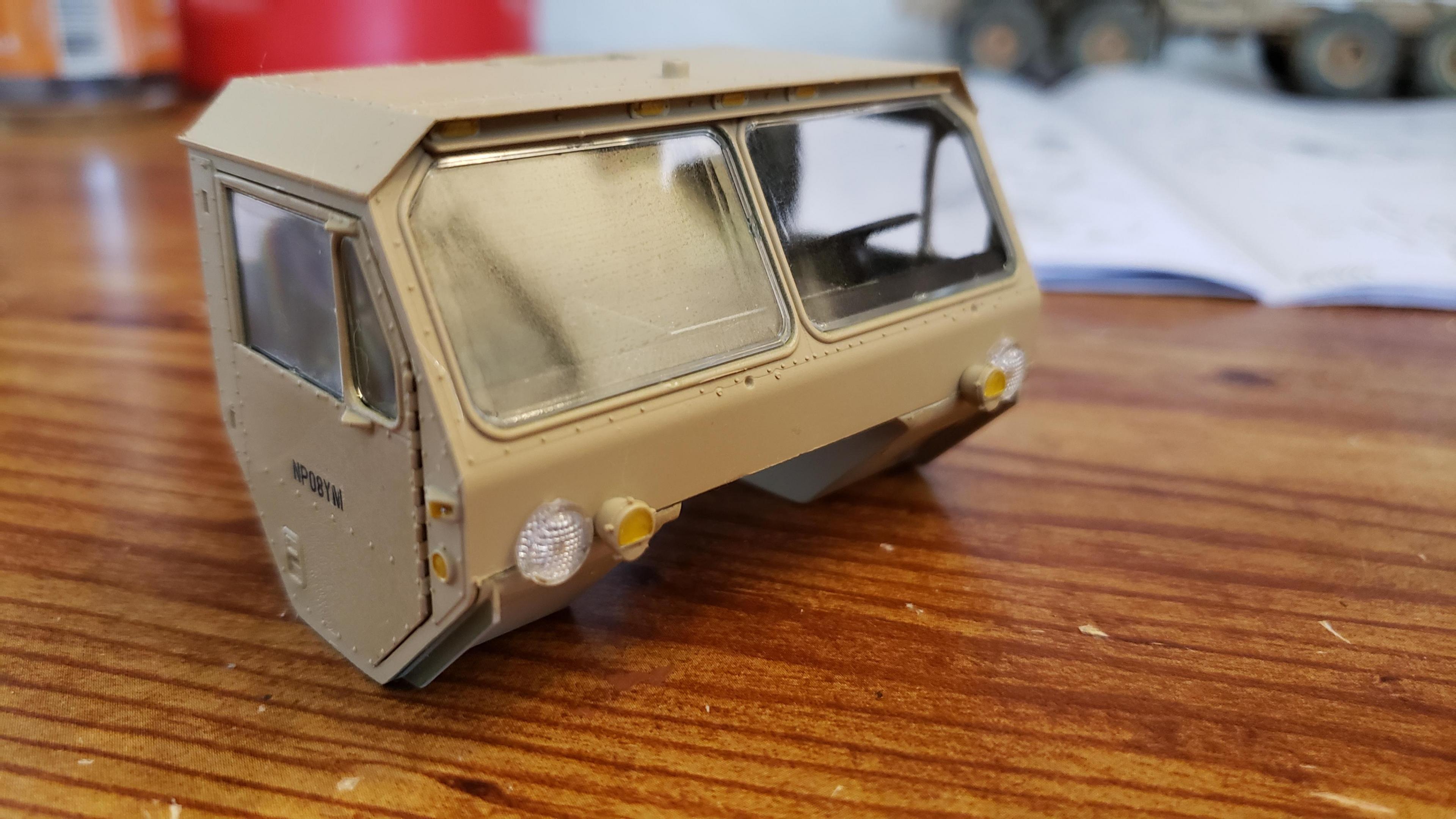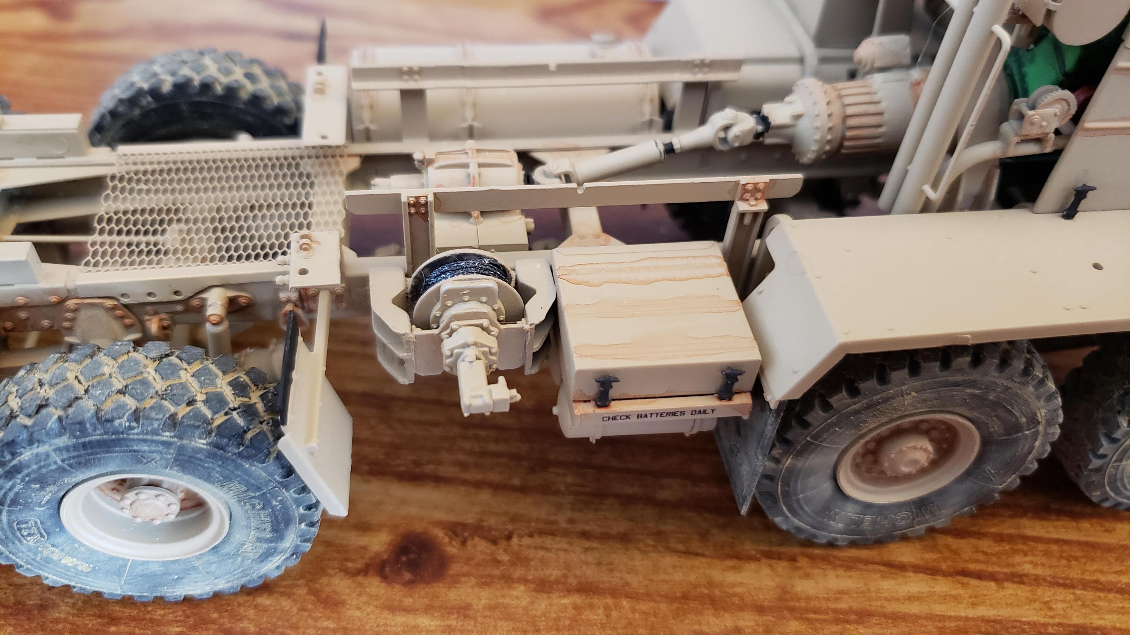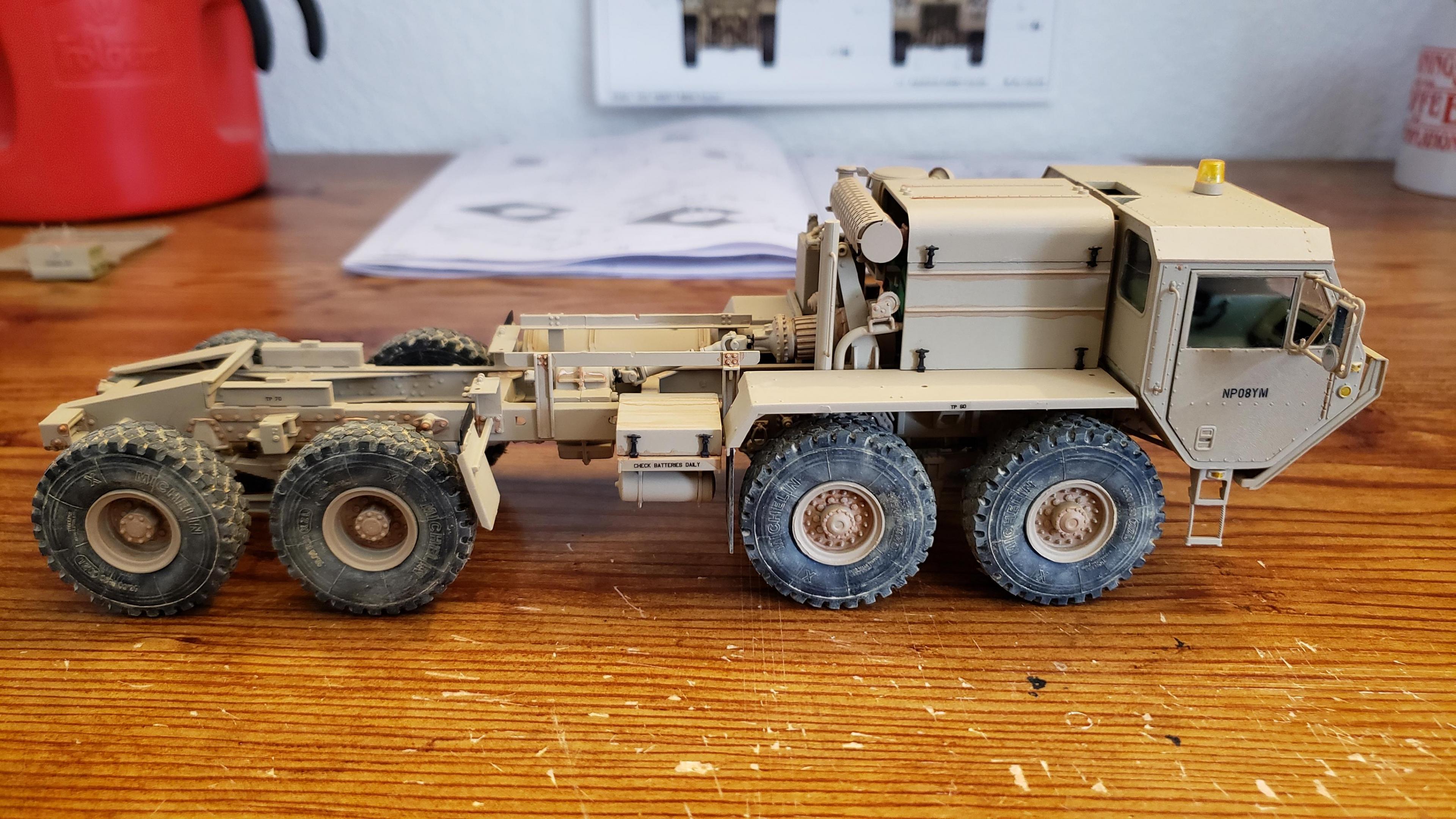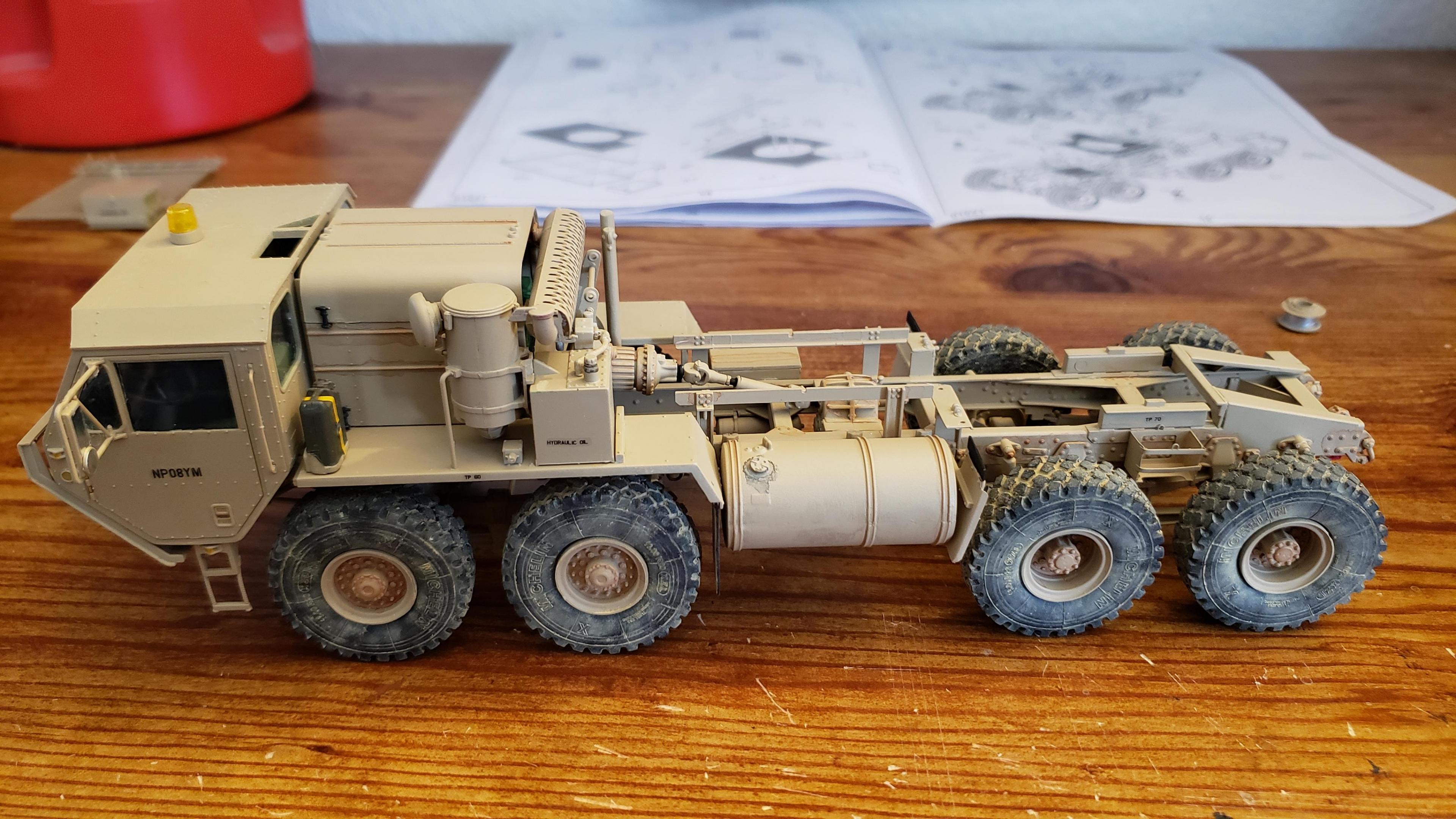 Some more progress here. I got the cab put together. I painted the doors, and applied a gloss clear coat. I can then apply the decals without the "silvering." I let the decals set, then applied a clear dull coat. I'm happy with the results. I also got the decals on the outside of the doors, and front of the cab I put together the muffler and heat shield A little more work on the cab and got it mounted. I made mirror lenses from metallic duct tape I put the glad hands on the back for the pintle hitch Started work on the platform And put the engine cover together Fuel tank and fenders on I just have the winch, 5th wheel, platforms and spare tire left