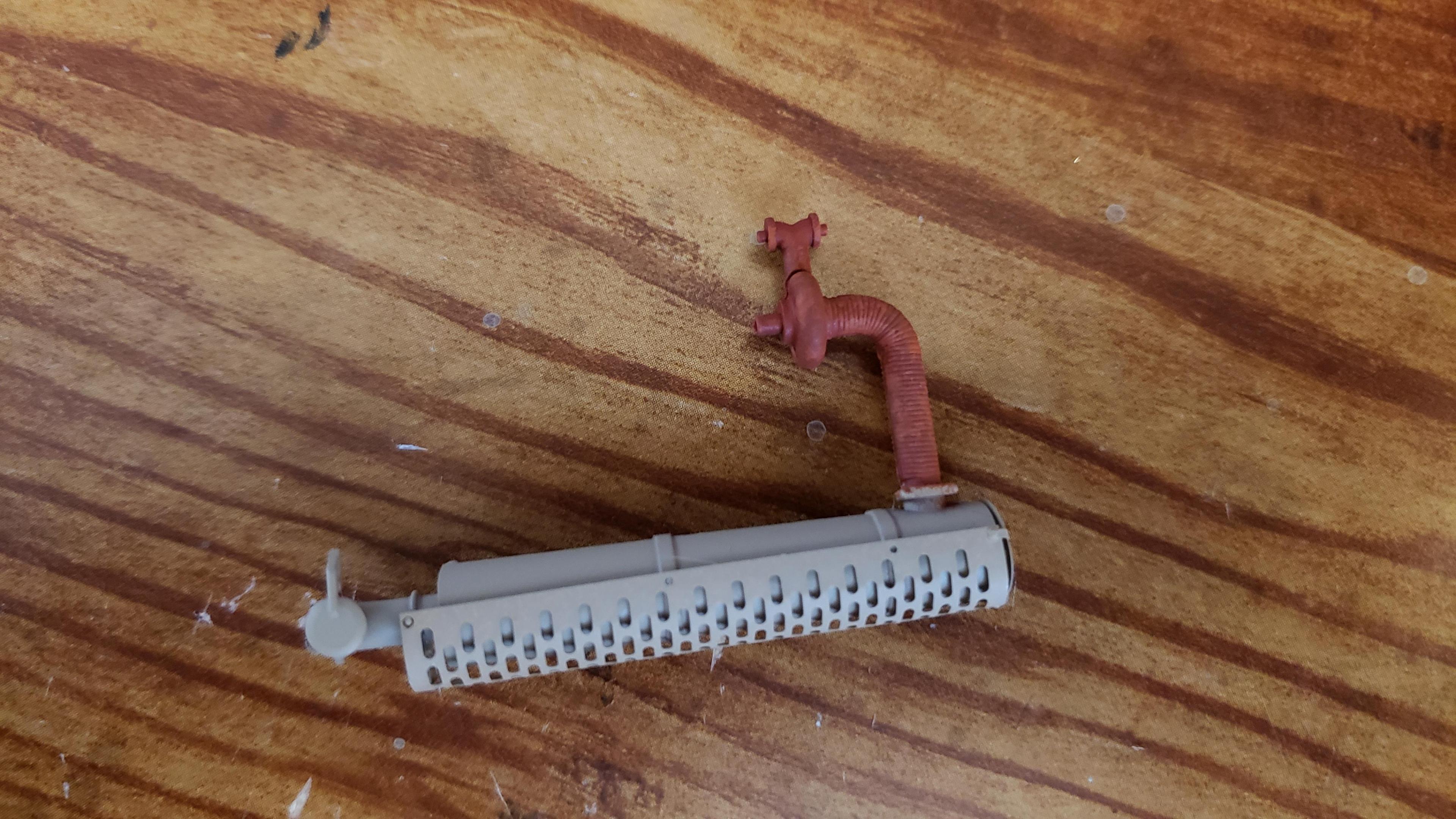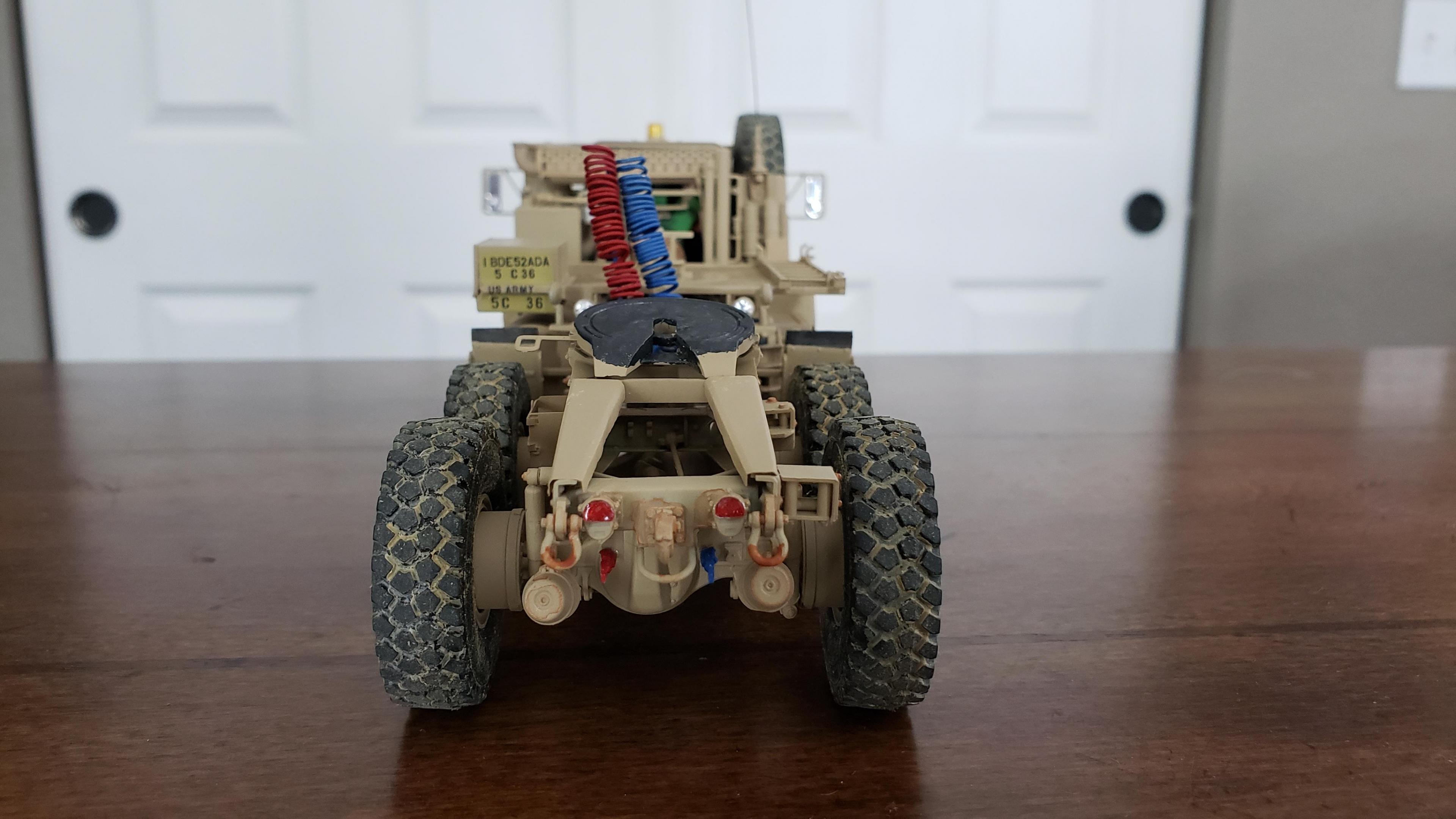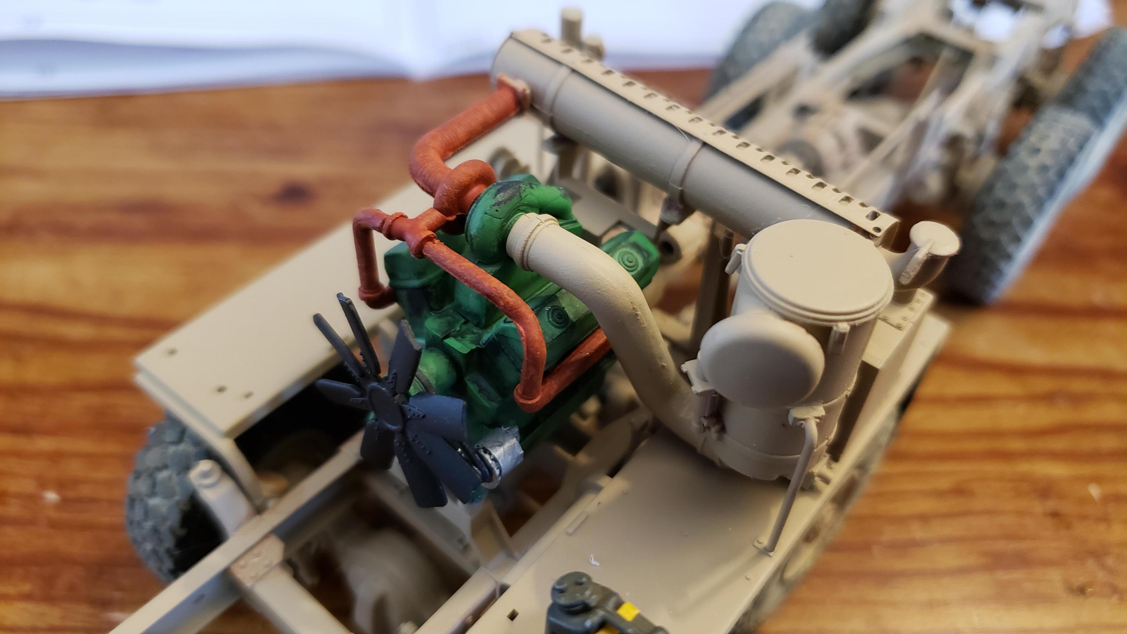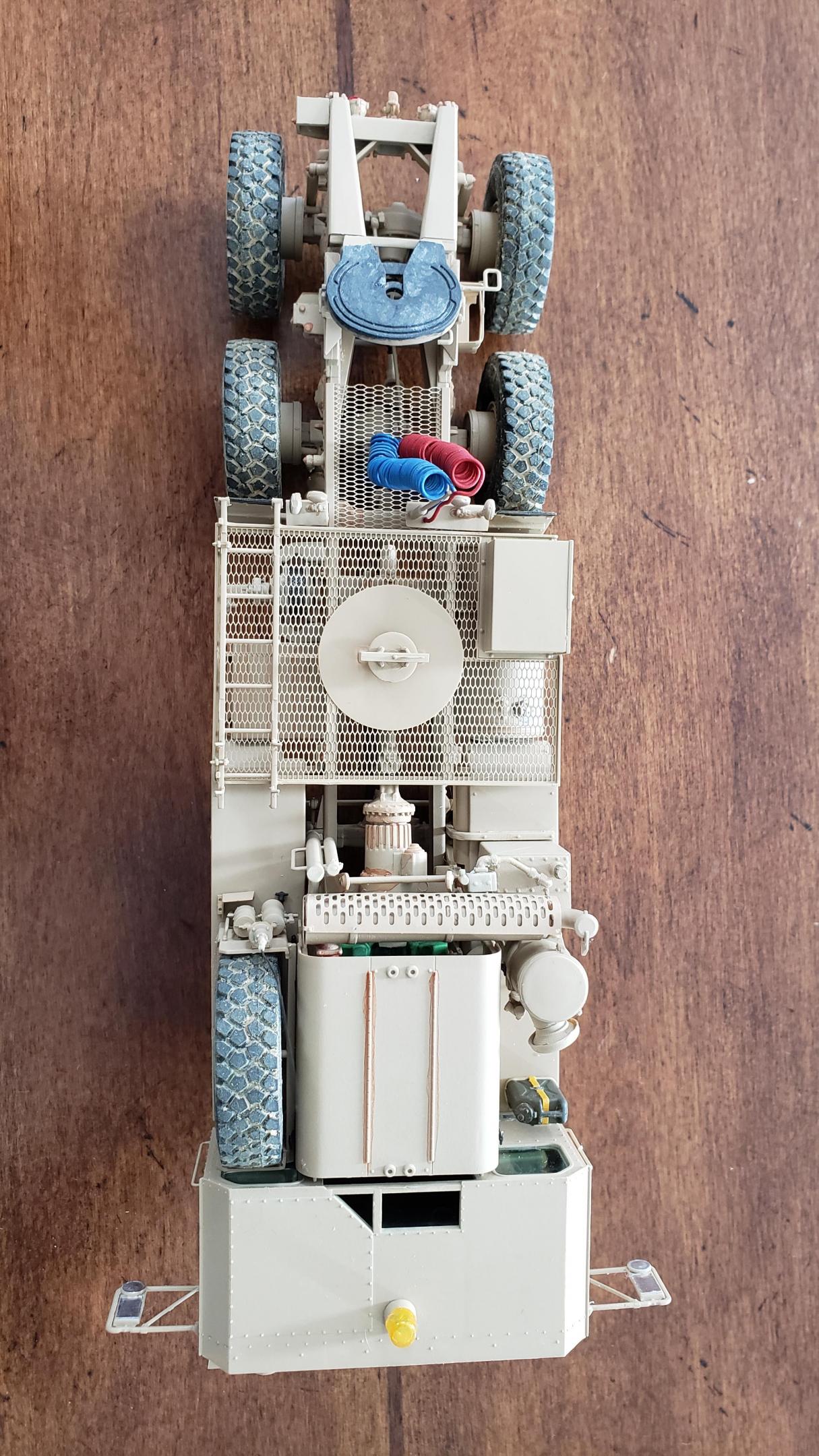 Some more progress here. I got the cab put together. I painted the doors, and applied a gloss clear coat. I can then apply the decals without the "silvering." I let the decals set, then applied a clear dull coat. I'm happy with the results. I also got the decals on the outside of the doors, and front of the cab I put together the muffler and heat shield A little more work on the cab and got it mounted. I made mirror lenses from metallic duct tape I put the glad hands on the back for the pintle hitch Started work on the platform And put the engine cover together Fuel tank and fenders on I just have the winch, 5th wheel, platforms and spare tire left