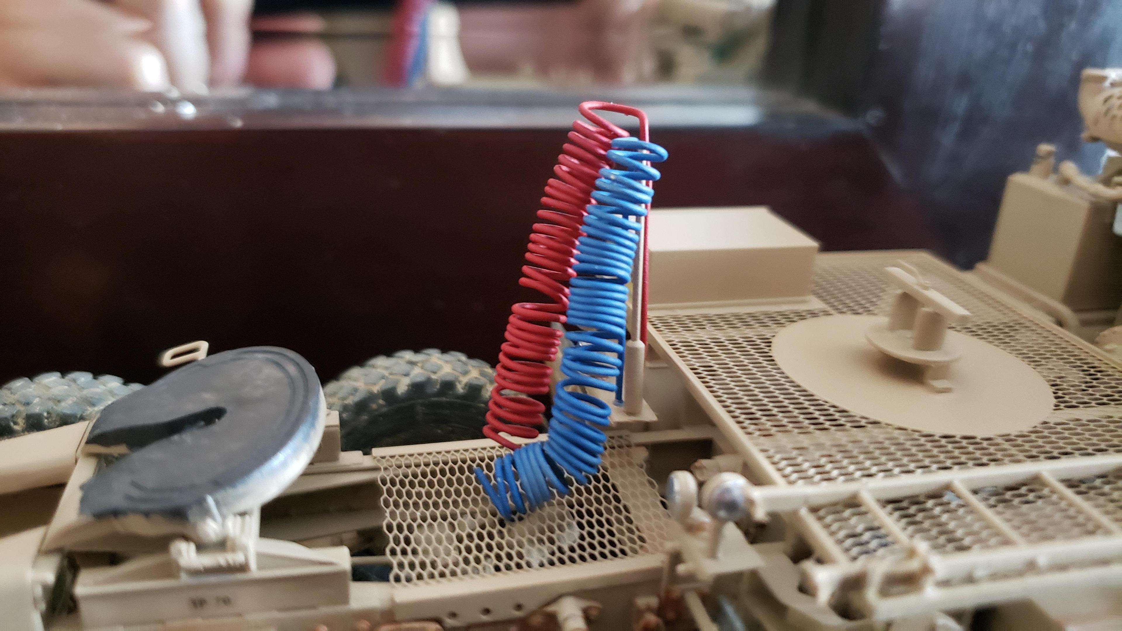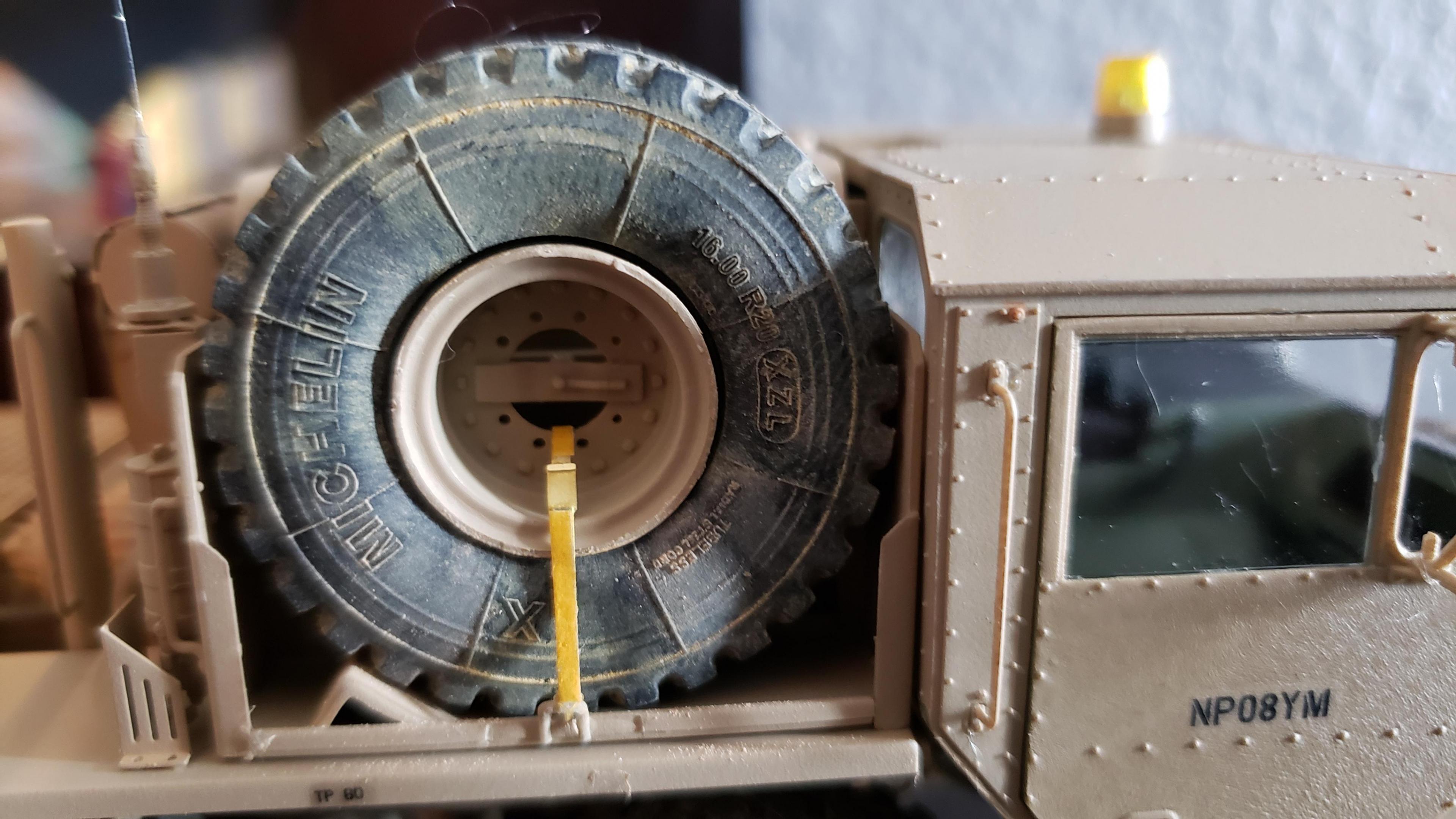 Thanks for all the kind comments. I finished this puppy up today. I used some thread for the winch cable, and painted it metallic gray. I'm not sure if it was normally stowed at the rear of the tractor, or at the winch itself. I just left it on the winch. I made some more strap material for the spare tire. I also made the whip antenna, and the suzi coils. I'm pretty happy with how it turned out. I'll post it in the under glass section The kit came with a PE ratchet strap for the spare. I made some strap material from masking tape that I painted yellow. They may have had olive green straps or something, but I just wanted something to stand out a little. I also made some suzi coils from wire material that I had I'll post it in the under glass section
