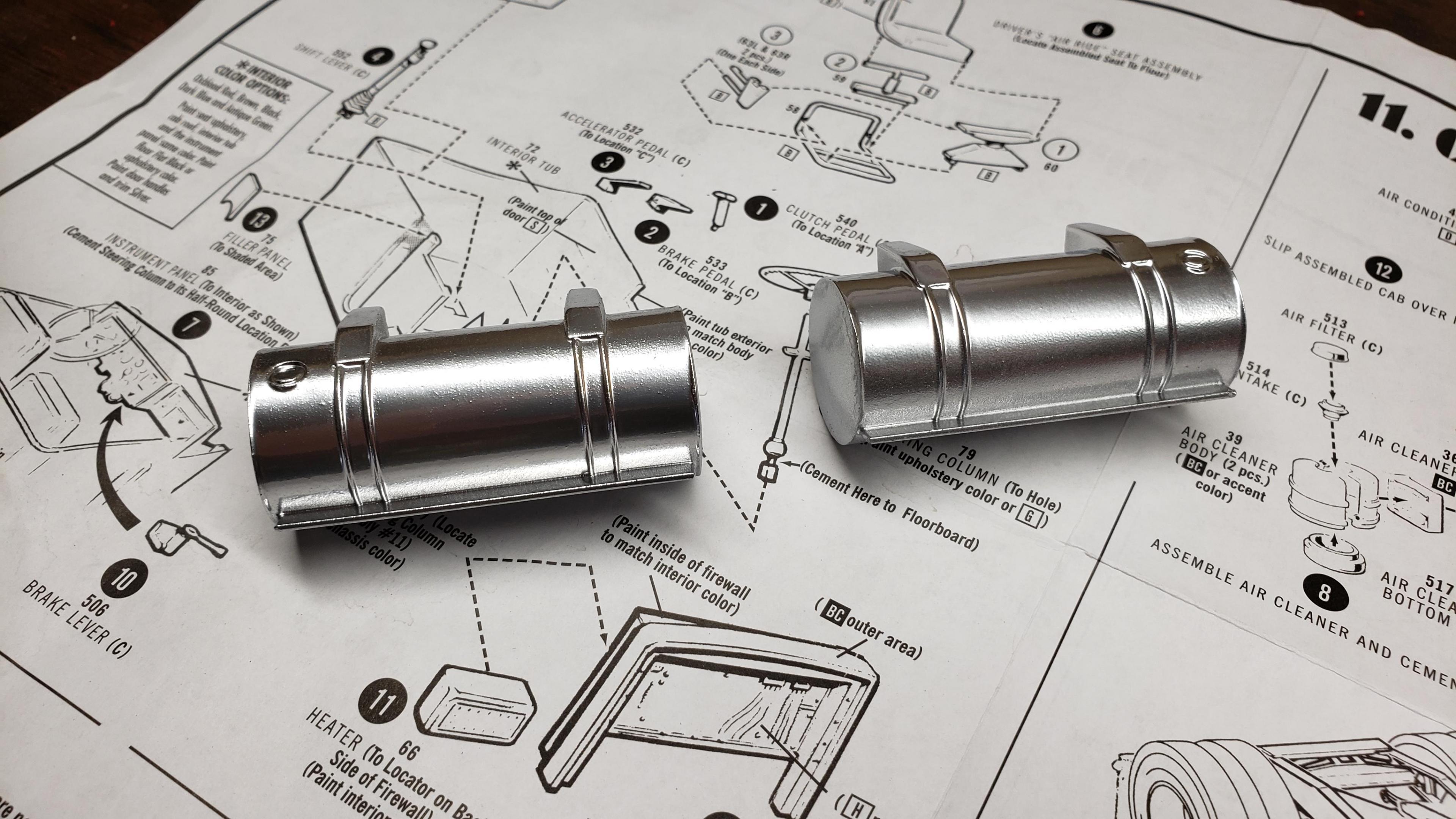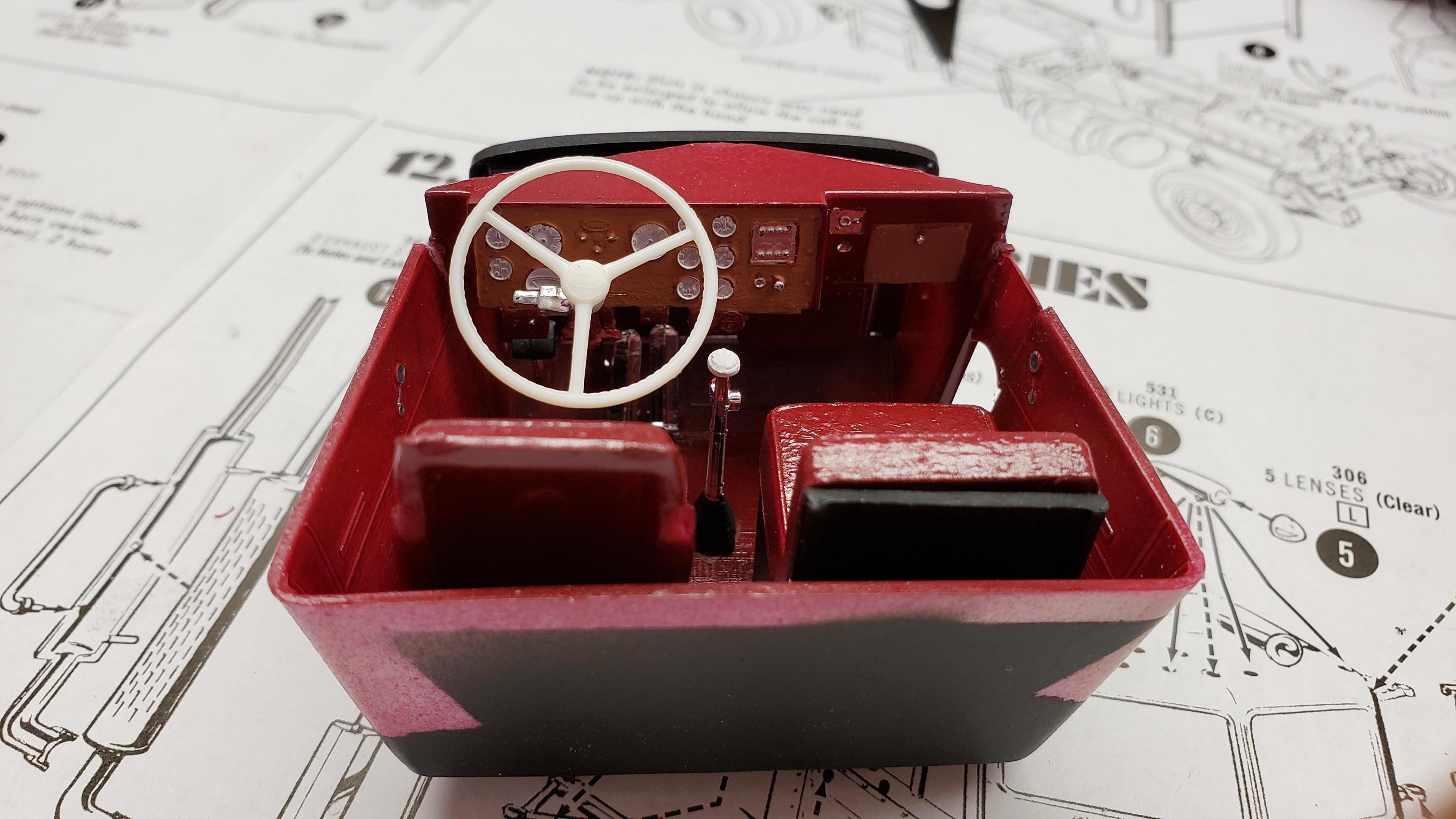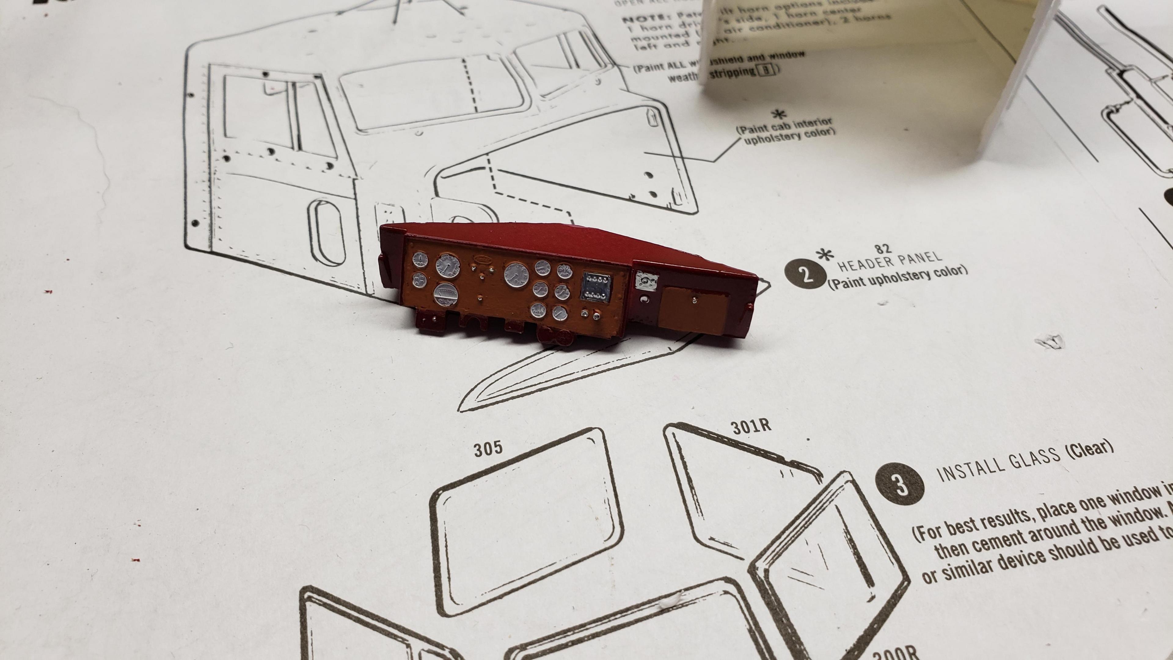 Some progress here. I've been working on it a lot, but feel like I haven't accomplished much. I put on half fenders from snap KW kit, and sanded off diamond tread. Made mud flaps for under the steps my dash painting skills aren't great, but I did what I could on the interior. I went with oxblood red I want dual air filters on this rig, so I made a cowl for the driver's side i got the cab painted, and did some test fitting. I had lots of problems with fitment of the firewall i was reluctant to modify the cab and hood for the air cleaners. I didn't really want to cross that point of no return, but I really wanted the dual filters, so I decided to go for it. I'm using the filters from the snap kw. For some reason, this detroit has the air compressor mounted a FOOT above the engine, right at the firewall. Right in the way of the air intake piping. It will take some creative modification to route the ducting around the compressor. But, I'm up for the challenge. I already drilled holes in the cab for the air filters, so I have to figure it out. And here's how she sits