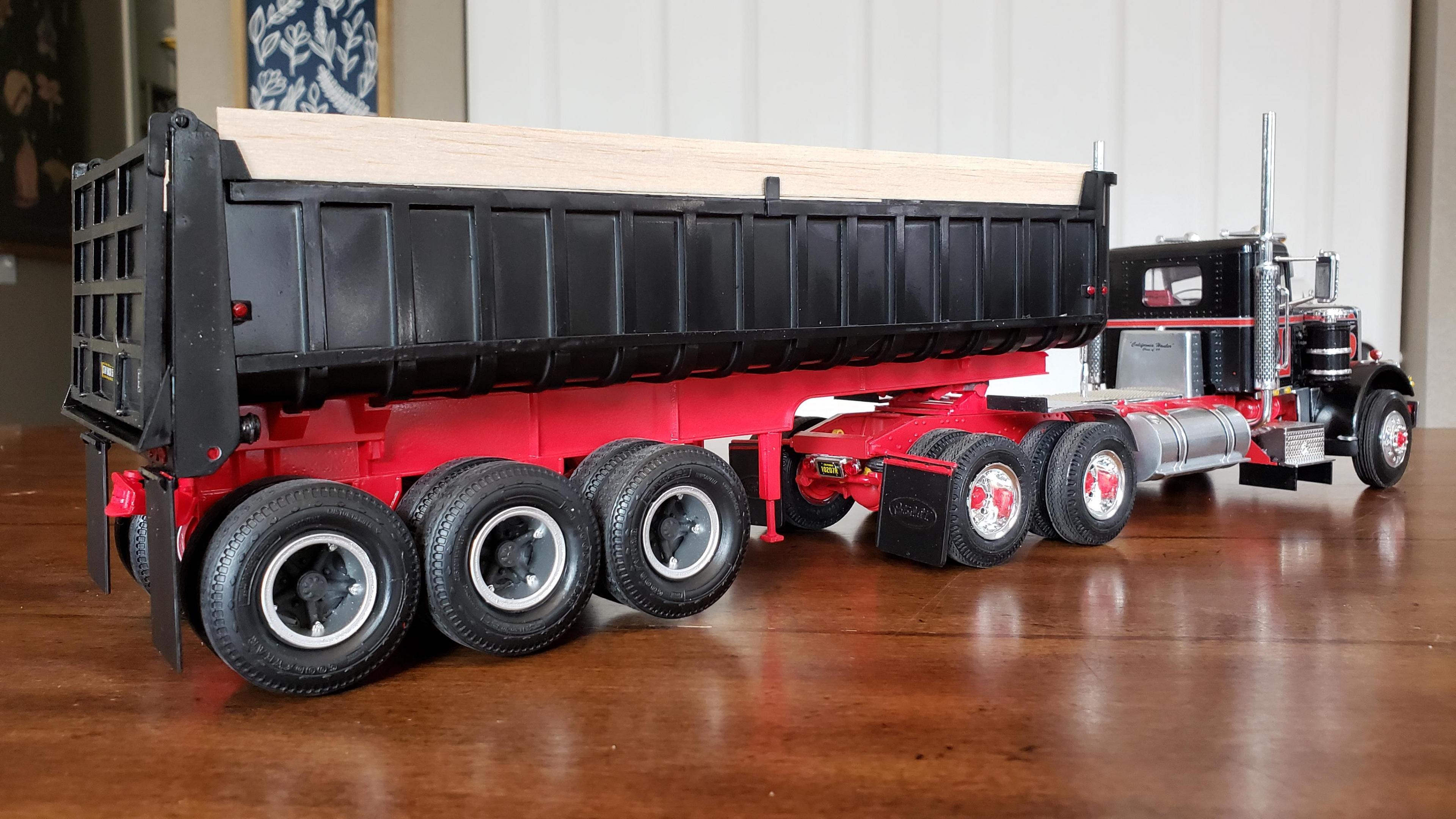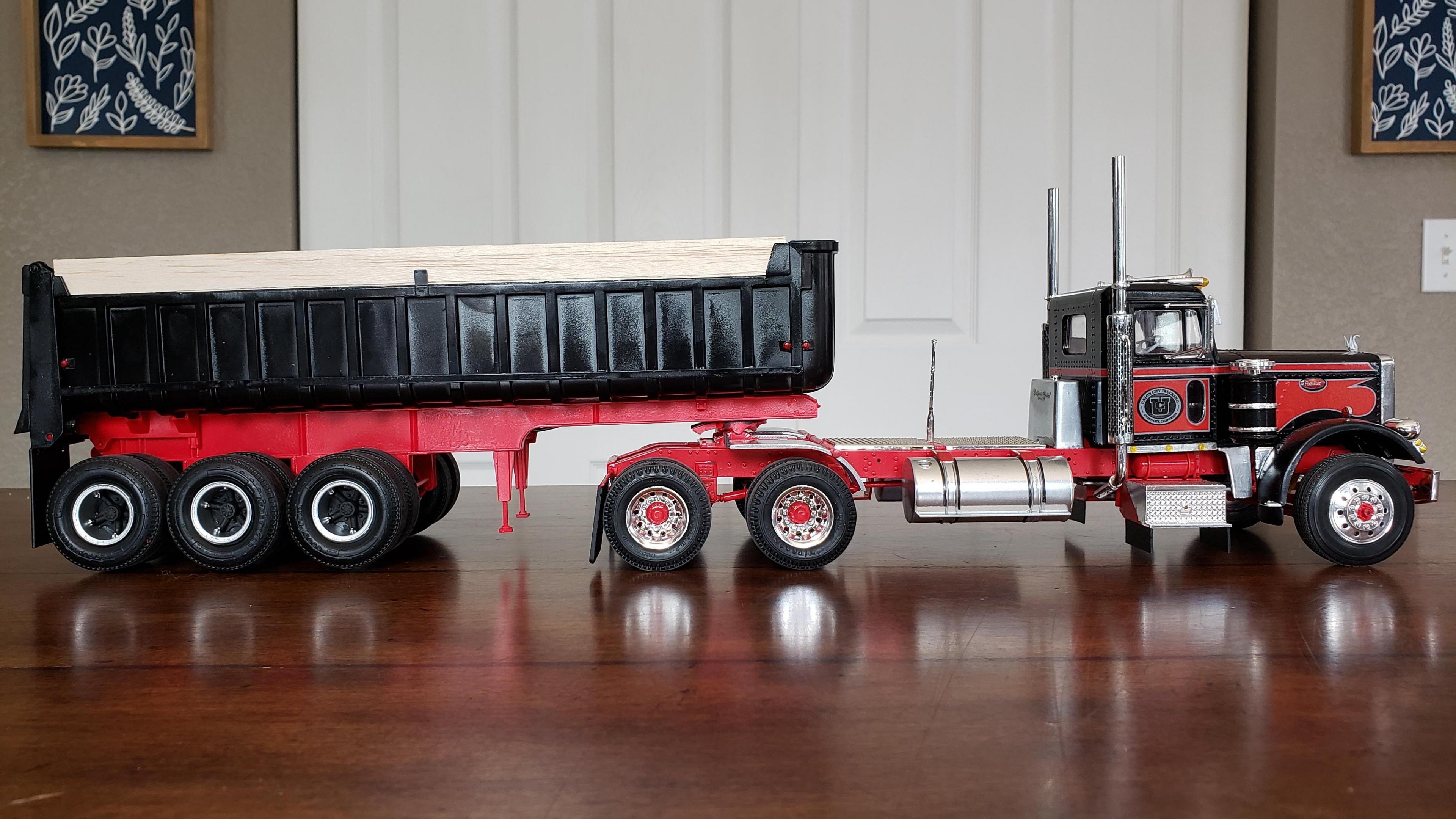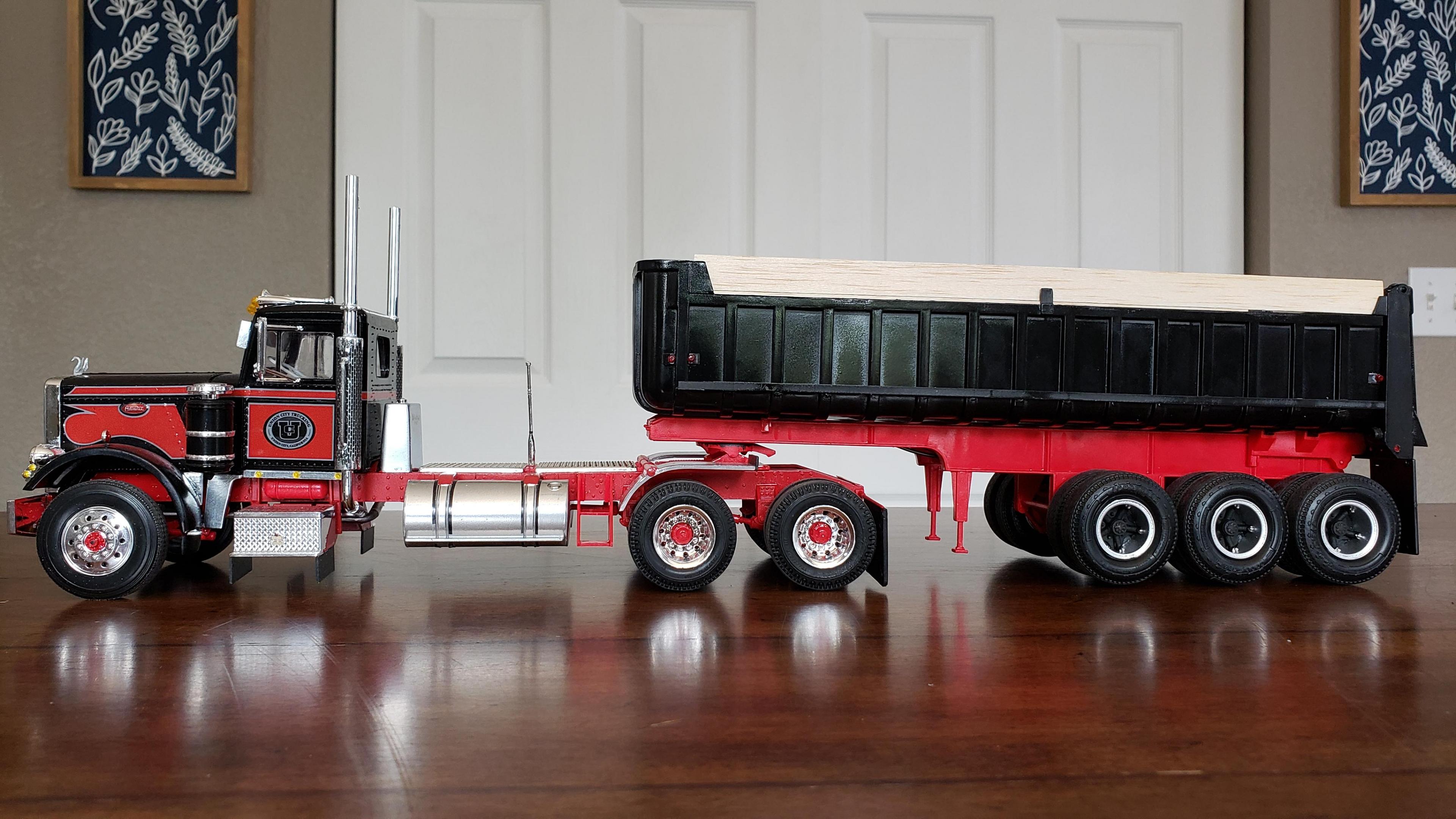 I just finished this one up. There was some custom work and kit bashing on this one. I streched the frame a scale 2'. Front bumper and stacks from snap pete. Converted to dual air cleaners, taken from snap kw. Fuel tanks from snap kw, I wish I had mounted them further forward. Front wheels also from snap kw, I don't like the looks of the kit's rounded wheels. Also the half fenders came from the snap kw. Battery box from 378. Swan, steps and visor made from scratch. I wanted the stripes white with red outline, and I ordered some up. They wound up not working for me, so I just used the kit decals. This will be pulling the gravel trailer, and I added the hydraulic tank behind the cab. Thanks for looking!