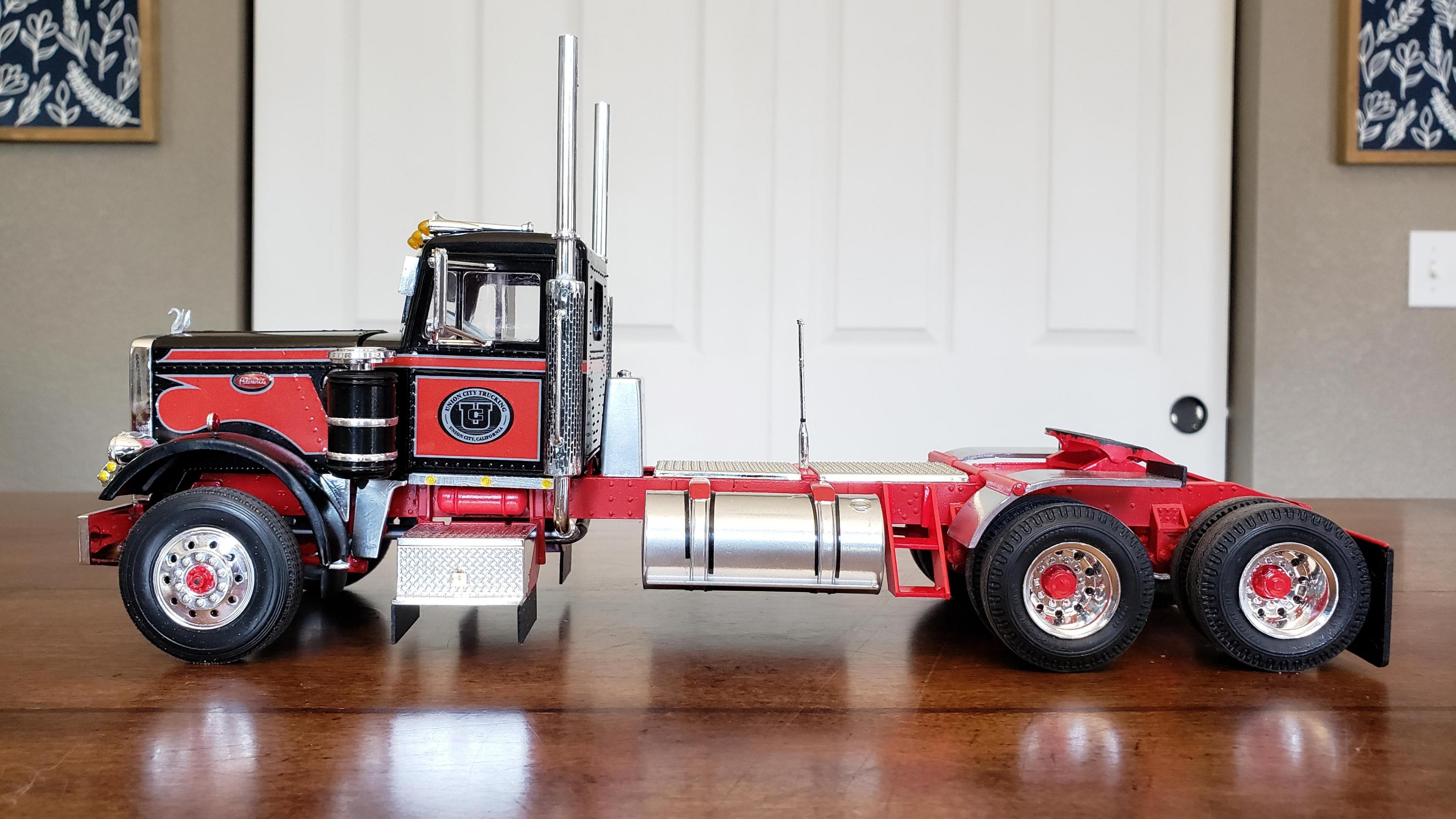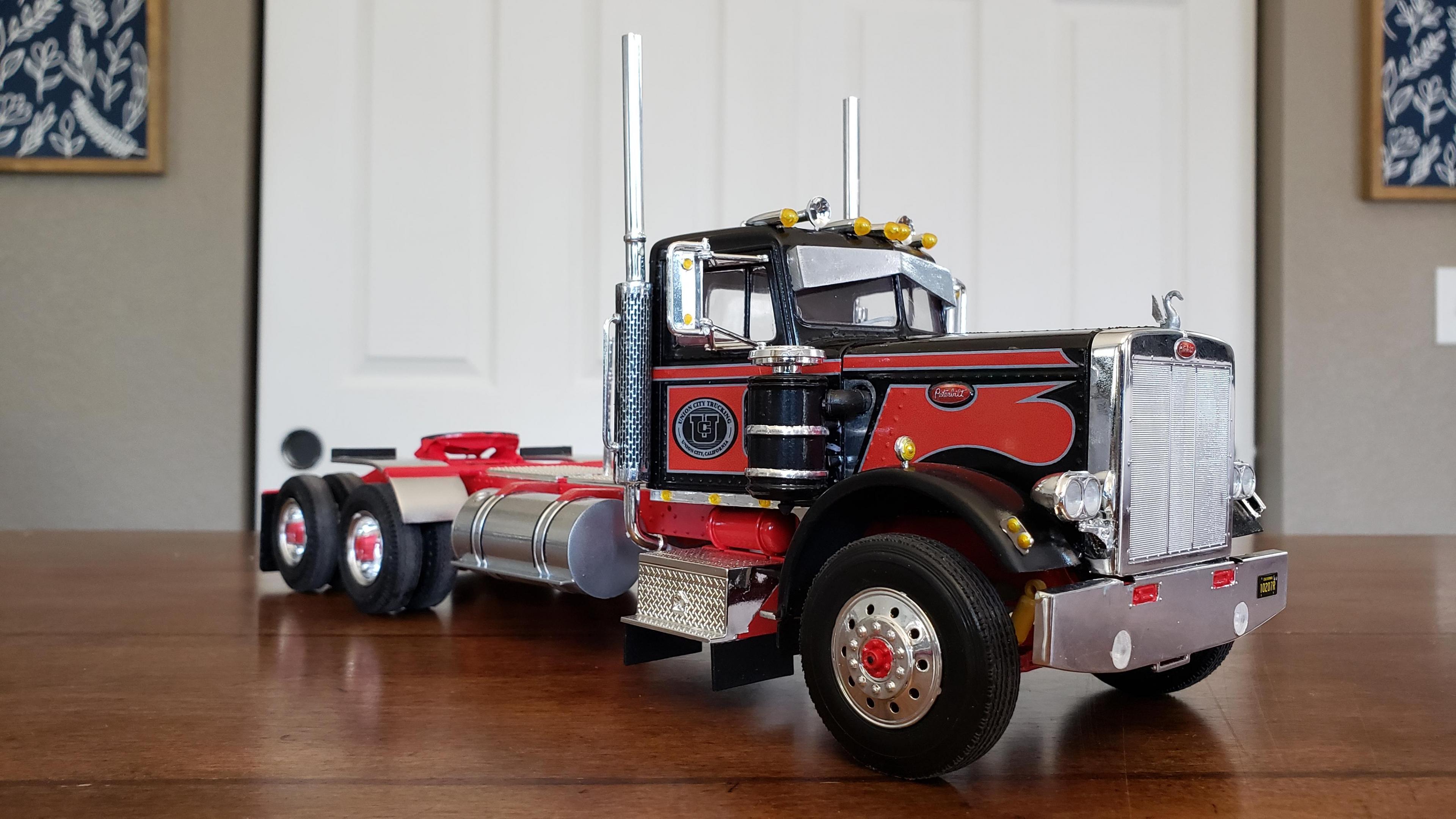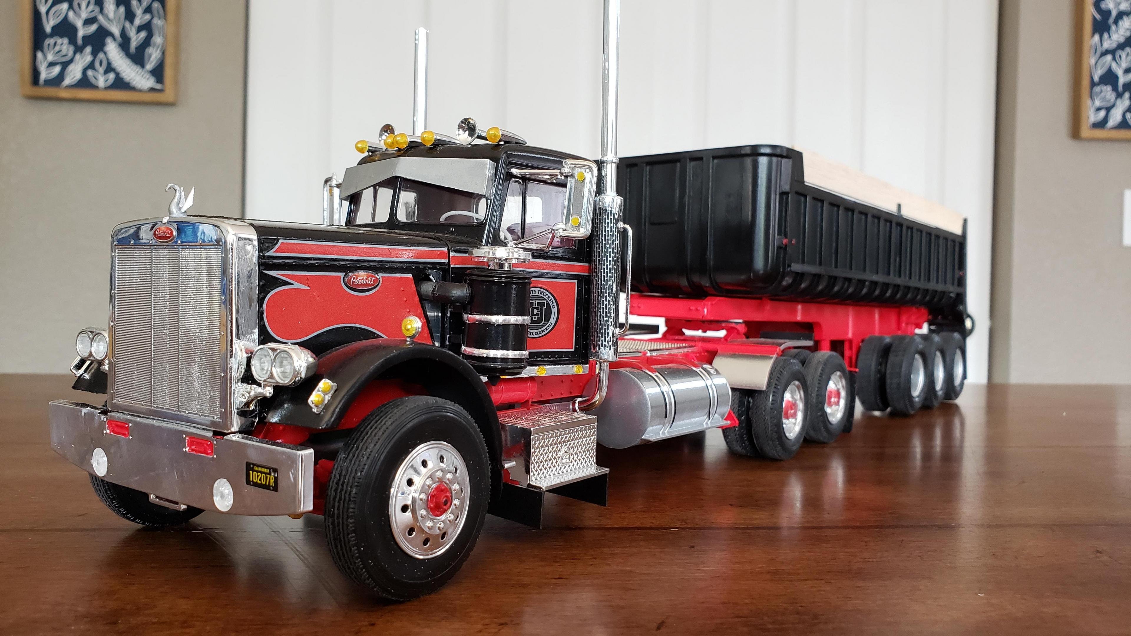 I just finished this one up. There was some custom work and kit bashing on this one. I streched the frame a scale 2'. Front bumper and stacks from snap pete. Converted to dual air cleaners, taken from snap kw. Fuel tanks from snap kw, I wish I had mounted them further forward. Front wheels also from snap kw, I don't like the looks of the kit's rounded wheels. Also the half fenders came from the snap kw. Battery box from 378. Swan, steps and visor made from scratch. I wanted the stripes white with red outline, and I ordered some up. They wound up not working for me, so I just used the kit decals. This will be pulling the gravel trailer, and I added the hydraulic tank behind the cab. Thanks for looking!